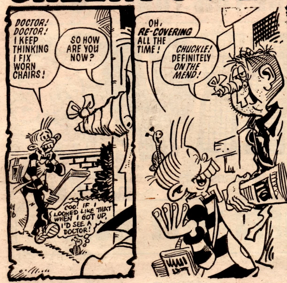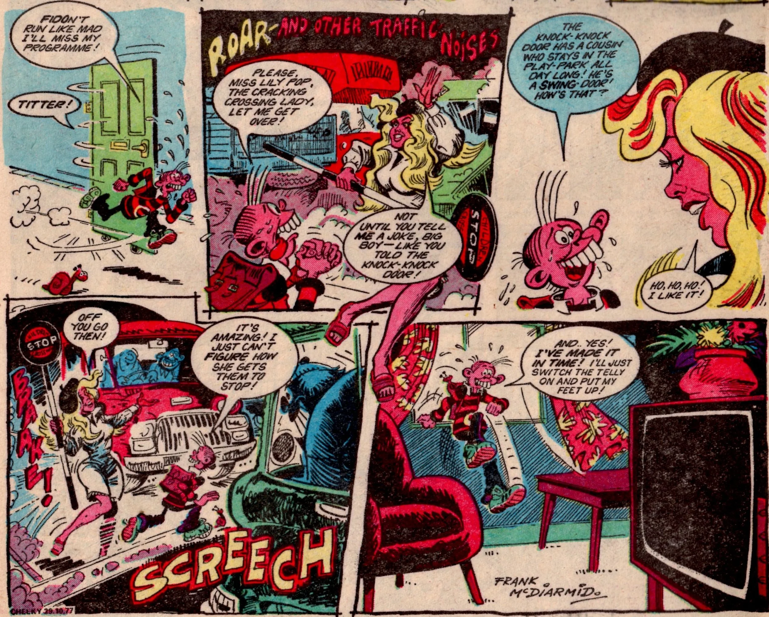 It was a great idea for a new comic, mixing genuinely entertaining new material and a handful of reprints with relatively seamless ingenuity for most of its run (sadly during its last year it gave up on the conceit of Cheeky introducing all the other strips, leaving it not much different from all the other humour anthology comics on the shelves). Frank McDiarmid drew with fantastic imagination, often packing three or four separate visual gags into a single frame, and the vast range of recurring characters that Cheeky would meet on his daily rounds gave the comic an enormous cast list considering its relatively short two-and-a-half year run. Niblet’s blog presents a very helpful list of them all here, from Bump Bump Bernie and Gloomy Glad to Ding Dong Debbie and Granny Gumdrop.