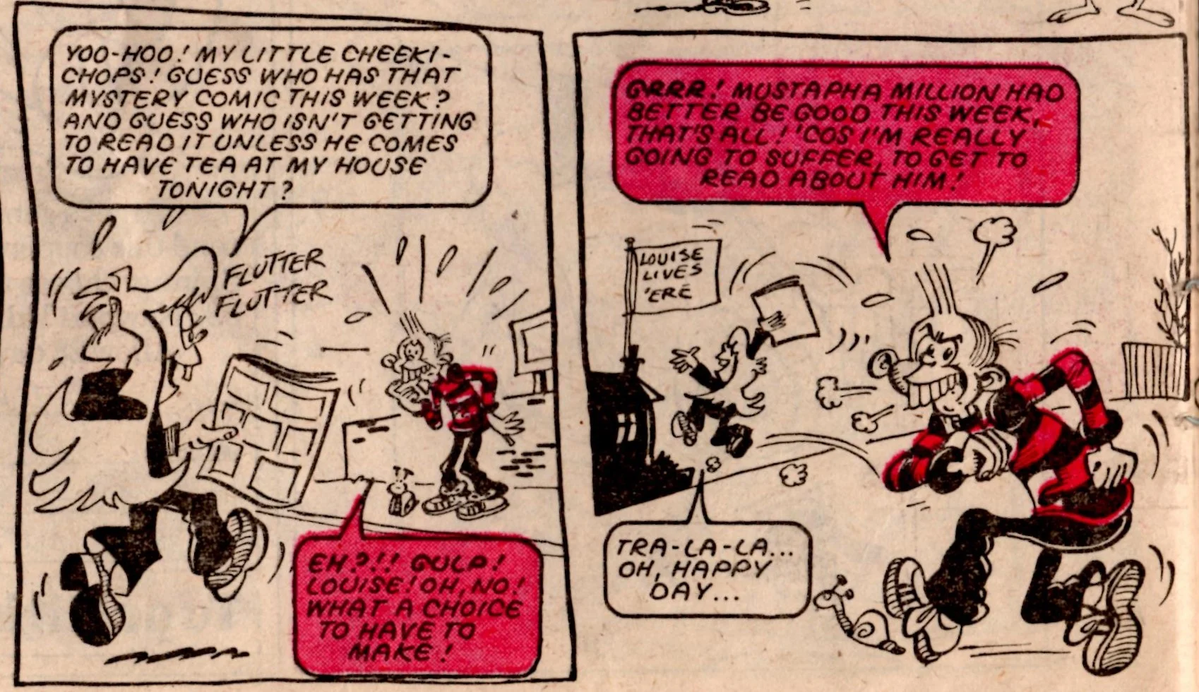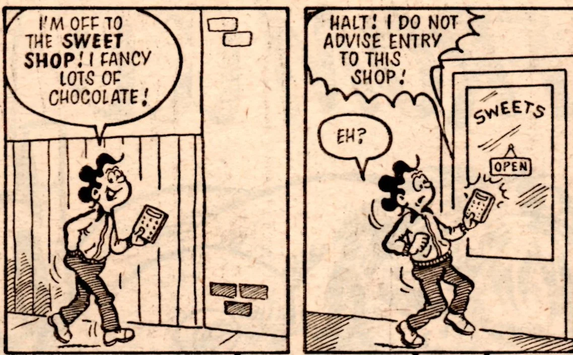 Cheeky would somehow get hold of a copy of The Mystery Comic – ‘that comic that we can never get in the shops’ – which would allow us to join him reading the fiscal japes of Mustapha Million.