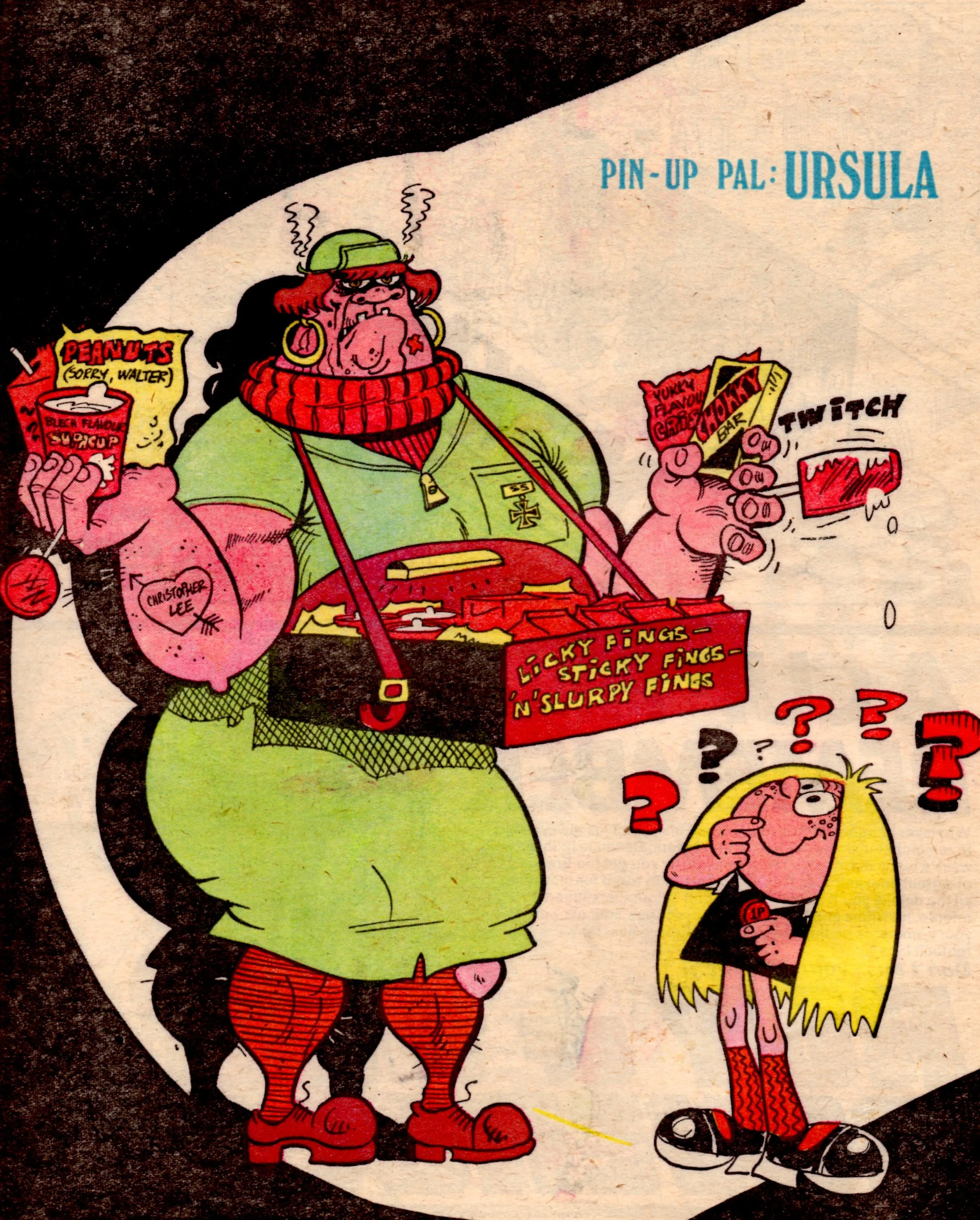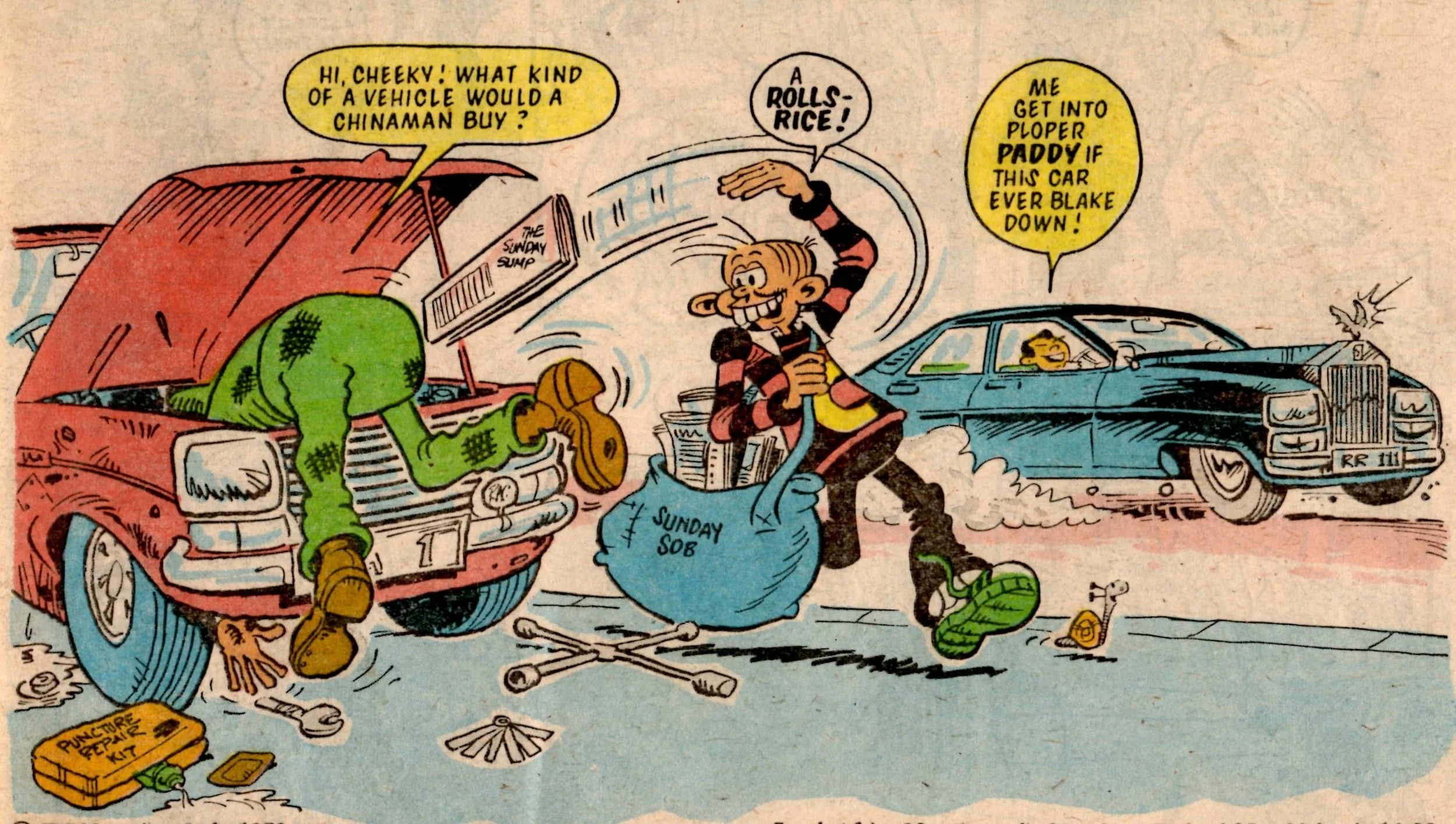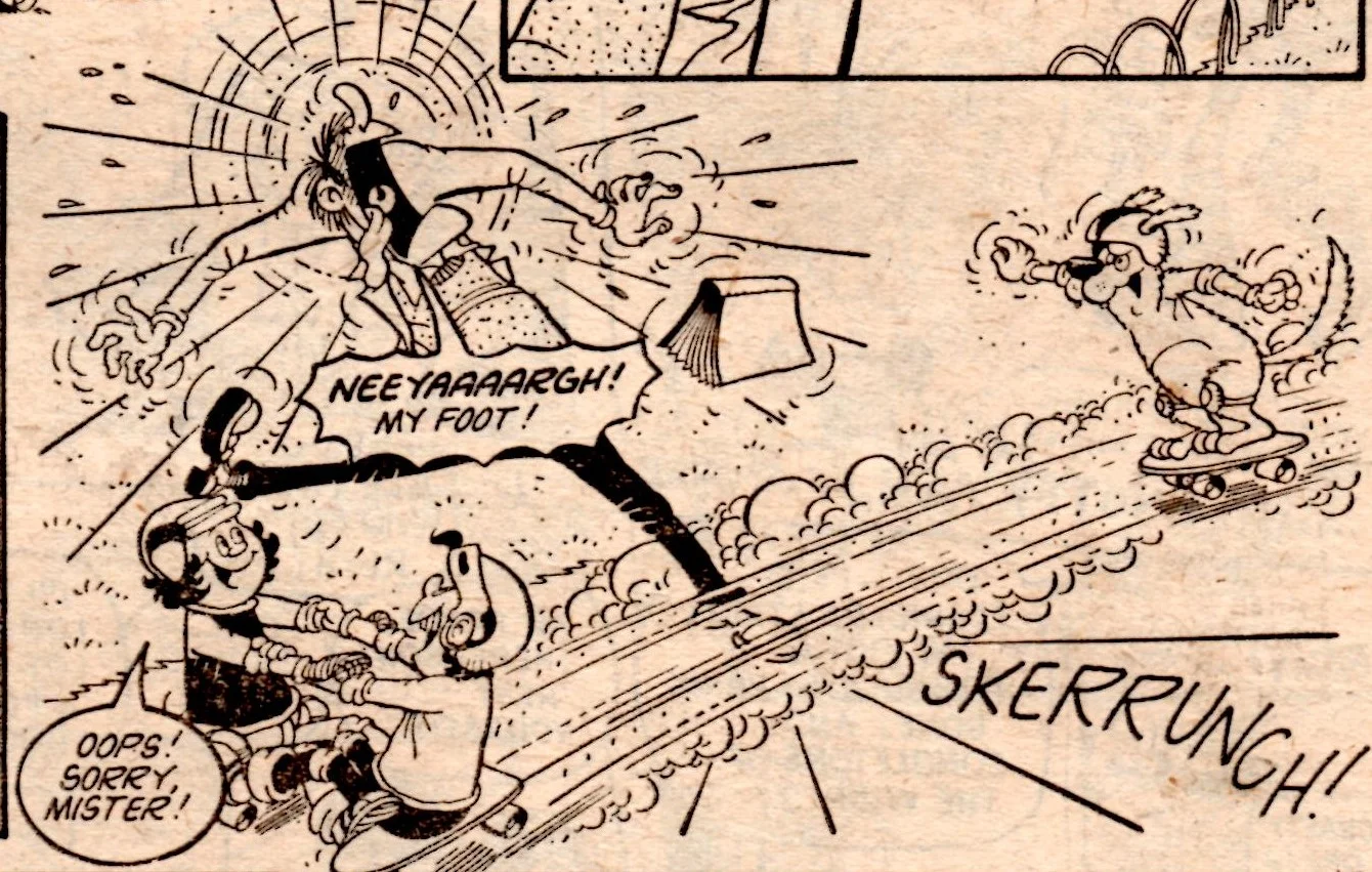 Cheeky does his paper round, a bulging bag marked ‘Sunday Sob’ sagging off his shoulder. In the last frame he would narrowly avoid being mown down by the Skateboard Squad, whose own strip would follow on the next page.