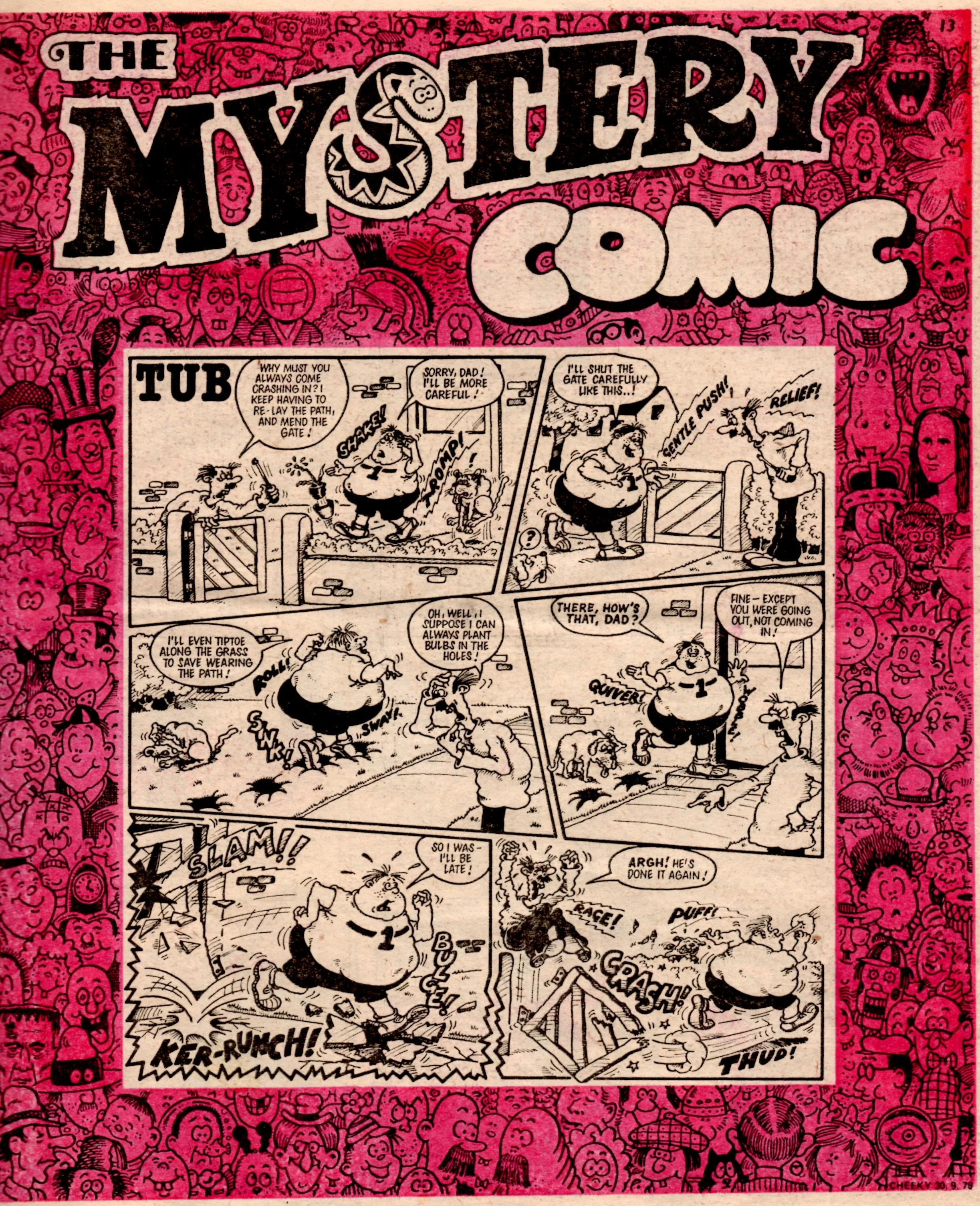 I loved the cover of each issue of The Mystery Comic – a peculiar design in which the lead story was surrounded by a thick border populated by all manner of oddball characters, including Ena Sharples, the Mona Lisa and a man with a football for a head. That there was no explanation for any of these faces – nor for what appeared to be Sid’s Snake from Whizzer and Chips in the insert’s masthead – just added to the intrigue and the feeling that here was something truly different.
