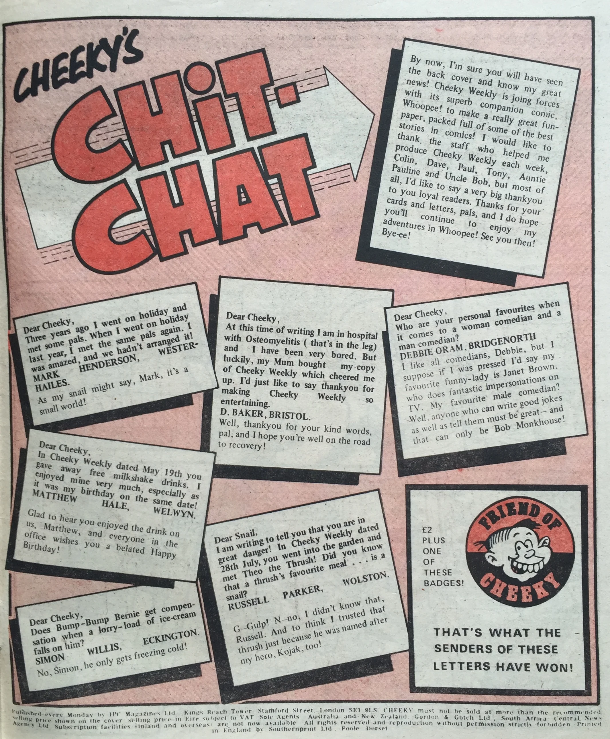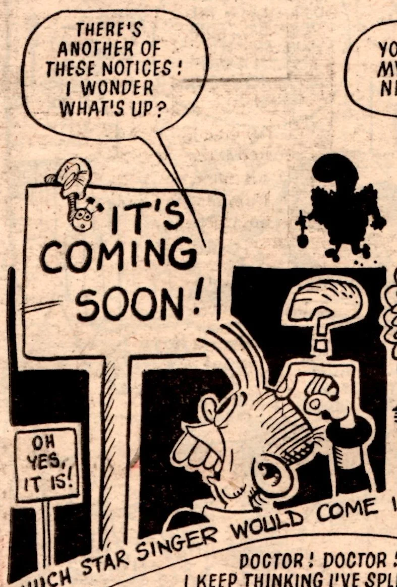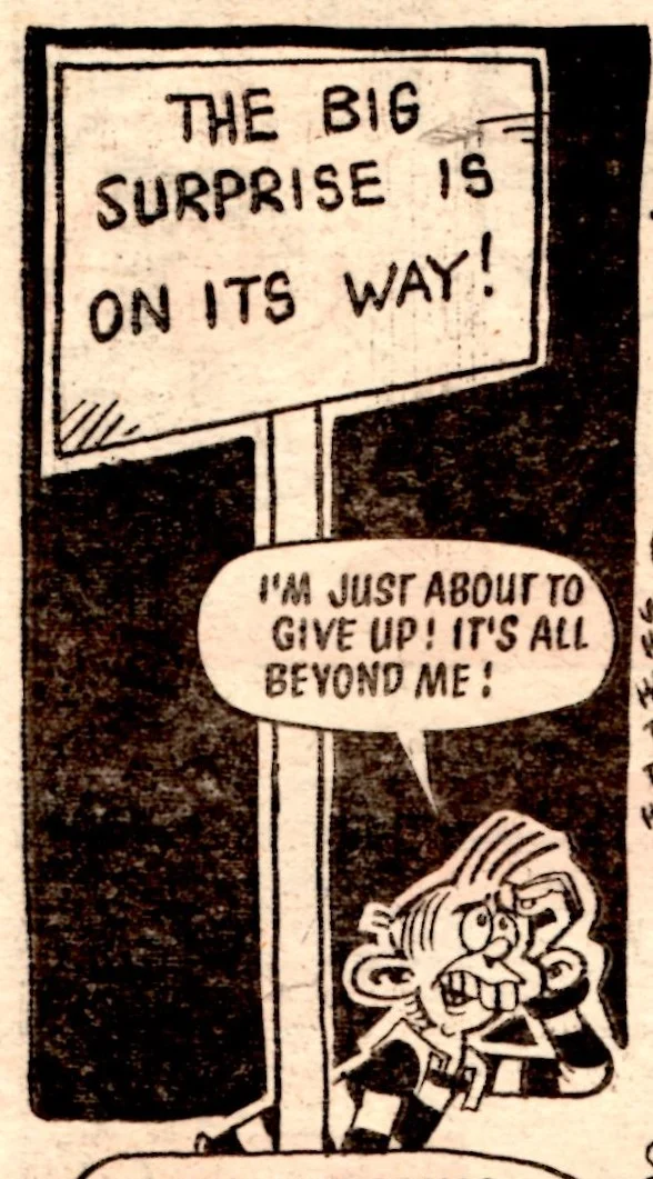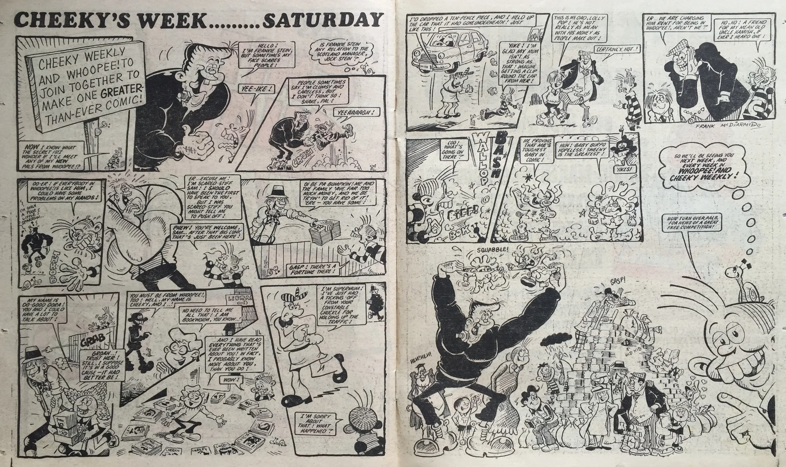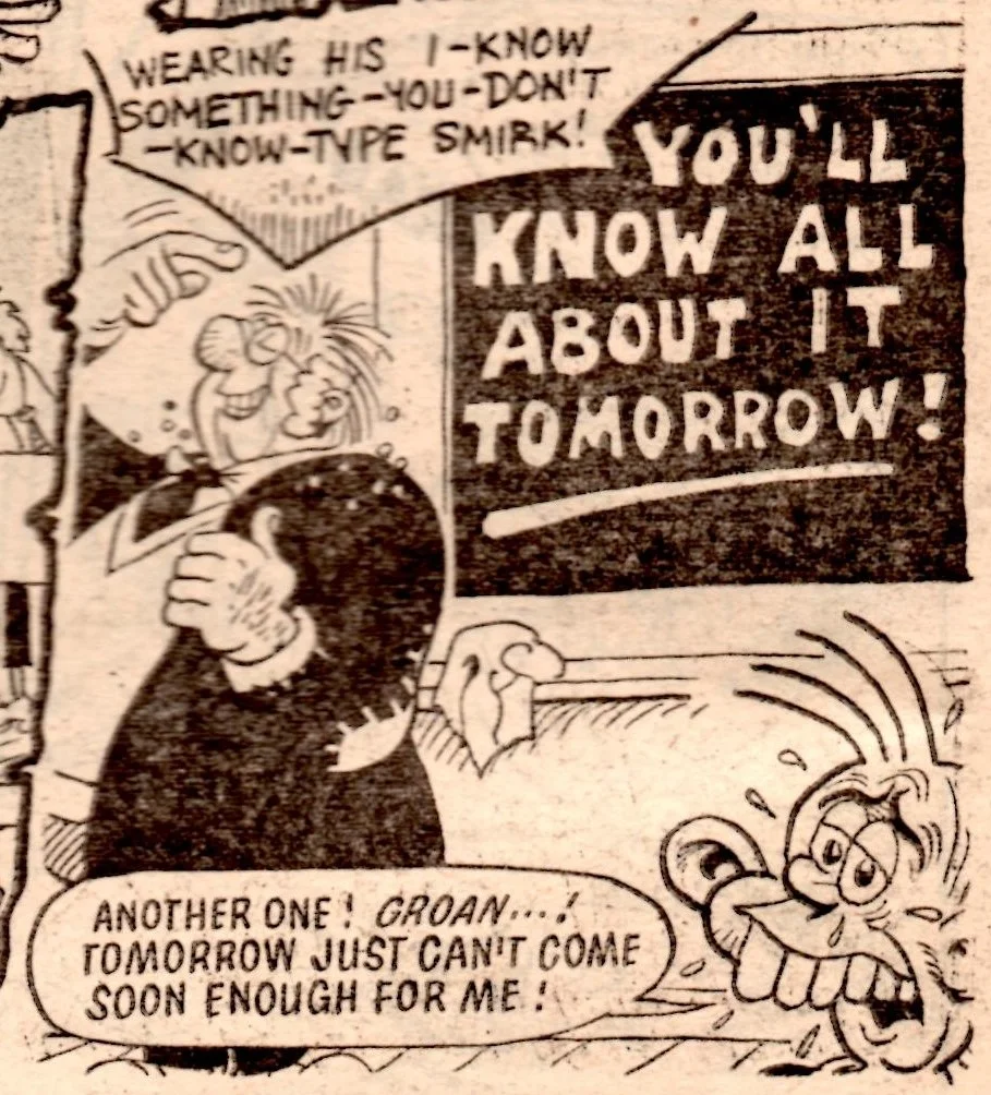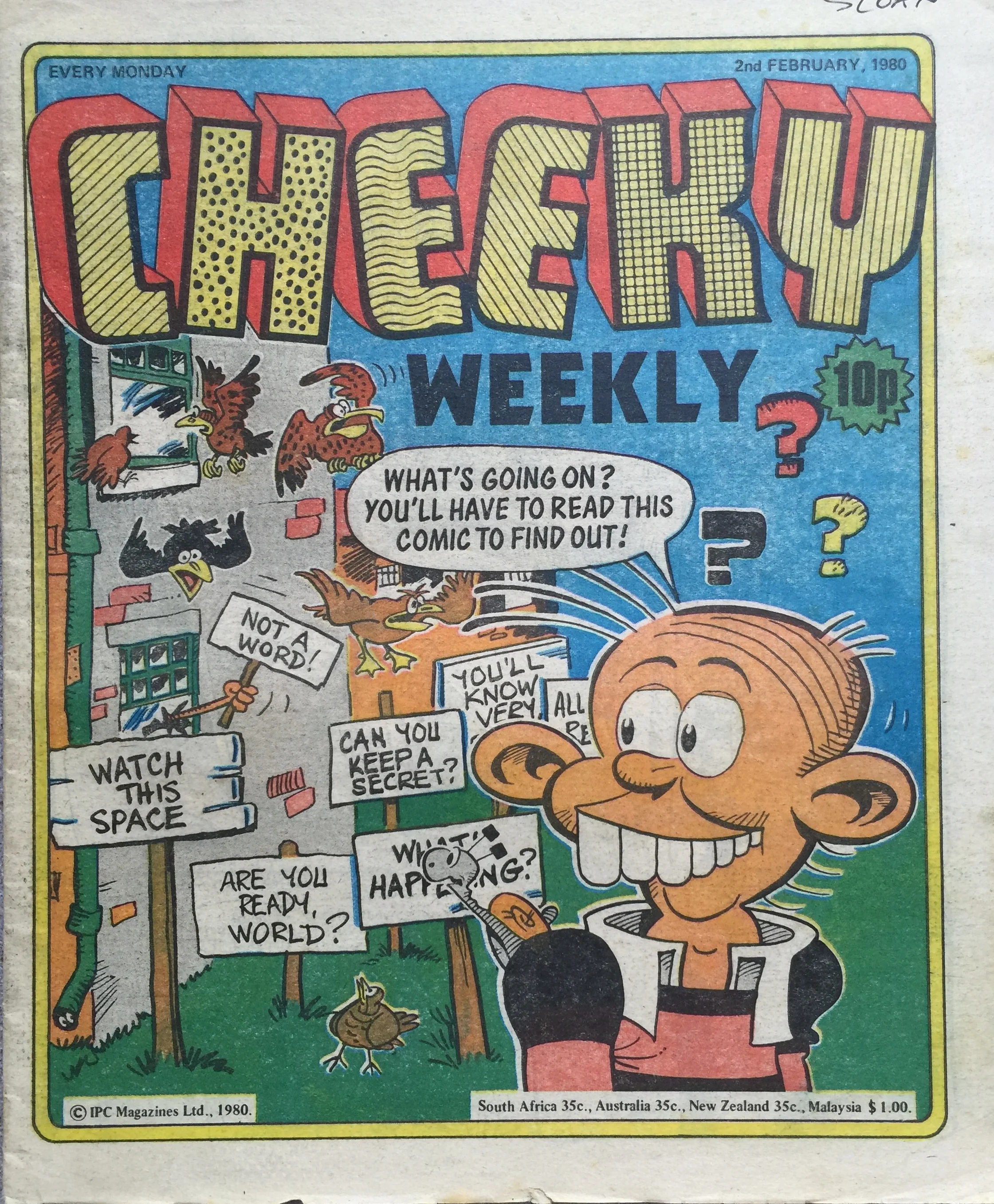 On this day, 2 February 1980 … the tombstone-teethtastic Cheeky was extracted from newsagents’ shelves for the final time, as the world’s most gregarious paperboy prepared to be merged into Whoopee! Cheeky never liked to do things as other comics would do, and so this is the most unusual of all pre-merger issues. There is something quite haunting about the way Cheeky is trolled about his impending fate – from the front cover through a number of interior pages to the final double-page reveal at the end – by mysterious sign-brandishing hands and even a number of his fellow regular characters who have all discovered the news before him.
