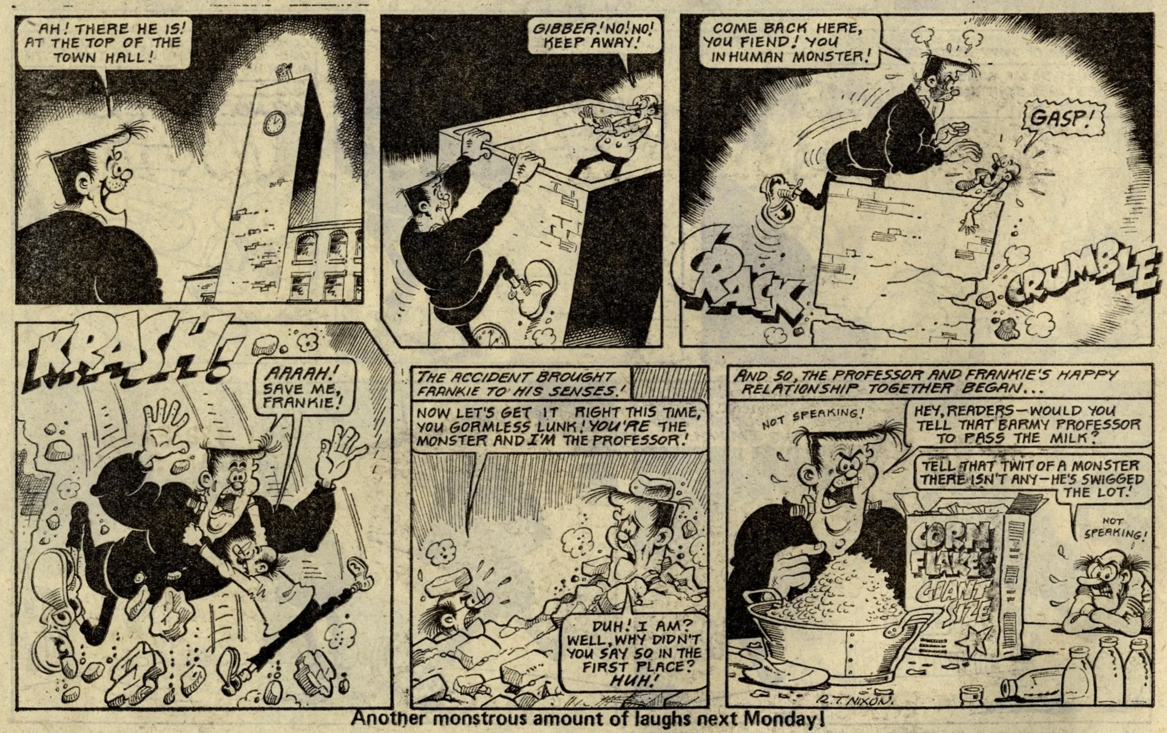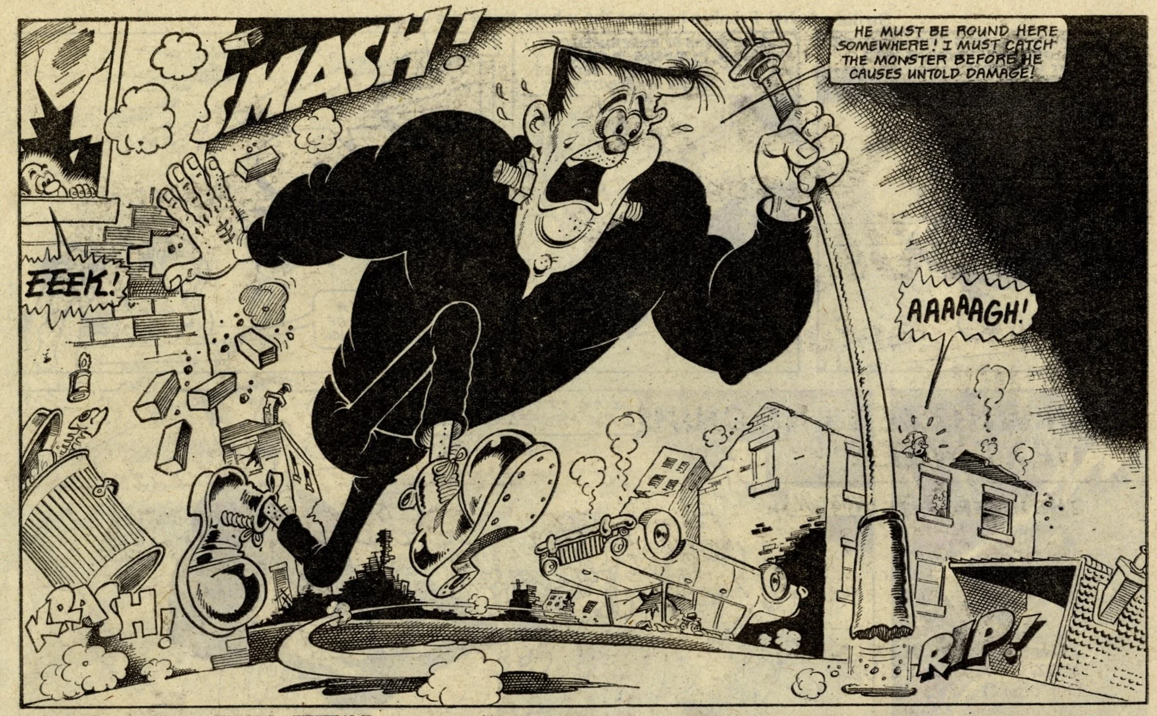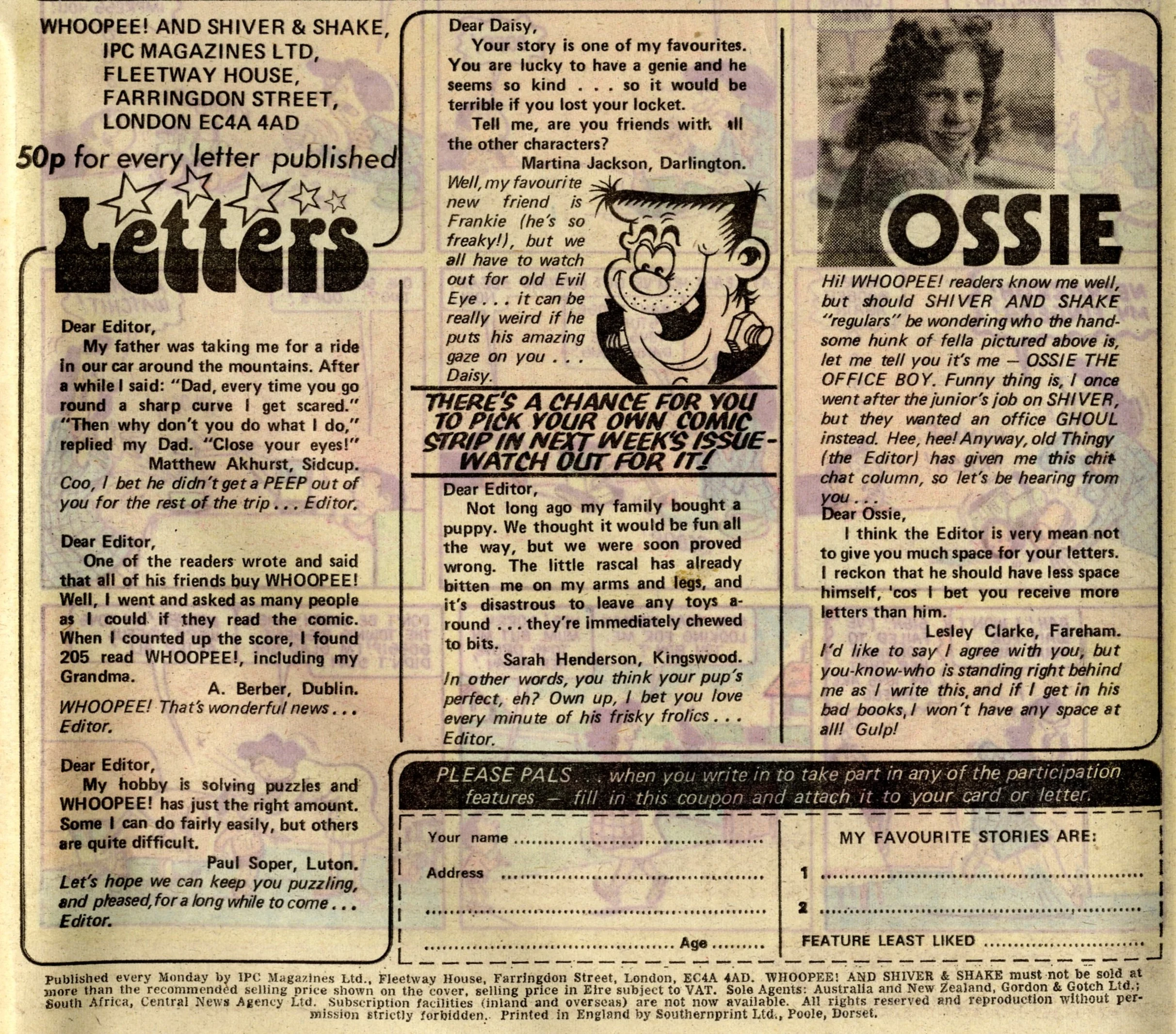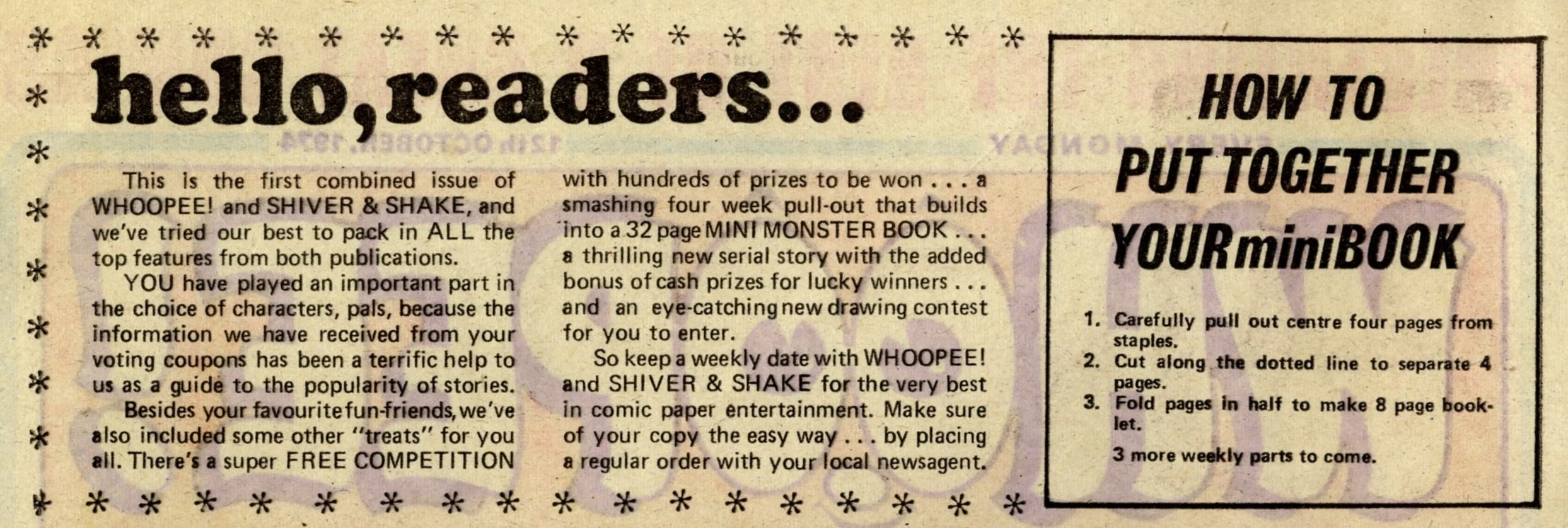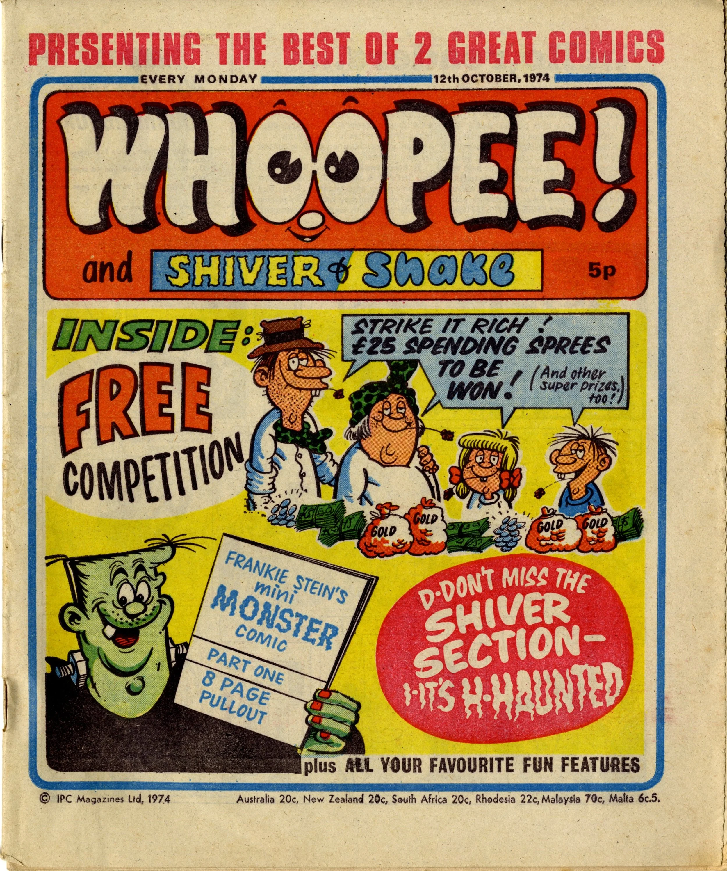 On this day, 12 October 1974 … Whoopee! had launched in March of this year, a decent comic but not particularly outstanding or especially different from stablemates Buster, Whizzer and Chips or Cor!! (which came to an end shortly after Whoopee!’s arrival). One wonders whether it was felt a shot in the arm was needed for Whoopee! to make it because its merger with Shiver and Shake seven months later marked something of a re-launch – a Whoopee! 2.0 – which gave the comic the particular character that will be far more recognisable to those who read and loved the comic throughout the rest of the decade and into the early 1980s: a wacky mix of slapstick humour and horror-based fun following the arrival of Shiver and Shake favourites such as Sweeny Toddler, Frankie Stein, Lolly Pop, Scream Inn and Creepy Car.