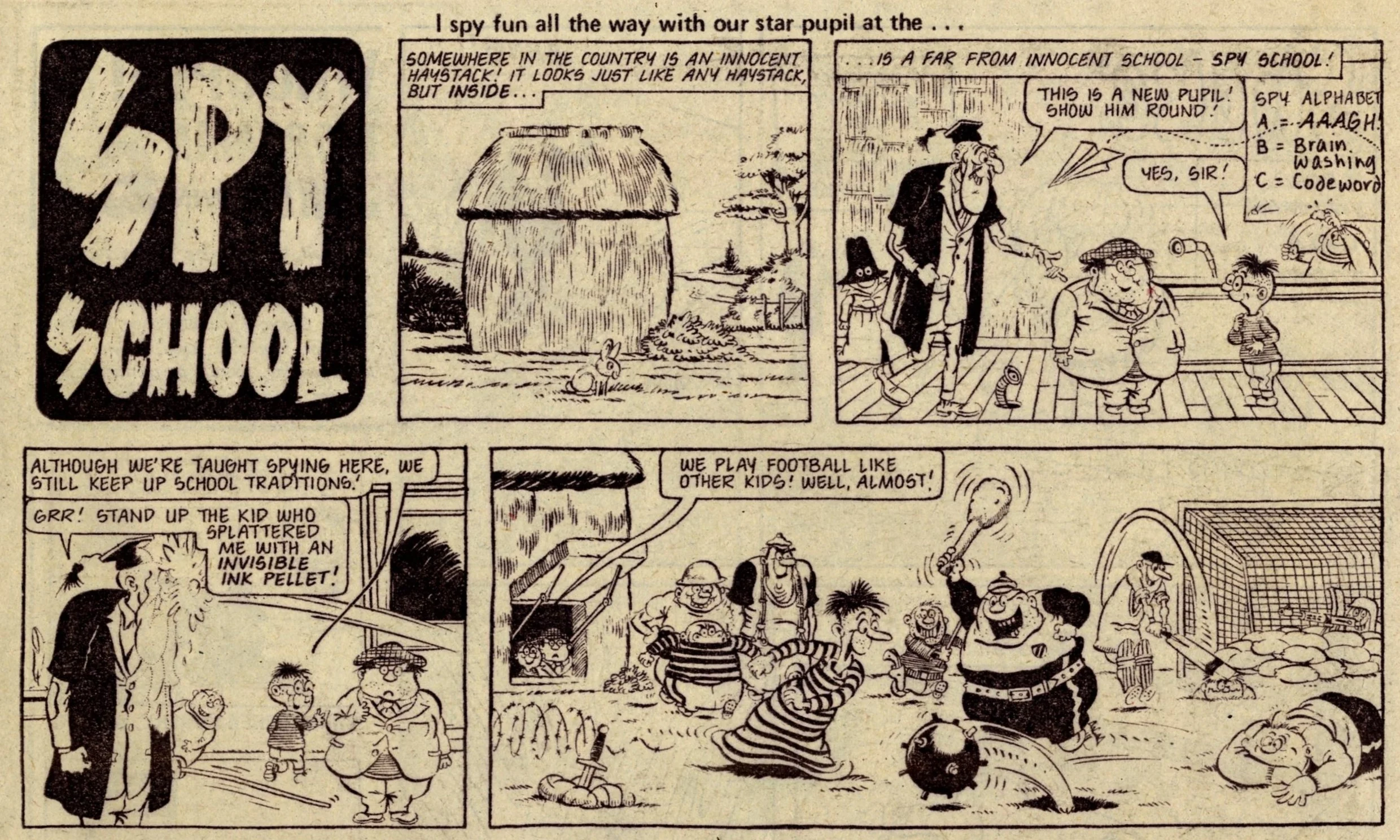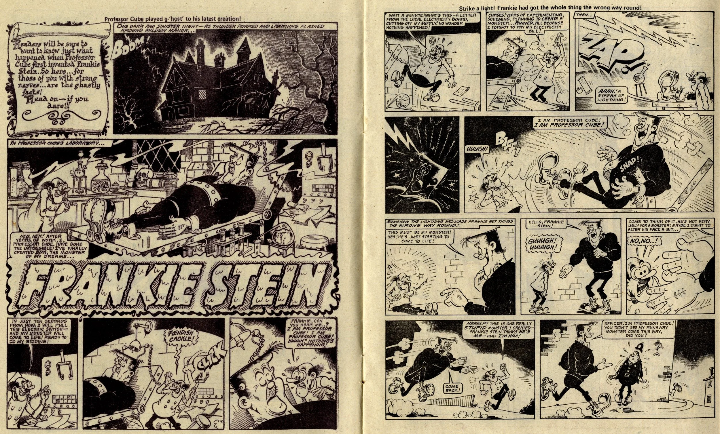 Because the editorial team took the re-boot, and the arrival of new readers from both merging comics, so seriously, they – and we now – were and are treated to a raft full of re-caps and character explanations that make this issue especially fun reading. Whoopee! stories such as Spy School (through the introduction of a new pupil), The Bumpkin Billionaires and Scared-stiff Sam, and Shiver and Shake’s Blunder Puss, Frankie Stein and Creepy Car all tell their origin stories, mostly through the use of flashback thought bubbles. Frankie’s three-page origin story is particularly good value so I’ve scanned it in full below, and I’ve also included a couple of frames from the original first episode of The Bumpkin Billionaires (drawn by Mike Lacey) for comparison against the re-drawn version by Tom Williams in this week’s issue.