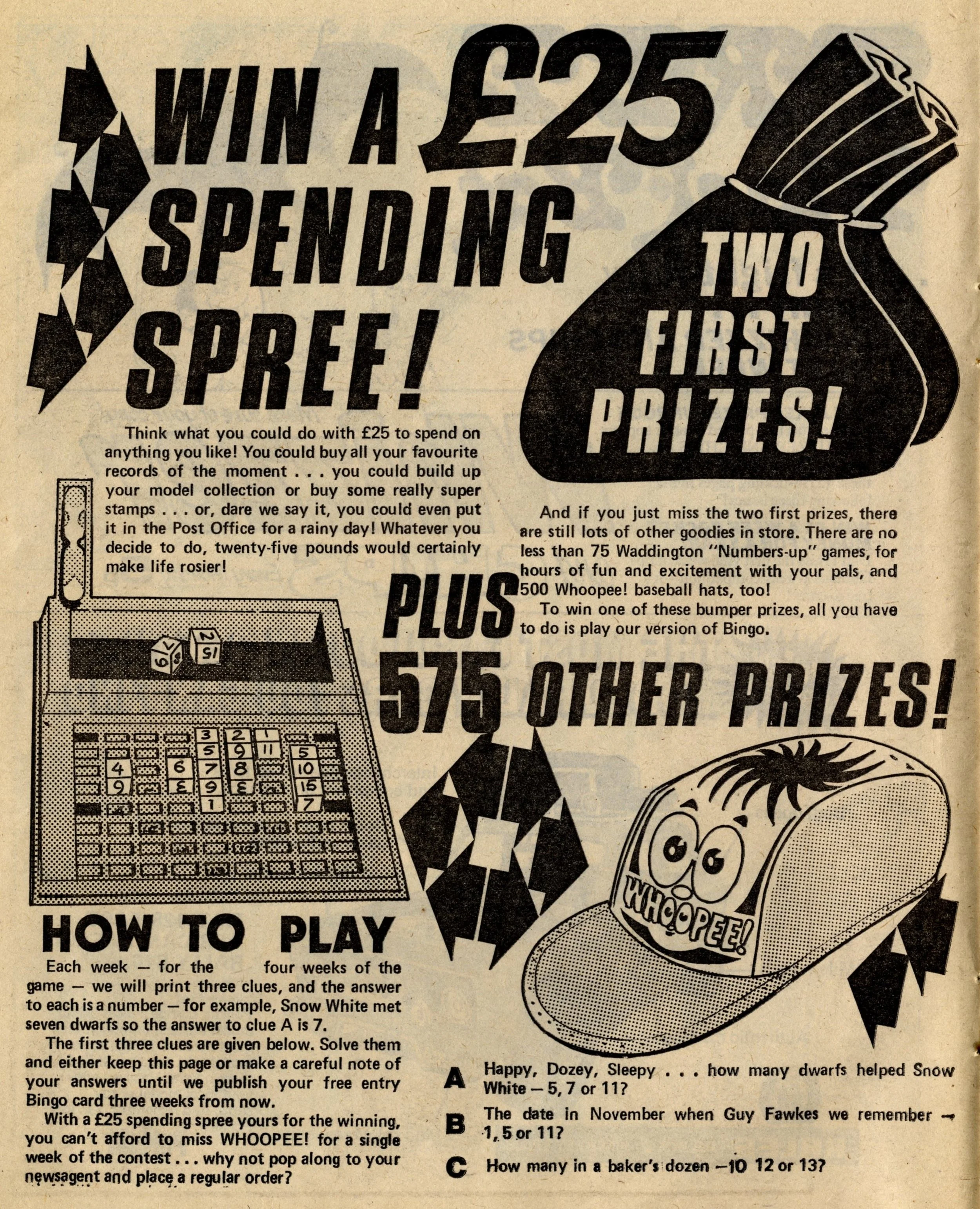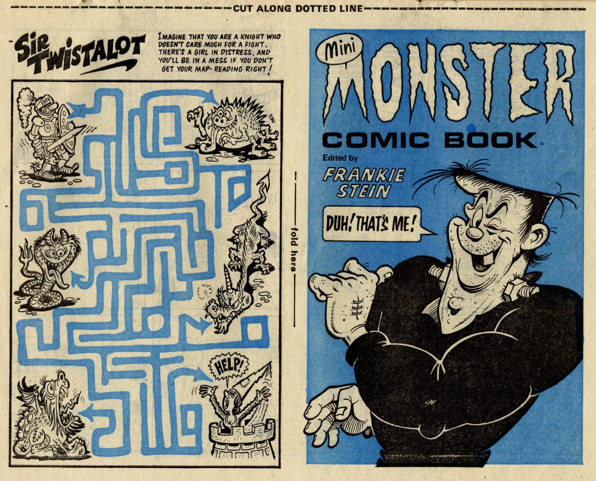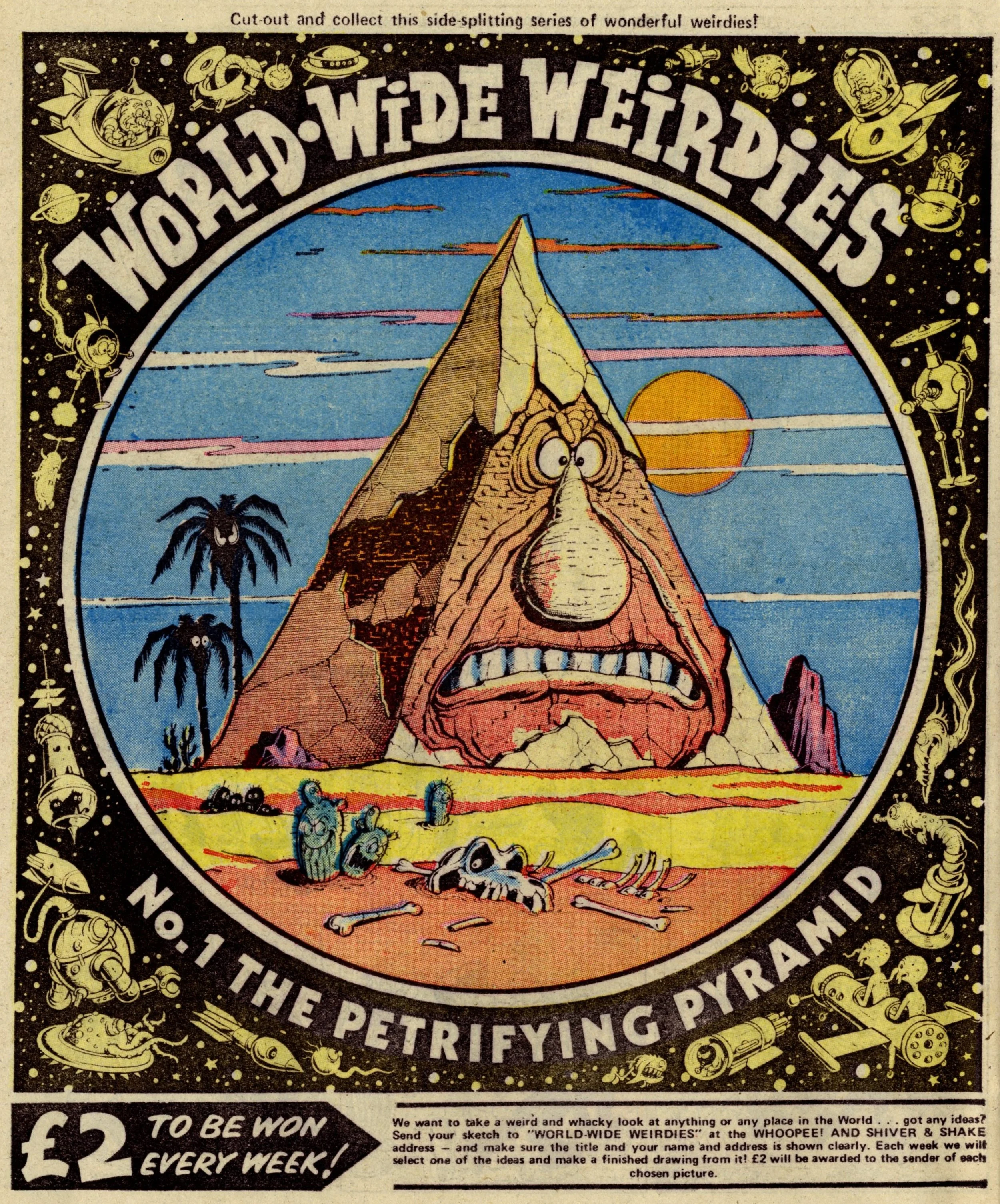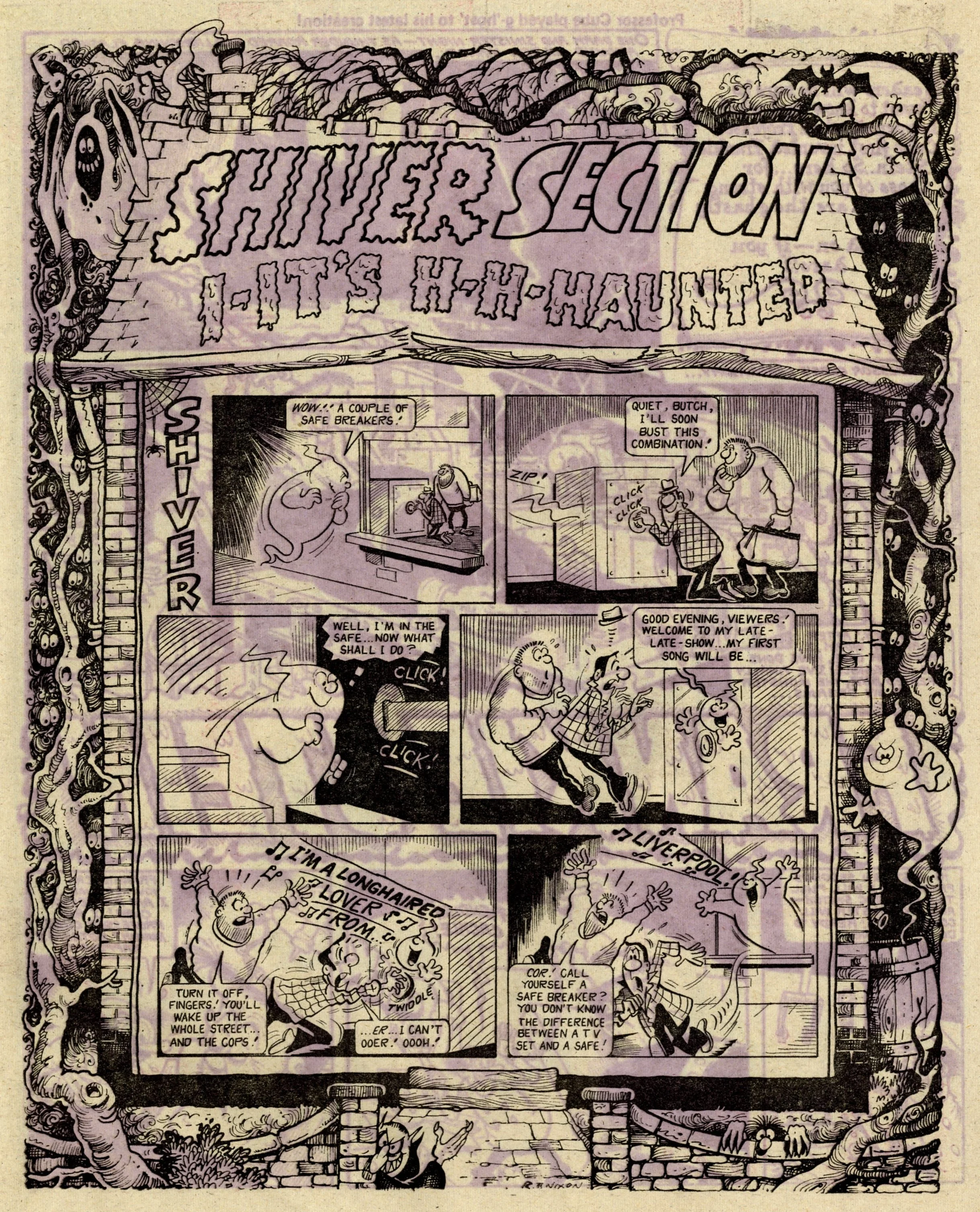 Like Shiver and Shake, this new Whoopee! starts out with a division between the horror and the non-horror strips, with a comic-within-a-comic pull-out ‘Shiver Section’ featuring the spooky stories from the original Shiver, plus Evil Eye which was original to Whoopee! In fact, Evil Eye is part of a comic-within-a-comic-within-a-comic, as the ‘Shiver Section’ has at its centre the first part of a cut-out ‘Mini Monster Comic Book’ mixing strips, gags and puzzles. The non-horror strips from the Shake half of Shiver and Shake (Shake himself, Blunder Puss and Lolly Pop) are shuffled into the main part of Whoopee!, as is the first of Ken Reid’s classic World-wide Weirdies pages (replacing his Wanted posters from Whoopee! and Creepy Creations from Shiver and Shake).