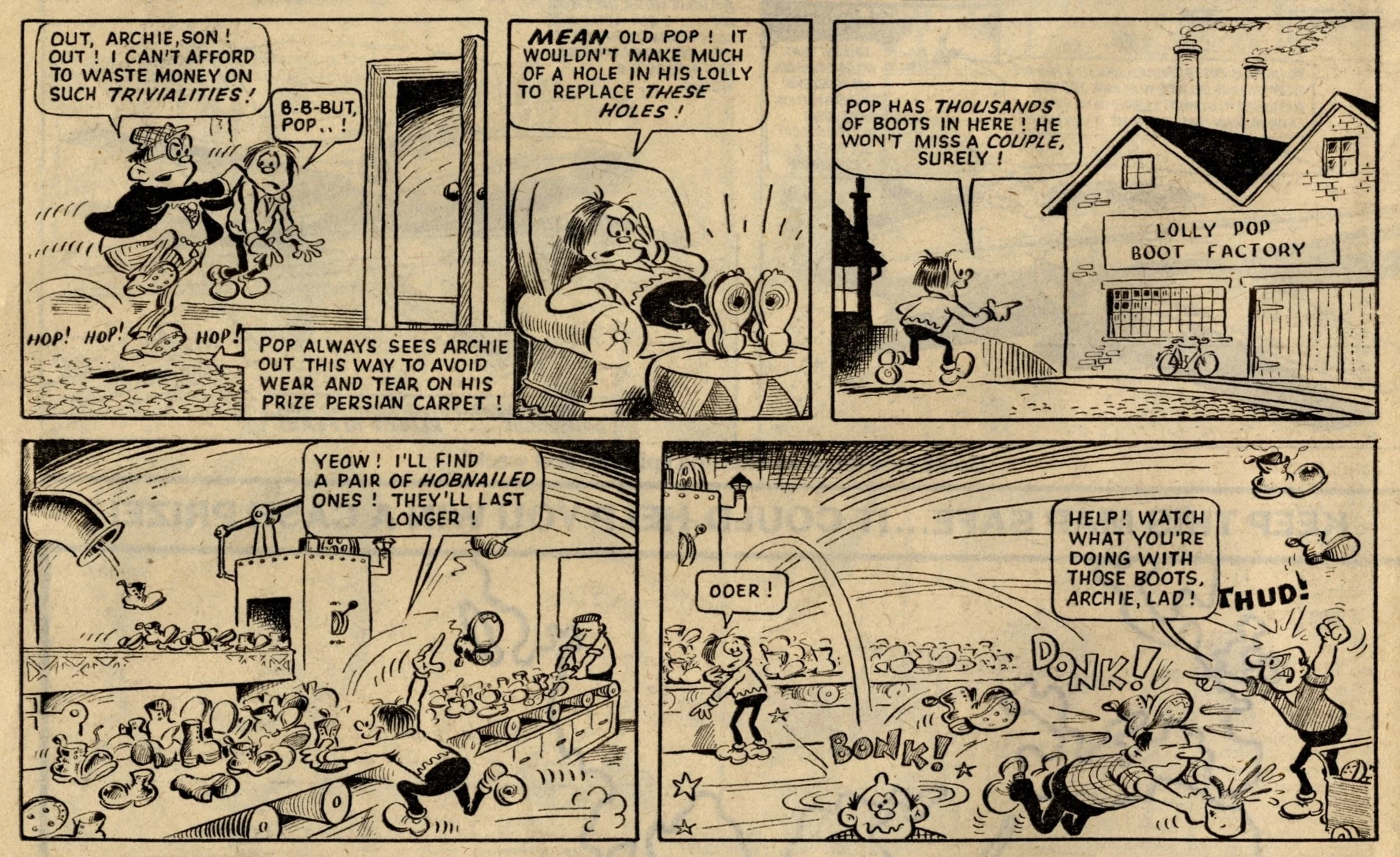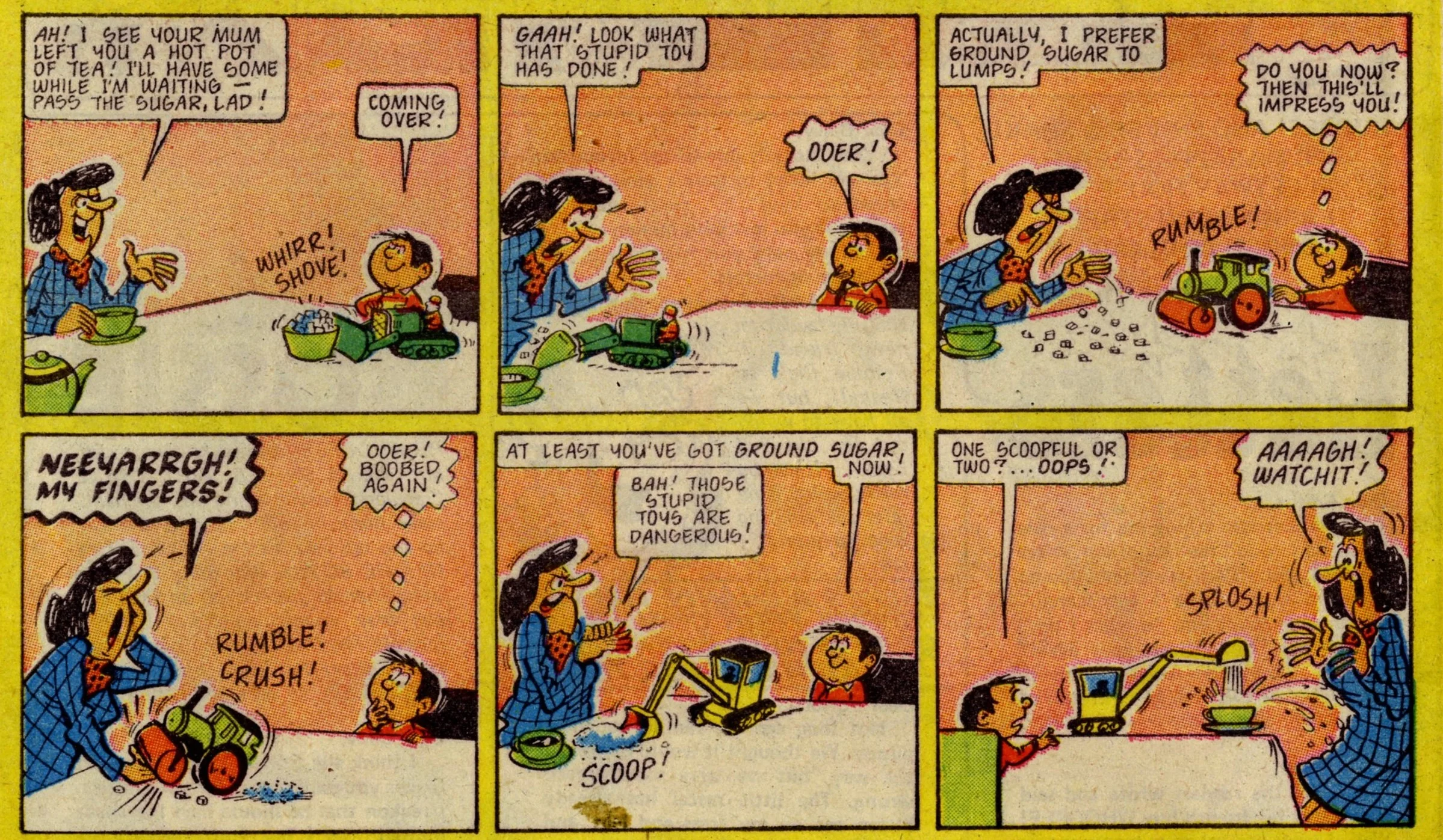 It’s an embarrassment of riches and one feels slightly sorry for those having to make the decisions on what to include and what to leave out … and even more sorry for those readers who lost favourite strips from either comic. The welcome letter on page two suggests that reader surveys were used to decide the final cut, but there must have been a fairly equal split of votes for a number of strips that didn’t make this first merged issue, as not long after the comic offered readers the chance to choose one more character for inclusion. Over the course of eight weeks they ran an episode each of the following stories, at the end of which readers would vote for who they wanted to save: from Whoopee!, The Upper Crusts and the Lazy Loafers, Snap Happy, Little Miss Muffit and Pop Snorer; from Shiver and Shake, The Desert Fox, Grimly Feendish, Sweeny Toddler; and another story from whence I know not where, Tony’s Toolbox!