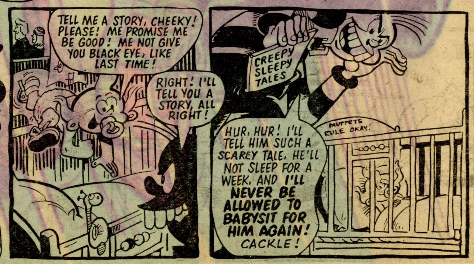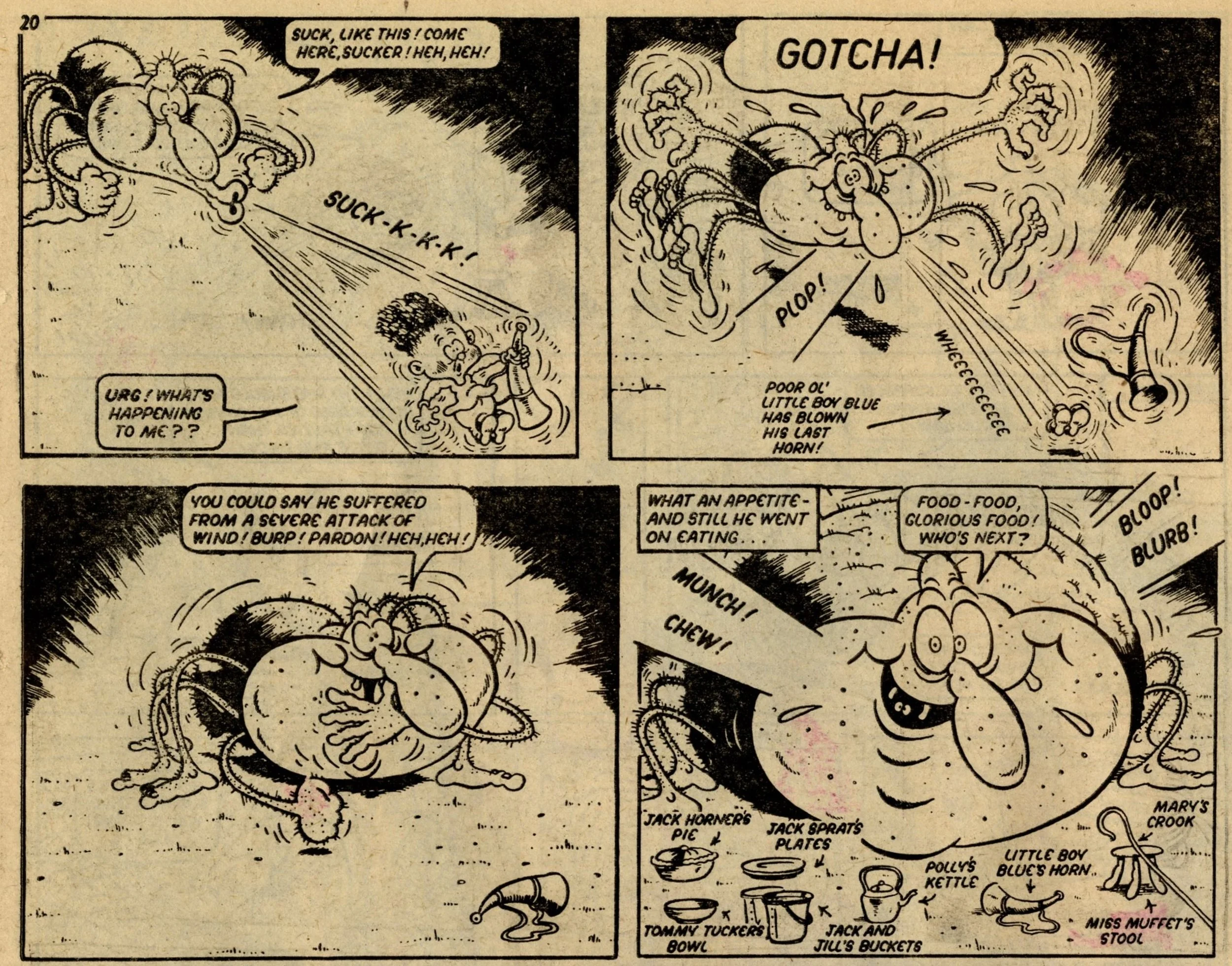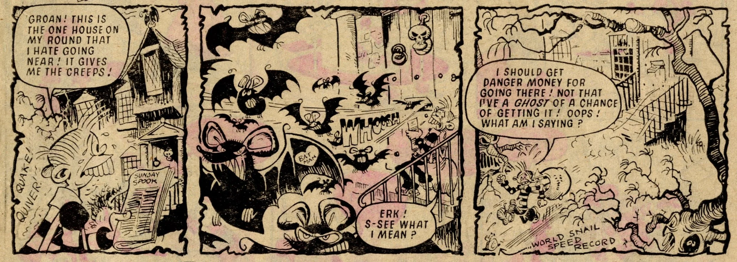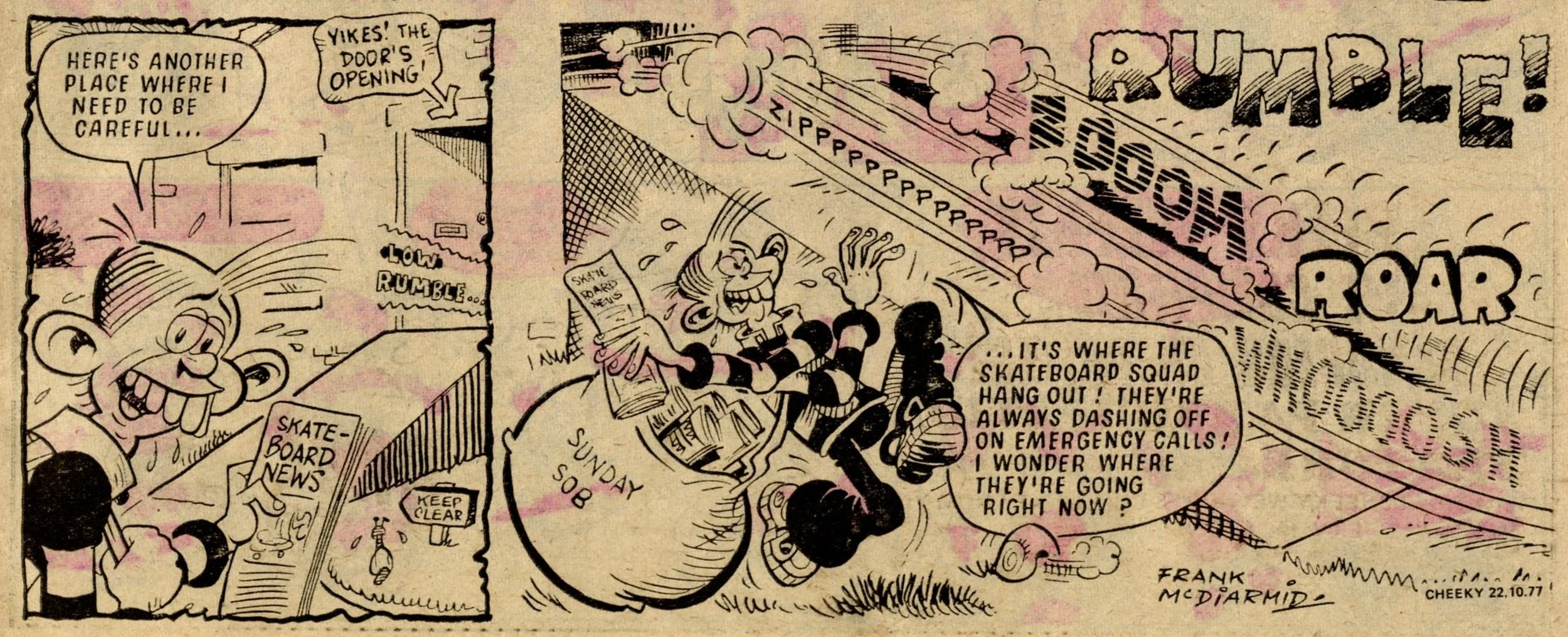 Cheeky’s strong roster of back-up strips kicks off with Mike Lacey’s Skateboard Squad, Ian Knox’s 6 Million Dollar Gran (which Cheeky watches after school on Mondays), and Reg Parlett’s Mustapha Million (which he reads in the secretive Mystery Comic found each week at a different place in the town). Episodes of Wile E. Coyote and John Richardson’s Space Family Robinson are on show at the Krazy Town picture house, and Cheeky reads chapters of two surprisingly dark books: James Bold in Fangs of Fear (with macabre Massimo Belardinelli art) and a Mike Brown Creepy Sleepy Tale in which Little Miss Muffet’s spider eats his way through a cast of fairy tale favourite characters. What a cheek!