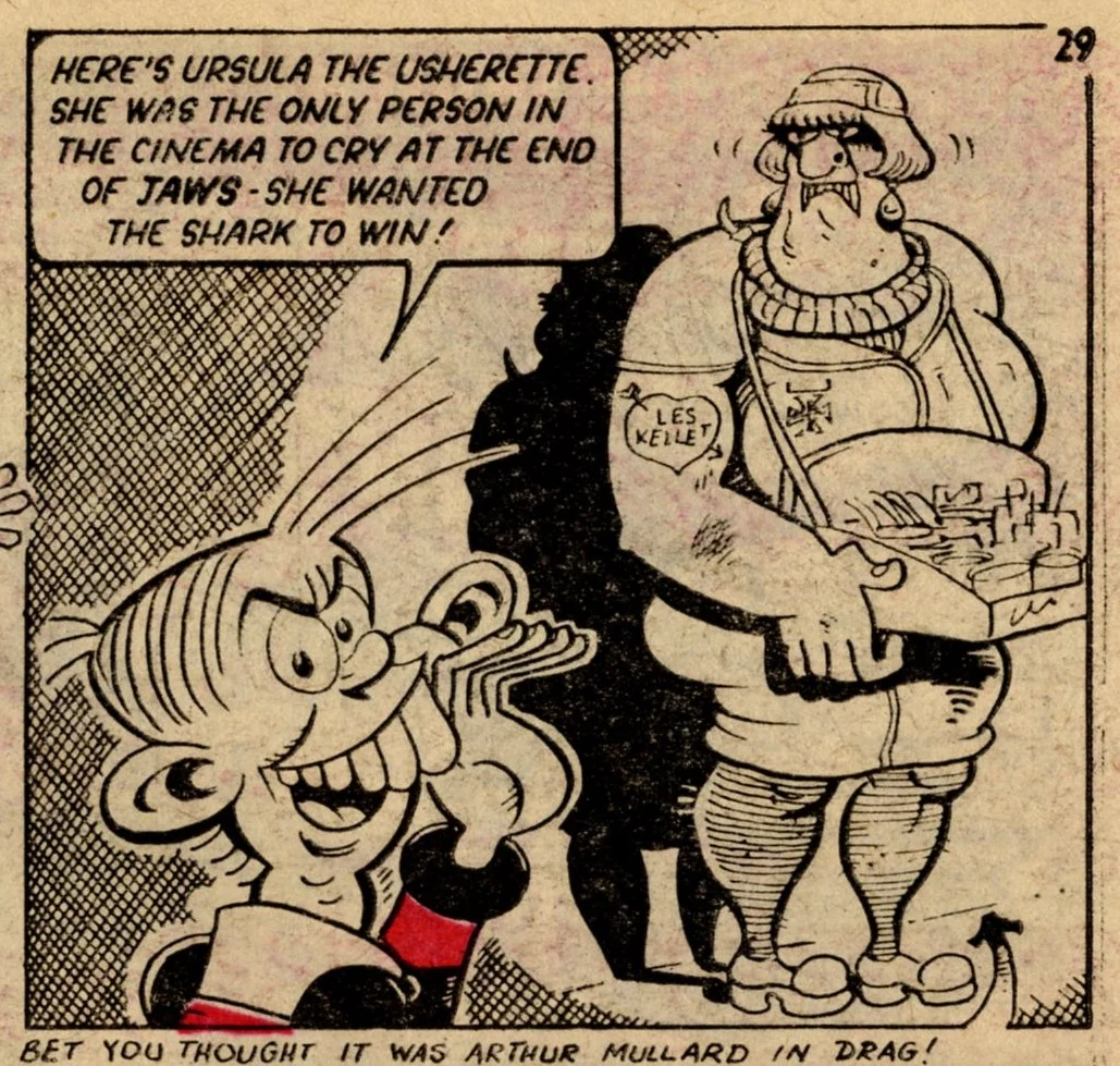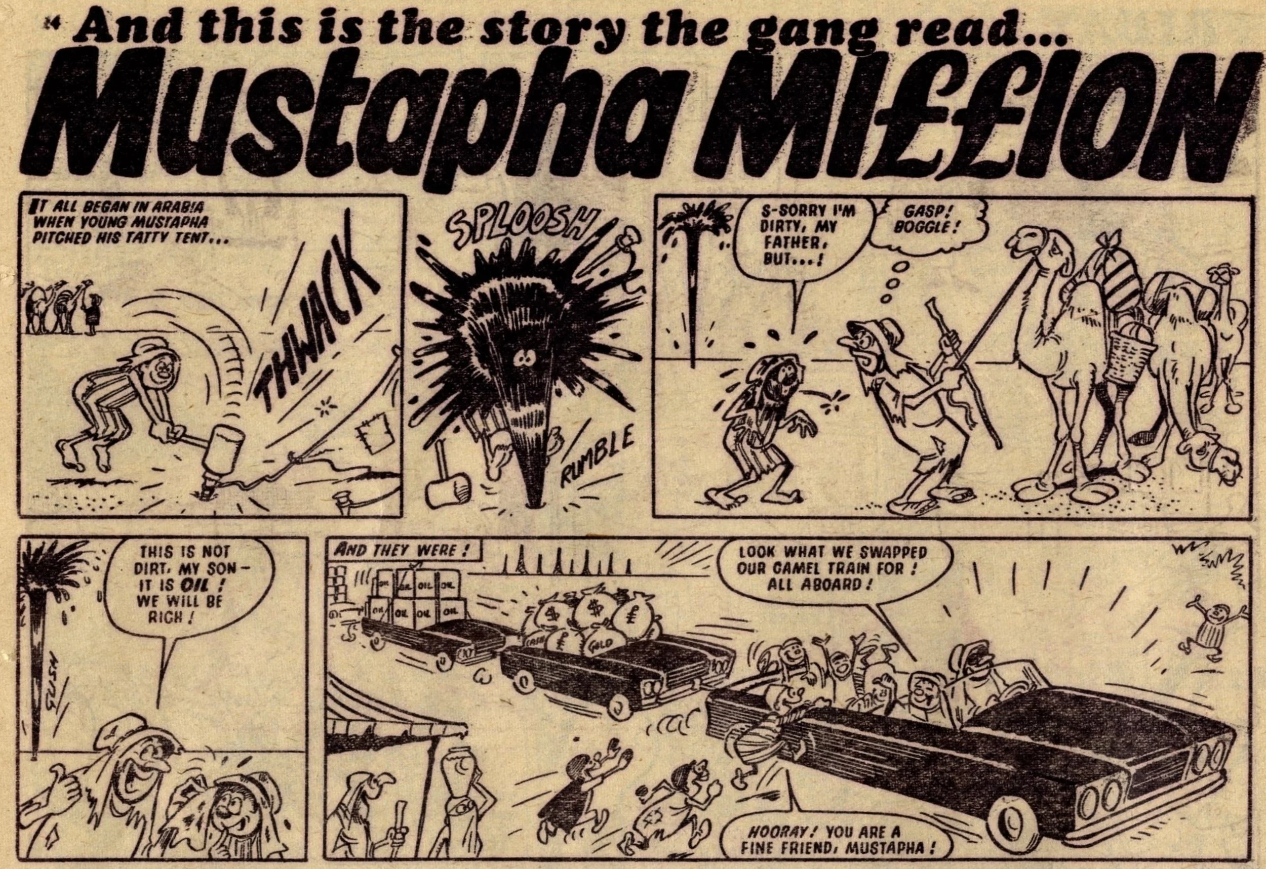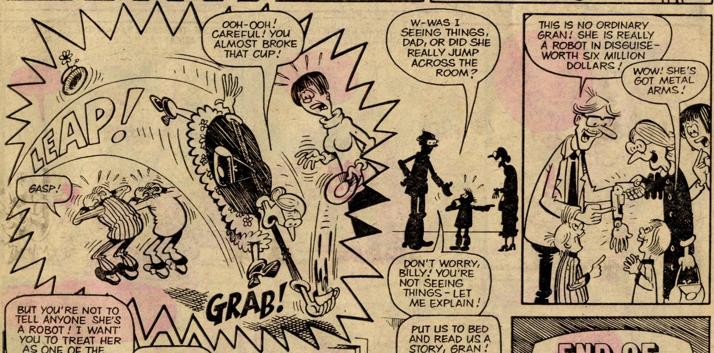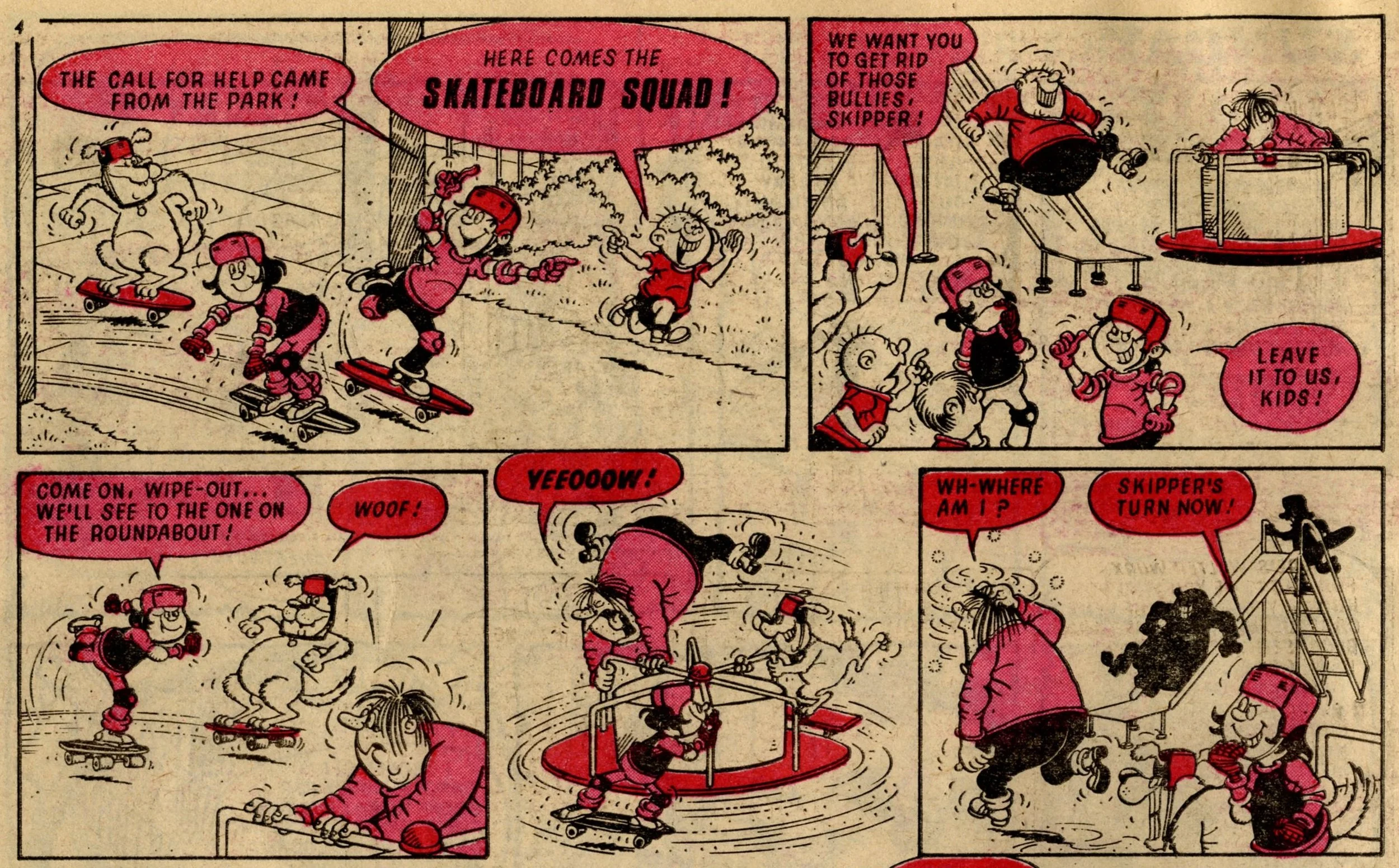 Cheeky’s strong roster of back-up strips kicks off with Mike Lacey’s Skateboard Squad, Ian Knox’s 6 Million Dollar Gran (which Cheeky watches after school on Mondays), and Reg Parlett’s Mustapha Million (which he reads in the secretive Mystery Comic found each week at a different place in the town). Episodes of Wile E. Coyote and John Richardson’s Space Family Robinson are on show at the Krazy Town picture house, and Cheeky reads chapters of two surprisingly dark books: James Bold in Fangs of Fear (with macabre Massimo Belardinelli art) and a Mike Brown Creepy Sleepy Tale in which Little Miss Muffet’s spider eats his way through a cast of fairy tale favourite characters. What a cheek!