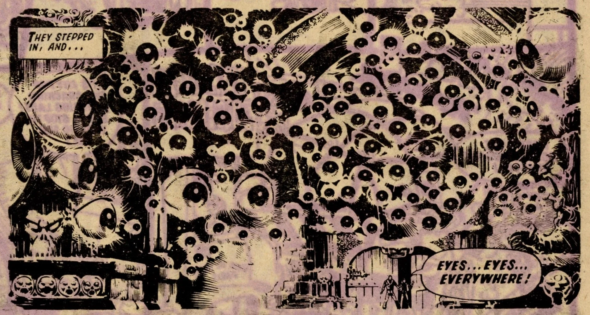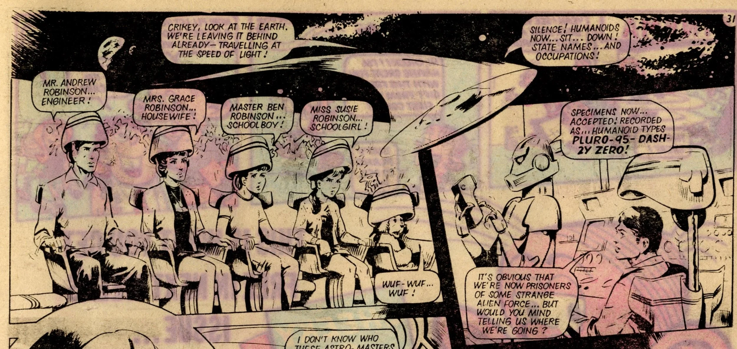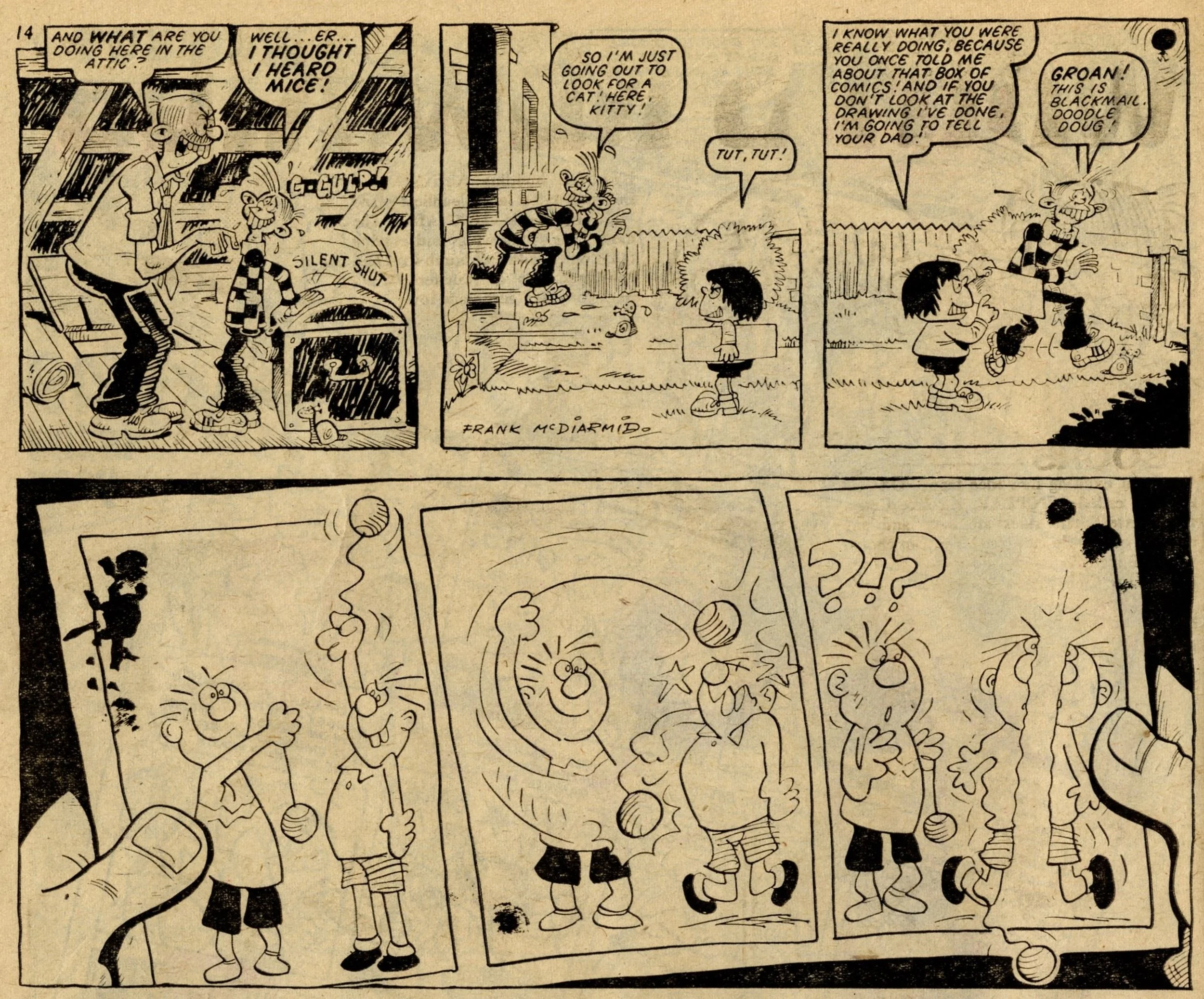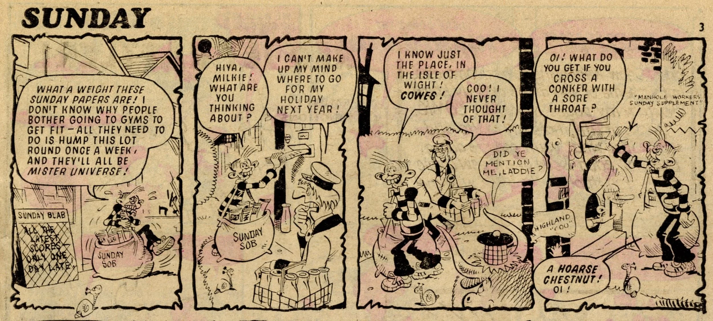 Cheeky’s strong roster of back-up strips kicks off with Mike Lacey’s Skateboard Squad, Ian Knox’s 6 Million Dollar Gran (which Cheeky watches after school on Mondays), and Reg Parlett’s Mustapha Million (which he reads in the secretive Mystery Comic found each week at a different place in the town). Episodes of Wile E. Coyote and John Richardson’s Space Family Robinson are on show at the Krazy Town picture house, and Cheeky reads chapters of two surprisingly dark books: James Bold in Fangs of Fear (with macabre Massimo Belardinelli art) and a Mike Brown Creepy Sleepy Tale in which Little Miss Muffet’s spider eats his way through a cast of fairy tale favourite characters. What a cheek!