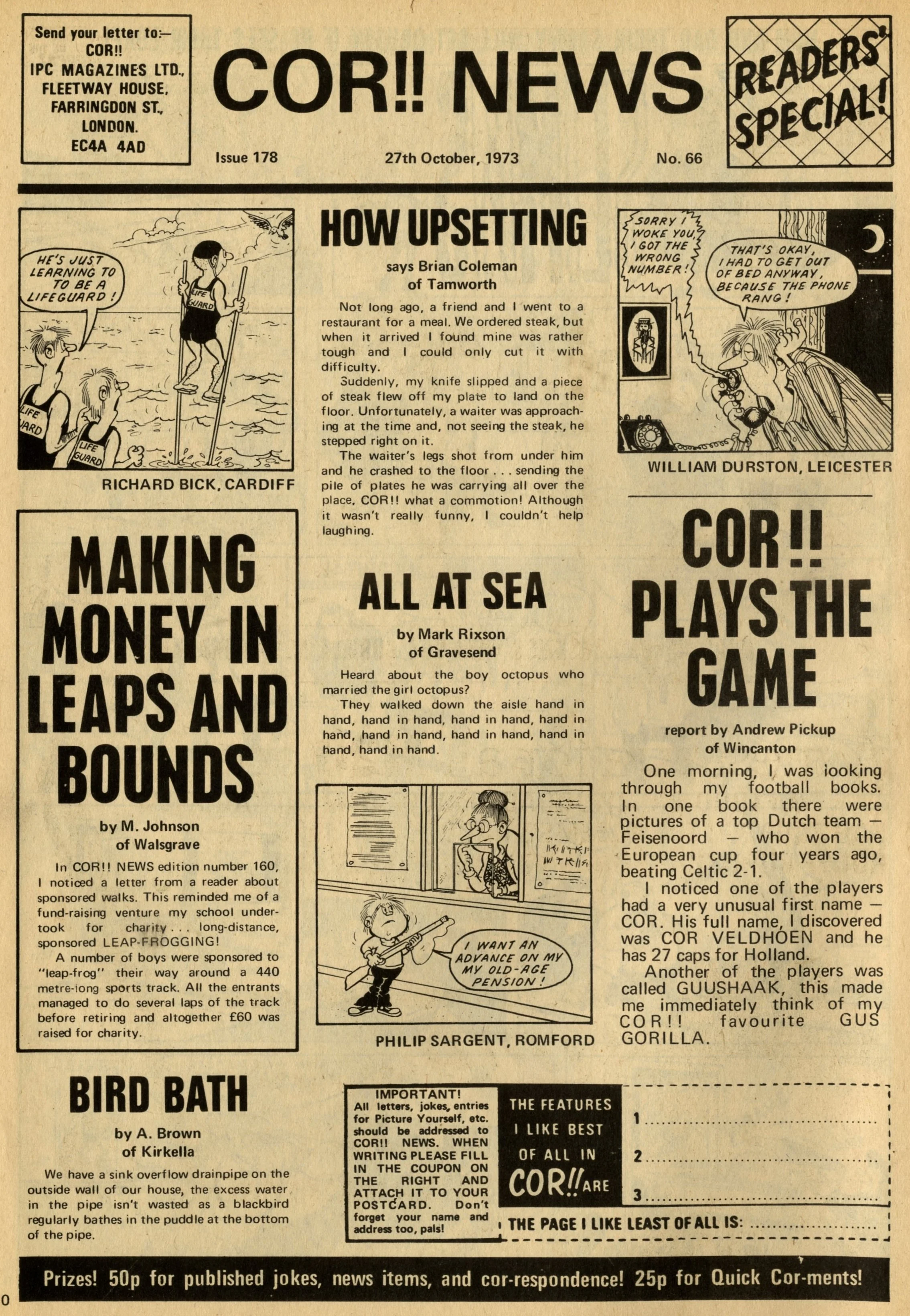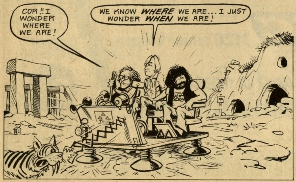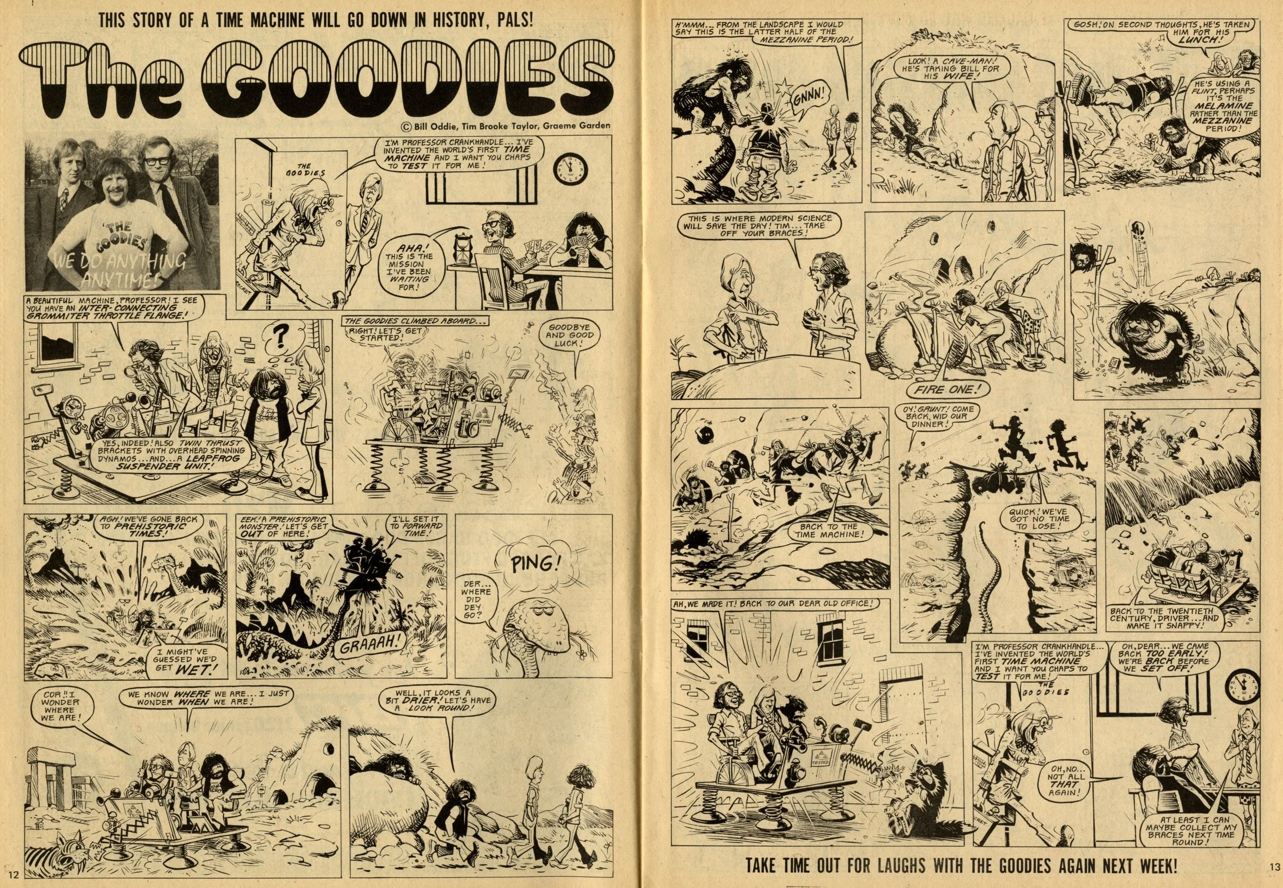 On this day, 27 October 1973 … In what must have been quite a coup for the editorial team on Cor!!, in 1973 TV’s The Goodies signed to the comic, and appeared in 52 double-page episodes throughout the year. The Cambridge Footlights-originated trio of Tim Brooke-Taylor, Graeme Garden and Bill Oddie were hot property in the 1970s and stars of their own comedy show which ran for the entire decade. It was an imaginative and hugely popular show, each episode of which followed a very basic theme, quest or challenge for the Goodies, who would often travel about on a three-seater bicycle, to interpret with increasingly surreal and bonkers results. This format lent itself well to adaptation in comic strip form, and the brilliant Joe Colquhoun – better known to us now for his work on Charley’s War, Johnny Red and Roy of the Rovers – demonstrated an accomplished cartooning style to bring the goody goody yum yum threesome to life.