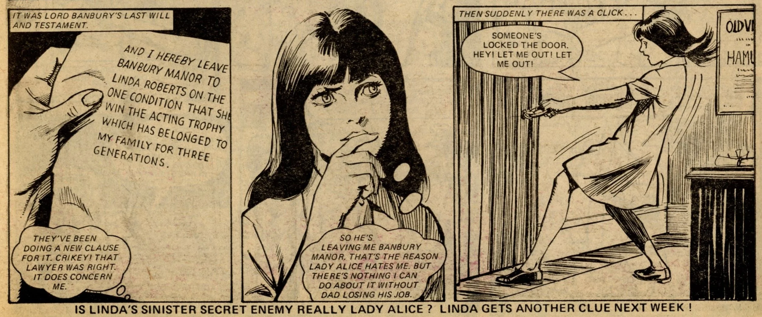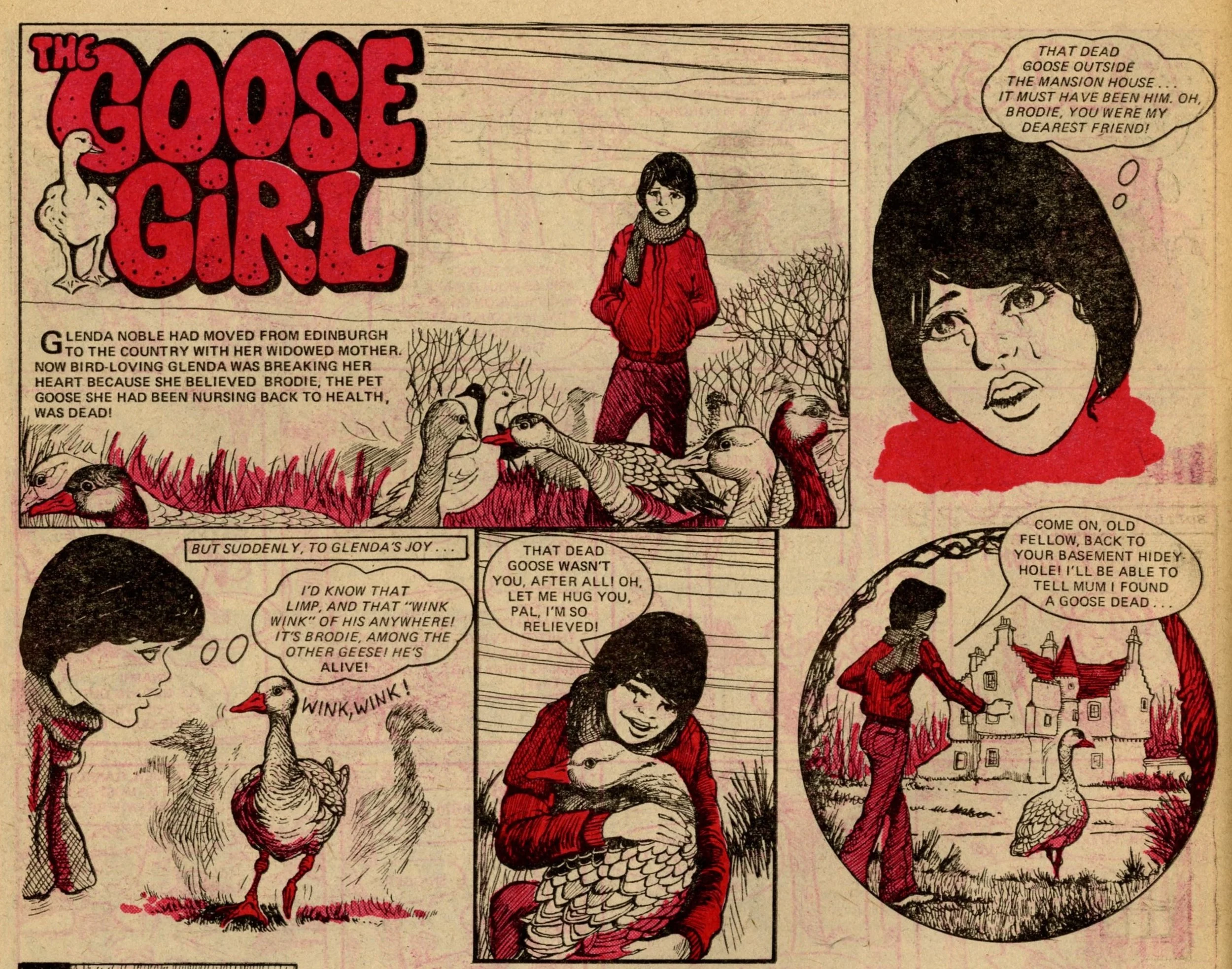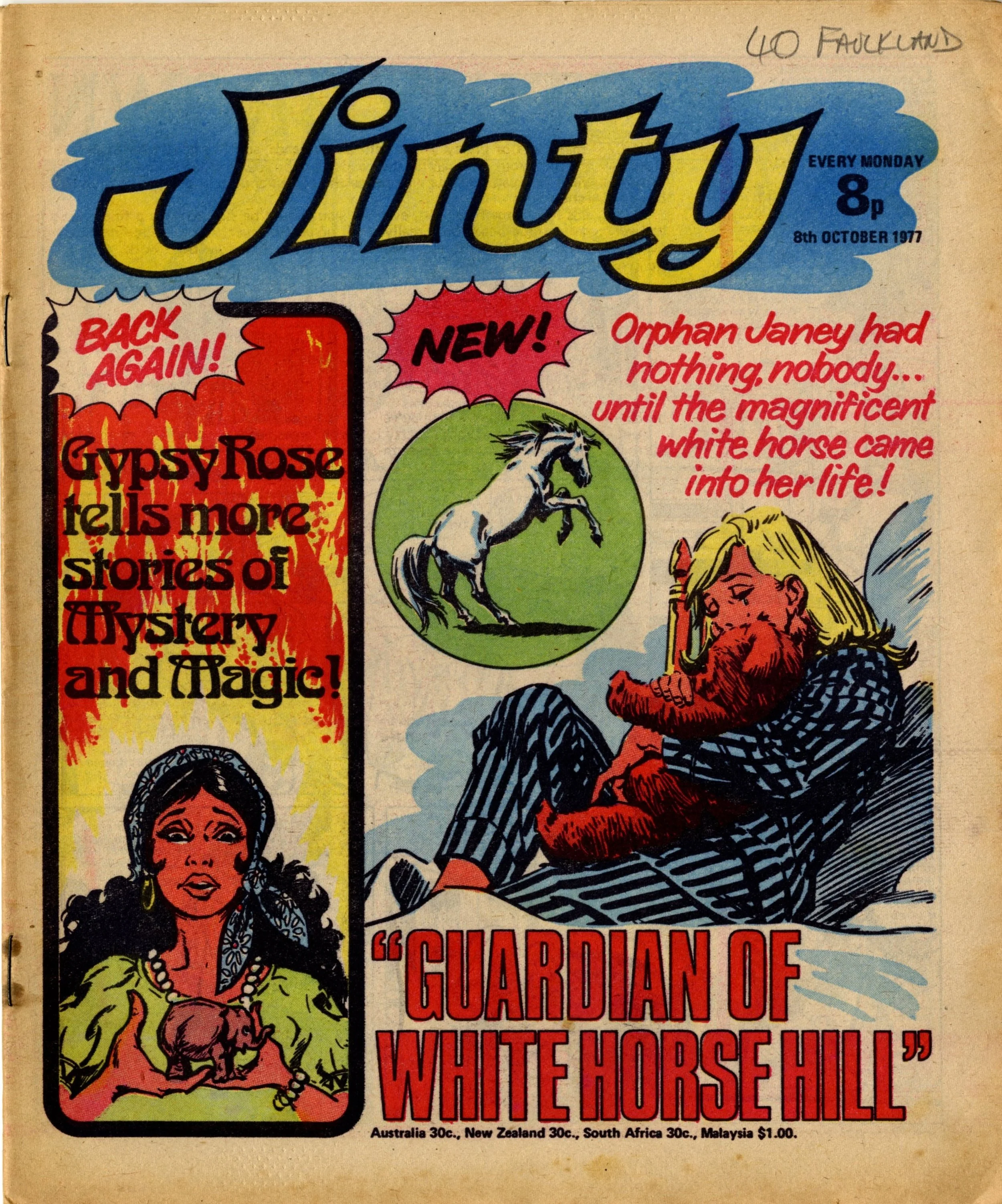 On this day, 8 October 1977 … I’m always interested to see the first episode of new stories. There werelot of them in girls’ papers such as Jinty and Tammy because they generally had a number of serials running at any one time, all starting and ending at different times. But this Jinty cover, highlighting the beginning of Guardian of White Horse Hill and the return to the comic of a new run of Gypsy Rose’s Tales of Mystery and Magic, is particularly striking. I think it’s possibly because there is more white on the cover than was normal in Jinty around this time – its covers were usually quite colour-dense – which makes the central image stand out, and also because the two new stories seem especially representative of the mystery and sorrow that were so characteristic of many of Jinty’s best stories.