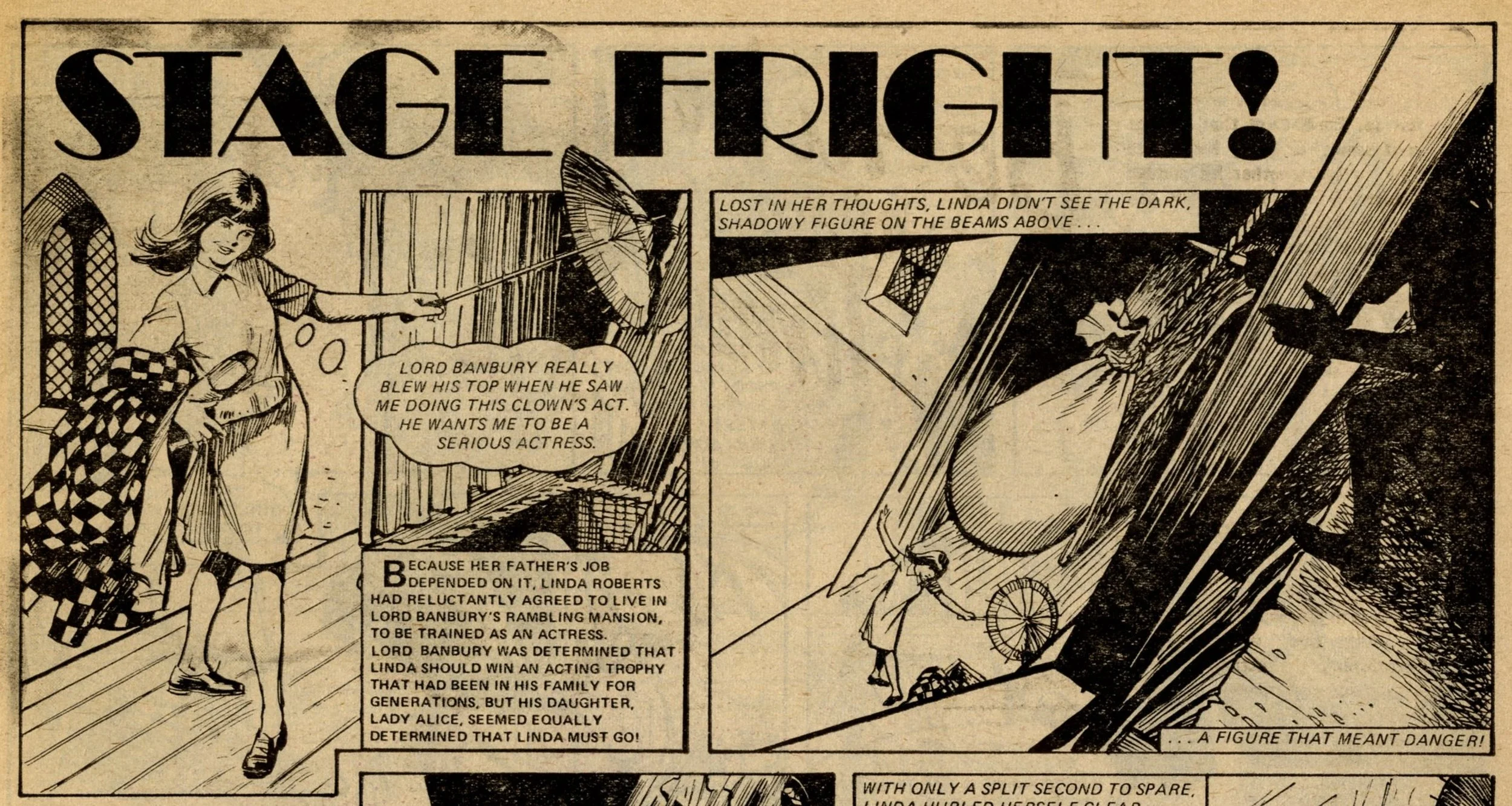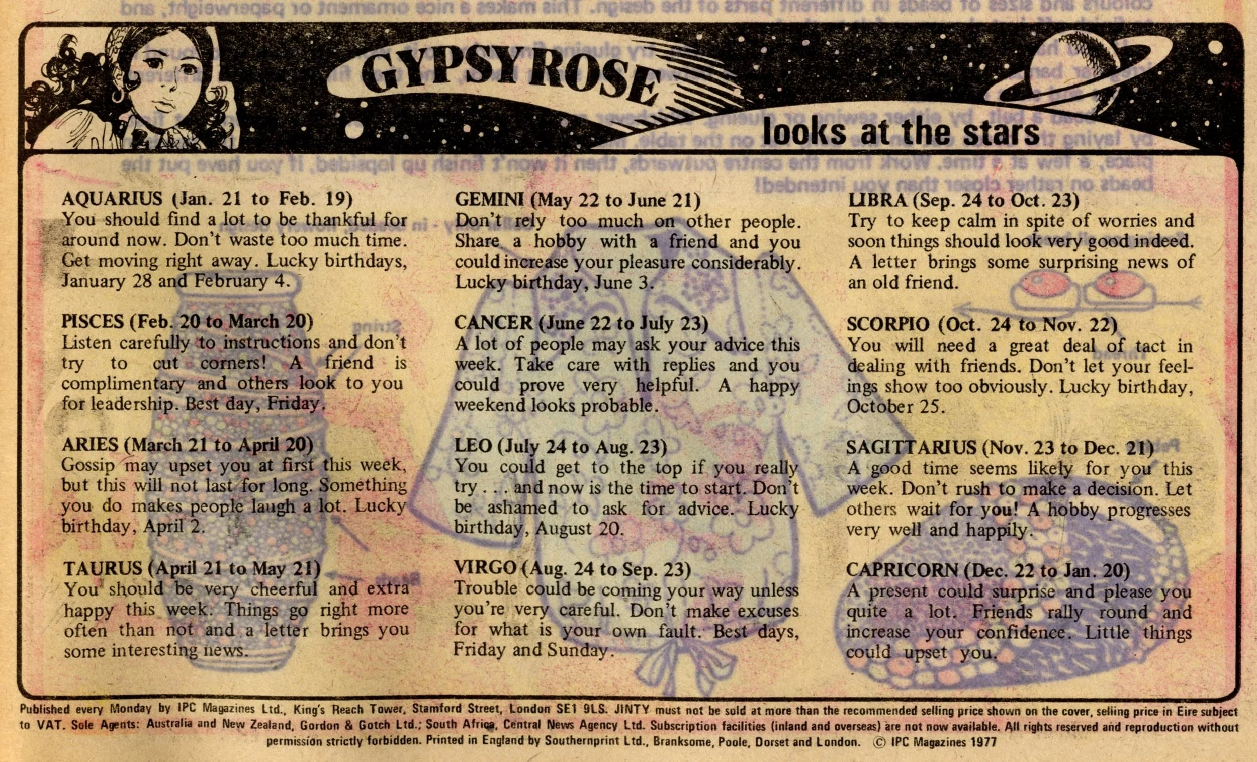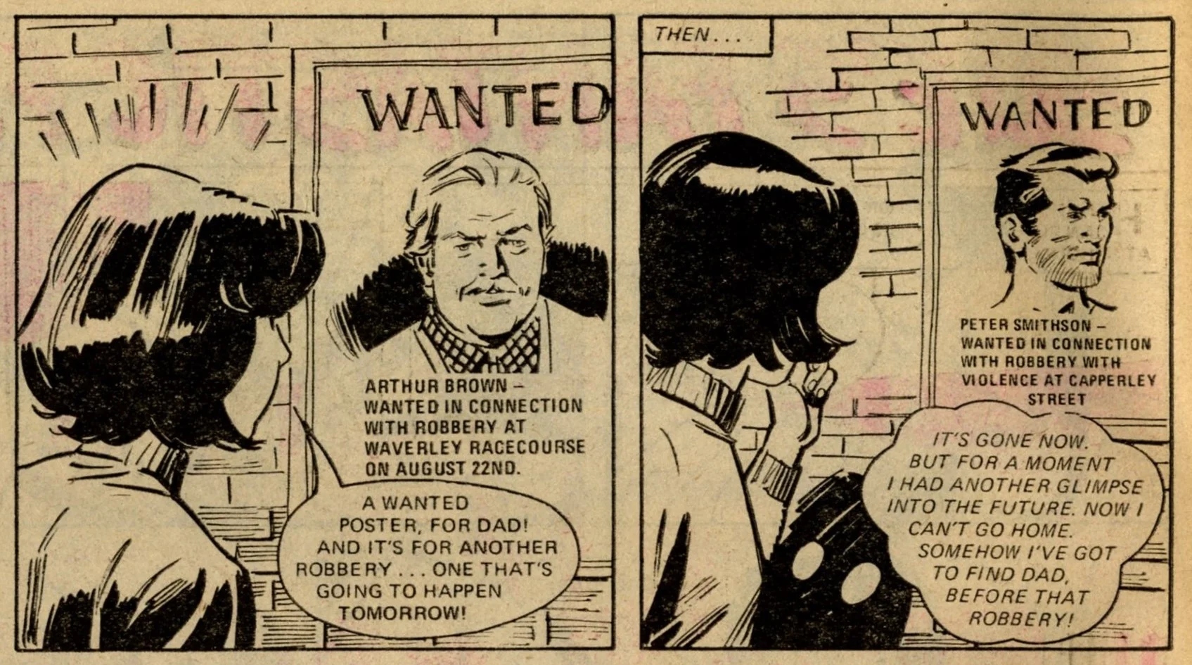 On this day, 8 October 1977 … I’m always interested to see the first episode of new stories. There werelot of them in girls’ papers such as Jinty and Tammy because they generally had a number of serials running at any one time, all starting and ending at different times. But this Jinty cover, highlighting the beginning of Guardian of White Horse Hill and the return to the comic of a new run of Gypsy Rose’s Tales of Mystery and Magic, is particularly striking. I think it’s possibly because there is more white on the cover than was normal in Jinty around this time – its covers were usually quite colour-dense – which makes the central image stand out, and also because the two new stories seem especially representative of the mystery and sorrow that were so characteristic of many of Jinty’s best stories.