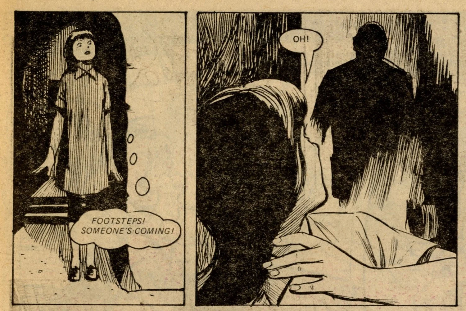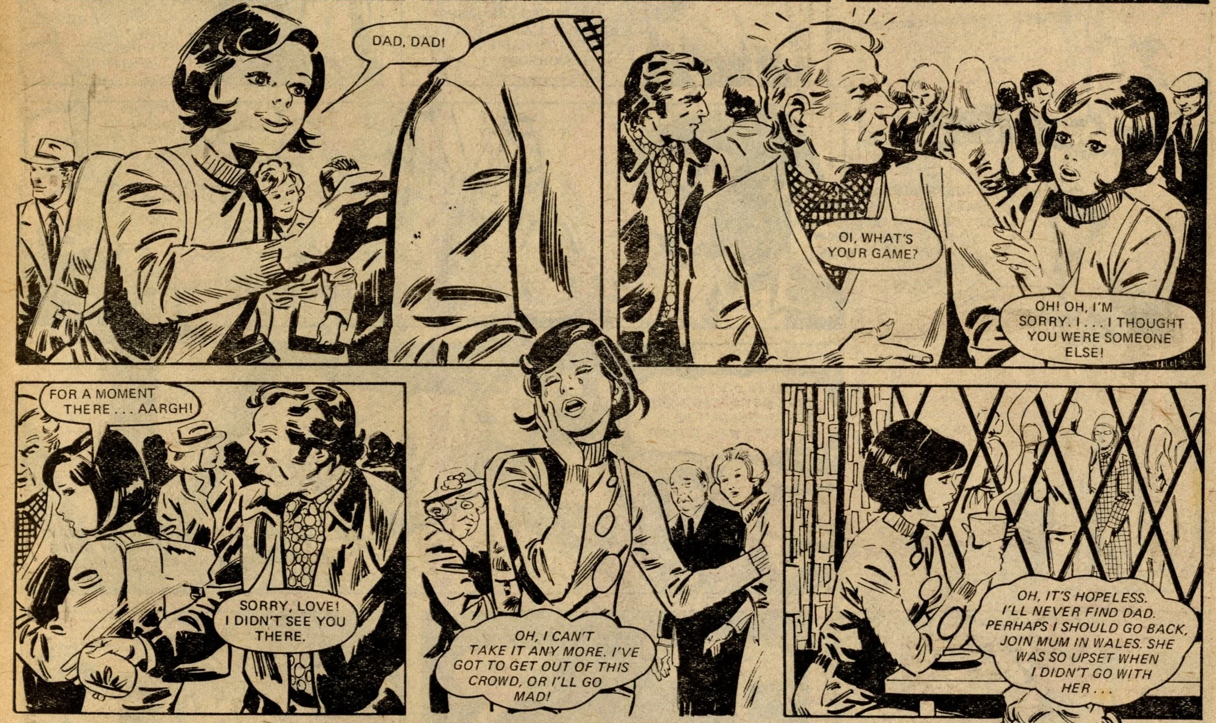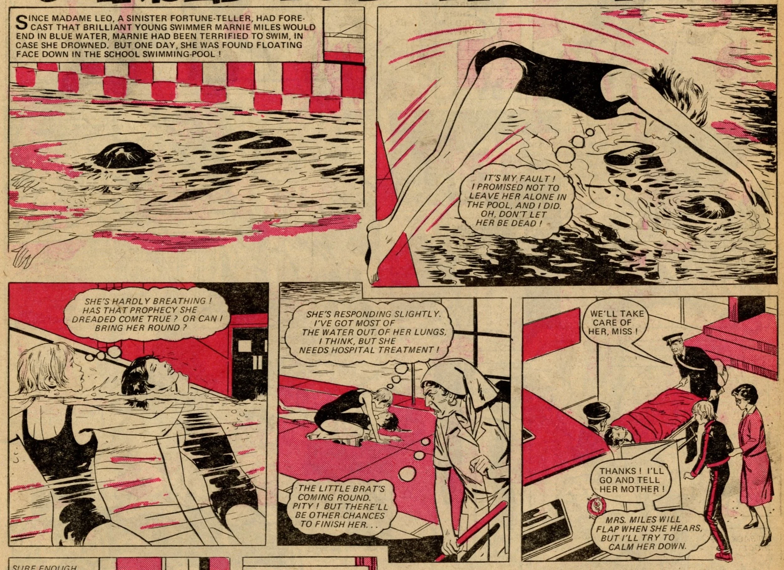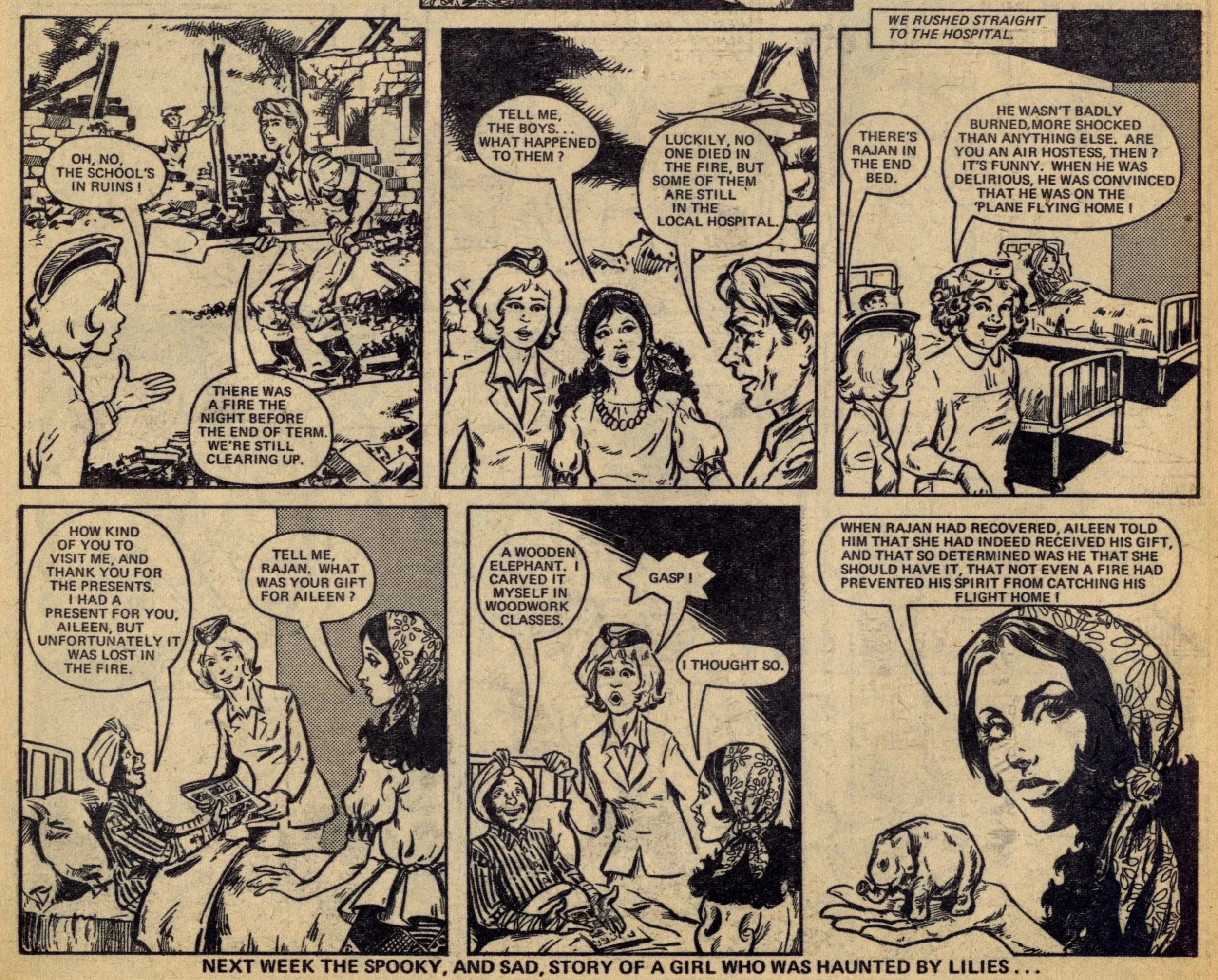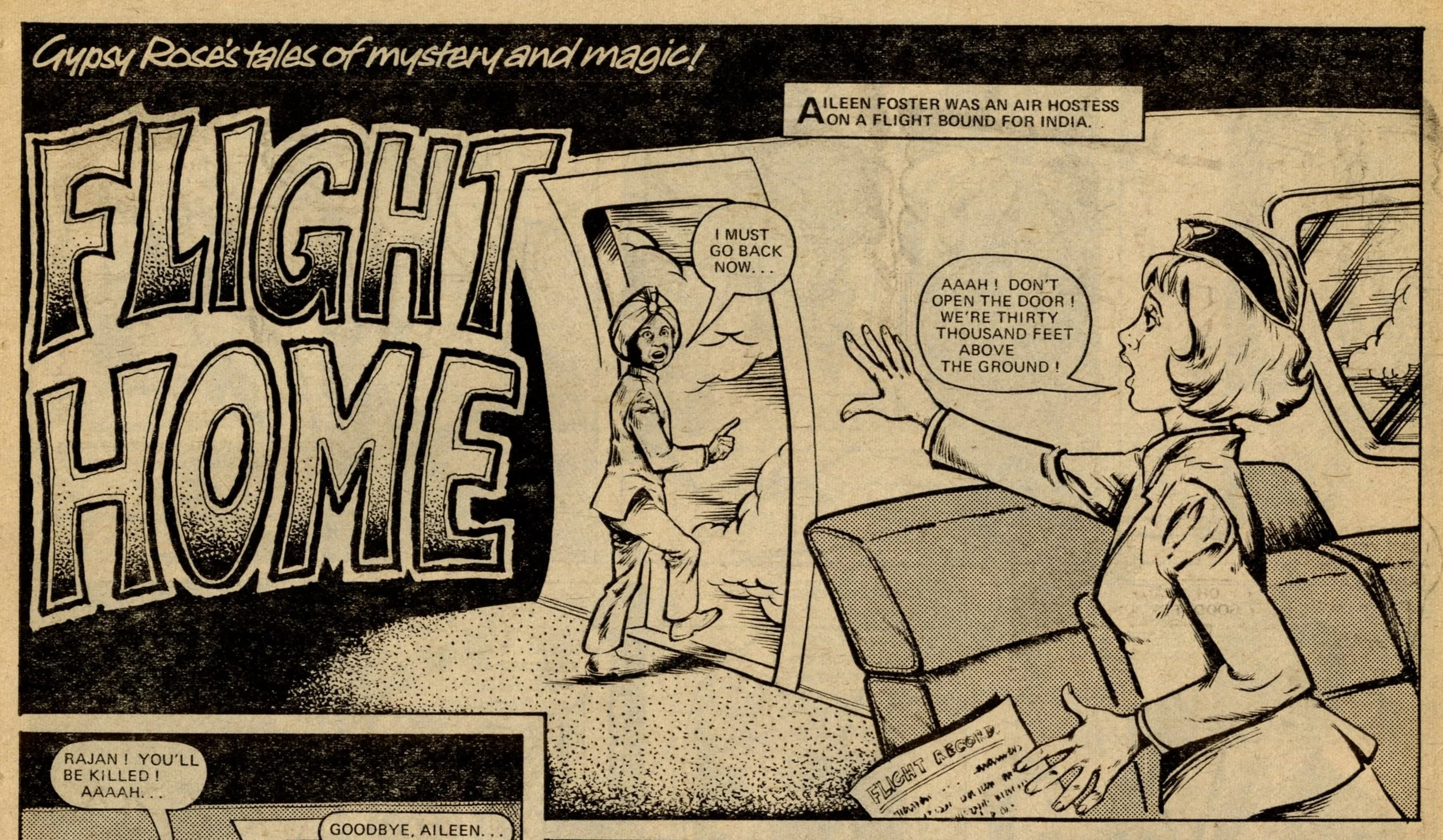 Rather like Tharg’s Future Shocks in 2000AD (or, rather, pre-dating the Future Shocks), Gypsy Rose’s Tales of Mystery and Magic was a long-running, occasional series of one-off stories. Unlike Tharg, however, Gypsy Rose – a young, Romany woman with headscarf, large earrings and a crystal ball – often appeared in her own stories, not as the protagonist but providing a touchpoint between our world and the supernatural realm. In this week’s story, ‘Flight Home’, an airline hostess receives a vision of an Indian boy, one of her regular passengers, stepping out of a plane in flight. A trip to Gypsy Rose reveals the boy missed the flight after being nearly killed in a fire at his school, but he had been so determined to be on the plane that his spirit had been aboard. Mistyfan has written a good description of Gypsy Rose stories here.