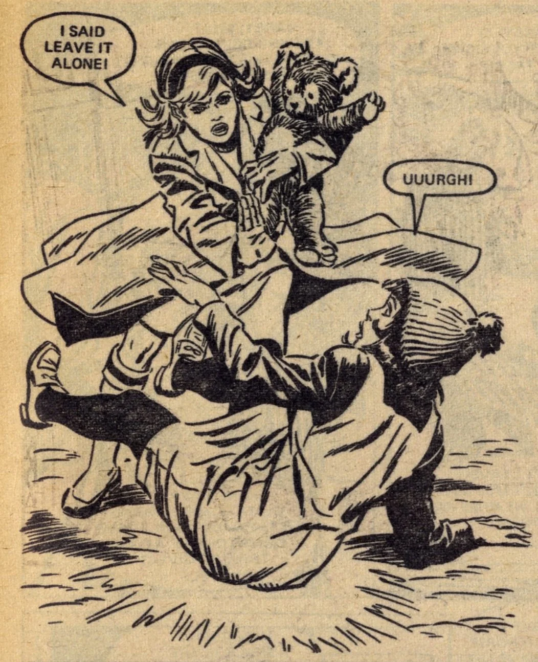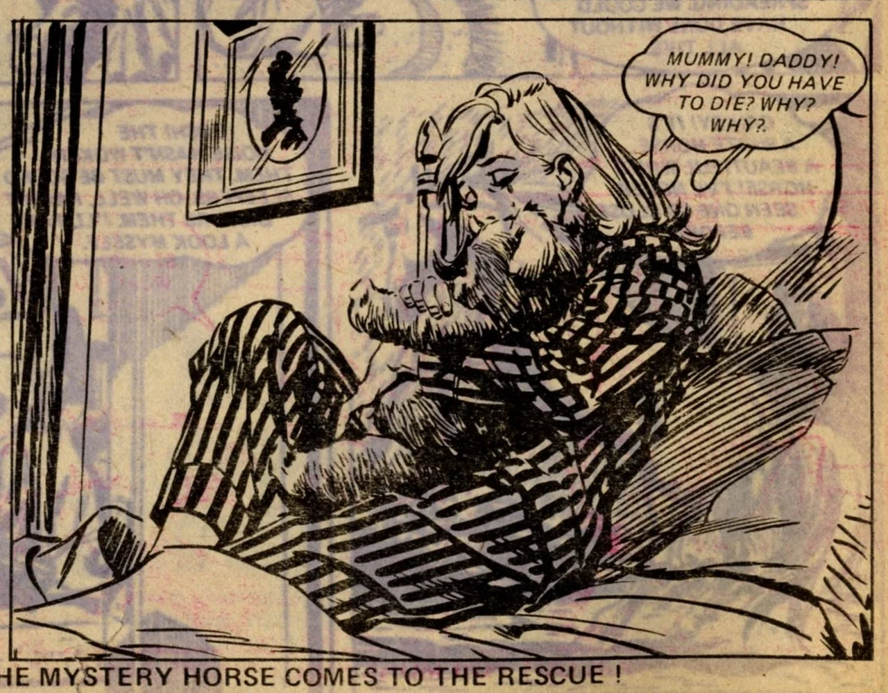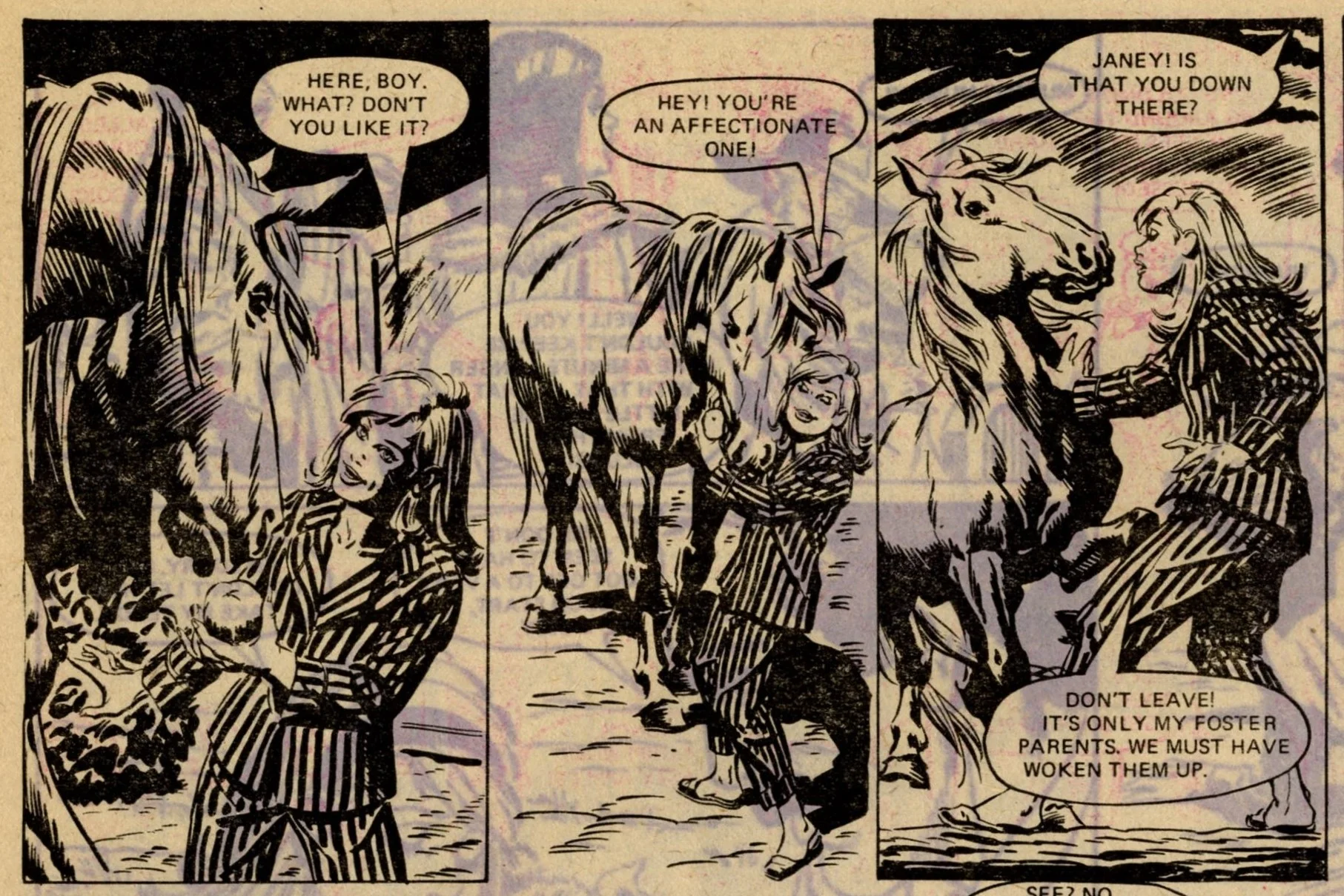 Guardian of White Horse Hill opens with a fairly horrific tragedy. Young Janey is rescued from a burning home in which both her parents perish. The story then moves on a few years and we find Janey being placed with foster parents but unwilling to let go of the teddy bear which is her only remaining link to her parents. She struggles to settle in her new home, and events take a supernatural turn during her first night when she finds a beautiful white horse outside her bedroom window. Details on future episodes from the story, including the revelation that the horse is an incarnation of Celtic goddess Epona, can be found on the A Resource on Jinty website.