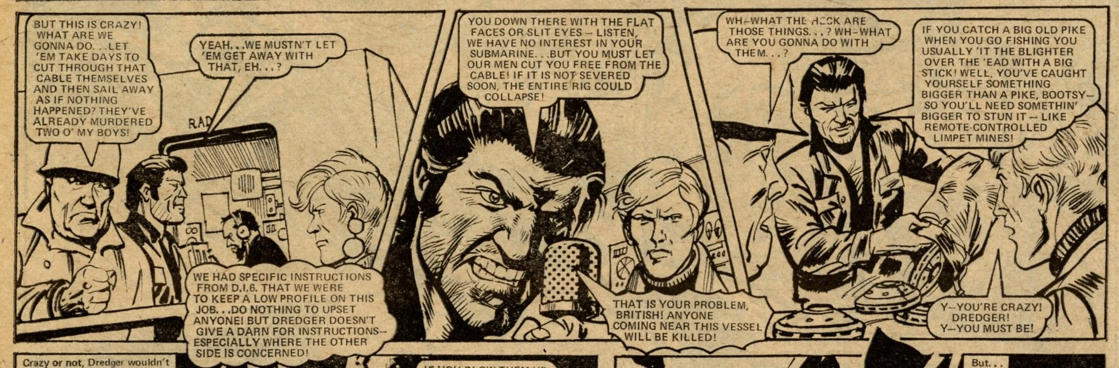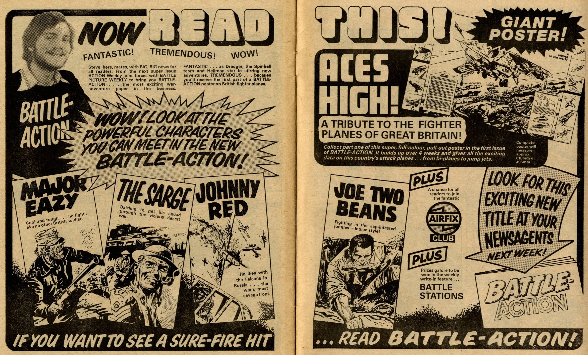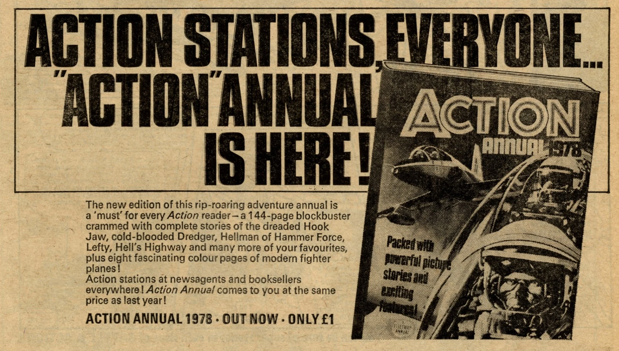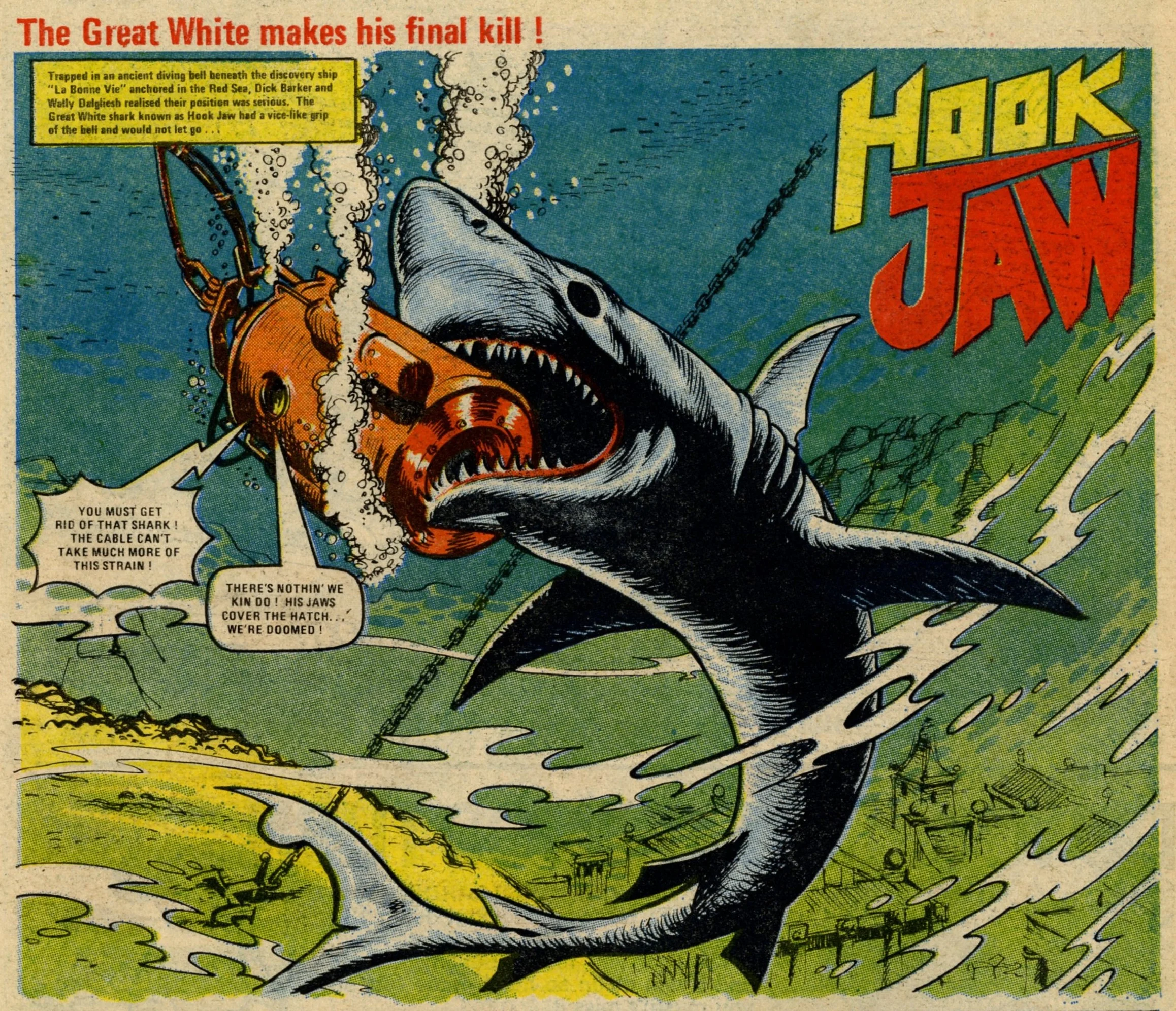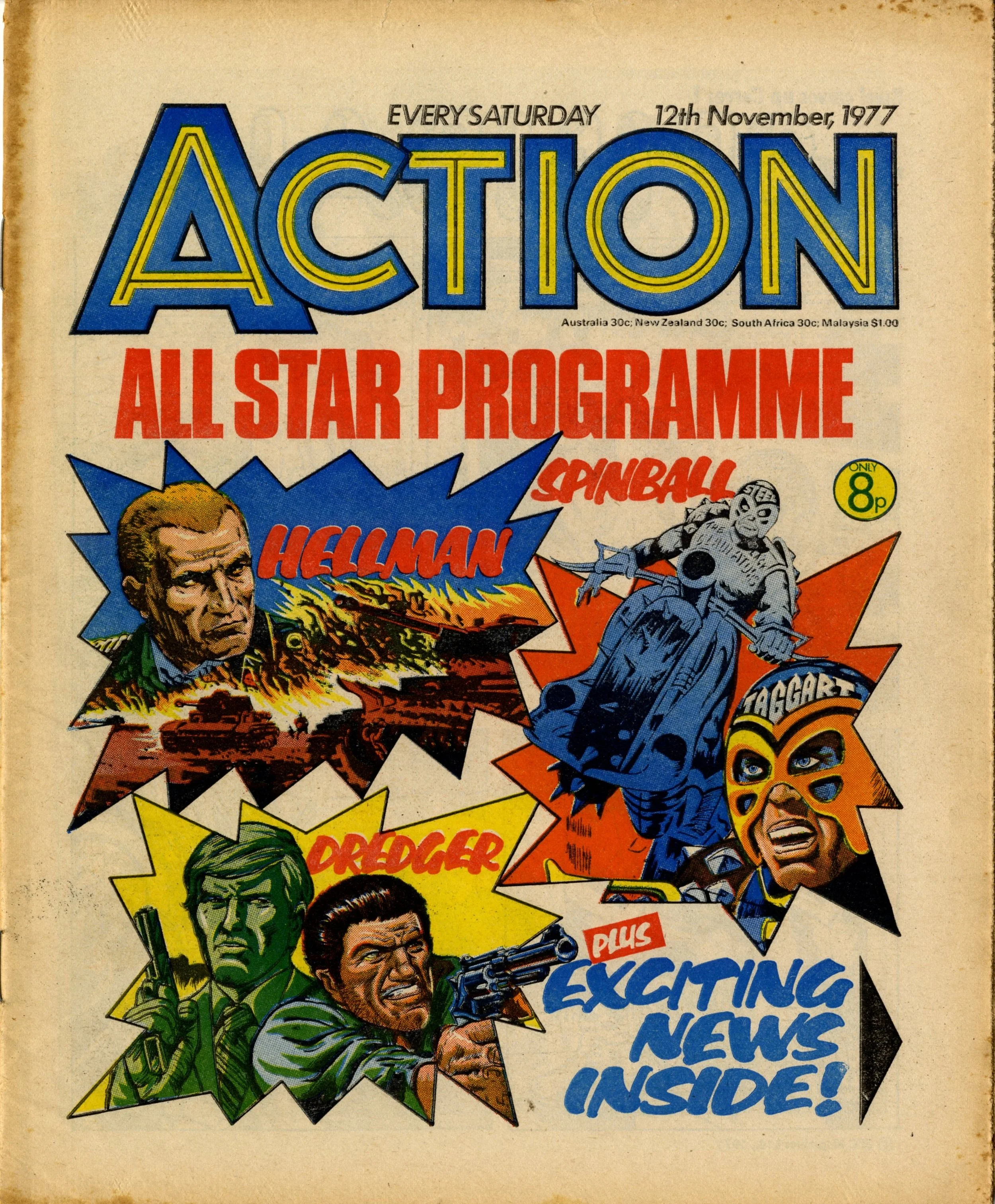 On this day, 12 November 1977 … Following its return from the ban in late 1976, Action struggled to reclaim the popularity it had enjoyed in the first eight months of its run. It limped through 1977 for another 50 issues with a line-up of heavily sanitised comic strips before today’s publication which announced that it would be merged into Battle. It was a mercy killing. The content was barely recognisable from the visceral Sevenpenny Nightmare which had created such scandal in the summer of 1976. In this final issue I counted seven on-page deaths – three in Dredger, two in Hook Jaw and two in Hellman on the Russian Front – none of which displayed any form of dismembered body or actual blood wounds (Hook Jaw came closest with a trail of blood in the water after the shark had closed his chompers on his villainous victims). The language is fairly mild: ‘You stupid oaf!’, ‘Rubbish!’ and ‘Four-eyes!’ is about as bad as it gets, apart from Dredger’s casual racism which appears to have a free pass. Even that chap who looks exactly like Battle sub-editor Steve MacManus but isn’t really him is distinctly less lairy.