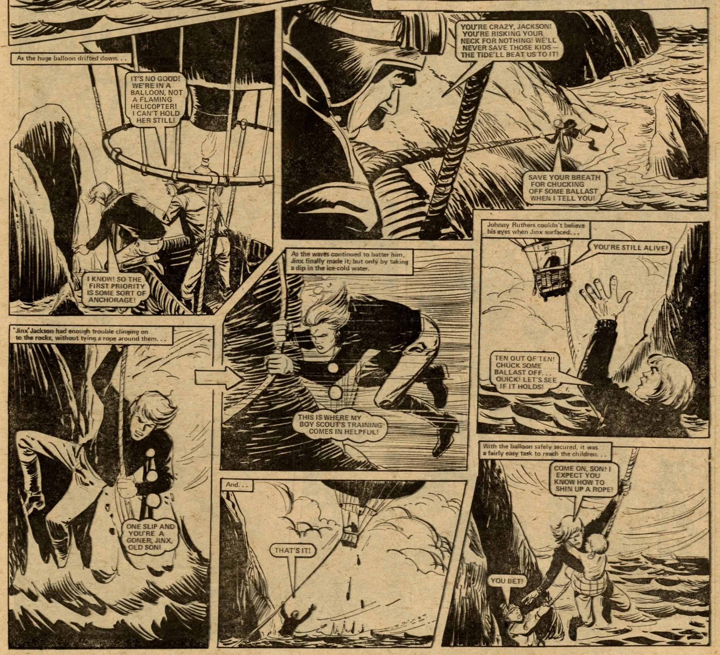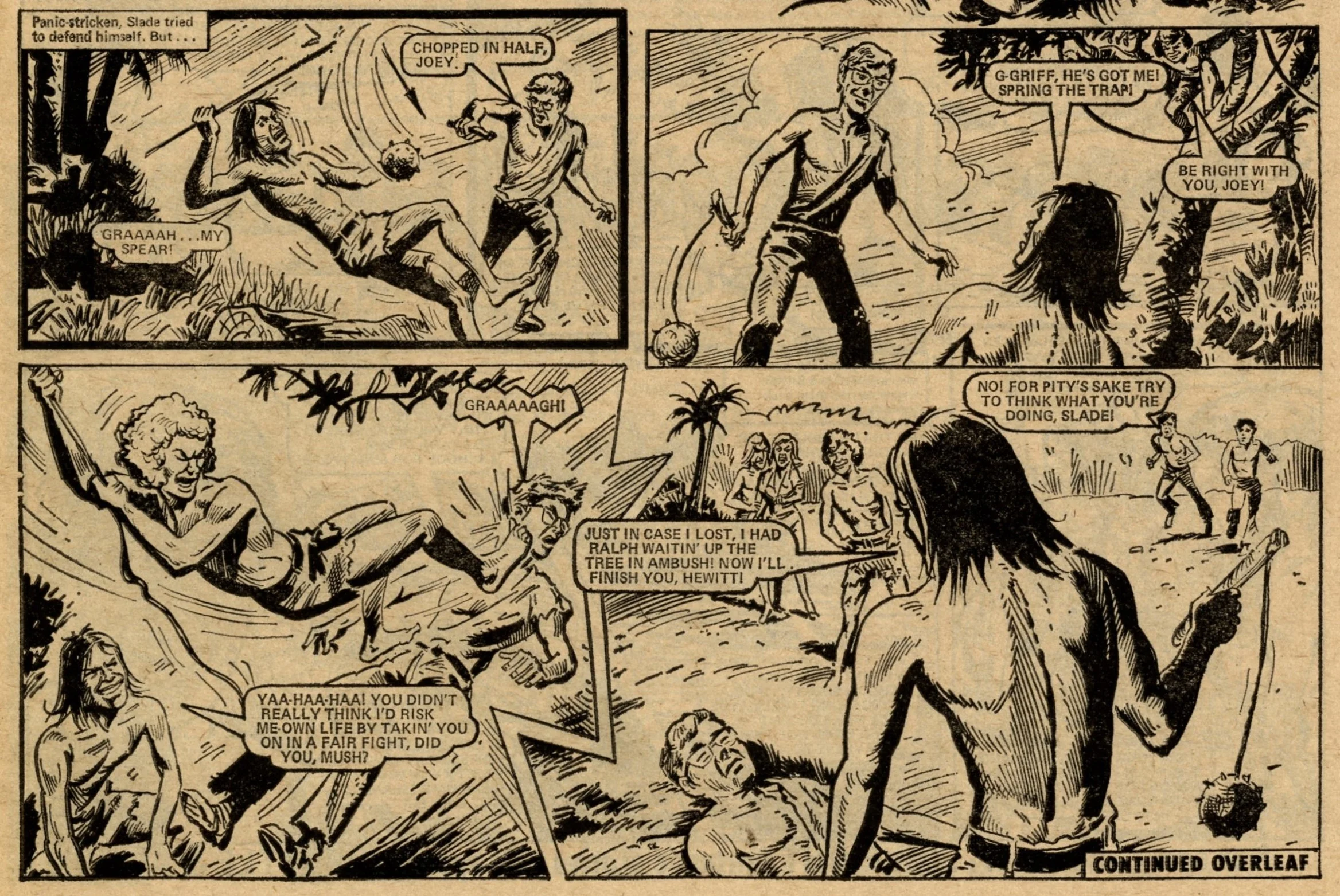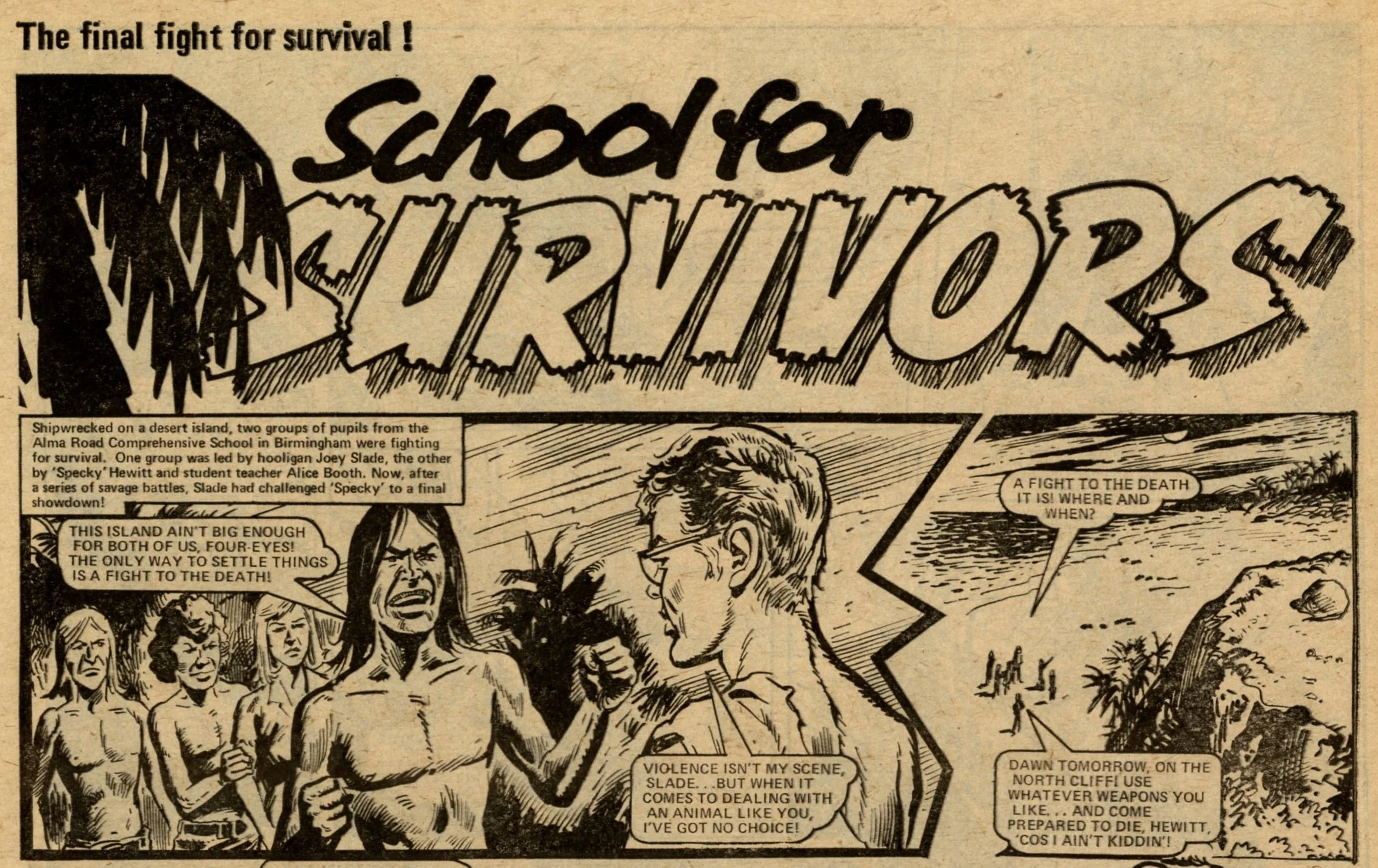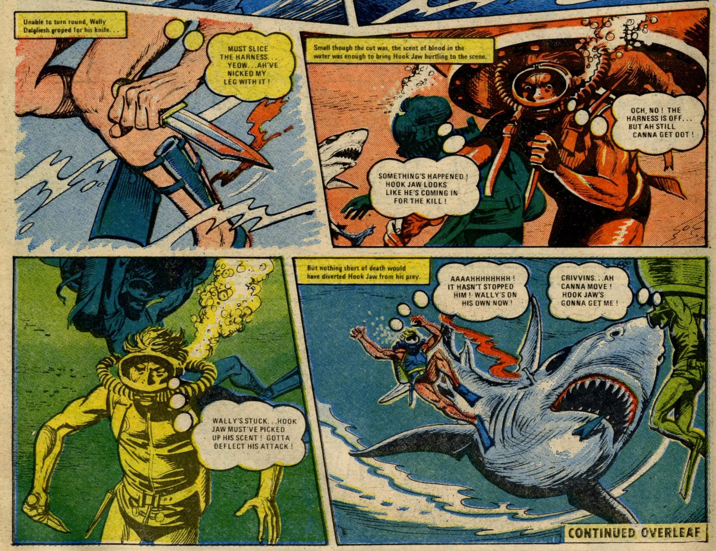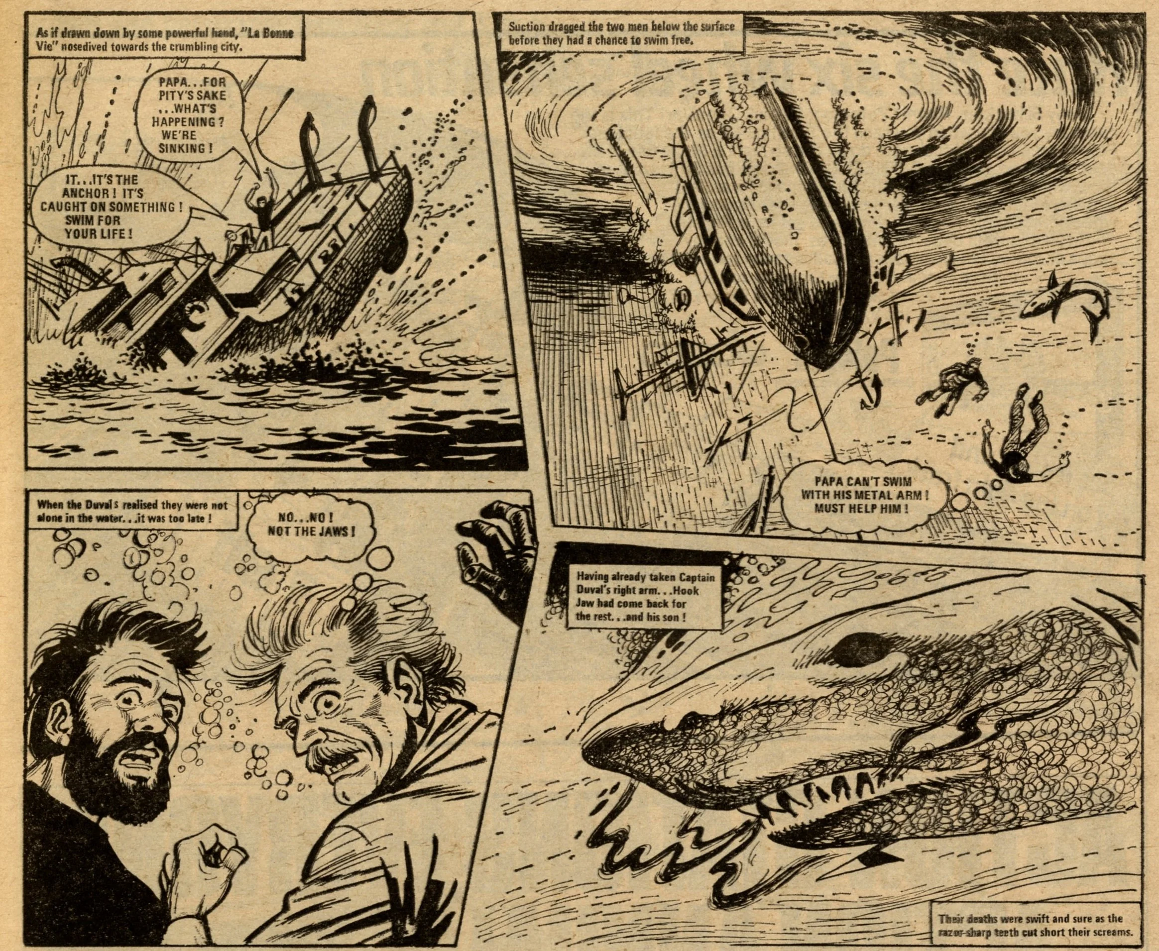 On this day, 12 November 1977 … Following its return from the ban in late 1976, Action struggled to reclaim the popularity it had enjoyed in the first eight months of its run. It limped through 1977 for another 50 issues with a line-up of heavily sanitised comic strips before today’s publication which announced that it would be merged into Battle. It was a mercy killing. The content was barely recognisable from the visceral Sevenpenny Nightmare which had created such scandal in the summer of 1976. In this final issue I counted seven on-page deaths – three in Dredger, two in Hook Jaw and two in Hellman on the Russian Front – none of which displayed any form of dismembered body or actual blood wounds (Hook Jaw came closest with a trail of blood in the water after the shark had closed his chompers on his villainous victims). The language is fairly mild: ‘You stupid oaf!’, ‘Rubbish!’ and ‘Four-eyes!’ is about as bad as it gets, apart from Dredger’s casual racism which appears to have a free pass. Even that chap who looks exactly like Battle sub-editor Steve MacManus but isn’t really him is distinctly less lairy.