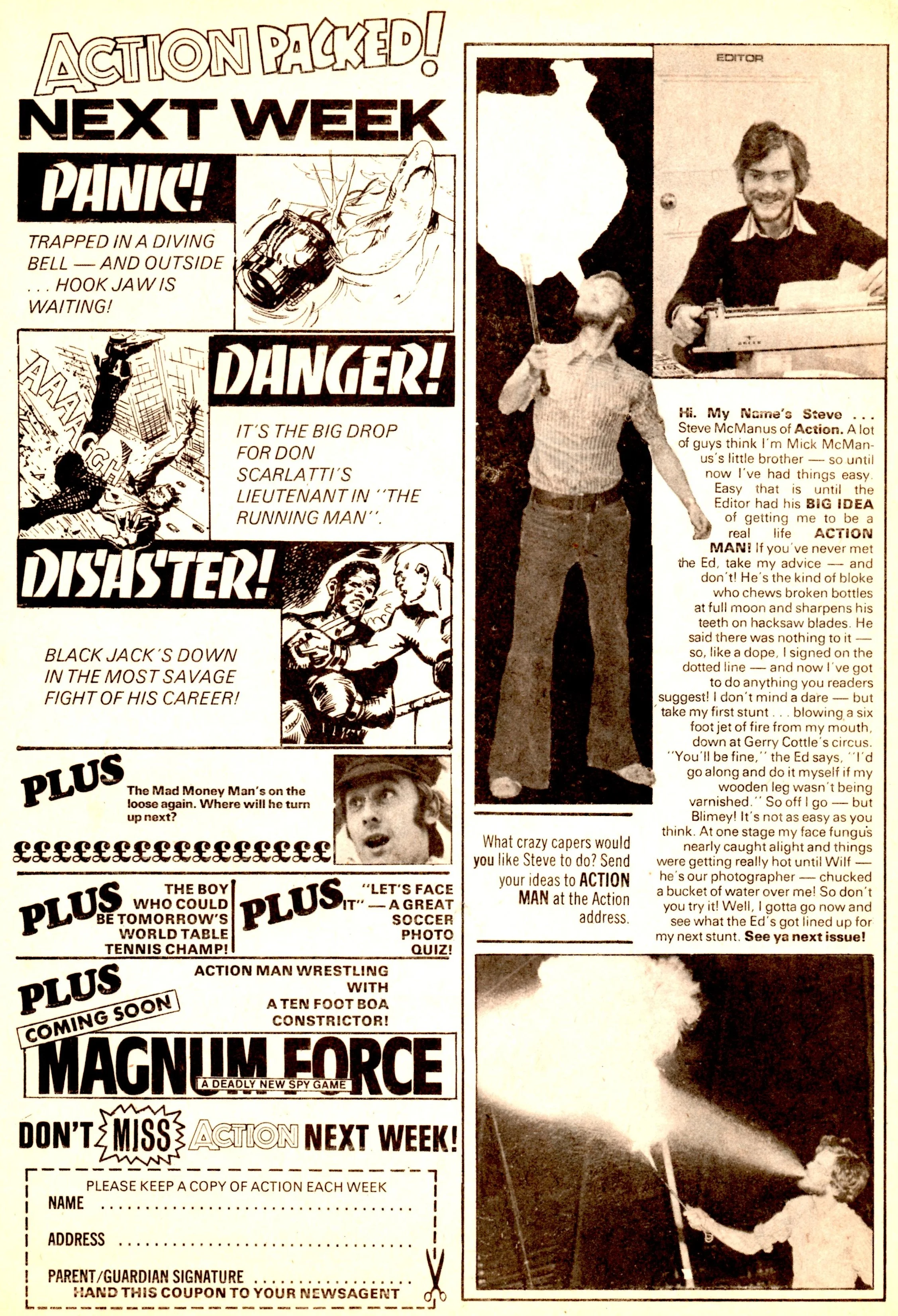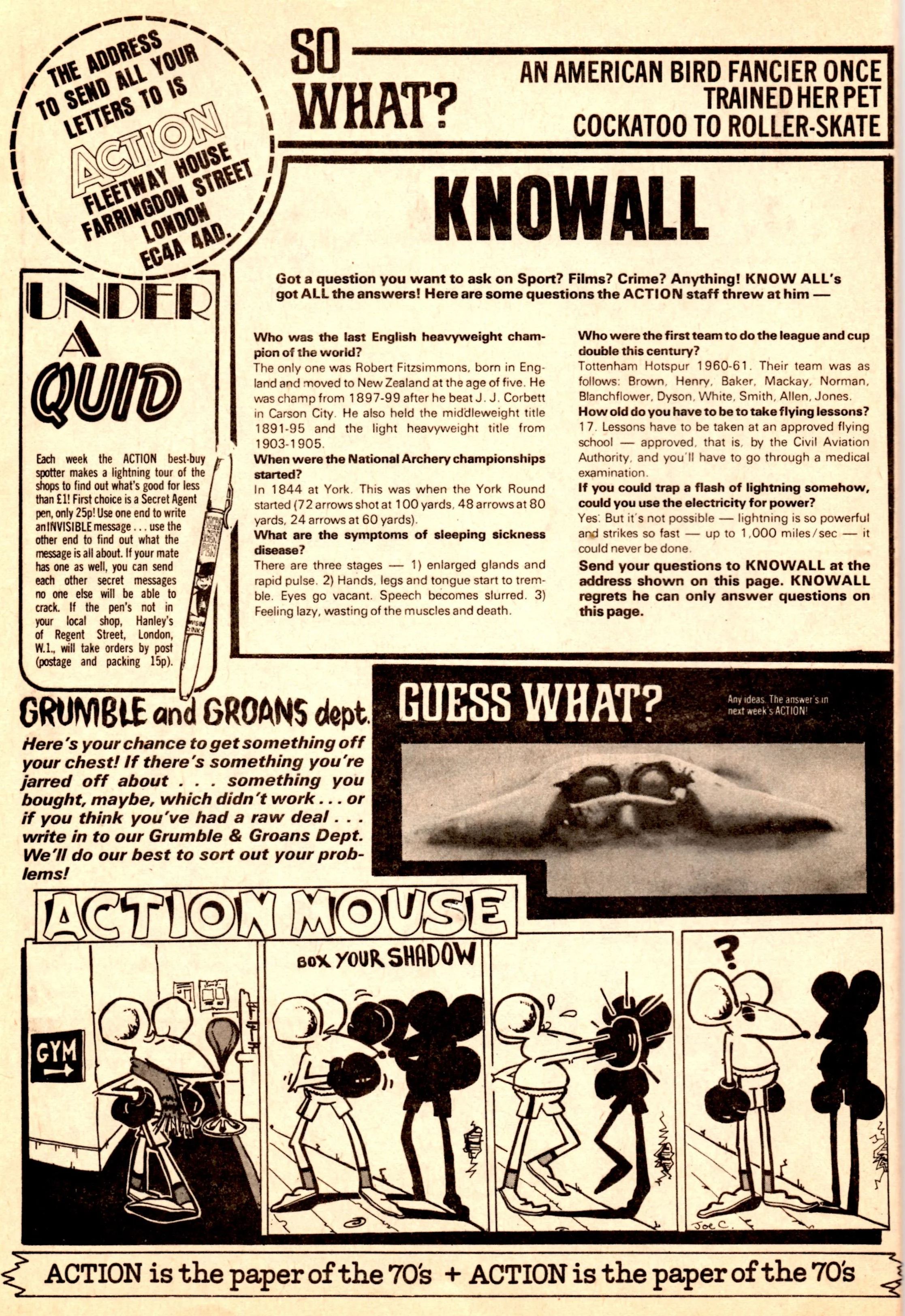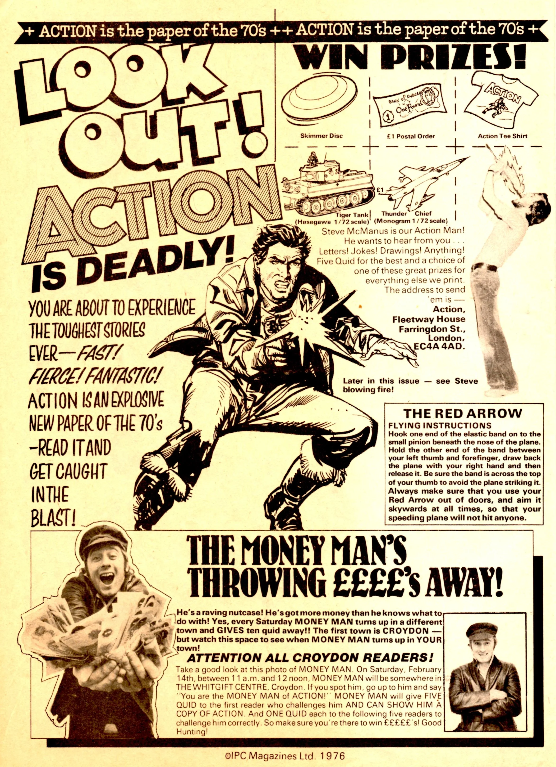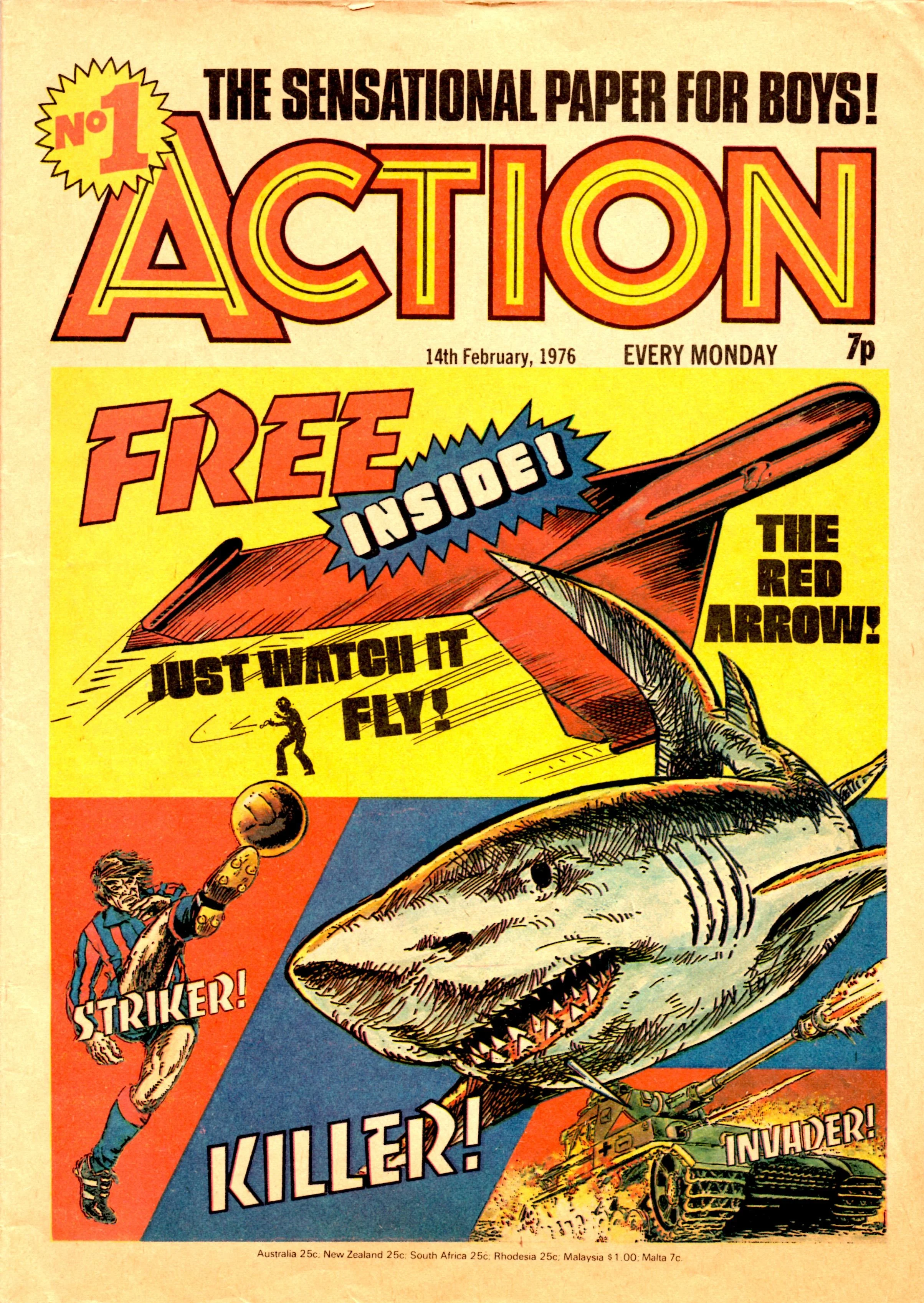 On this day, 14 February 1976 … forty years ago today was the off-sale date of the very first Action, ‘The Sensational Paper for Boys’ or ‘The Sevenpenny Nightmare’, depending on your appetite for punky gore, attitude and violence. Which, let’s face it, is pretty much all of us, right? Issue One could seem a little tame by today’s standards – traditional lettering type, a high number of panels per page, and relatively little blood (Hook Jaw aside) compared to what we know was to come – but in the context of where we know British kids’ comics were at in early 1976 – 2000AD was yet to come, Battle was still relatively tame, Valiant and Vulcan were both still on the shelves, offering heroes and adventures in fantastical lands and dimensions – Action was grittier, hardboiled and (thank you, Pat Mills) properly representative of a young post-post-war generation finding confidence in its own gutteral voice rather than that handed down to them.