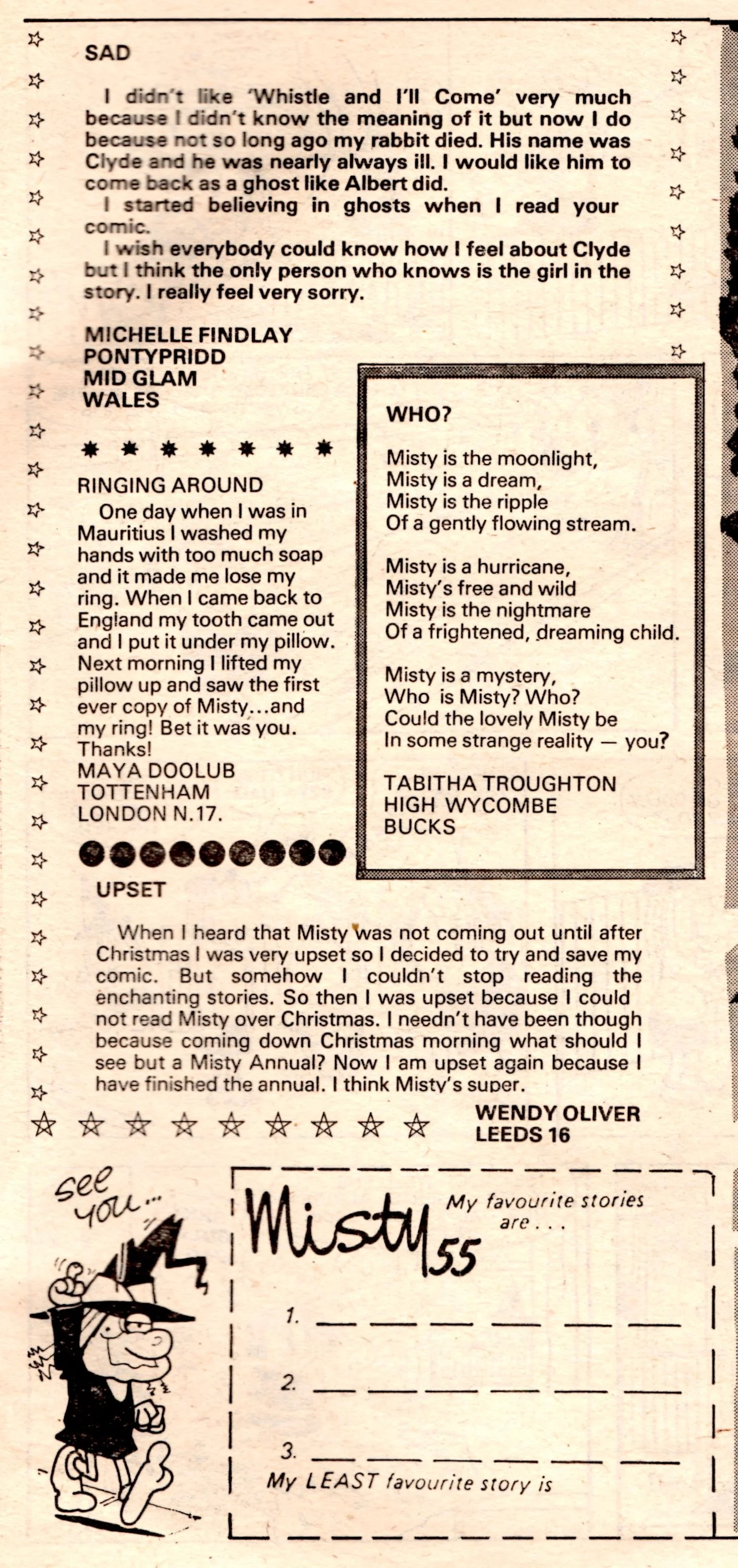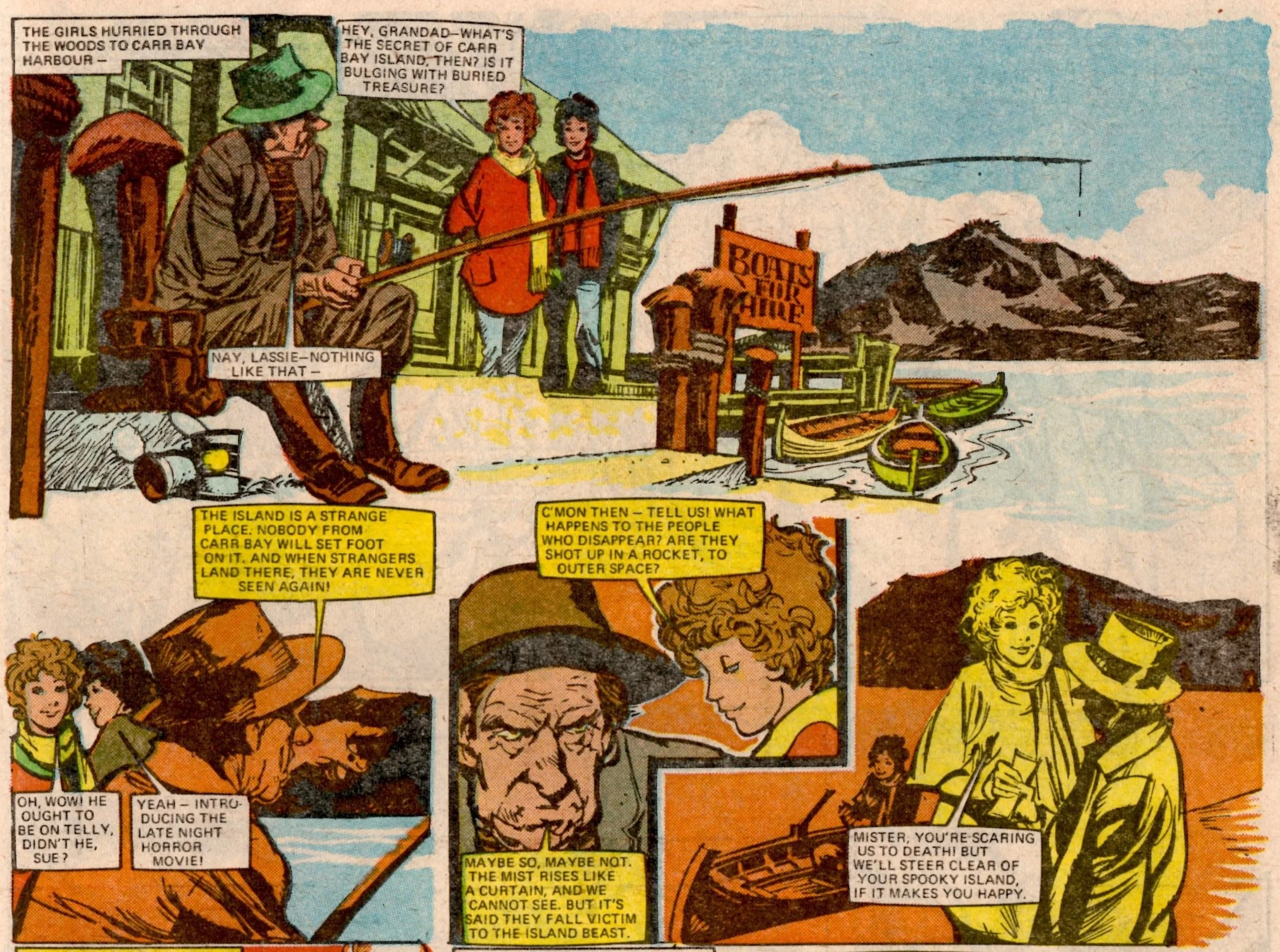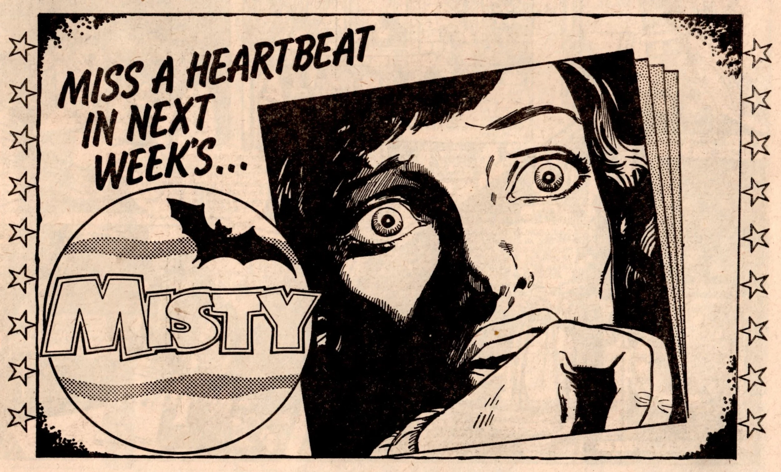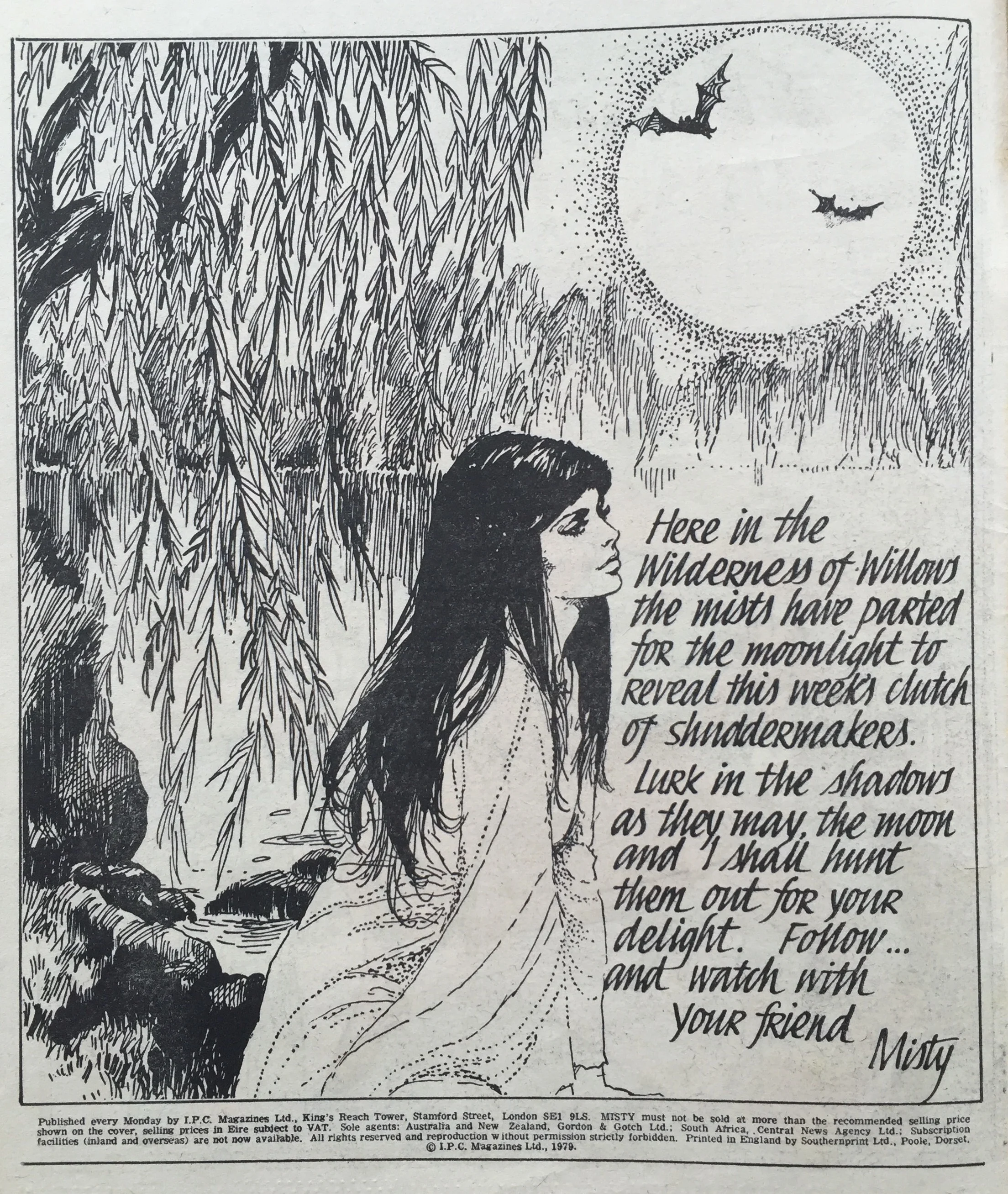 On this day, 24 February 1979 … ‘Here in the Wilderness of Willows the mists have parted for the moonlight to reveal this week’s clutch of shuddermakers.’ The shuddermakers in this mid-run issue of Misty included: Nine Lives of Nicola, in which Nicola Scott, last priestess of the cat-goddess Bast, was under spiritual attack from the serpent empire; Slave of Time, in which Lisa fell in thrall to a carriage clock that was the source of time itself; Whistle and I’ll Come, in which Toni Ballard becomes separated from her ghost-dog Albert; The Island, in which school-trippers Angie and Sue explore the mysteries of Carr Bay Island; Croc in the Box, in which bullied Sue Gurney has a not-so-imaginary friend in the attic; and Going … Going … Gone!, in which pickpocket Tracey Trantor steals a mirror with the power to make her invisible (what could possibly go wrong?!).