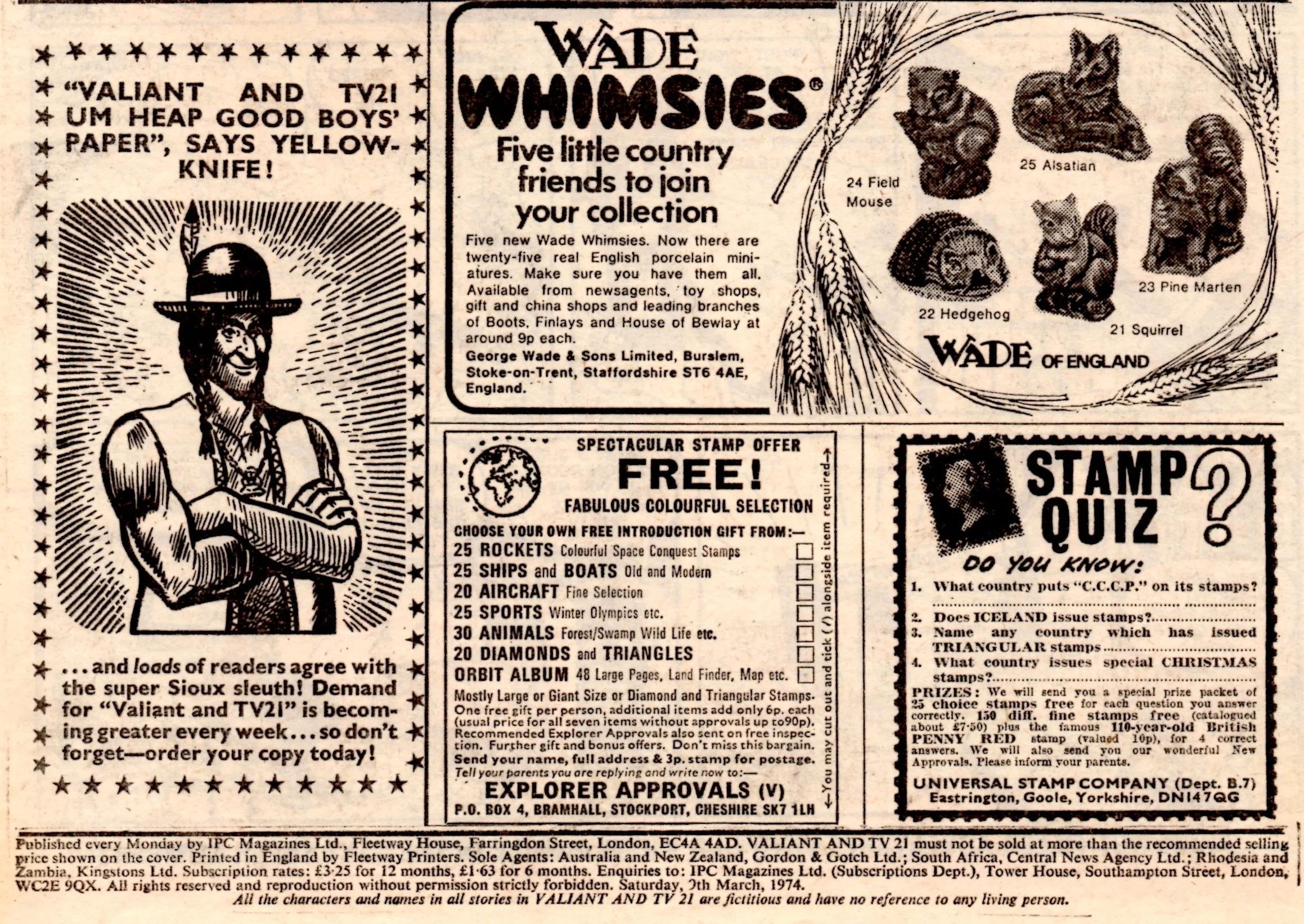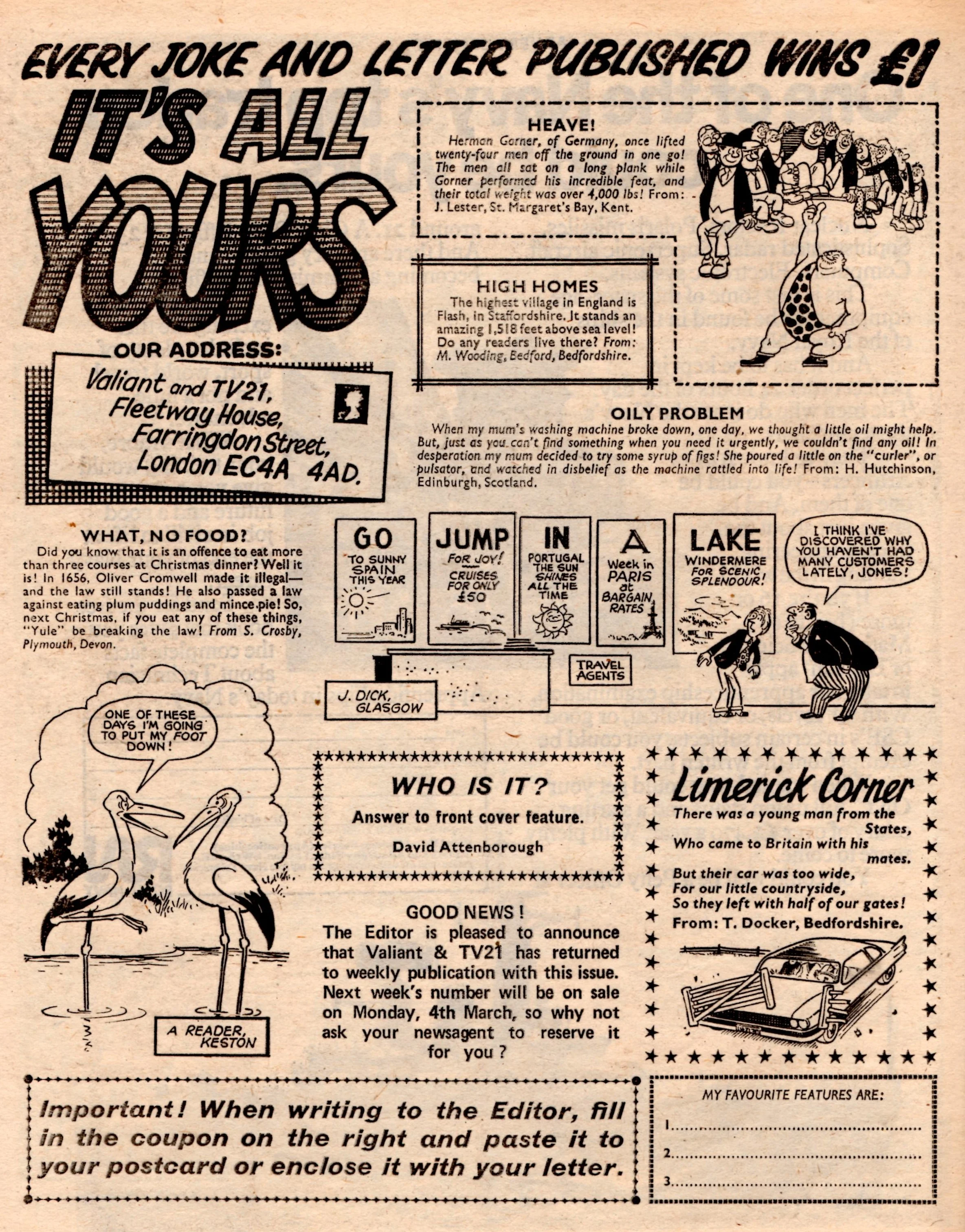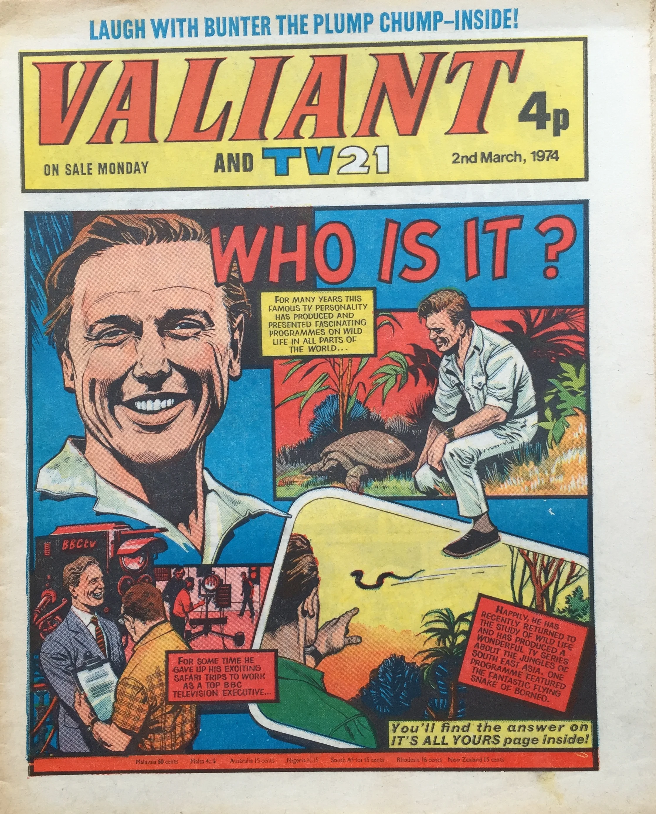On this day, 2 March 1974 ... that David Attenborough off of the wildlife programmes on the telly might have seen giant turtles and the flying snake of Borneo, but has he ever seen Victorian elasticated escapologist extraordinaire Janus Stark free himself from bondage in the basket of a hot air balloon, reanimated Ancient Egyptian Kid Pharaoh defy drowning while chained to a chunky chum at the heel, time-travelling tough guy Tim Kelly (Kelly's Eye) bounce back a bombardment of bullets in a Wild West wrangle, or a clutch of callow cadets from the School of Spies recce a rotten research station? Probably, in fact, if IPC sent him a courtesy copy of this issue of Valiant.
