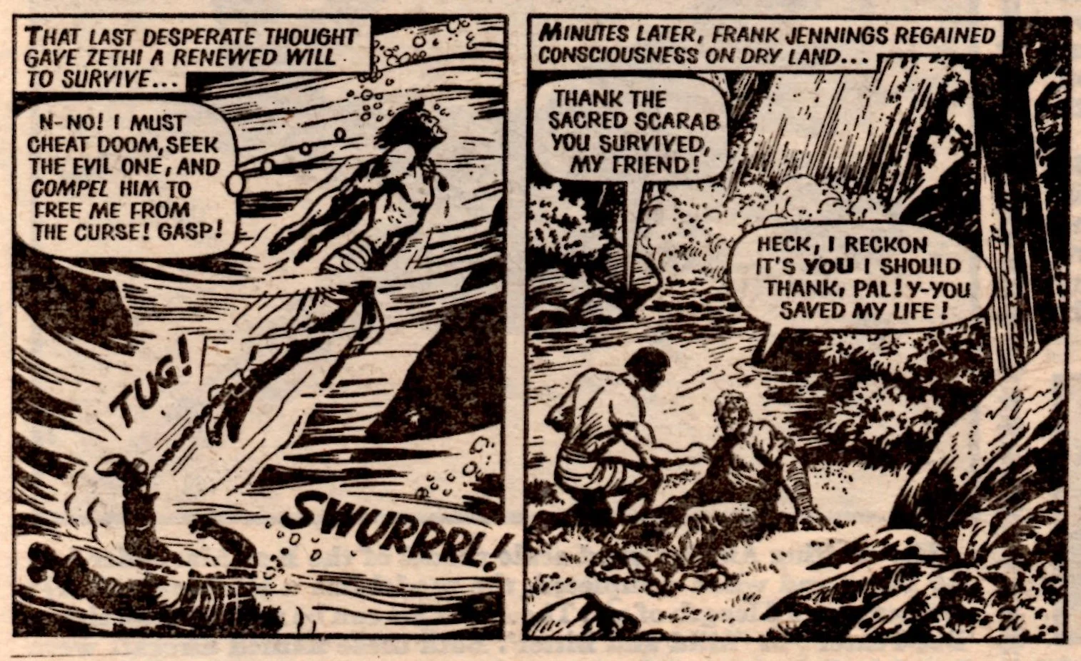 Last time I wrote about Valiant I focused on the Kid Pharaoh strip. At the risk of becoming boring I have to single out this one again simply because I still find the audacious storytelling quite fascinating, and also because – intentional or not – there seems to be a gay subtext to the story, which is interesting in the sense that it’s highly subversive for 1974. It's hard to argue that the story doesn't have a homoerotic tone, at least if one is looking for it, and in this latest adventure Kid is manacled to the ankles (manankled?) of another wrestling buddy, Frank Jennings, for the crime of 'grappling in Pyrania' - which sounds fairly euphemistic to me.