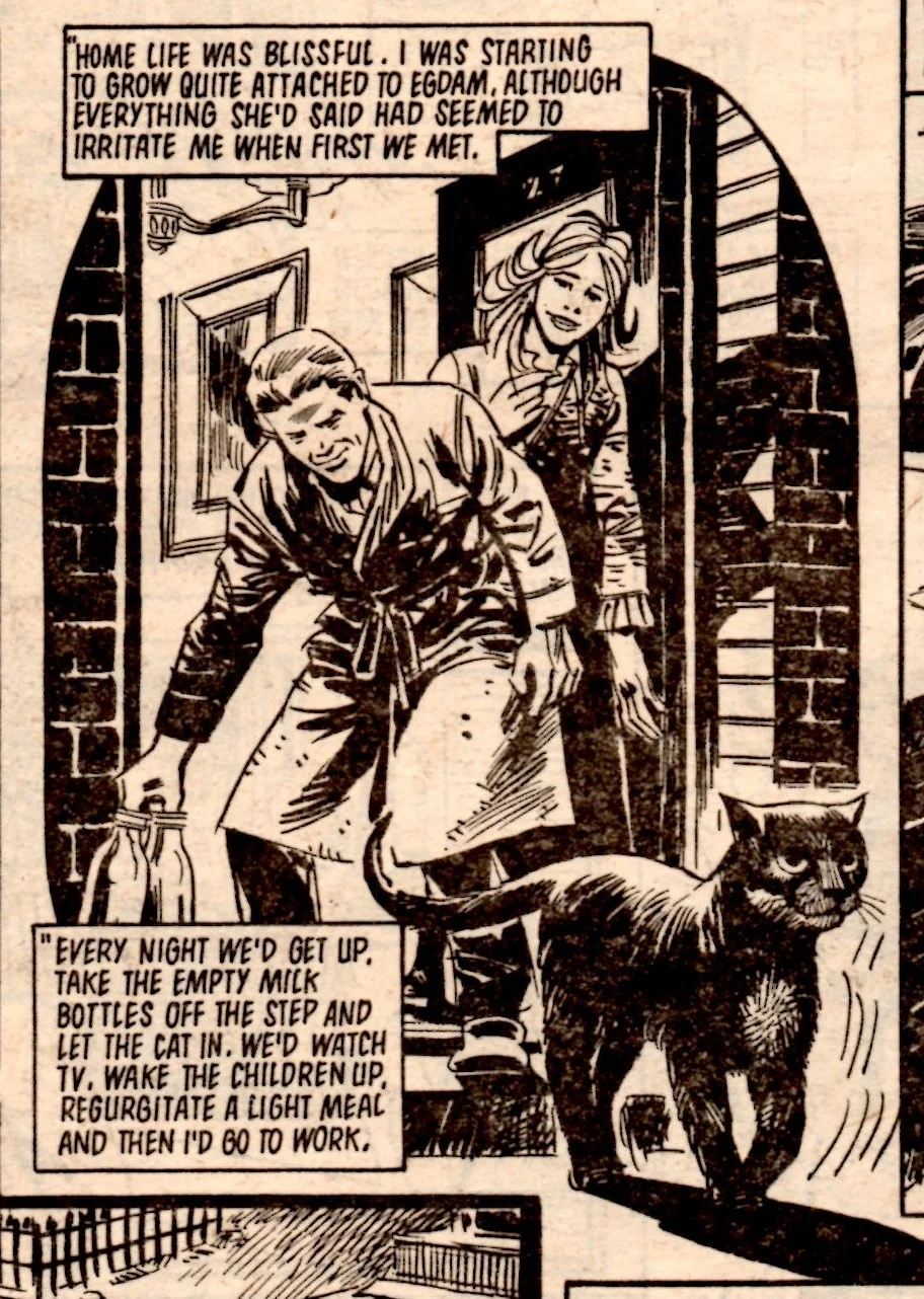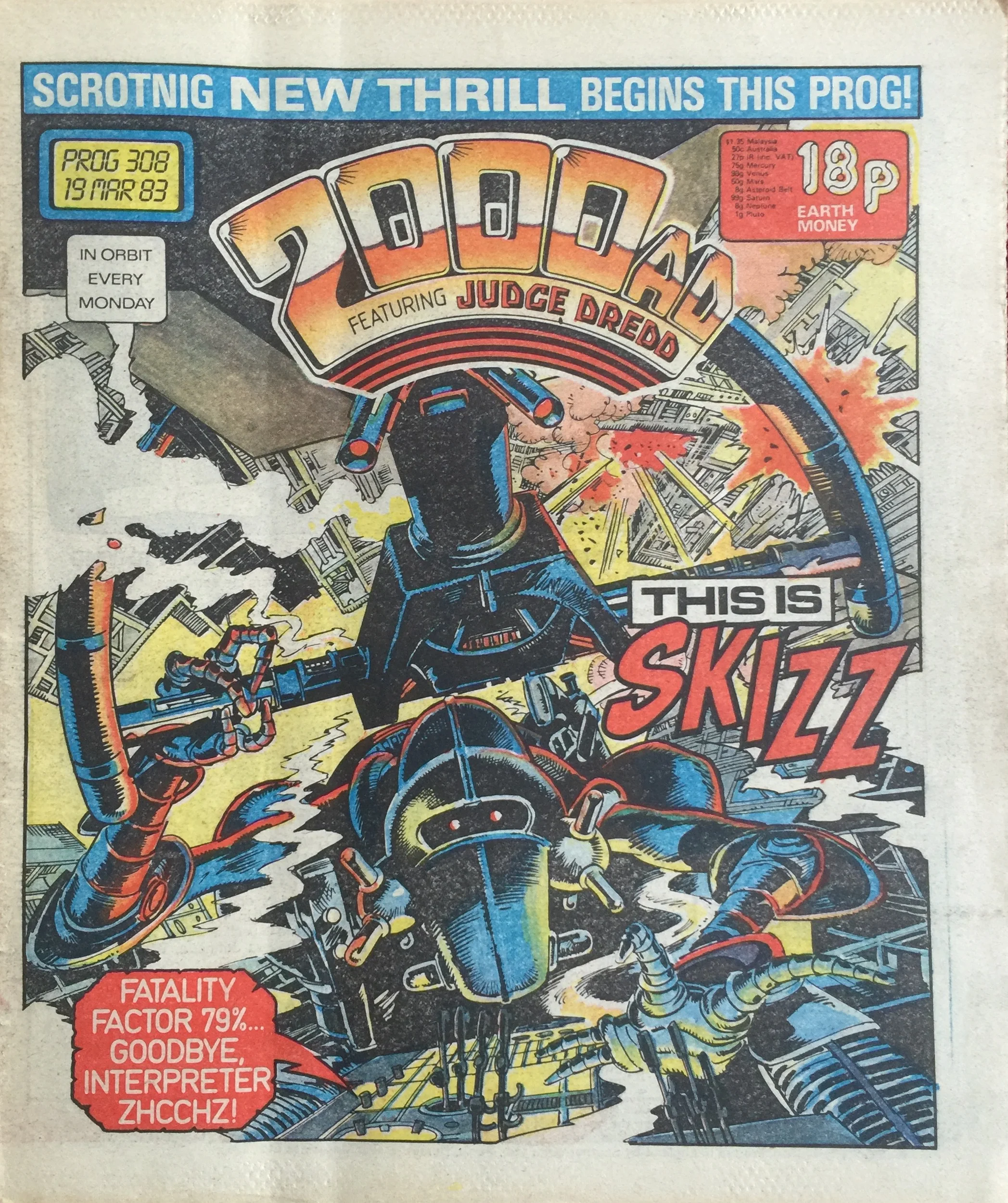 On this day, 19 March 1983 … Prog 308 of 2000AD marked the debut of the mighty Alan Moore’s first serial-length story for the Galaxy’s Greatest Comic – the saga of Interpreter Zhcchz of the Tau-Ceti Imperium, more Brummily known as Skizz! Like so much that Moore wrote for 2000AD – see D.R. and Quinch and The Ballad of Halo Jones – Skizz! is a beautifully-written side-step out of the conventional format for the comic, ostensibly a sci-fi adventure, but just as much a kitchen sink tale as the shipwrecked Tau-Cetian, stranded on Earth like E.T., befriends Roxy, a disenfranchised Birmingham teen, who seeks to protect him from a Thatcher-bred state alien-hunter. The strip would not have seemed out of place in Jinty or Tammy (I mean more for the narrative form than the fact that the lead human is a teenage girl), and it’s fitting that the lovely artwork comes from Jim Baikie, who already had a strong body of work in Jinty.