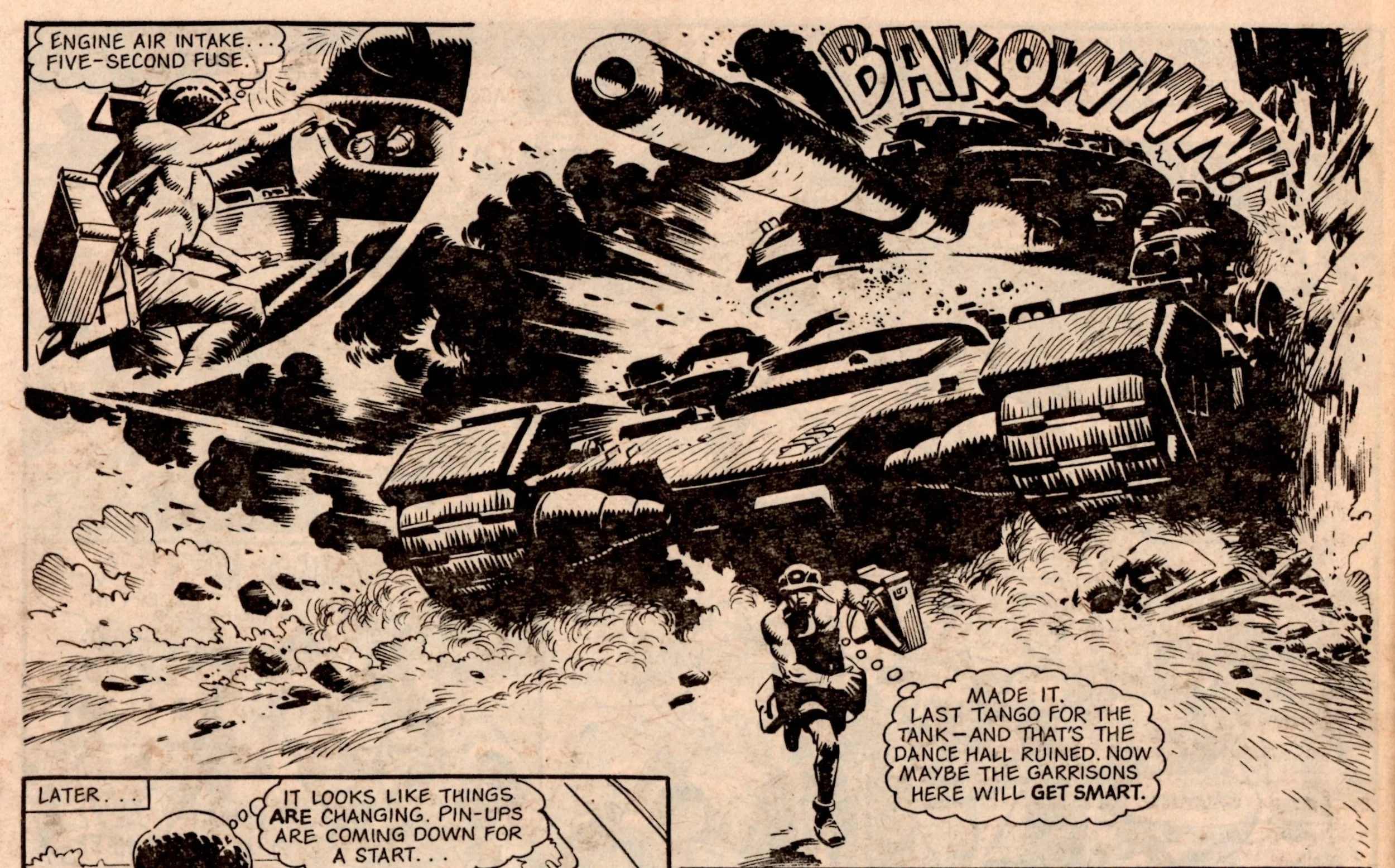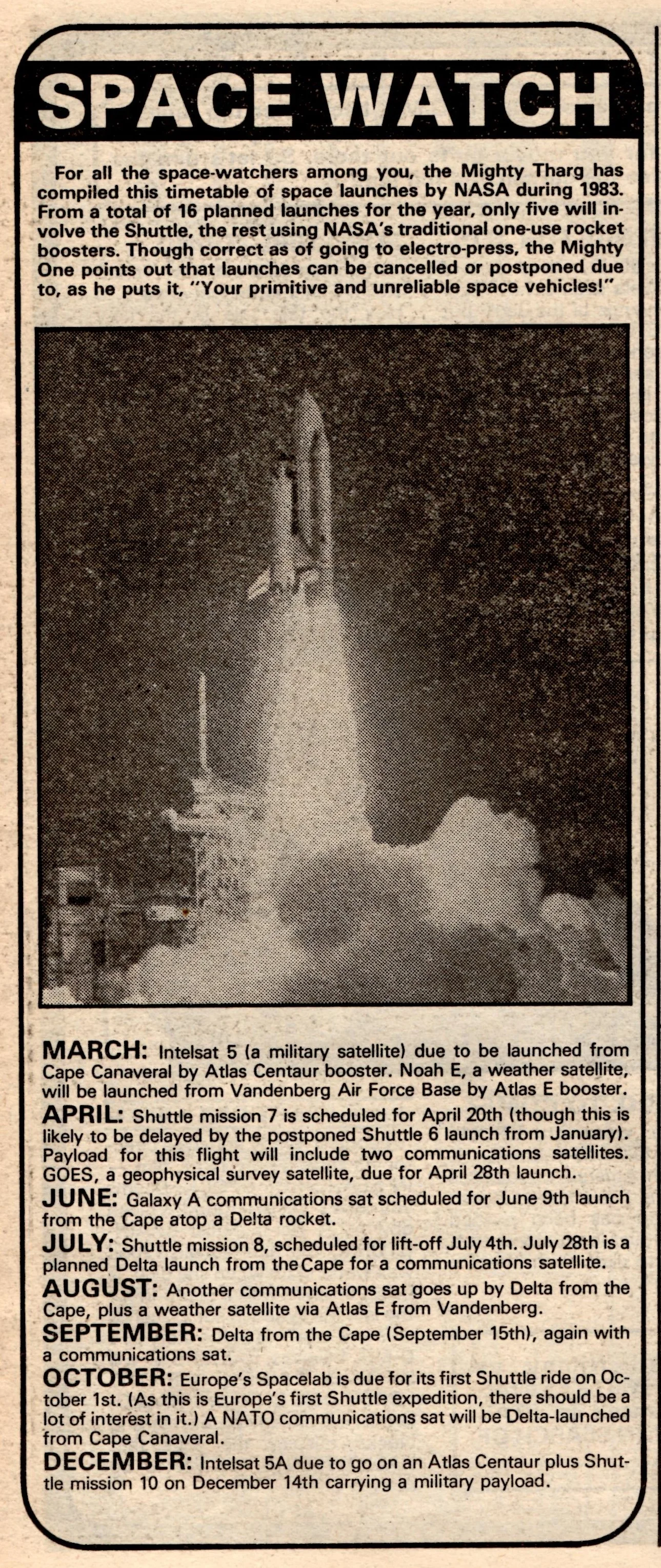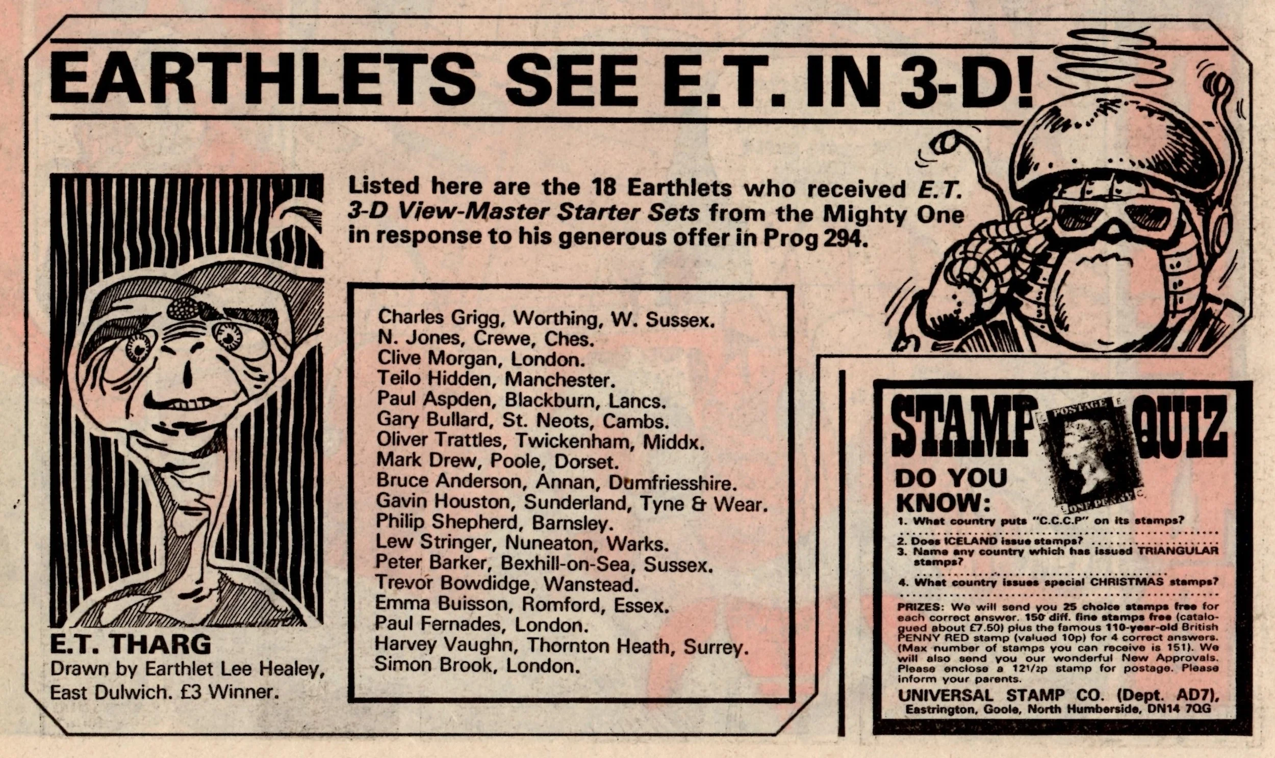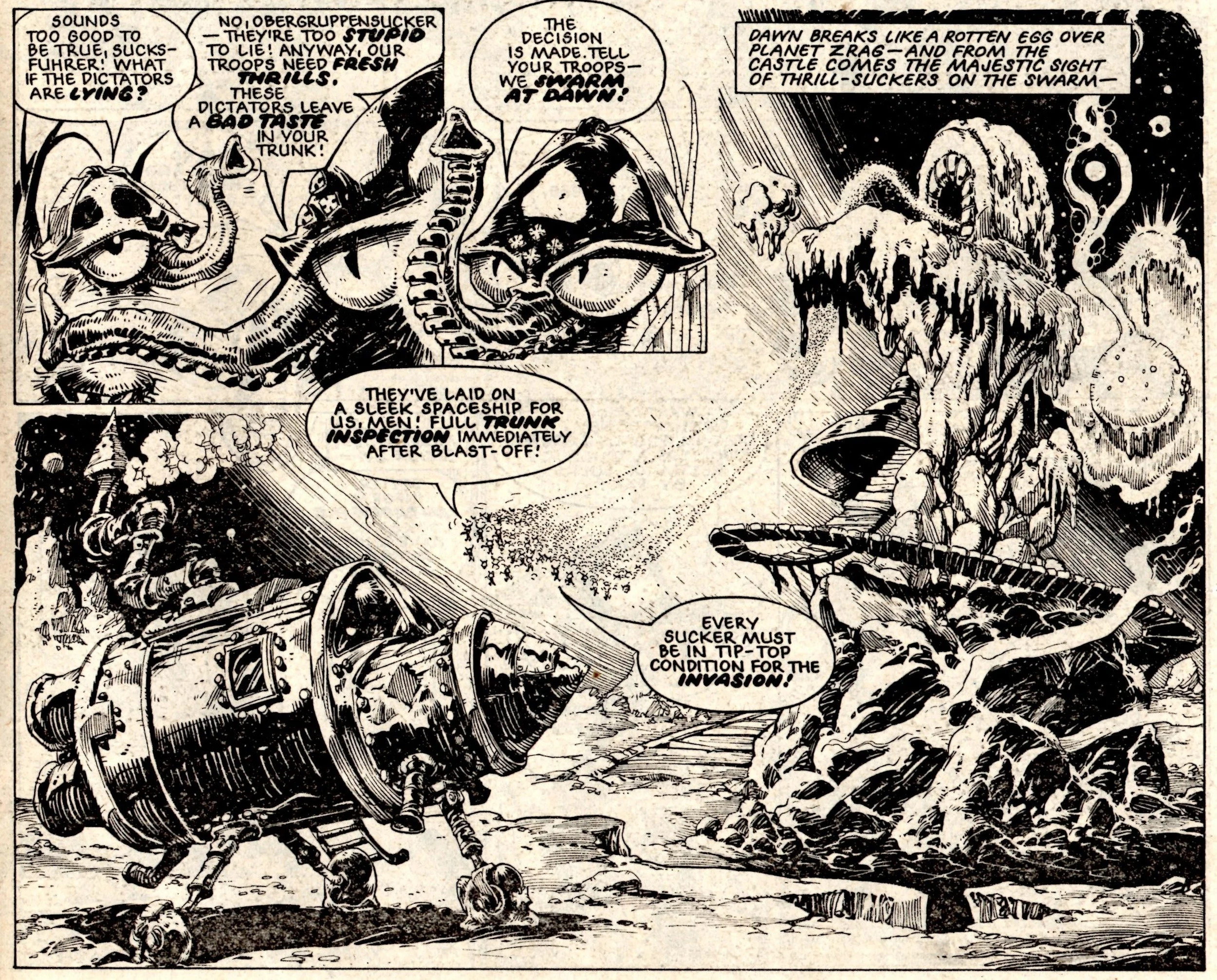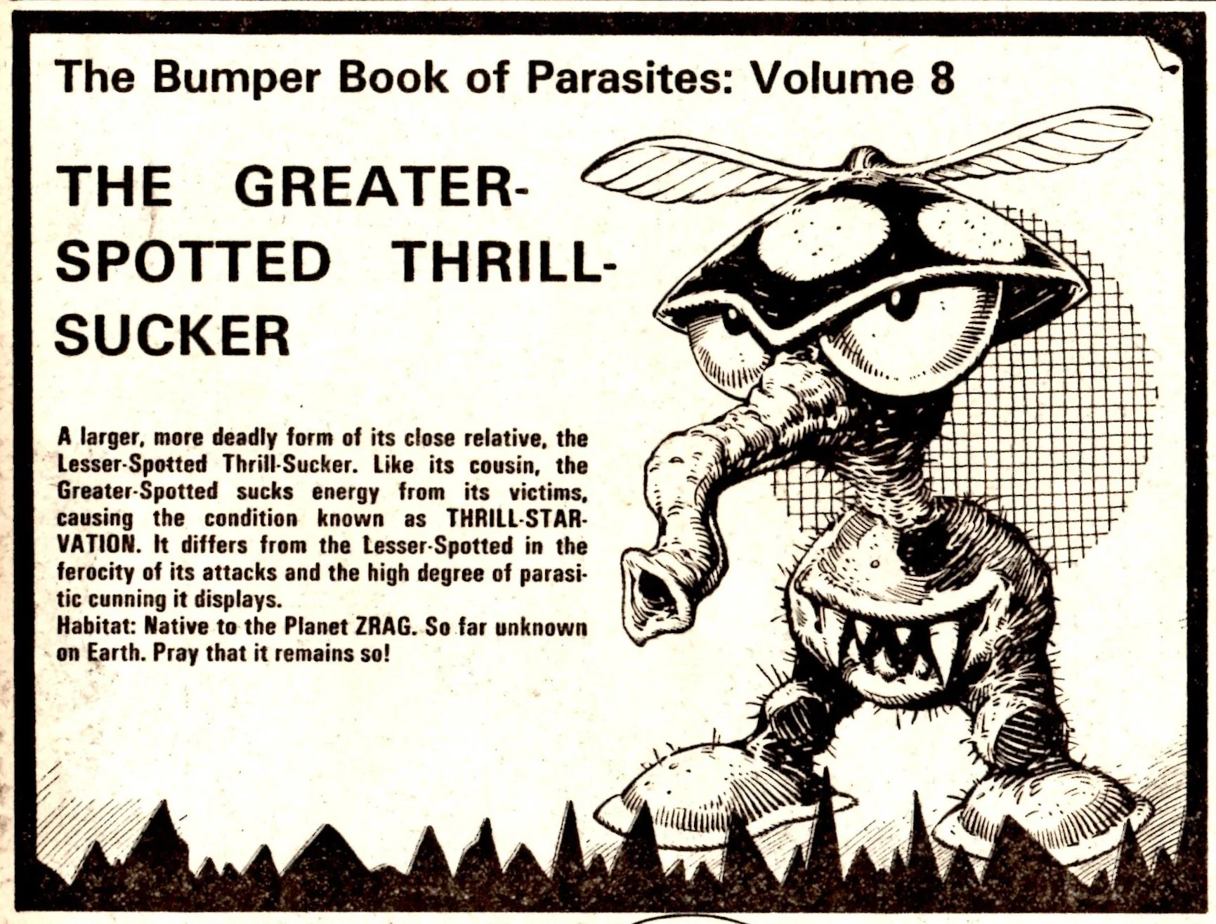 This prog is extra-special in that it boasts a second Alan Moore strip – the one-off Tharg’s Time Twister ‘The Reversible Man’, a Benjamin Button-esque story drawn by Mike White. Carlos Ezquerra is at his peak on Judge Dredd in ‘The Prankster’, and we’re also blessed with Massimo Belardinelli artwork in the first part of Invasion of the Thrill-snatchers and Cam Kennedy on Rogue Trooper duty. Zarjaz work all round!
