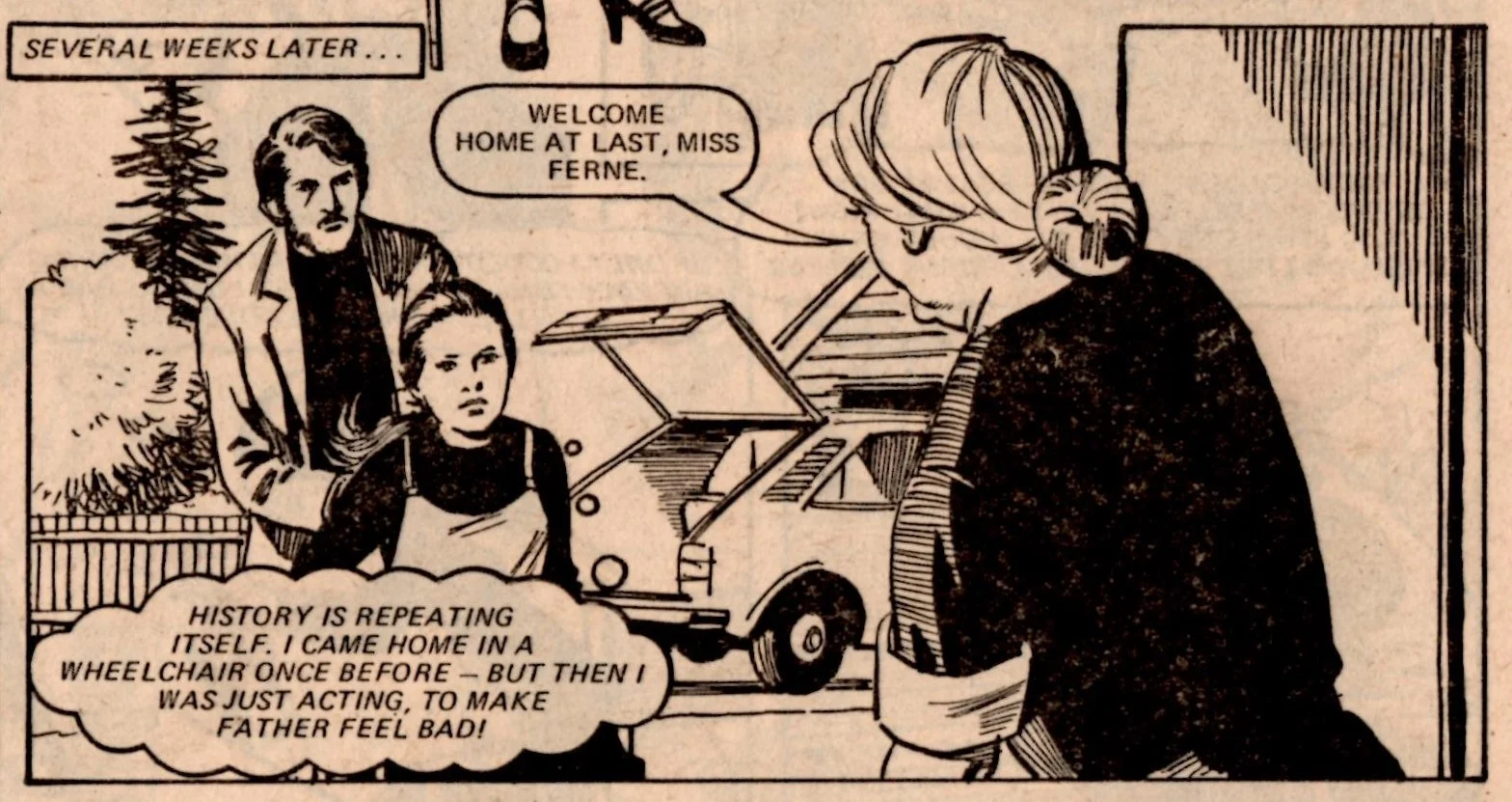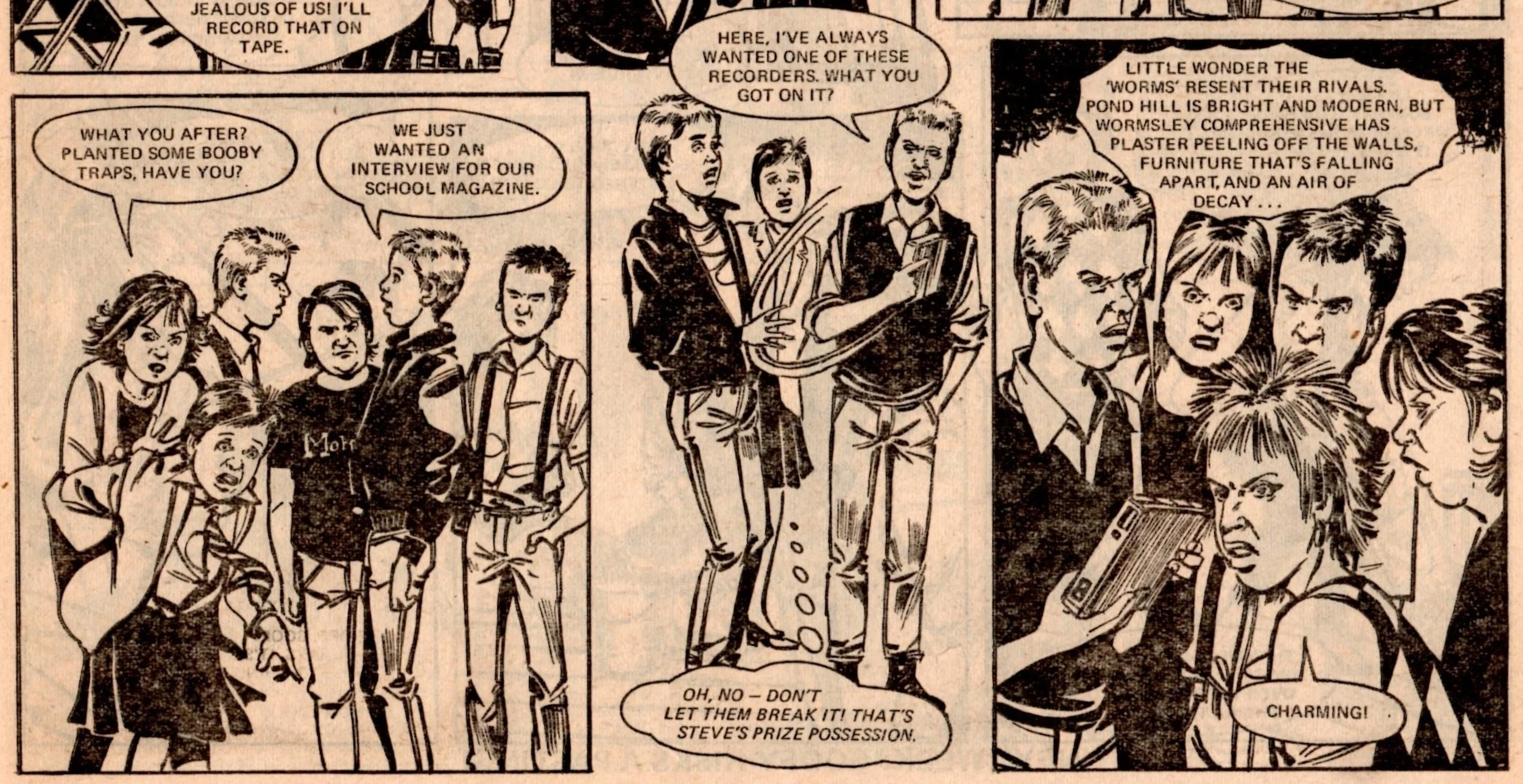 In Pam of Pond Hill, Pam and her school magazine colleague Steve visit a rundown rival school with a plan to interview some of the pupils about why they hate Pond Hill so much, but get caught and incriminated by some condescending comments of their own on Steve’s tape recorder. This reminds me of a time I thought it would be a bright idea to run a survey in my class of who was the most unpopular – I wrote up the results in a little notebook and took it to the tough lad who came out on top, with a speech prepared about how we should all be a bit kinder and more companionable. That conversation drew a crowd of roughly half the school and I just about made it out in a better state than my little notebook.