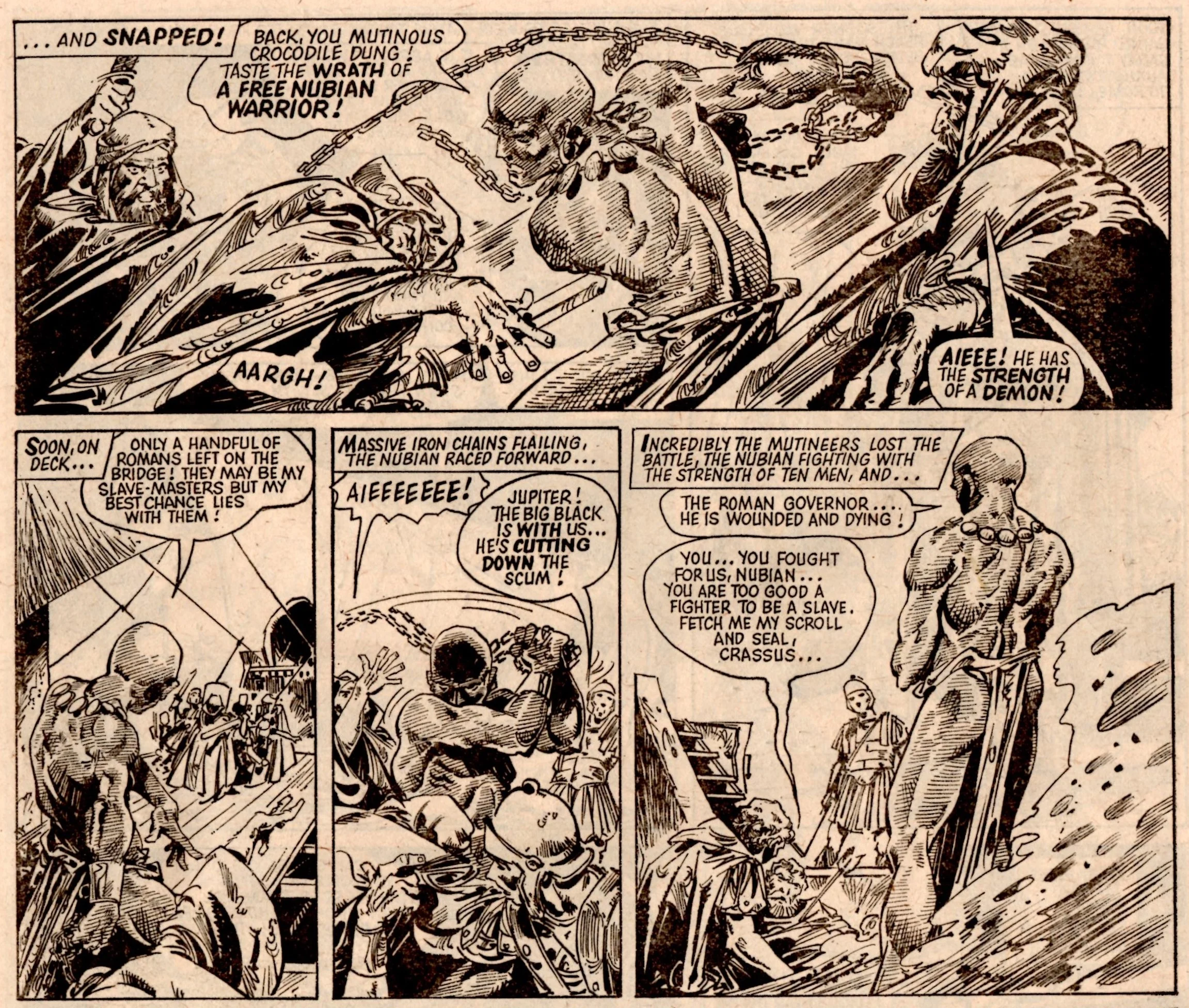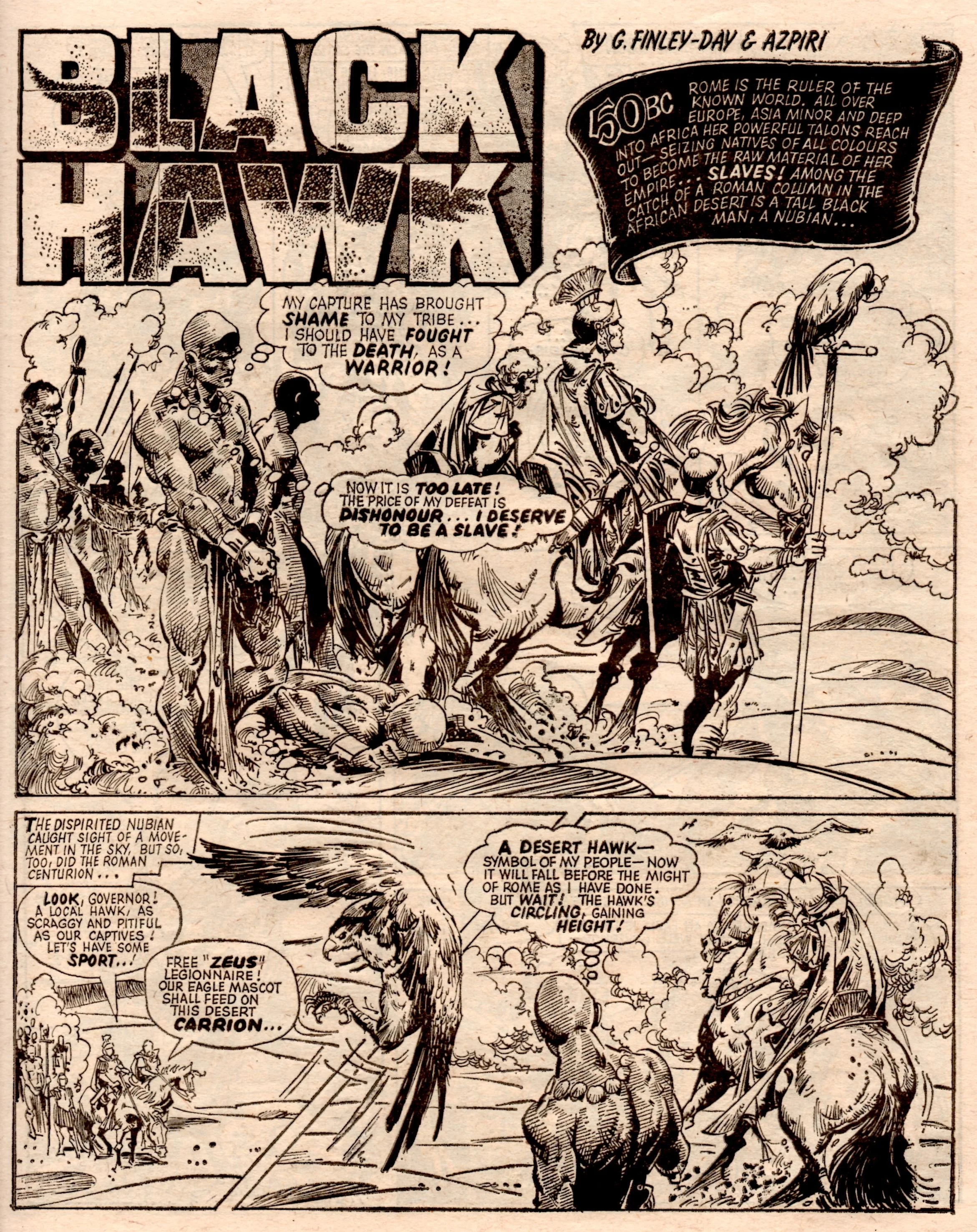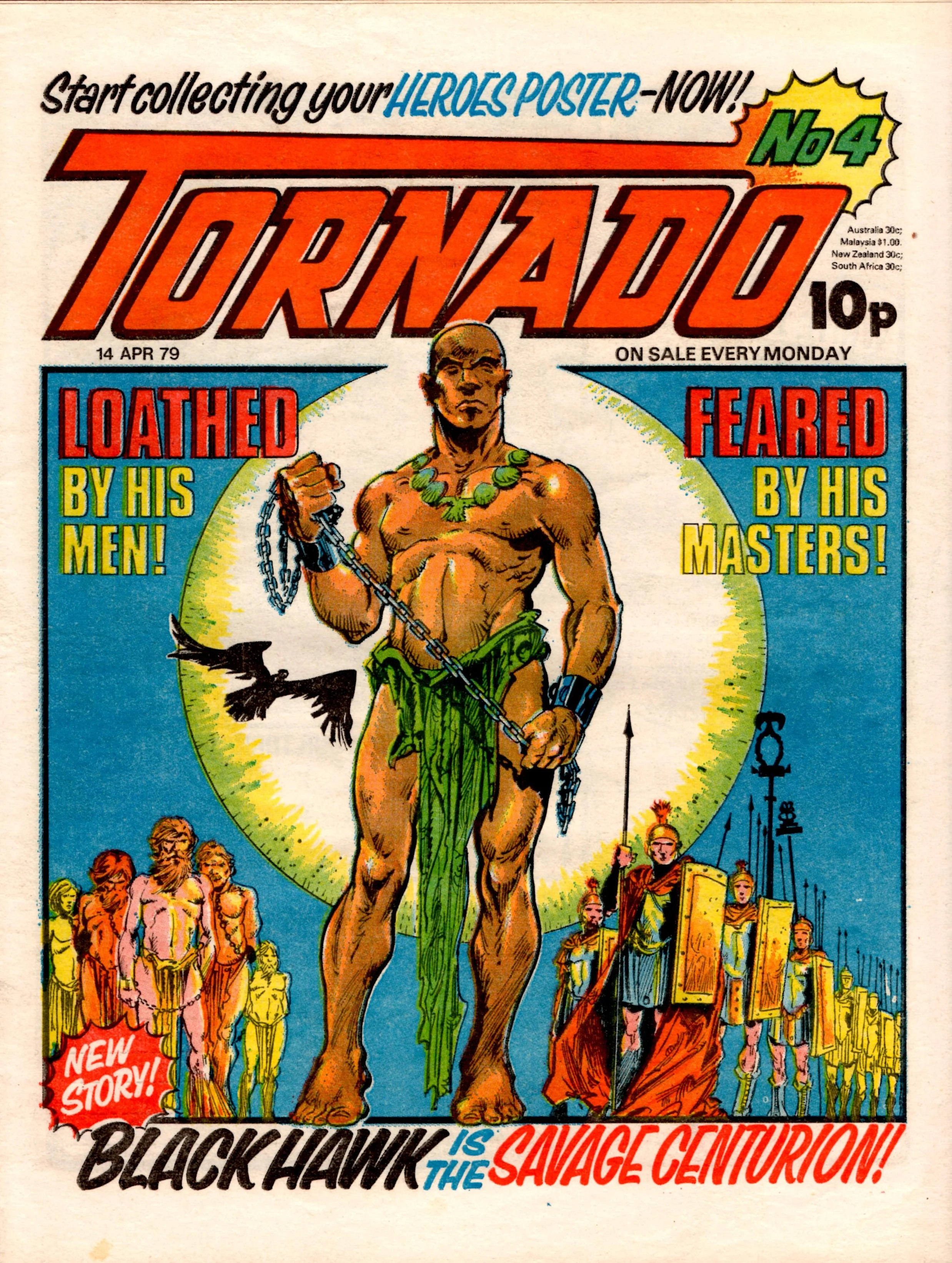 On this day, 14 April 1979 … ‘Loathed by his men! Feared by his masters!’ Poor old Black Hawk – such are the perils of middle management #ancientfirstworldproblems The tale of a heroic loner is usually good material for a comic strip, and Black Hawk was a bit of an epic. Starting in this, the fourth issue of Tornado, it followed the story of a Nubian slave of the Roman Empire who, inspired by the sight of a hawk killing an eagle, fought free of his chains to become a centurion leader. One of Tornado’s most popular characters – a hero among heroes – Black Hawk was selected to survive the merger into 2000AD where he underwent a further transition of circumstance, being zapped into a deep space reality where he fought as a gladiator against alien species.