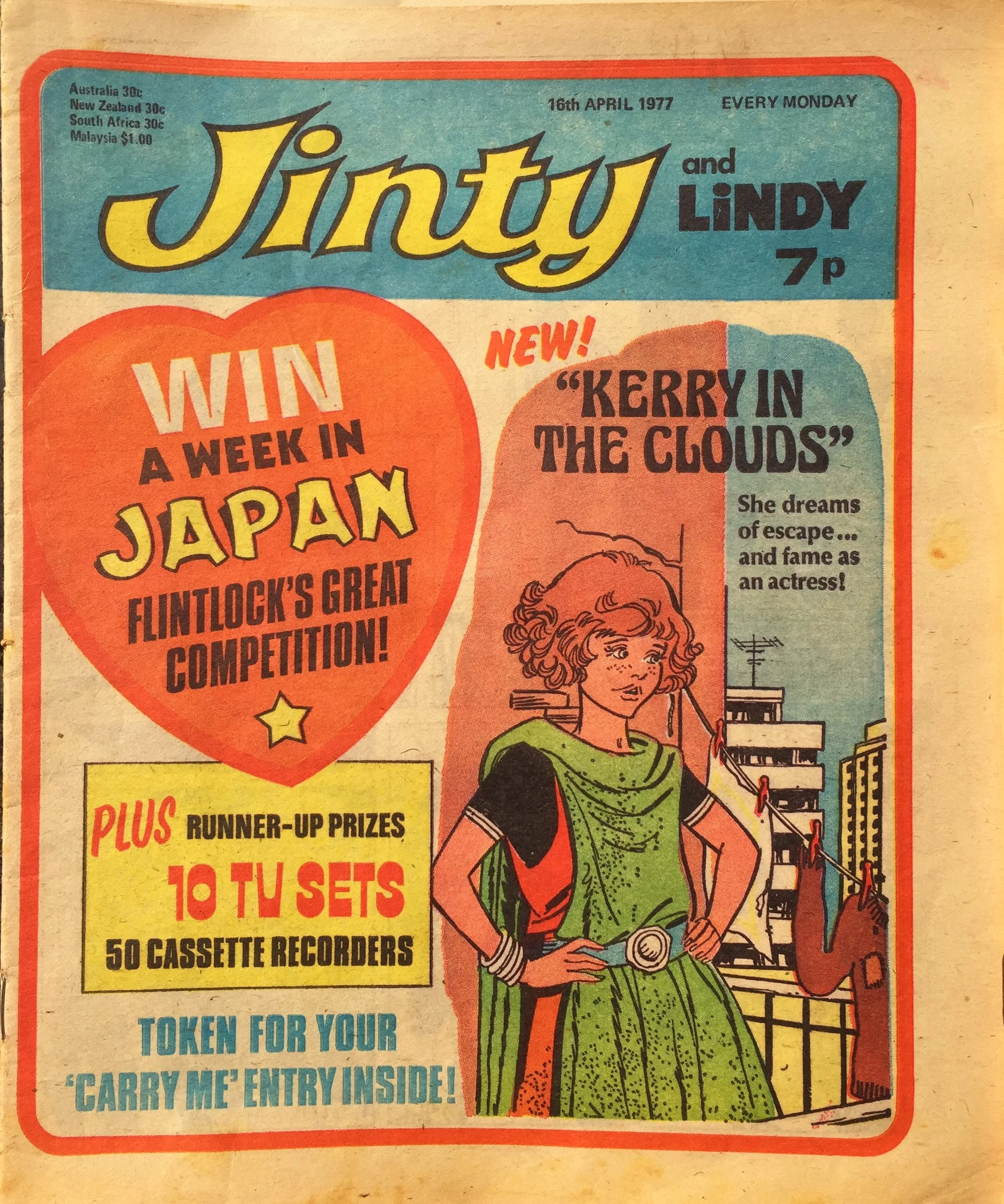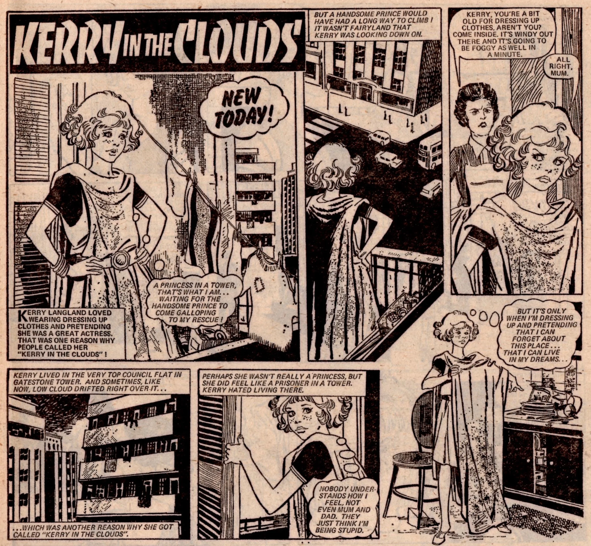 On this day, 16 April 1977 ... This issue of Jinty, published nearly three years into the comic's seven-and-a-half-year run, saw the final episode of one story, Made-up Mandy, and the opening episode of a brand new one, Kerry in the Clouds. There's a point of similarity between the two, in that the protagonists of both have a liking for passing themselves off as other people. 'Mandy Mason was the humble caretaker in an elegant beauty salon but, with her secret skill at make-up, she could transform herself into anyone she chose.' And 'Kerry Langland loved wearing dressing up clothes and pretending she was a great actress. That was one of the reasons why people called her "Kerry in the Clouds"!'