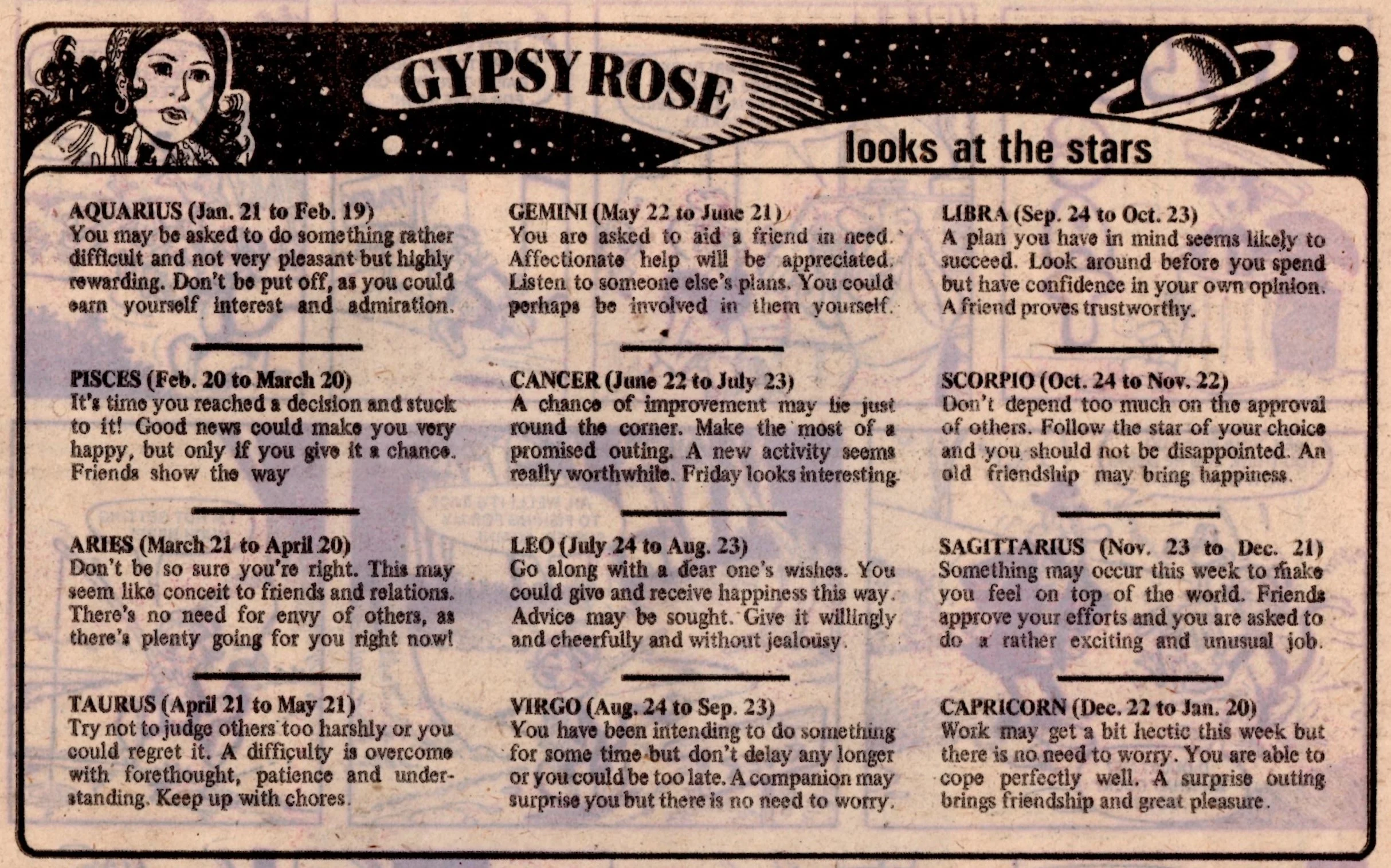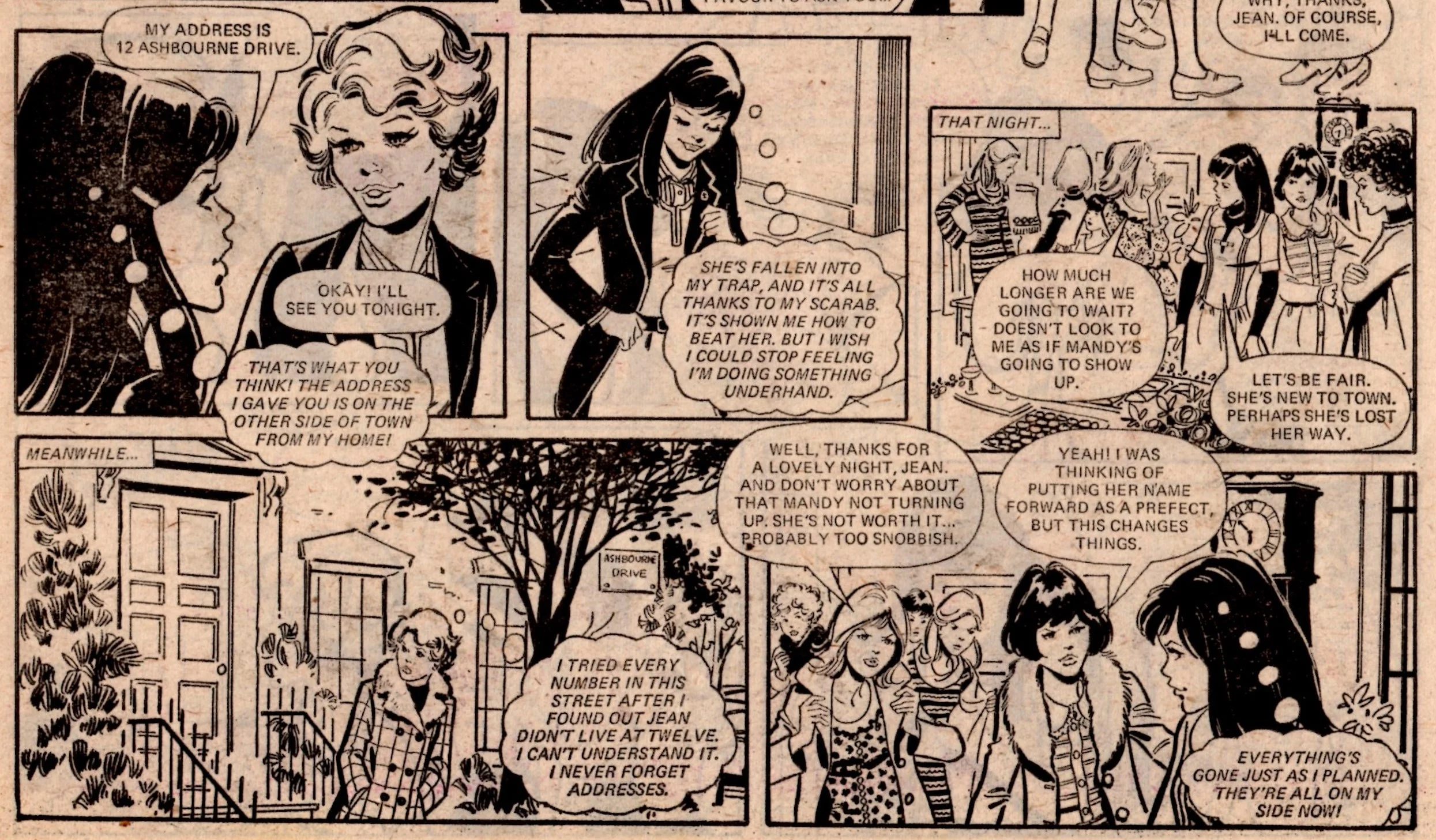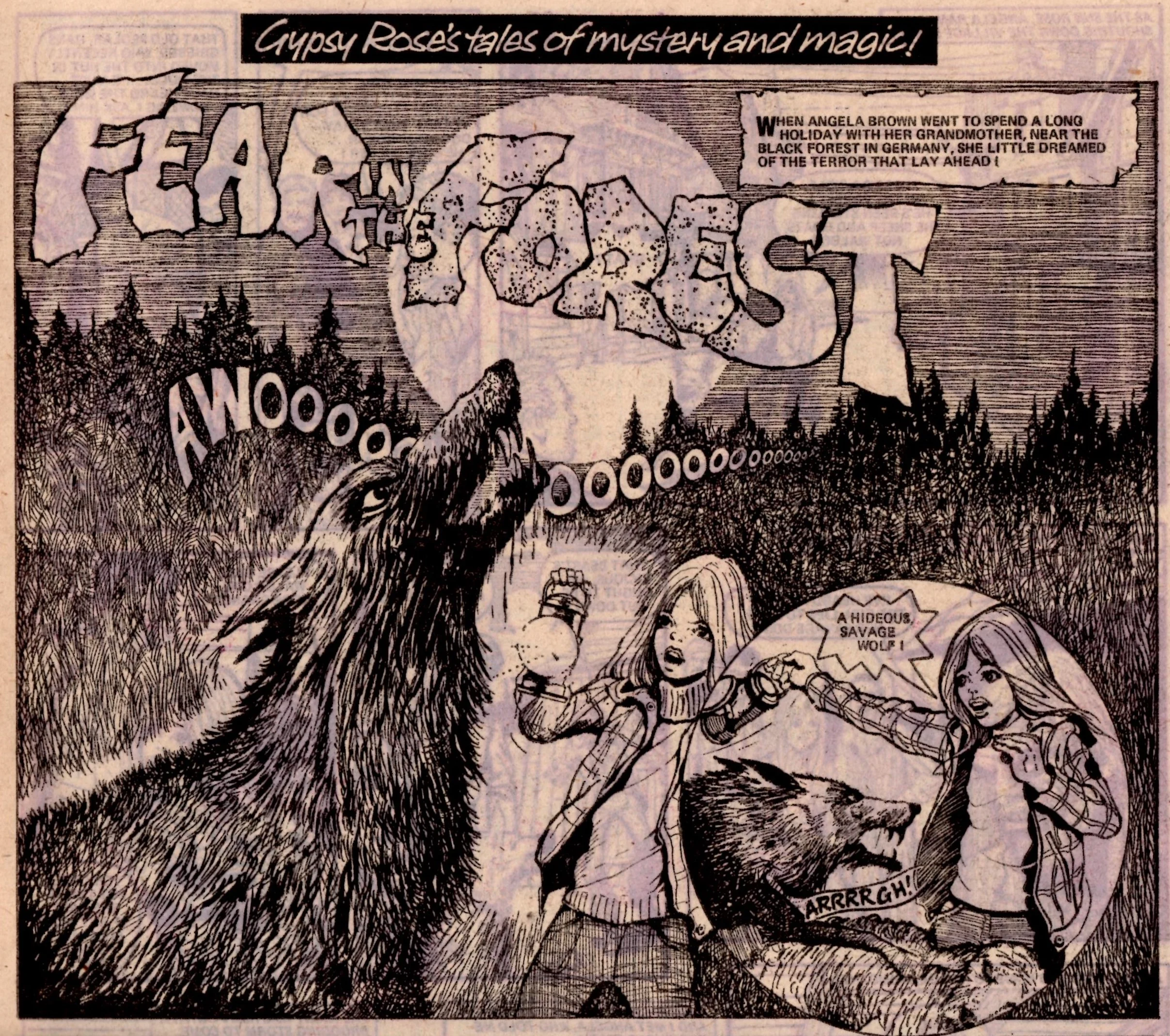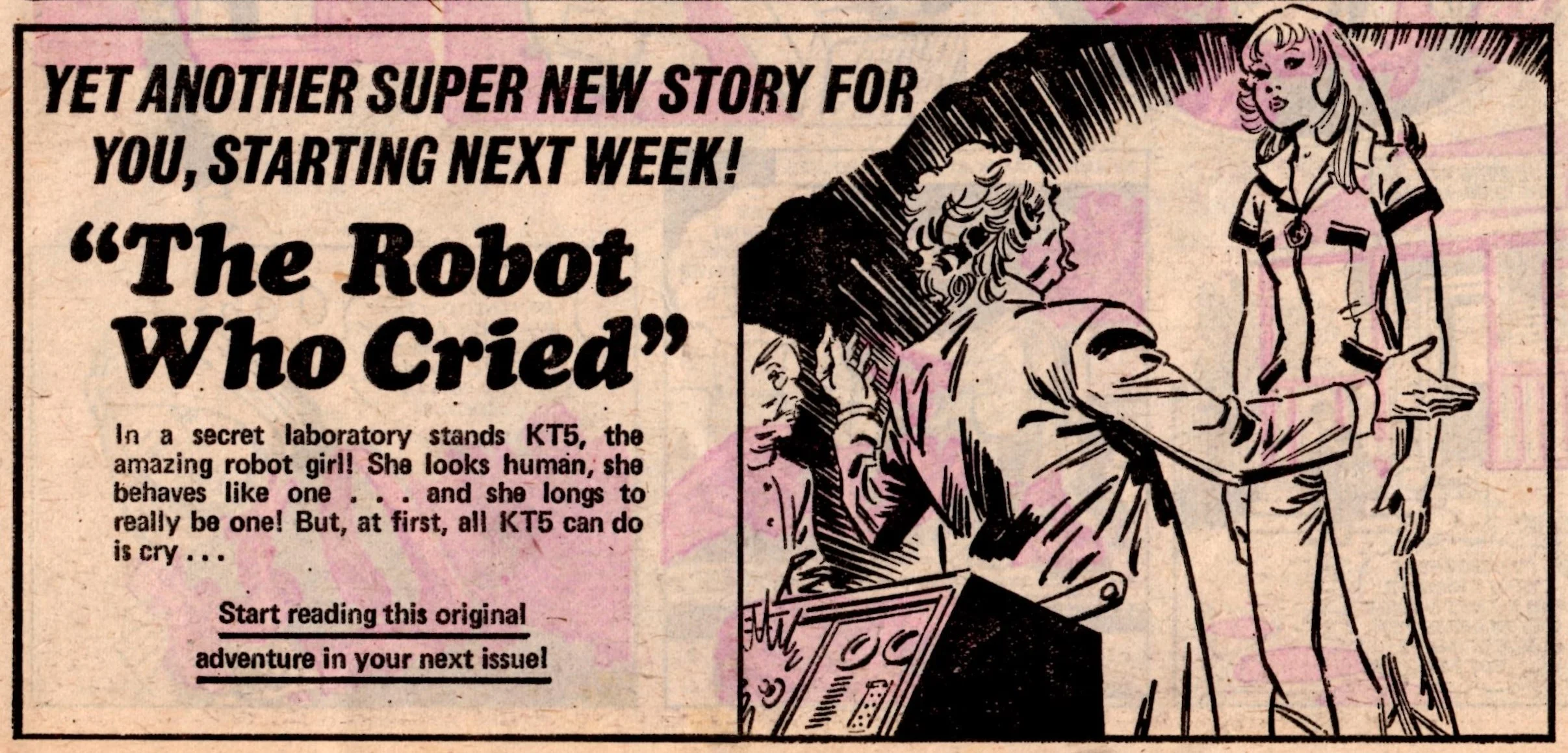 Elsewhere in this issue there's an ad for another new story, The Robot who Cried, which looks full of promise. Ongoing serial Creepy Crawley tells of a girl whose Ancient Egyptian scarab brooch aids her fight for popularity against a rival 'top girl' at school. And The Darkening Journey follows the travels of a guide dog, Thumper (whose own eyesight is deteriorating), and his friend, a rook, in search of Thumper's owner, a blind girl. It's an achingly sad premise but Jose Casanovas' art (which will be familiar to readers of early 2000AD) gives the story a bit of bounce and humour.