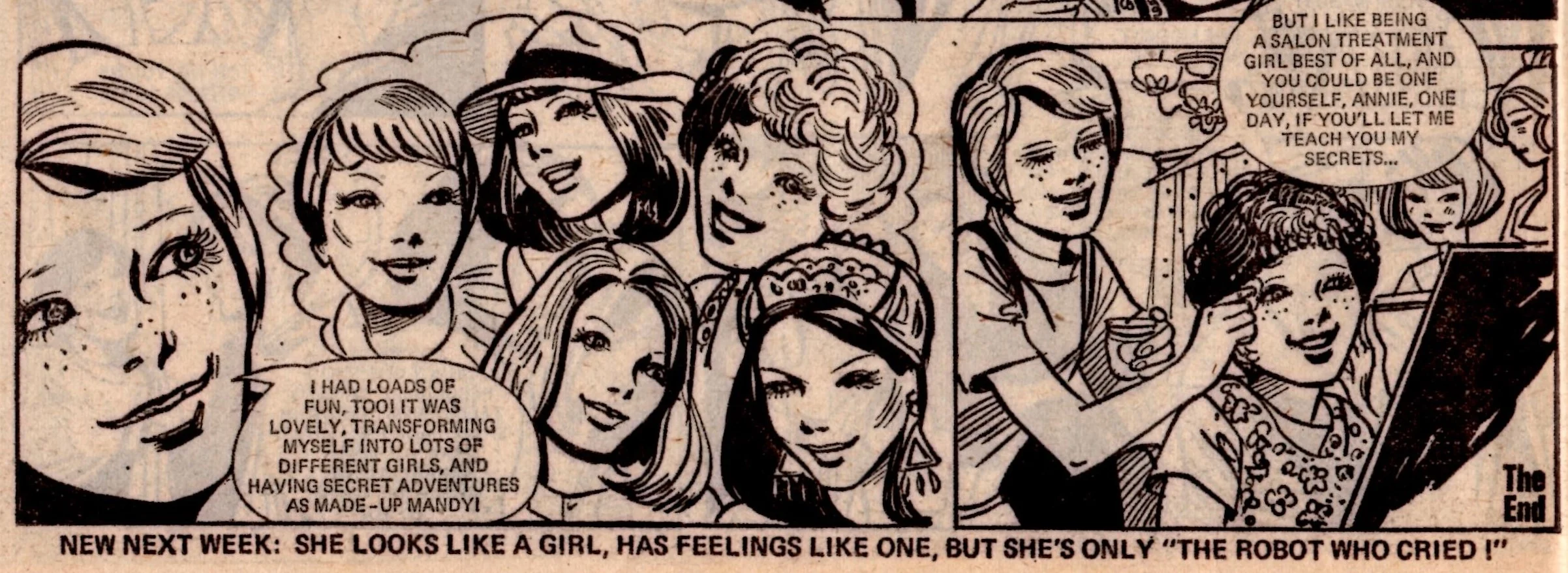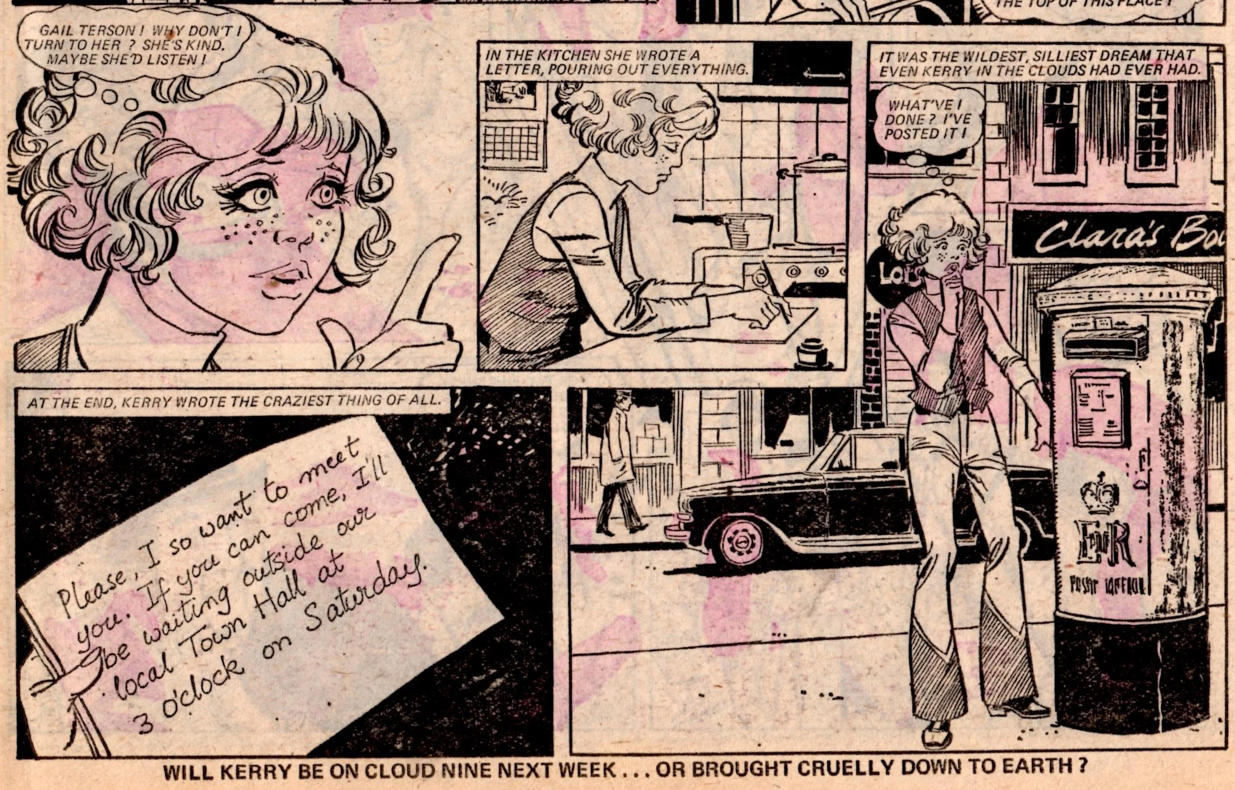 Thereafter the two stories are rather different in tone. Made-up Mandy has a slightly lighter heart; although Mandy is bullied, Cinderella-style, by the snobby salon manageress, there's a fun and fantastical element to her adventures as she genuinely is able to disguise herself as other women with a few. Kerry in the Clouds, however, appears to have a grittier, more kitchen sink feel as we realise Kerry's dreams of glamour are a method of escape from the grim realities of life on the top floor of a run-down council flat.