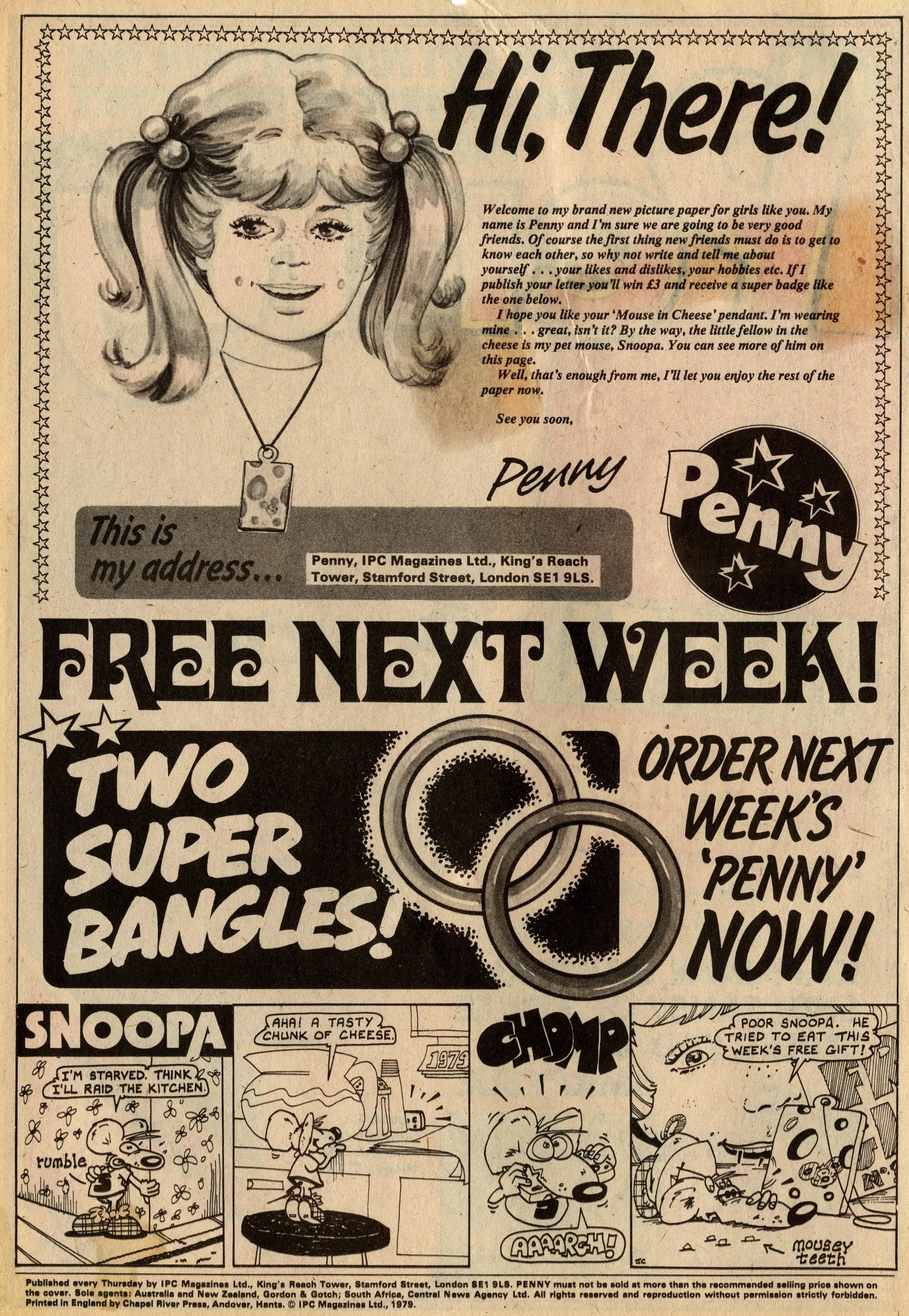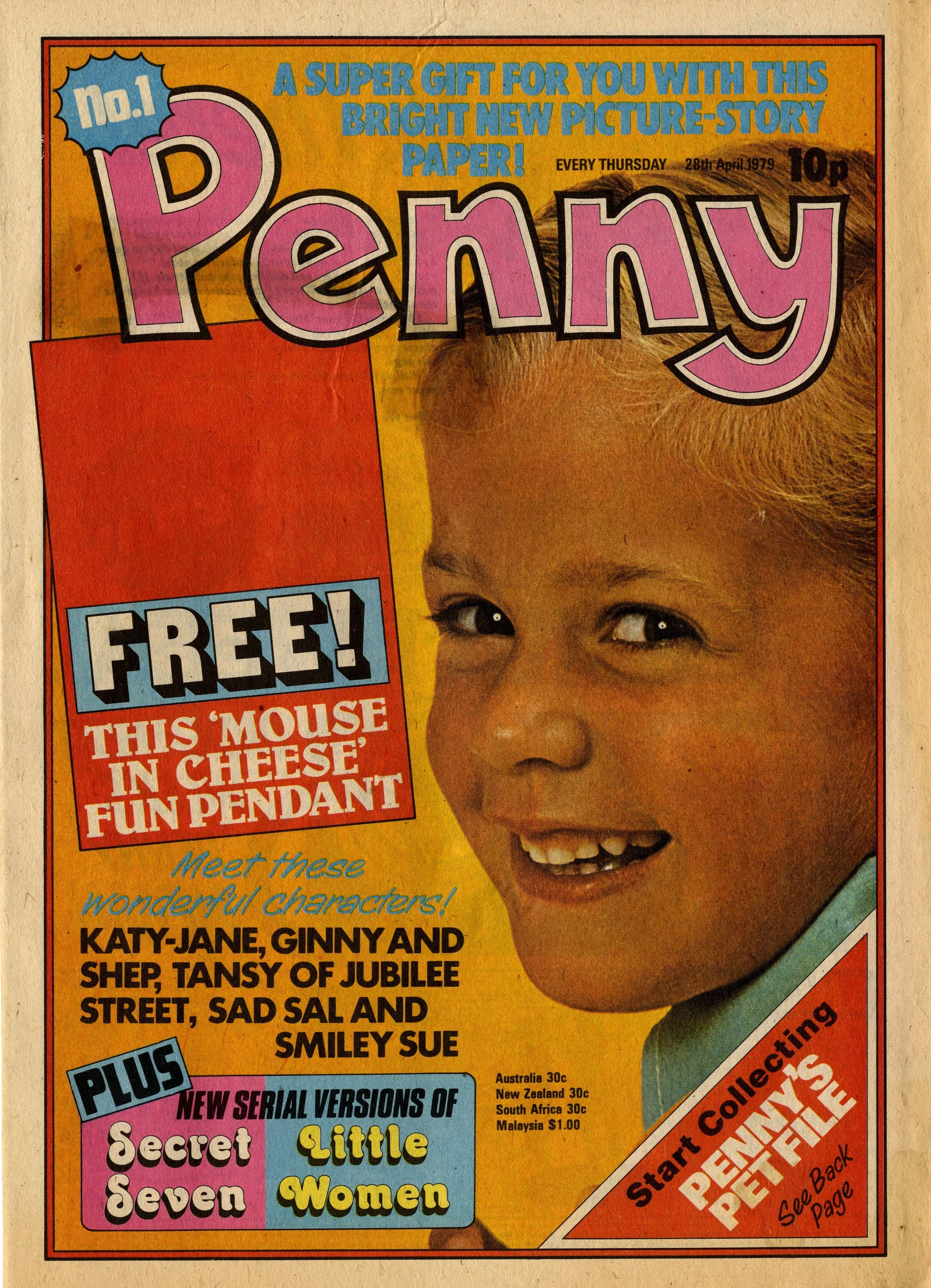 On this day, 28 April 1979 … I nearly didn’t write this blog post. The cover of the first issue of Penny (as, in fact, most of the issues in the first few months of its run) features a picture of a girl who looks so young that I worried it seemed a bit odd for a big bloke in his mid-40s to to be writing about it. It appears to be about as far outside my parameters of interests as anything else I’m likely to feature on the blog. But then again, it does fall within the blog’s remit of IPC comics published in the 1970s and 1980s (I’ve excluded pre-school comics, but Penny is pitched at an older age than that) and a first issue is significant, so why not? There are a couple of stories that later transferred to Jinty (Tansy of Jubilee Street and Snoopa), and a few artists that are familiar from other comics in the range. Also, I’m fortunate enough to have a copy still accompanied by the original ‘Mouse in Cheese pendant’ free gift, so it’s a good chance to show off that without the usual mockery I get when I wear it down the pub or at the Arsenal.