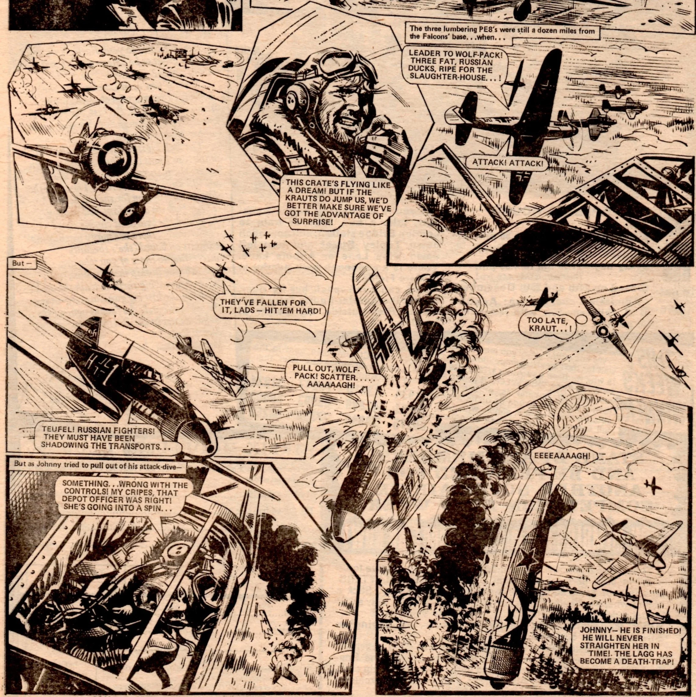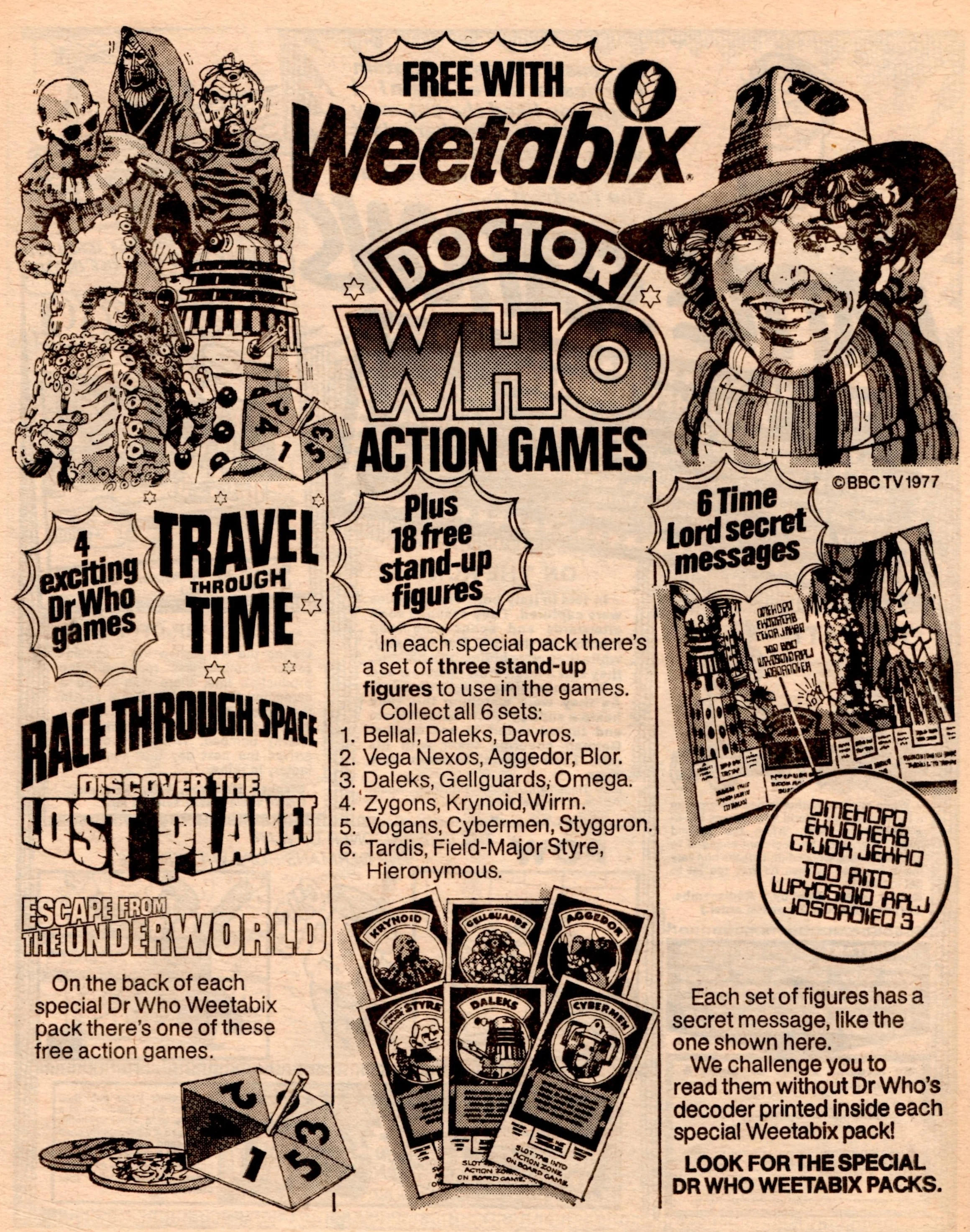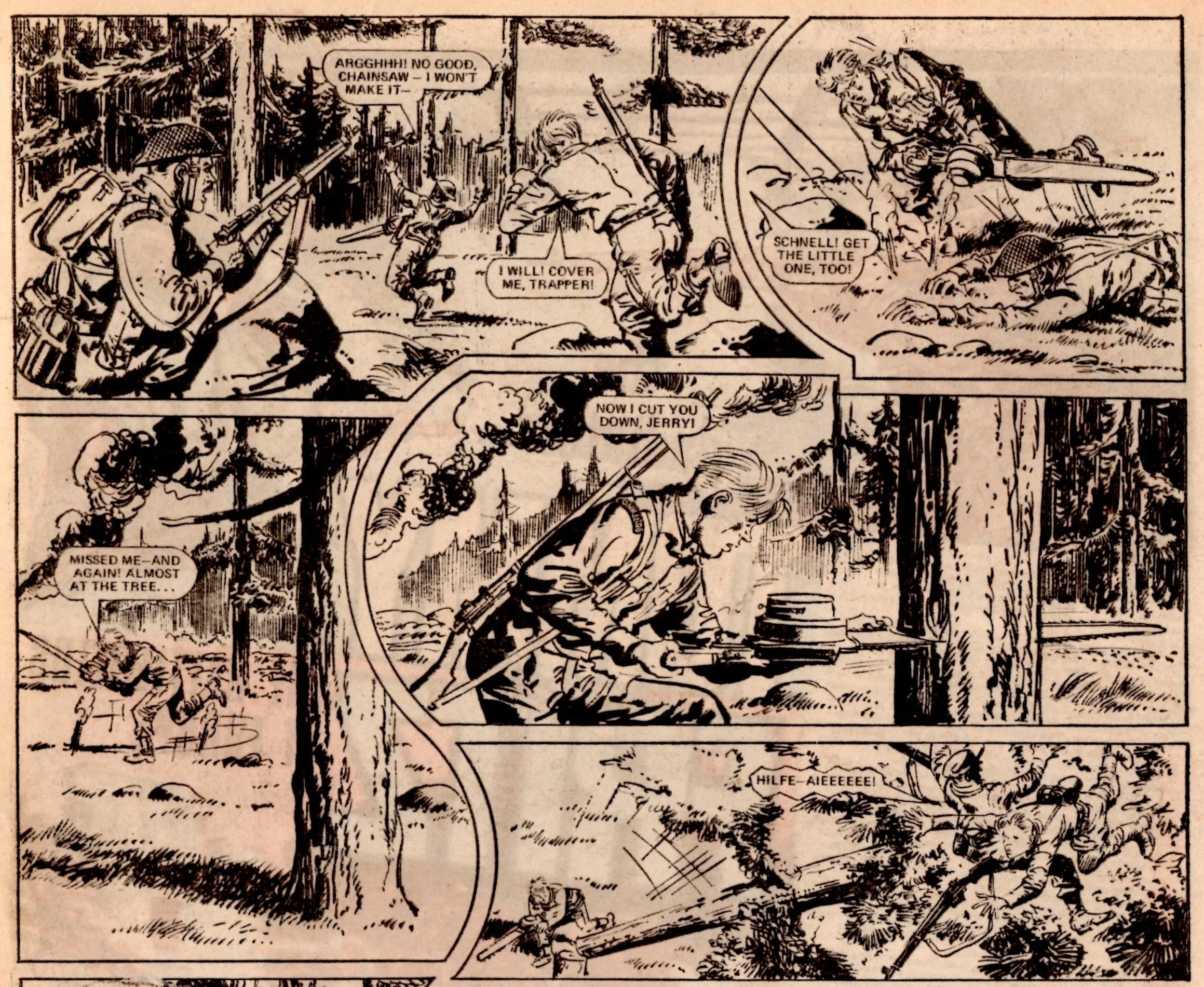 Inside, there’s the usual great Battle fare. Major Eazy teams up with the Rat Pack in what must have been a very exciting crossover event back in the day. Joe Colquhoun’s on duty on Johnny Red, Mike Western brings us a typically brutal yet strangely gorgeous Darkie’s Mob, and Pat Wright’s Operation Black Death is a truly chilling realisation of Hitler’s last days. There is a bonus thrill for me with a full-page ad for Weetabix’s 1977 Doctor Who promotion – quite possibly the most exciting cultural event of my childhood. Those figures were incredibly important to six-year-old me, to the extent that I still get goosebumps when I see stacks of Weetabix boxes on a grocer’s shelves.