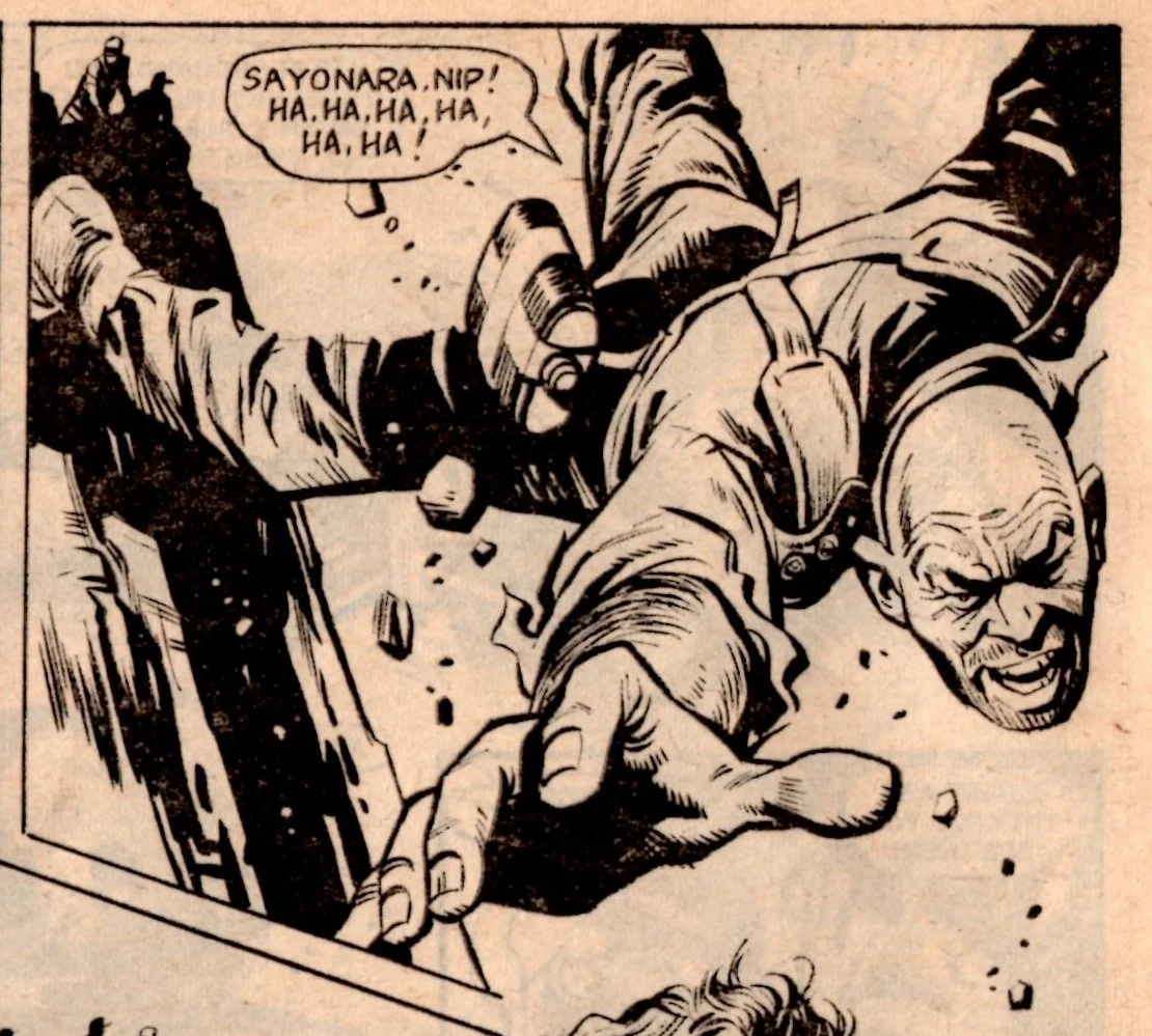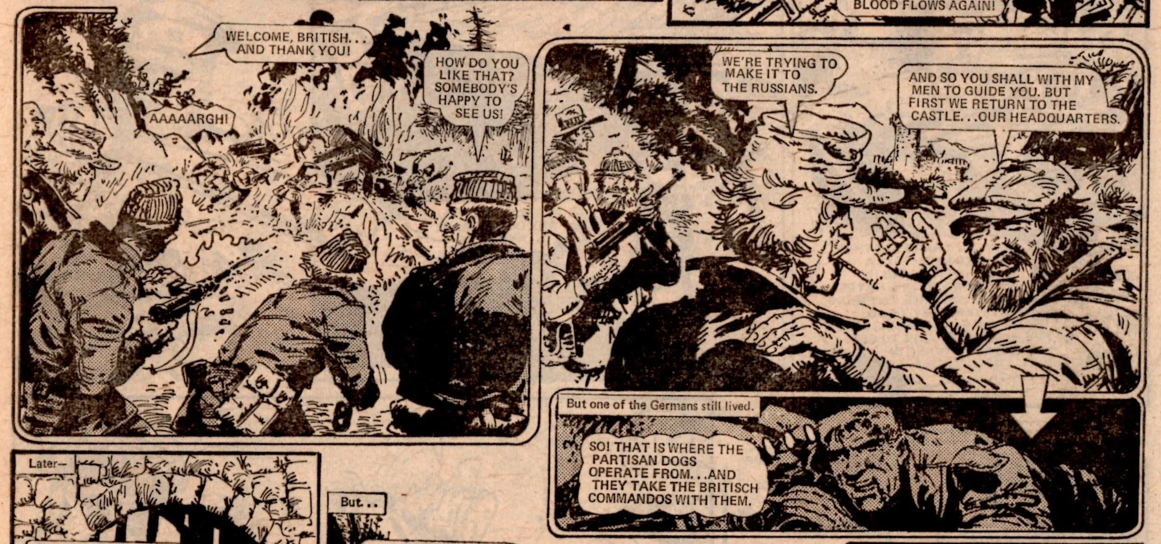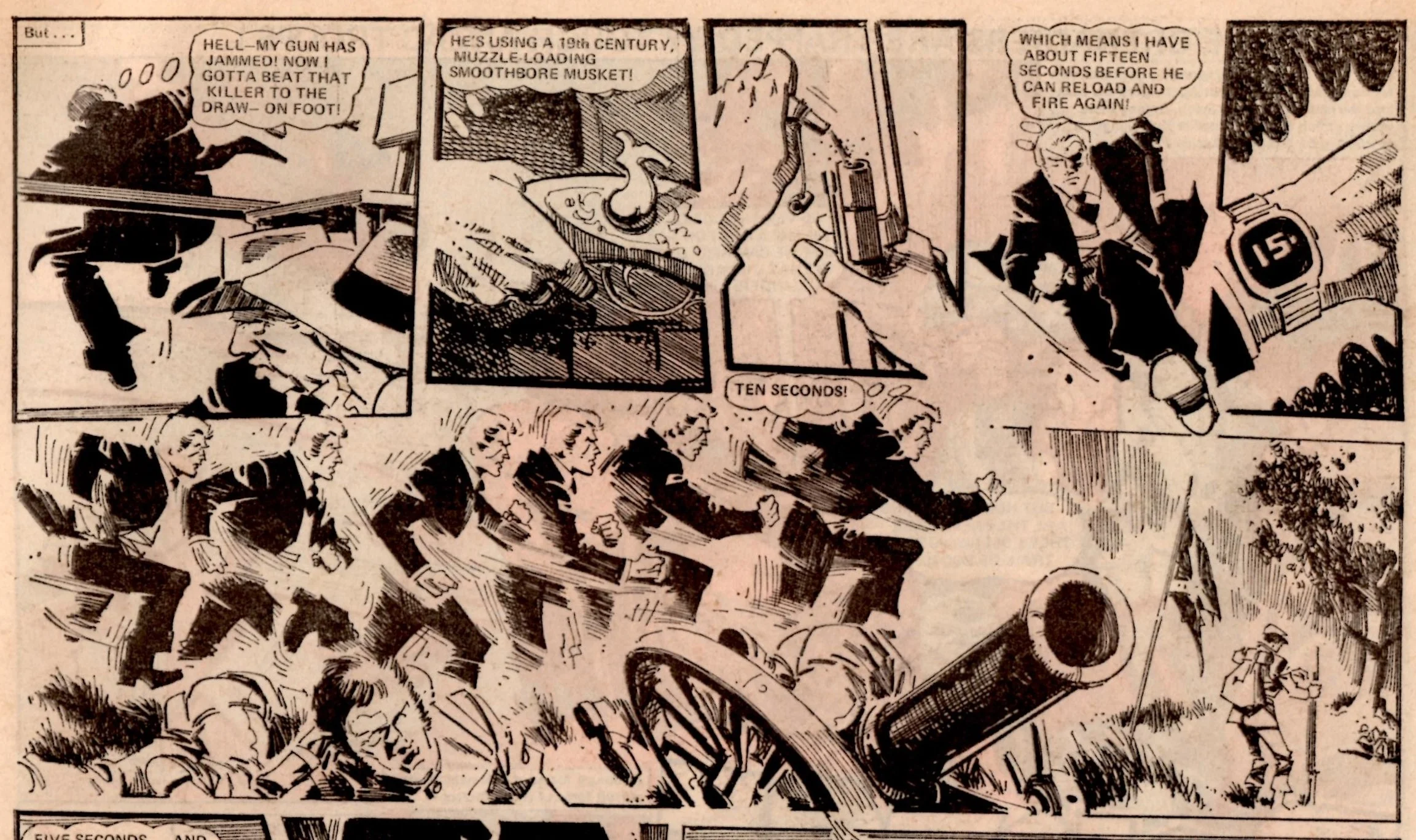 Inside, there’s the usual great Battle fare. Major Eazy teams up with the Rat Pack in what must have been a very exciting crossover event back in the day. Joe Colquhoun’s on duty on Johnny Red, Mike Western brings us a typically brutal yet strangely gorgeous Darkie’s Mob, and Pat Wright’s Operation Black Death is a truly chilling realisation of Hitler’s last days. There is a bonus thrill for me with a full-page ad for Weetabix’s 1977 Doctor Who promotion – quite possibly the most exciting cultural event of my childhood. Those figures were incredibly important to six-year-old me, to the extent that I still get goosebumps when I see stacks of Weetabix boxes on a grocer’s shelves.