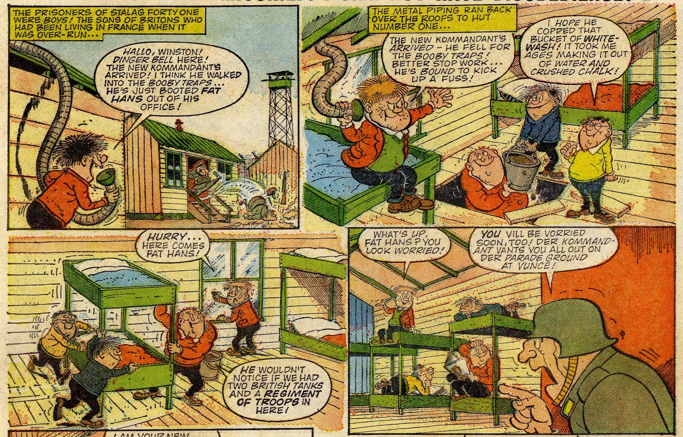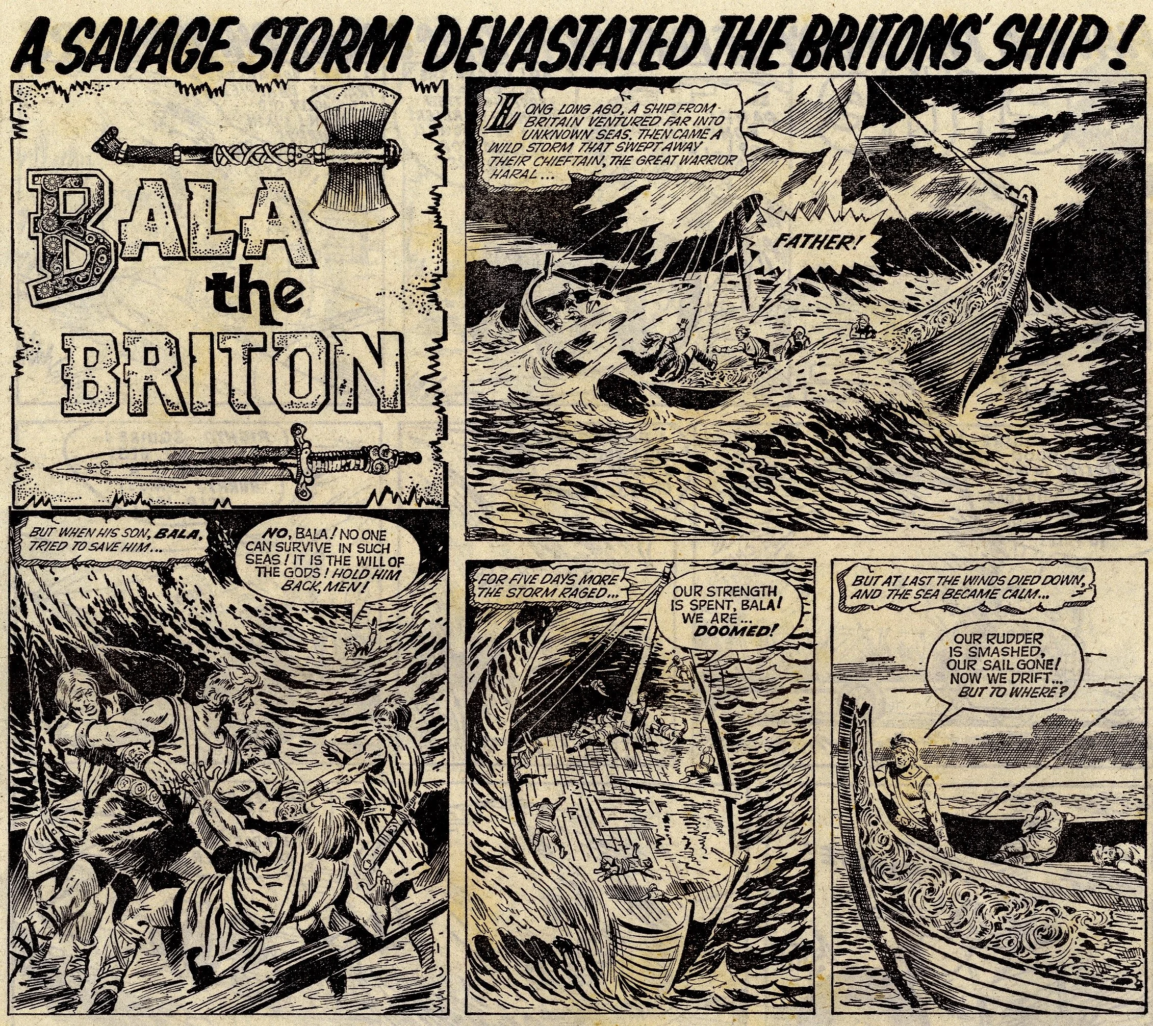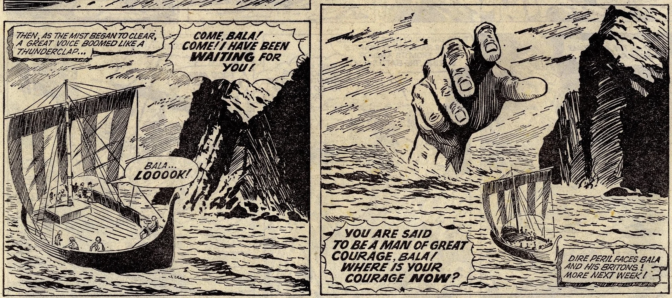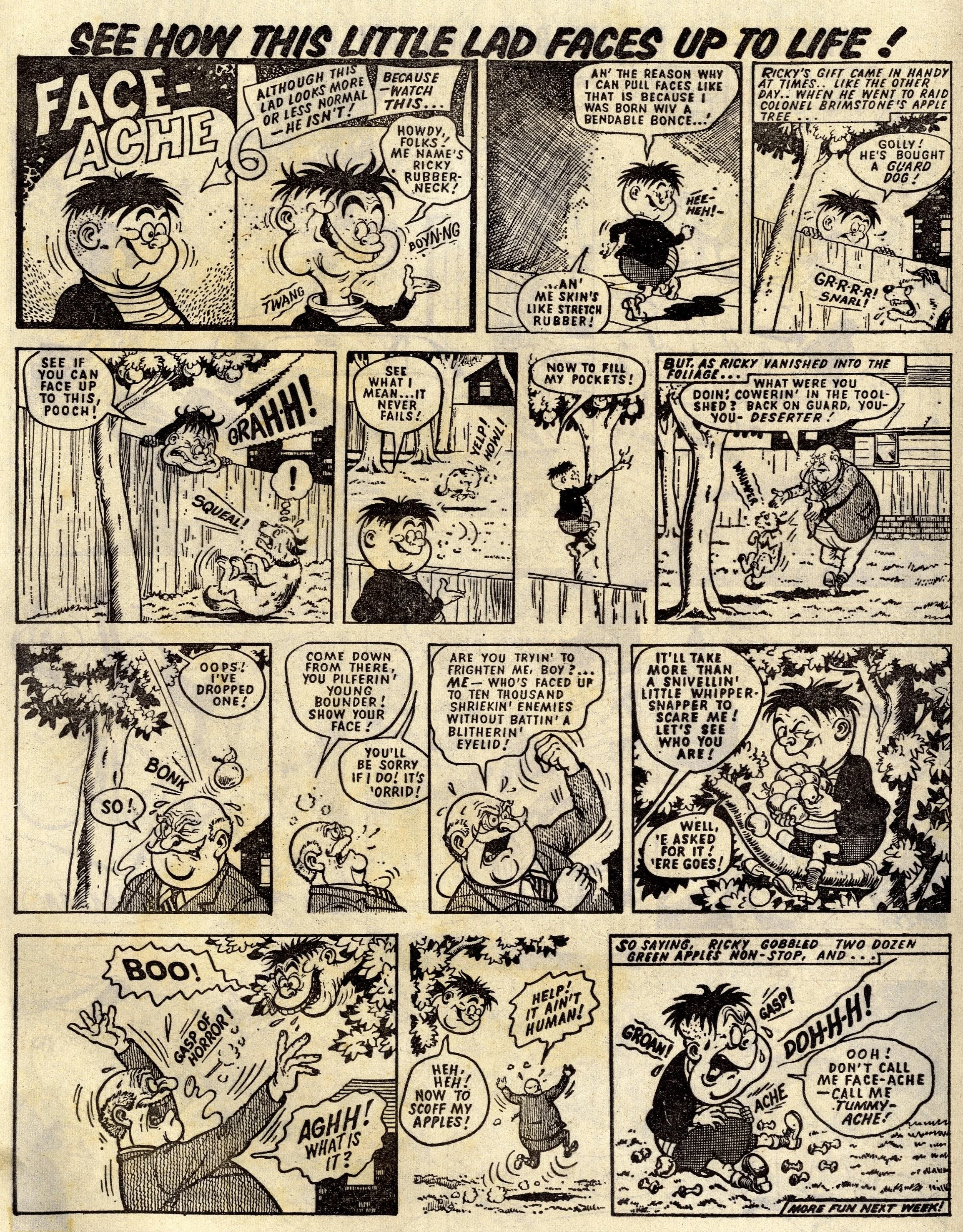 What’s great about this comic? Well, quite a few things. That front cover for the start, with a Pertwee-esque Doktor Von Hoffman riding his weaponised giant eel across the waves of the English Channel, and them Trebor fruity chew bars that look zingy and delicious (I don’t have the originals, sadly). That glam Cola Rola ad on the back is also mouth-watering. Faceache – one of the all-time most brilliant British comic creations – begins in this issue (with a ‘twang’ and a ‘boyn-ng’ rather than a ‘scrunge’). Ricky Rubberneck? I never knew that was his real name! Bala the Briton, which I know to be fondly remembered by some, is also here – probably the most serious-toned strip of the line-up. It has a terrific final panel, which looks as though it may have influenced Ian Edginton and Steve Yeowell’s The Red Seas in more recent 2000AD. We also find The Kids of Stalag 41, which also made it into Buster after the merger – and it looks bloomin’ good here on the colour centre pages.