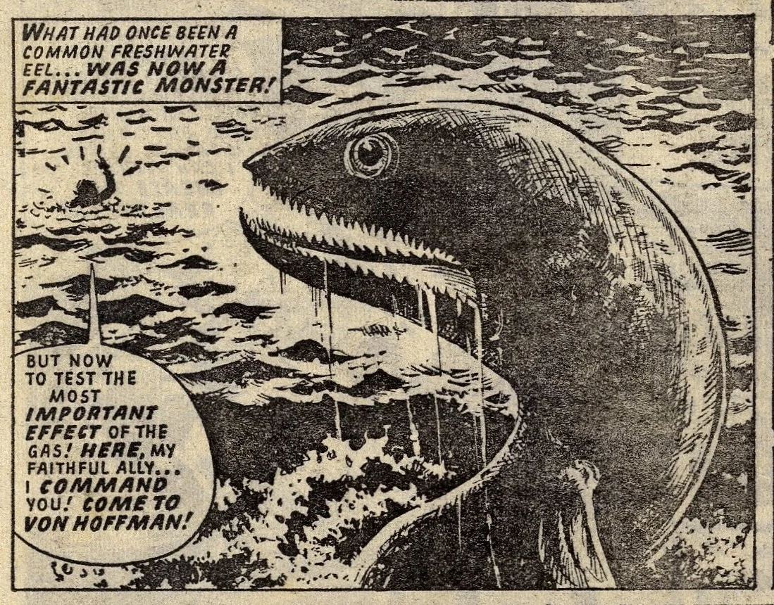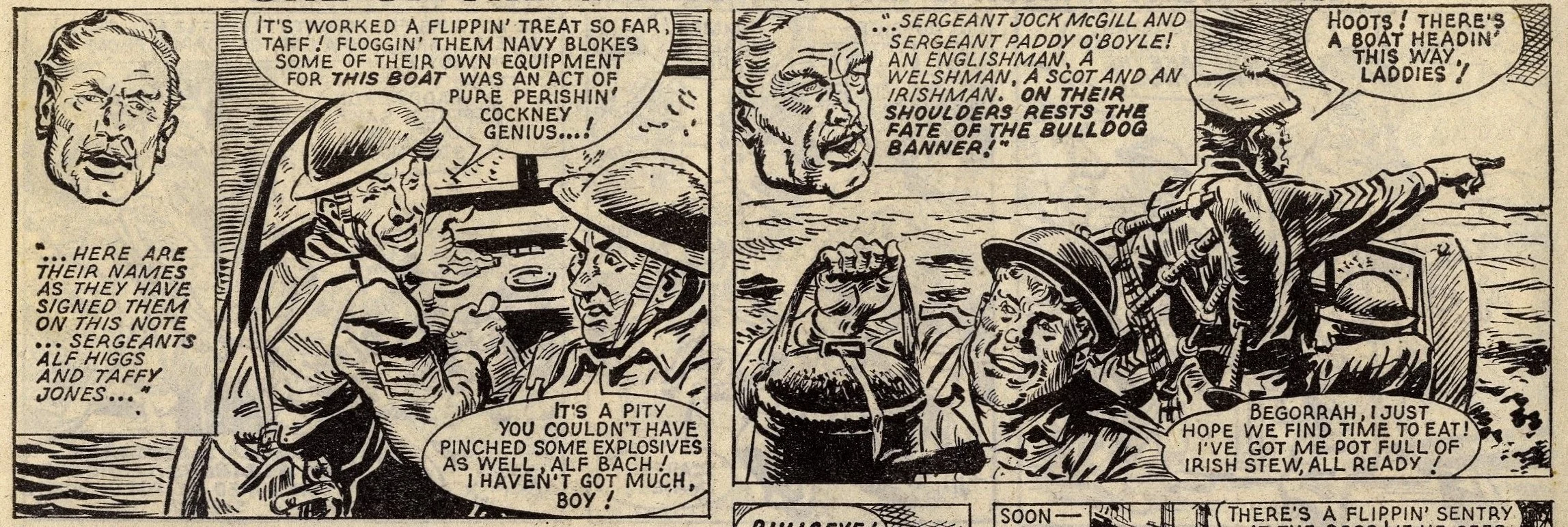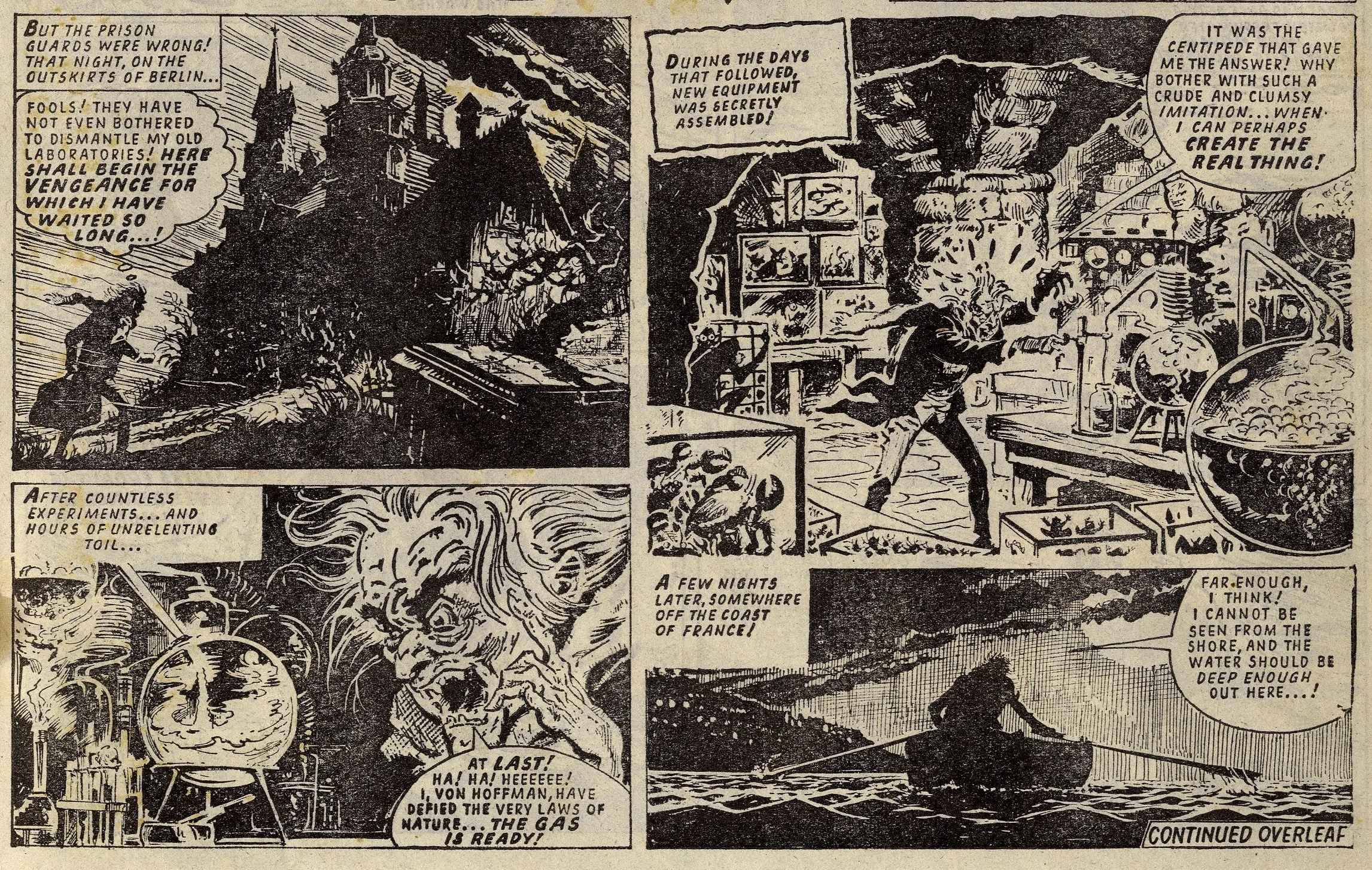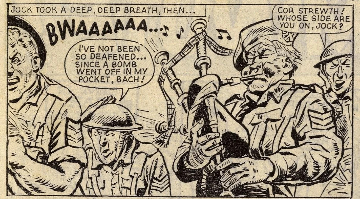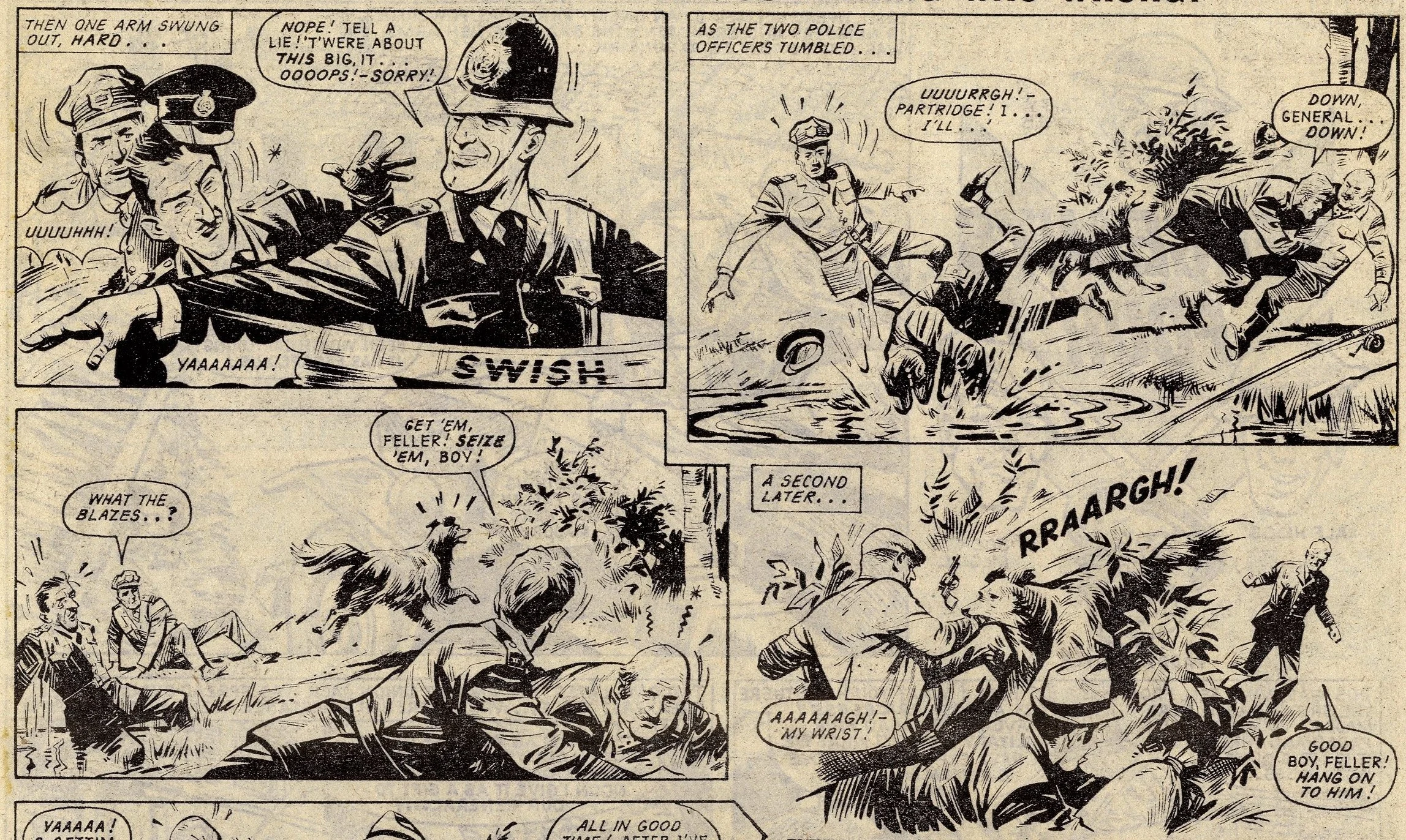 What’s great about this comic? Well, quite a few things. That front cover for the start, with a Pertwee-esque Doktor Von Hoffman riding his weaponised giant eel across the waves of the English Channel, and them Trebor fruity chew bars that look zingy and delicious (I don’t have the originals, sadly). That glam Cola Rola ad on the back is also mouth-watering. Faceache – one of the all-time most brilliant British comic creations – begins in this issue (with a ‘twang’ and a ‘boyn-ng’ rather than a ‘scrunge’). Ricky Rubberneck? I never knew that was his real name! Bala the Briton, which I know to be fondly remembered by some, is also here – probably the most serious-toned strip of the line-up. It has a terrific final panel, which looks as though it may have influenced Ian Edginton and Steve Yeowell’s The Red Seas in more recent 2000AD. We also find The Kids of Stalag 41, which also made it into Buster after the merger – and it looks bloomin’ good here on the colour centre pages.