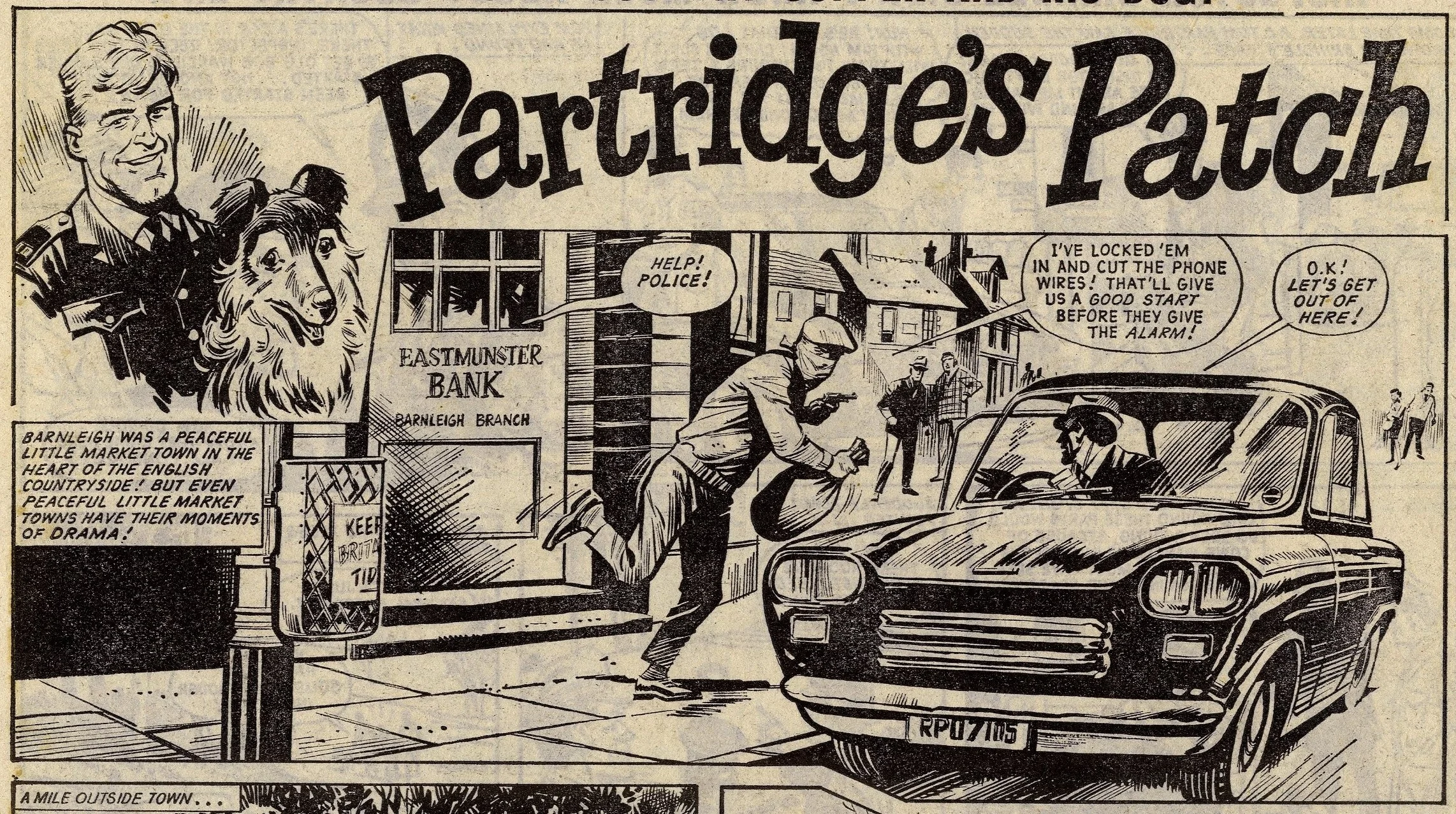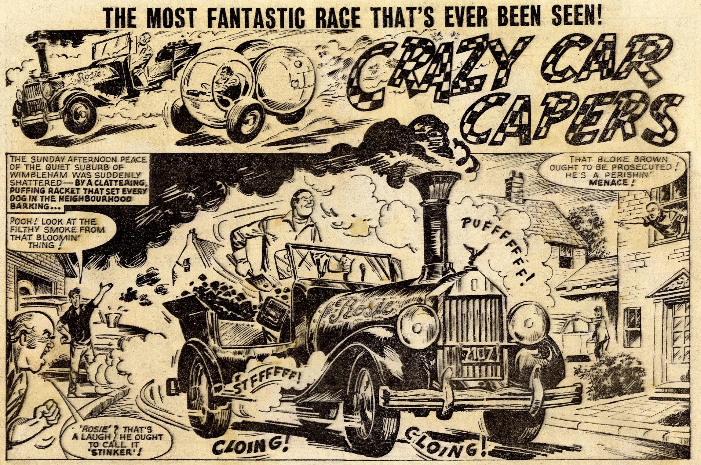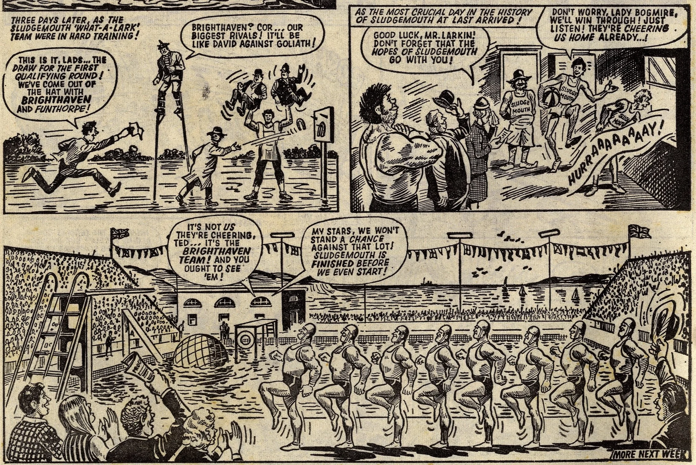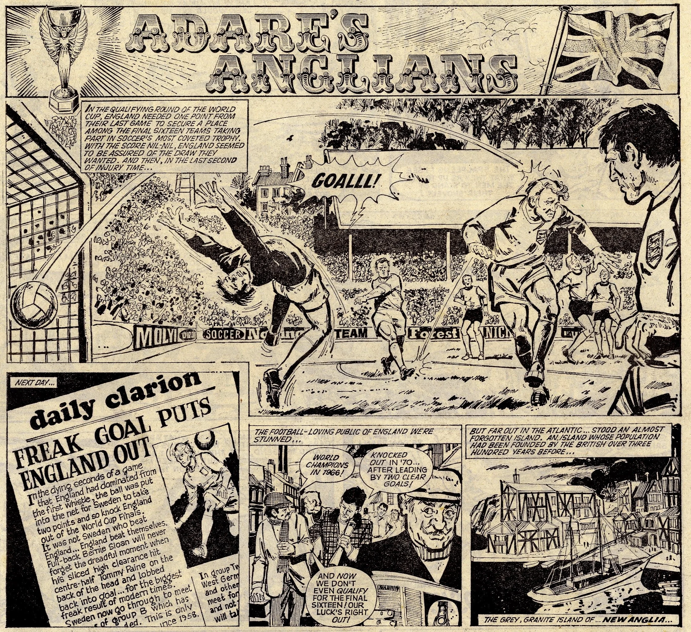 Crazy Car Capers opens in the quiet English suburb of ‘Wimbleham’, just as Paddy McGinty lives in the hills of ‘Boggymorra’, Partridge’s Patch is a little market town in the heart of the English countryside called ‘Barnleigh’, The Sludgemouth Sloggers hail from the rainy seaside resort of ‘Sludgemouth’ (across the bay from ‘Brighthaven’), and Adare’s Anglians are a team of plucky footballers from the little-known fifth British Isle of ‘New Anglia’, who seek to avenge England’s failure to qualify for the 1974 World Cup. That last bit did actually come true, but apart from that the comic is unashamed, whimsical, little England fantasy. Just in case that wasn’t clear, however, the inside back cover carries the disclaimer: ‘All the characters and names in all stories in JET are fictitious and have no reference to any living person.’