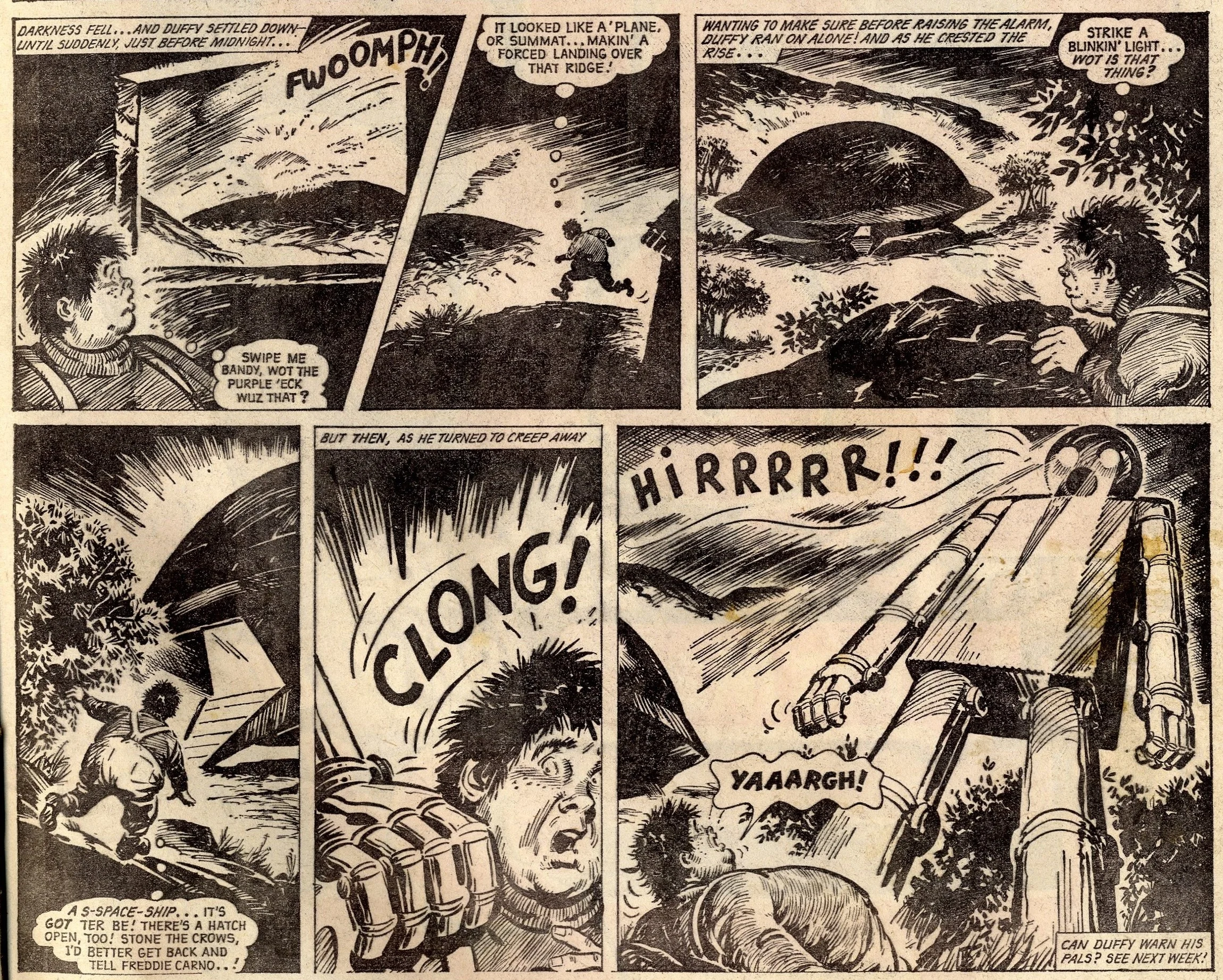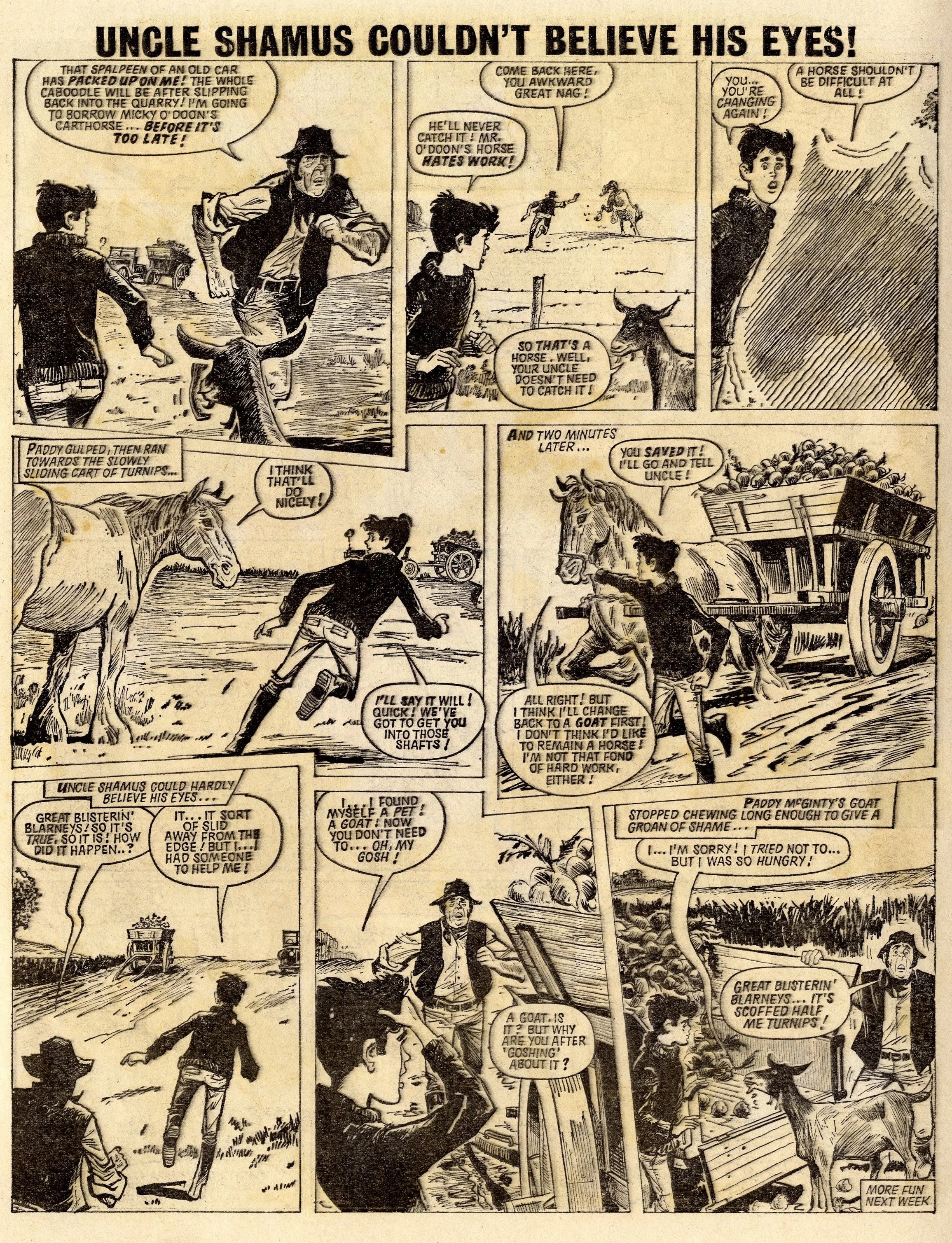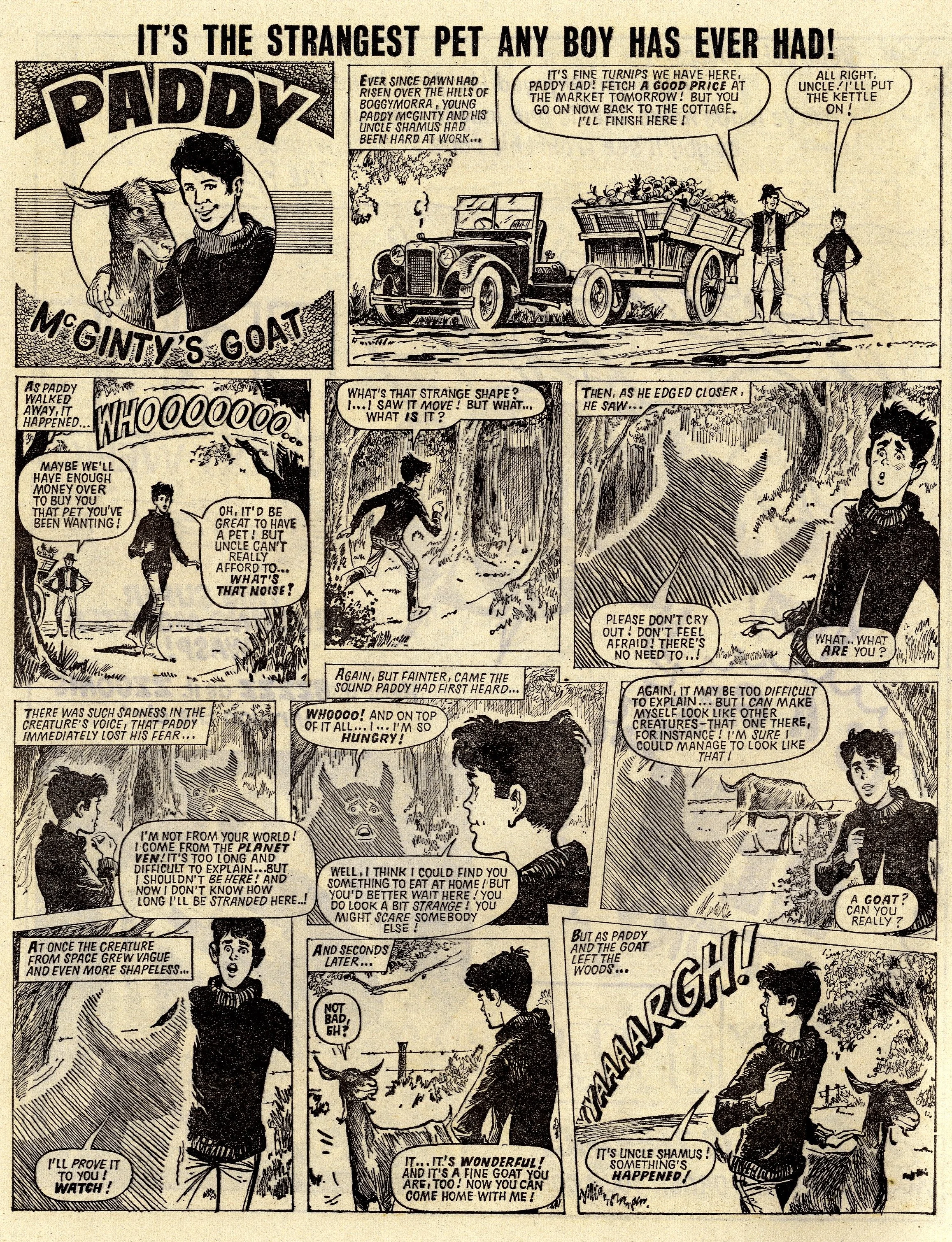 On this day, 1 May 1971 … In the brilliant ‘Future Shock’ documentary about 2000AD, Pat Mills describes the comics scene into which 2000AD’s forerunner Action was launched as having a condescending attitude to its readers. As an example of how stale and ridiculous things had become he references a strip called Paddy McGinty’s Goat – the tale of a young Irish lad befriended by an alien which takes the form of a goat. This story made me laugh, so much so that I don’t think I quite took on board that Paddy McGinty’s Goat was a real, published story (despite the fact that the film showed illustrations from it); my mind just filed it away as code for ‘crap’.