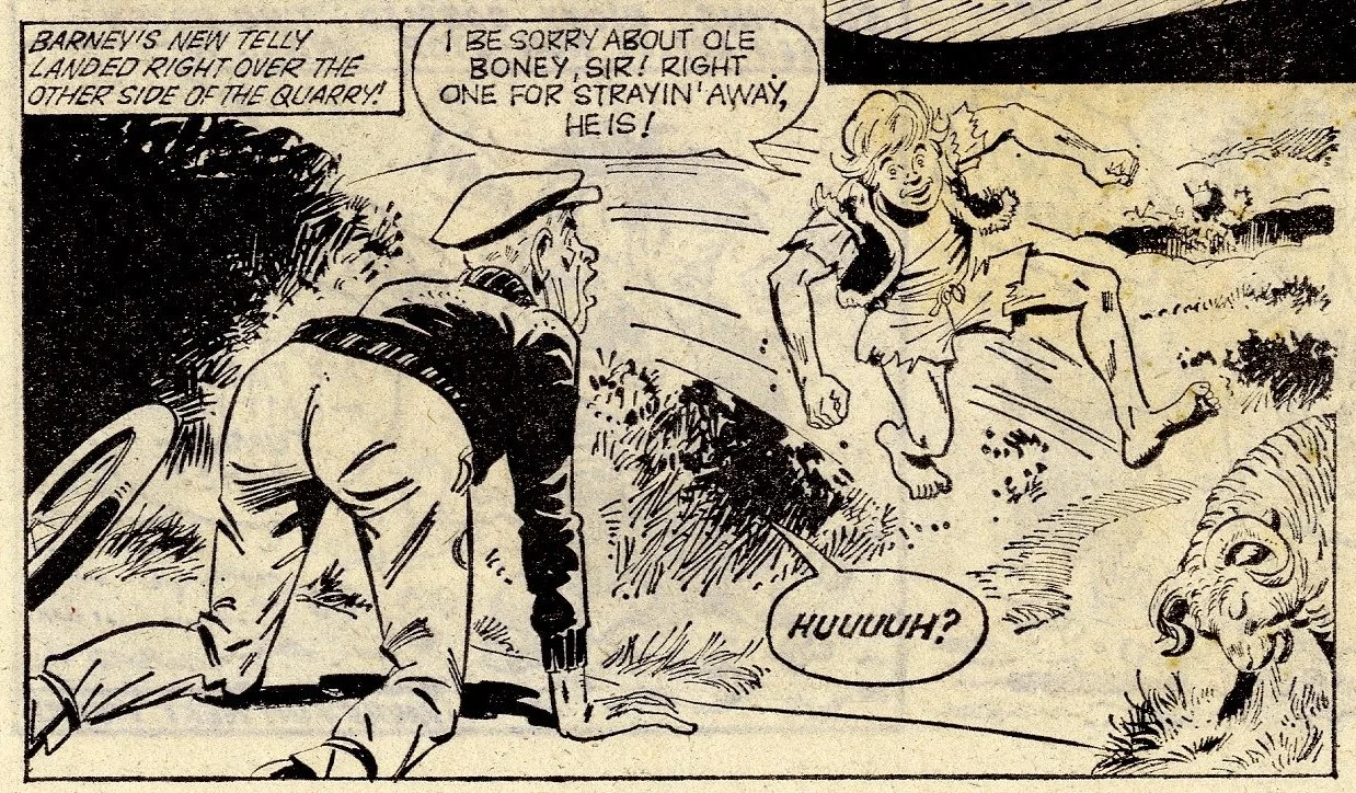 But now I’ve discovered Jet, the short-lived comic that ran for 22 issues between May and October 1971 before merging into Buster, and realised that Paddy McGinty and his goat were indeed a real thing. I think I can see where Pat’s coming from – even bearing in mind also that he was using this story as an example of the general state of things, rather than picking on it in particular, it’s hilariously dumb (my favourite moment being ‘Goat’ explaining his complex backstory: ‘I come from the Planet Ven! It’s too long and difficult to explain … But I shouldn’t be here! And now I don’t know how long I’ll be stranded here!’ Skizz!, this ain’t!). And yet … from the privileged viewpoint of 2016 it’s actually quite a fun strip to look back on. It’s bonkers. It’s outrageously silly. It’s very, very British (apart from the fact that it’s set in Ireland – but, you know, a not-at-all-sterotyped turnip-farming rendition of Ireland) and quirky, and ultimately lovable (or, at least, fascinating) because of that. Which is a pretty good way of describing all of the first issue of Jet.