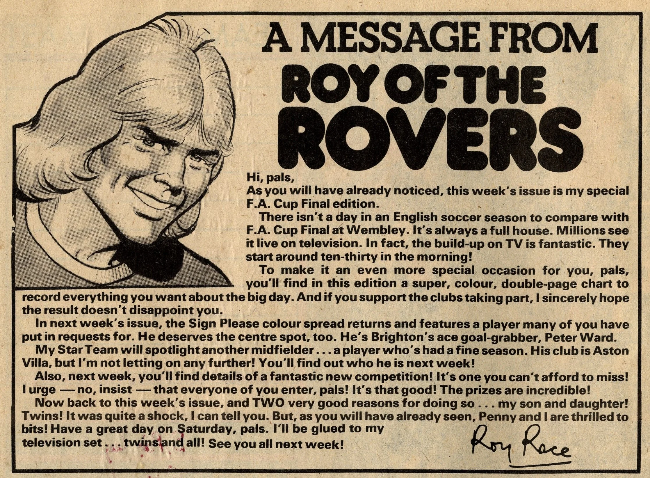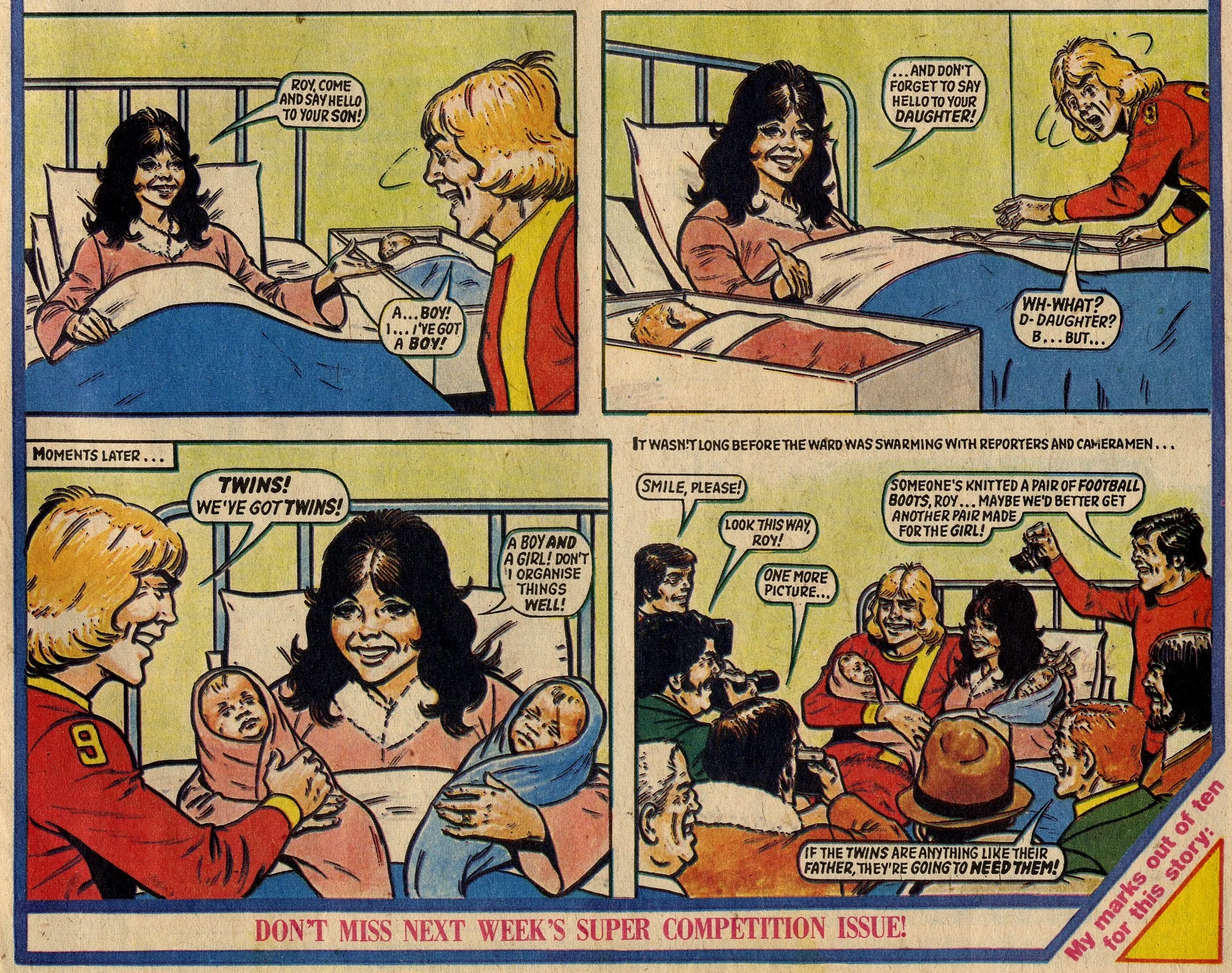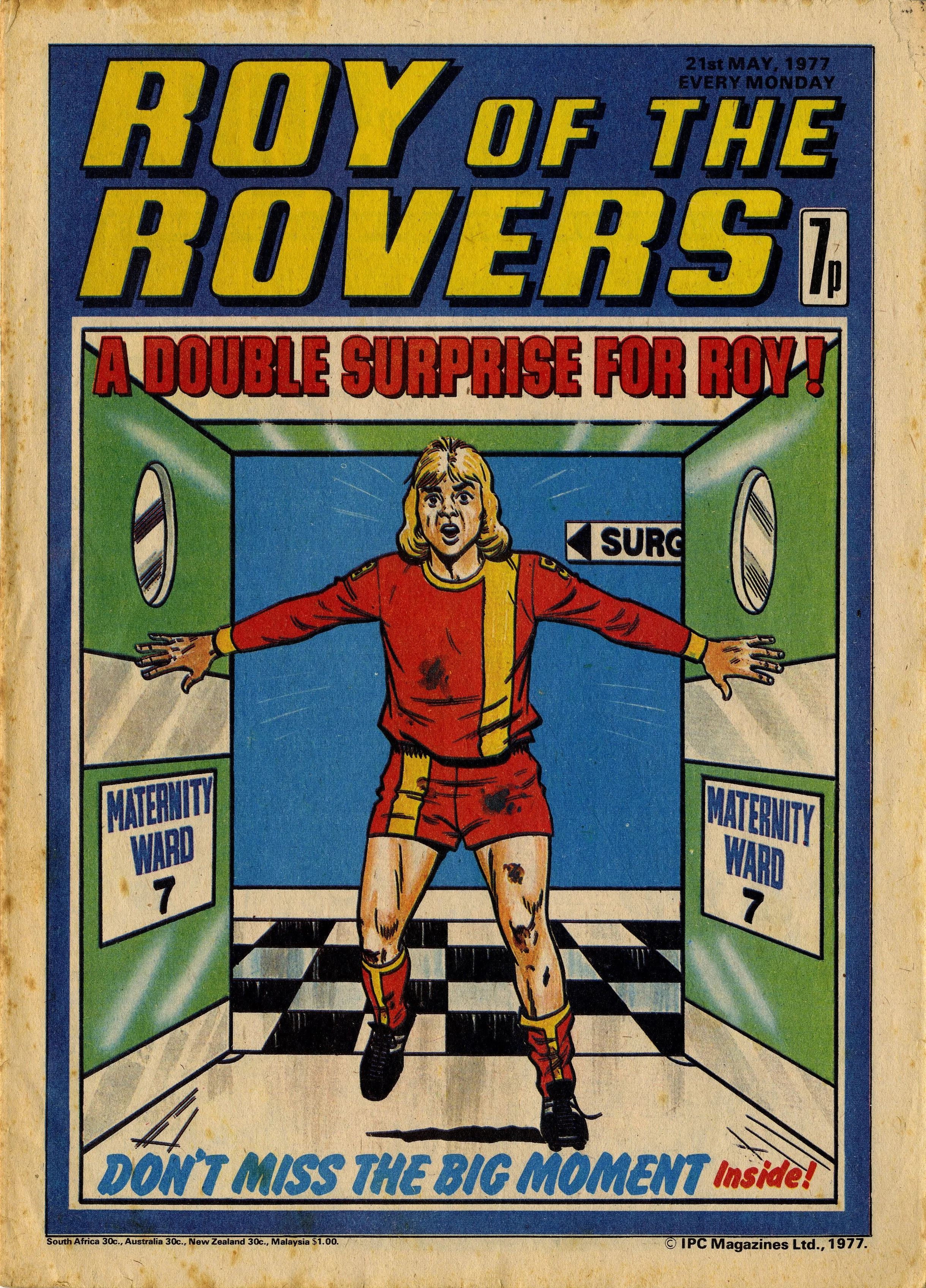 On this day, 21 May 1977 … Cup-final day congratulations go to Penny and Roy Race, on the birth of their first children: twins Melinda (presumably named after Melchester Rovers, the lucky girl) and Roy Junior (who would go on to succeed his father in Melchester’s number 9 shirt. In 1982 they would have another daughter, Diana (named after … well, I’m sure you can guess). This is another of those landmark issues of Roy of the Rovers. Despite the soapiness of the plot, one has to admire the consistently developing narrative of one of the all-time classic British comic strips. Roy lived and played to a ripe old age, but if one can ignore the unlikelihood of that, his universe, family and a range of supporting characters were built solidly and realistically around him over forty or so years (thanks in the main to the sterling work of writer Tom Tully).