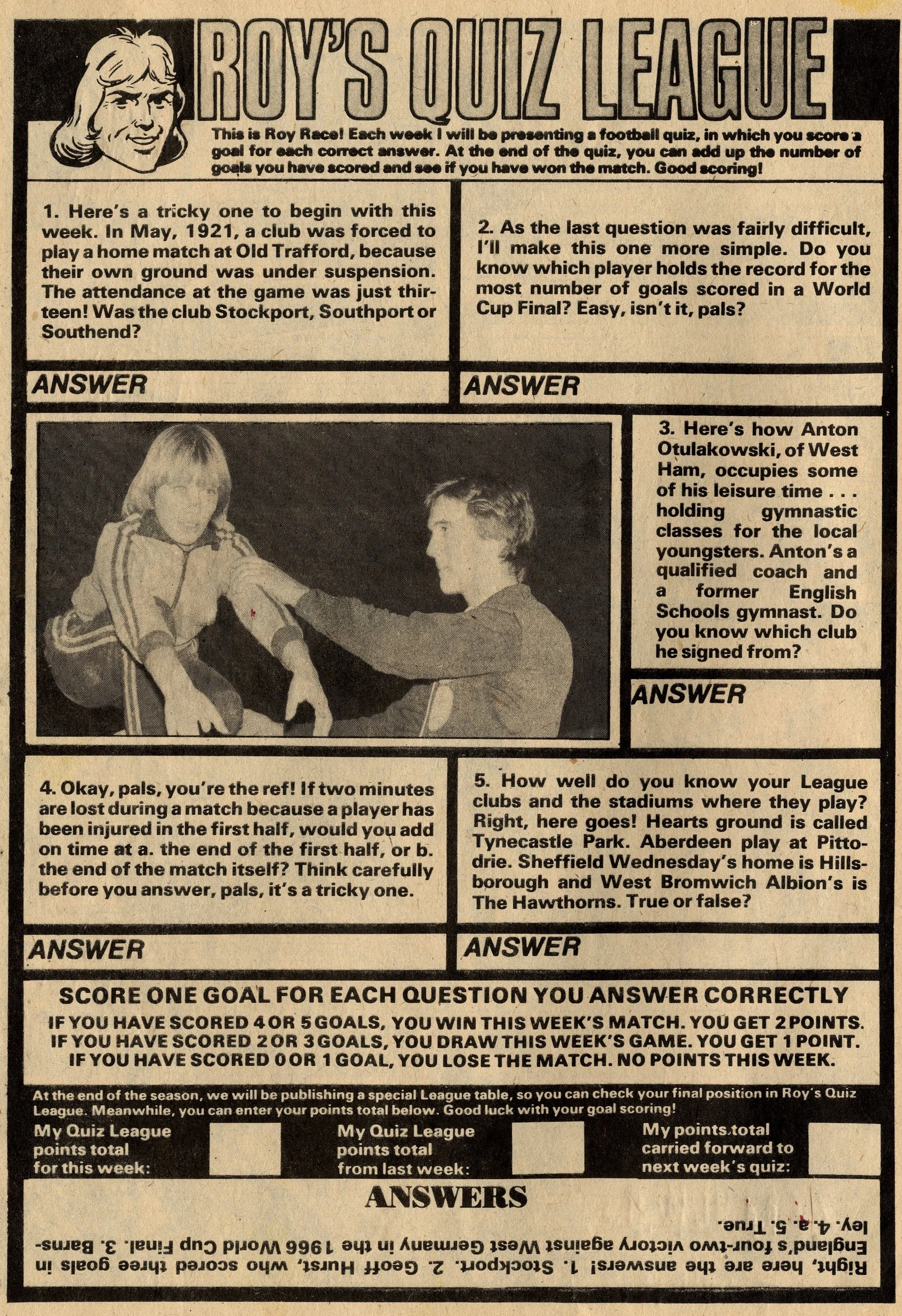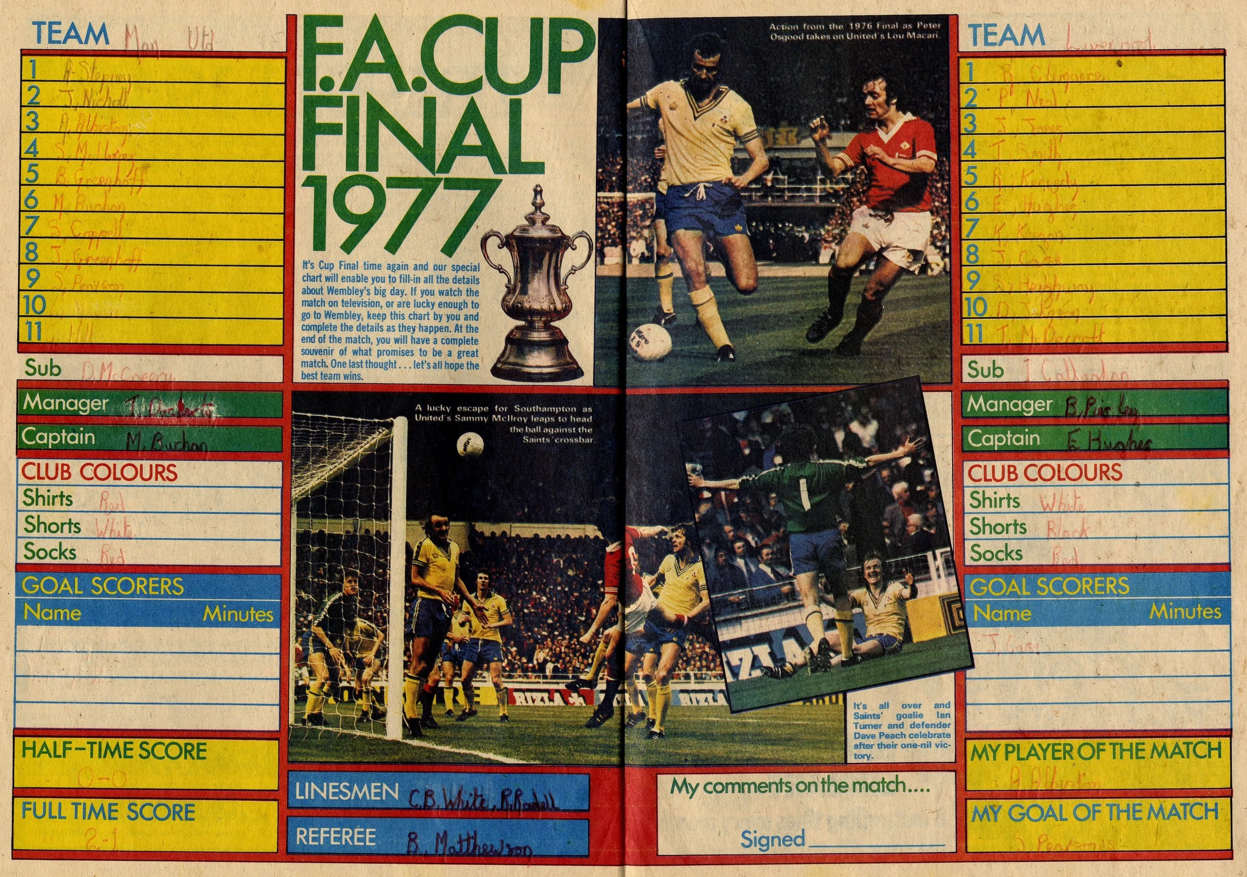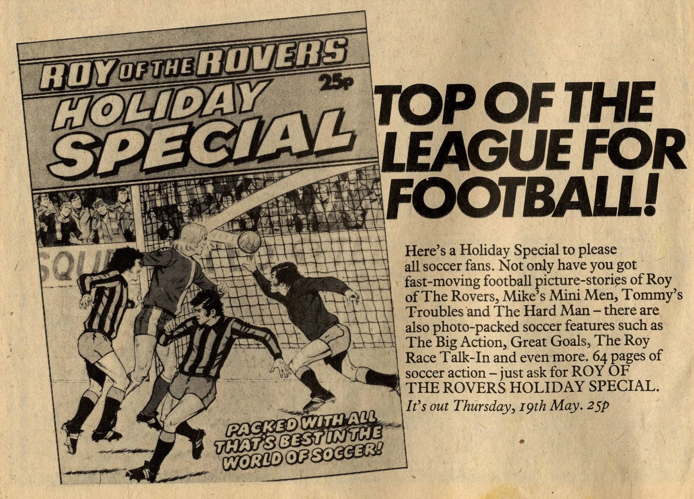 On this day, 21 May 1977 … Cup-final day congratulations go to Penny and Roy Race, on the birth of their first children: twins Melinda (presumably named after Melchester Rovers, the lucky girl) and Roy Junior (who would go on to succeed his father in Melchester’s number 9 shirt. In 1982 they would have another daughter, Diana (named after … well, I’m sure you can guess). This is another of those landmark issues of Roy of the Rovers. Despite the soapiness of the plot, one has to admire the consistently developing narrative of one of the all-time classic British comic strips. Roy lived and played to a ripe old age, but if one can ignore the unlikelihood of that, his universe, family and a range of supporting characters were built solidly and realistically around him over forty or so years (thanks in the main to the sterling work of writer Tom Tully).