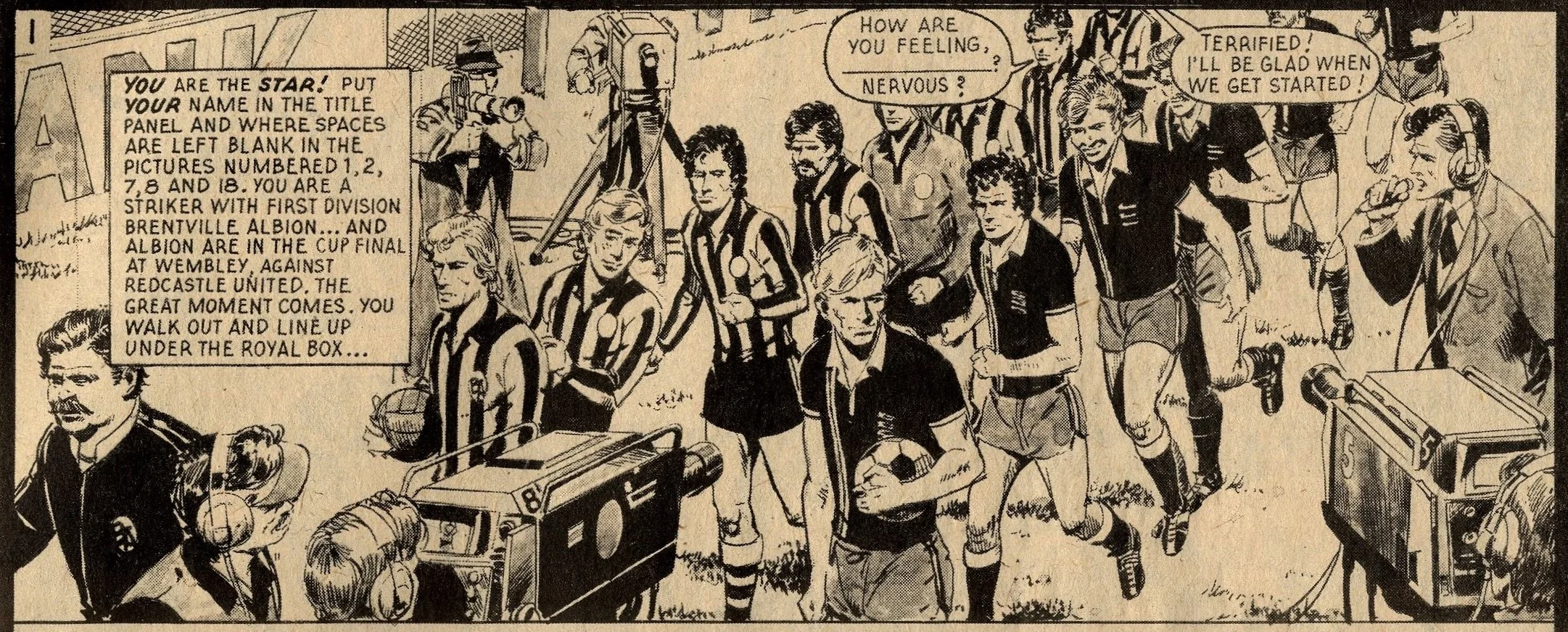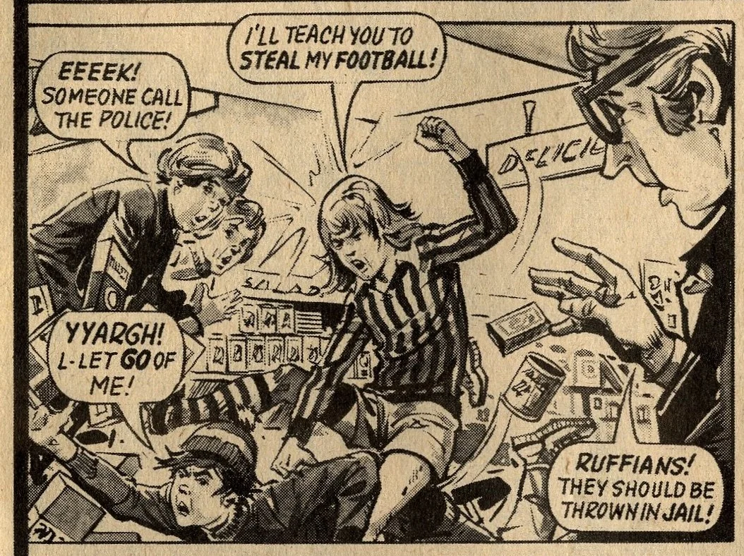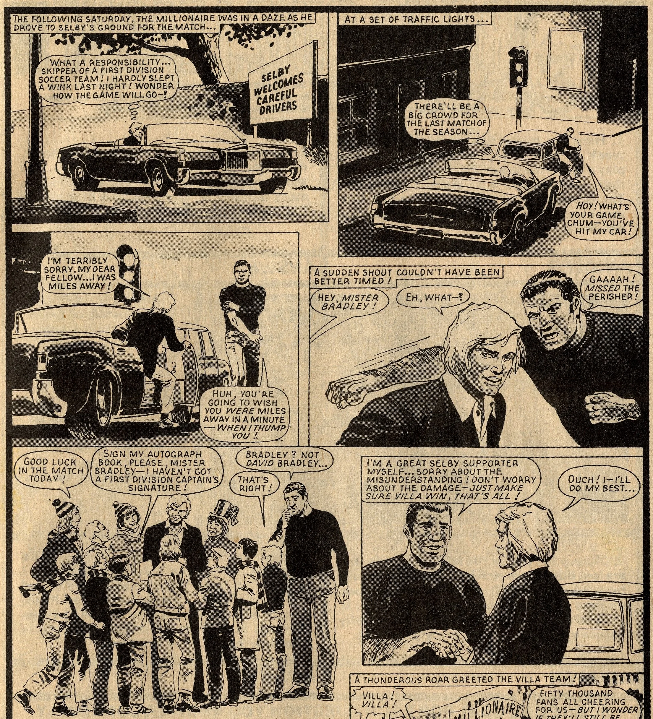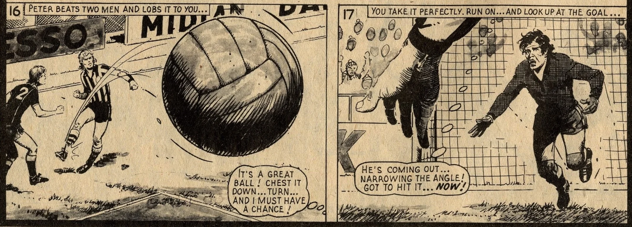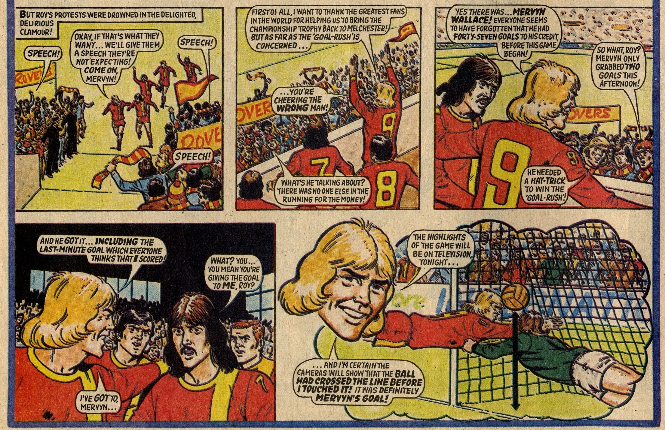This story is notable also for the culmination of the season-long ‘Goal Rush’ arc in this, Roy of the Rovers comic’s first year of publication. Roy has been chasing the £50,000 prize for becoming the first player to score 50 goals, but there’s a clever twist to the tale (see below). After the game Roy dashes straight over to Maternity Ward 7 at Melchester General Hospital, still fully kitted-up. This reminds me of the Basran terrorist tragedy of the late 1980s, in which most of the Melchester team were killed by a bomb – horrific, but slightly surreal in that they were all wearing full Rovers kit while travelling on the bus that was attacked. Roy did tend to perform an awful lot of his off-field activities in full strip, rather like an excitable ten-year-old who just can’t wait for Saturday’s big game.