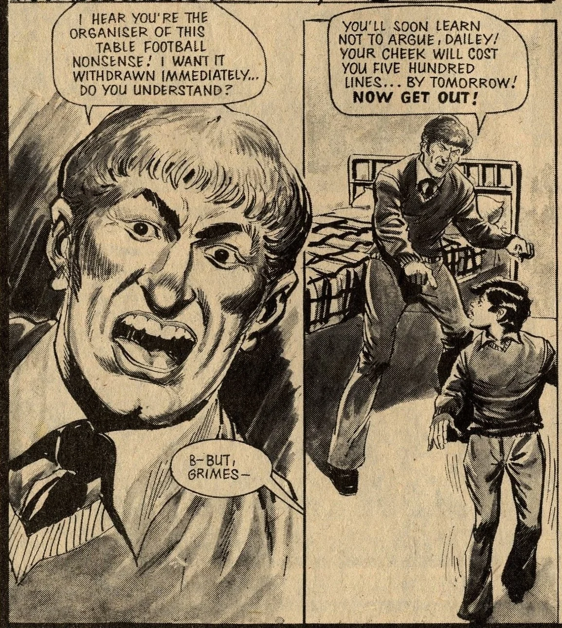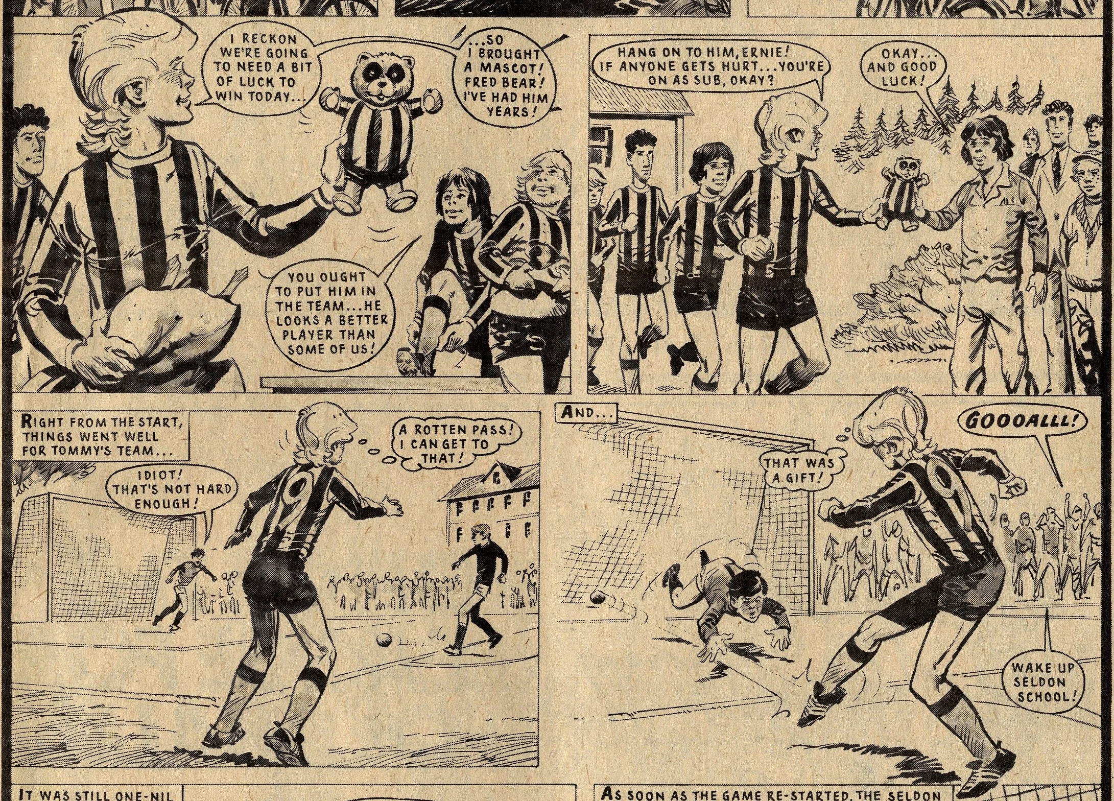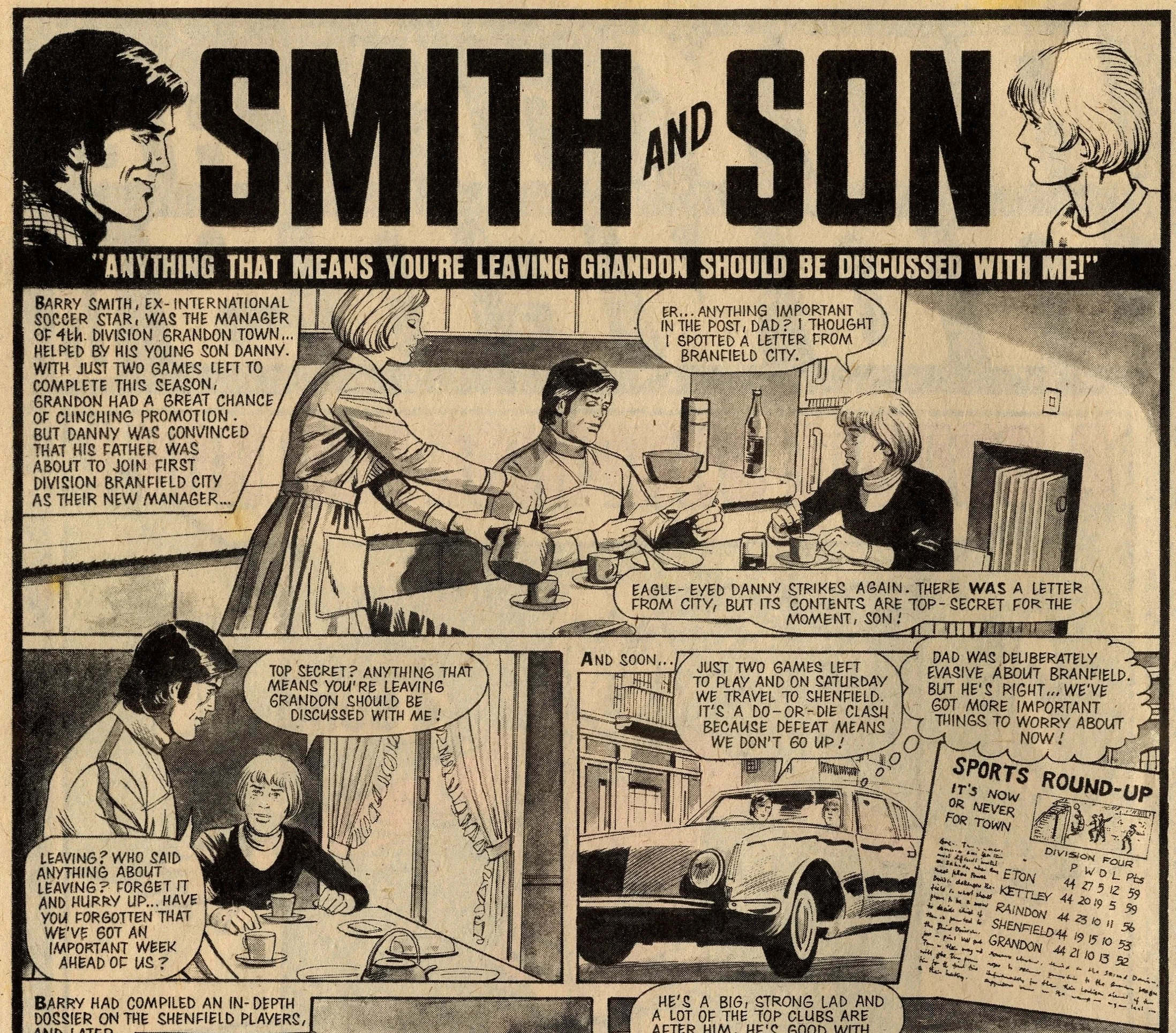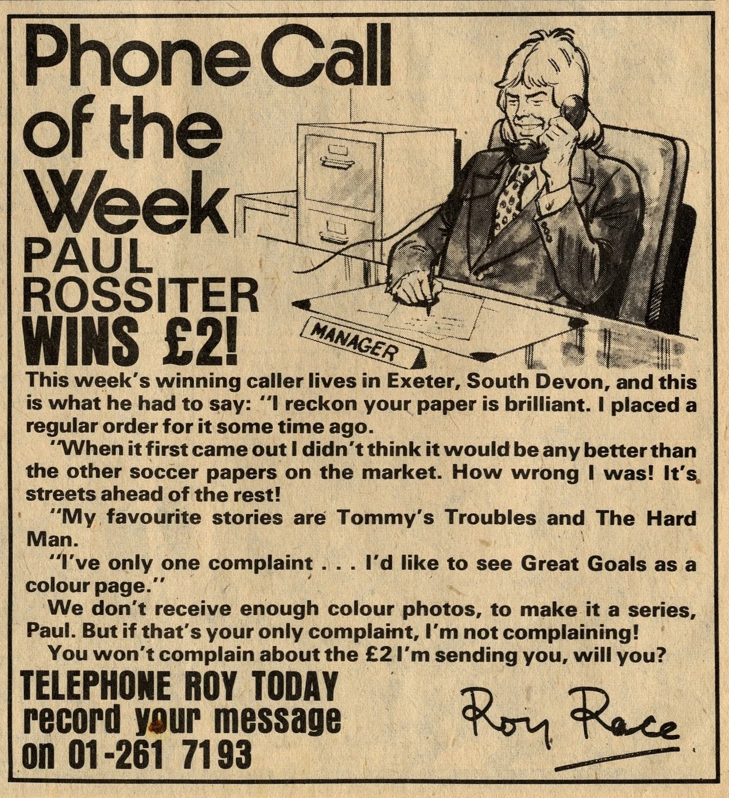 This story is notable also for the culmination of the season-long ‘Goal Rush’ arc in this, Roy of the Rovers comic’s first year of publication. Roy has been chasing the £50,000 prize for becoming the first player to score 50 goals, but there’s a clever twist to the tale (see below). After the game Roy dashes straight over to Maternity Ward 7 at Melchester General Hospital, still fully kitted-up. This reminds me of the Basran terrorist tragedy of the late 1980s, in which most of the Melchester team were killed by a bomb – horrific, but slightly surreal in that they were all wearing full Rovers kit while travelling on the bus that was attacked. Roy did tend to perform an awful lot of his off-field activities in full strip, rather like an excitable ten-year-old who just can’t wait for Saturday’s big game.