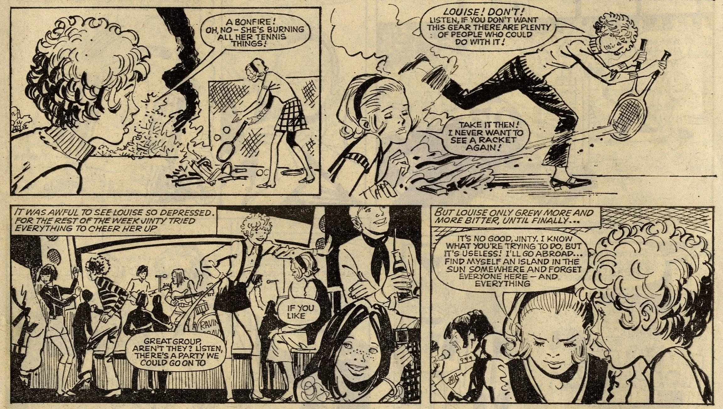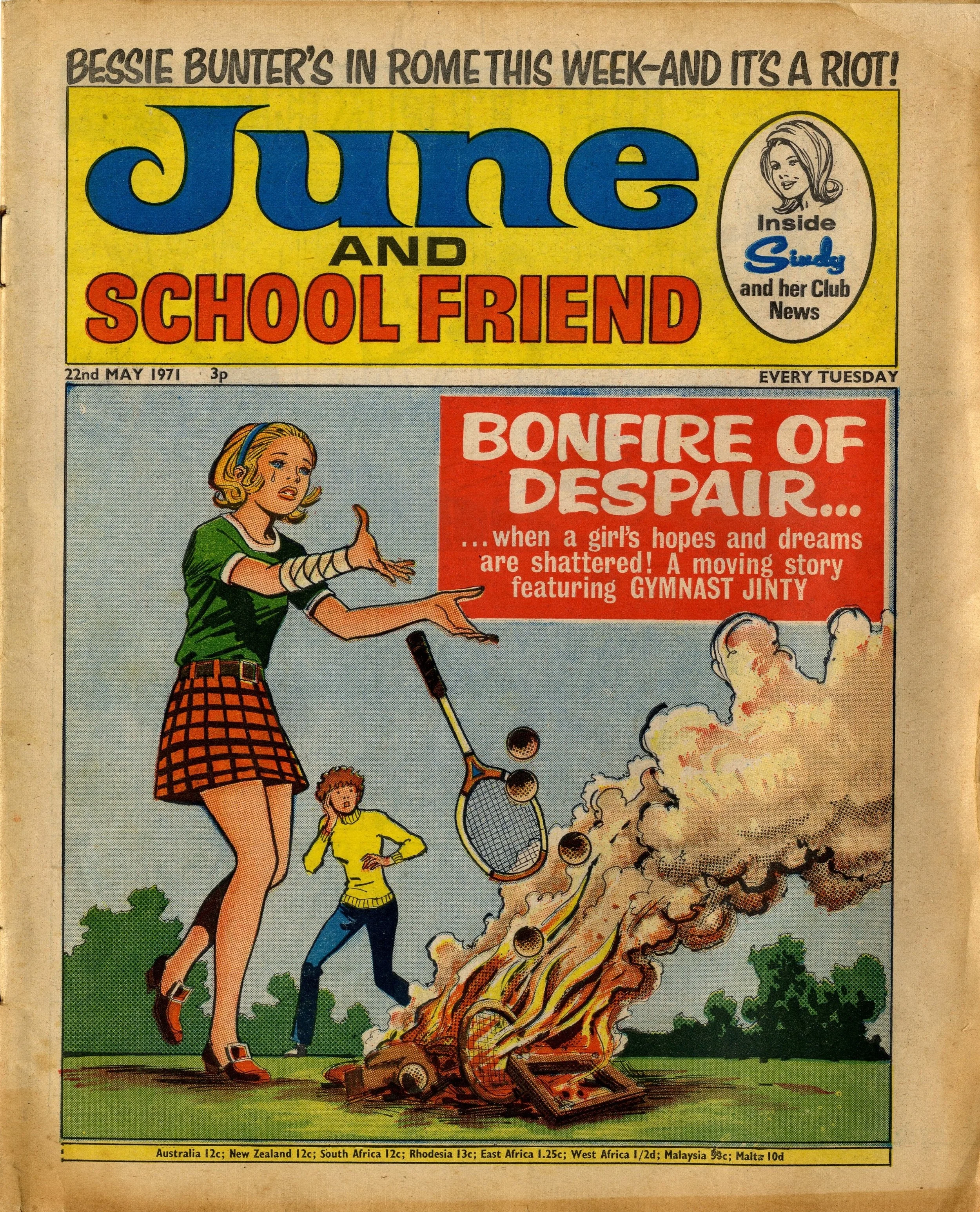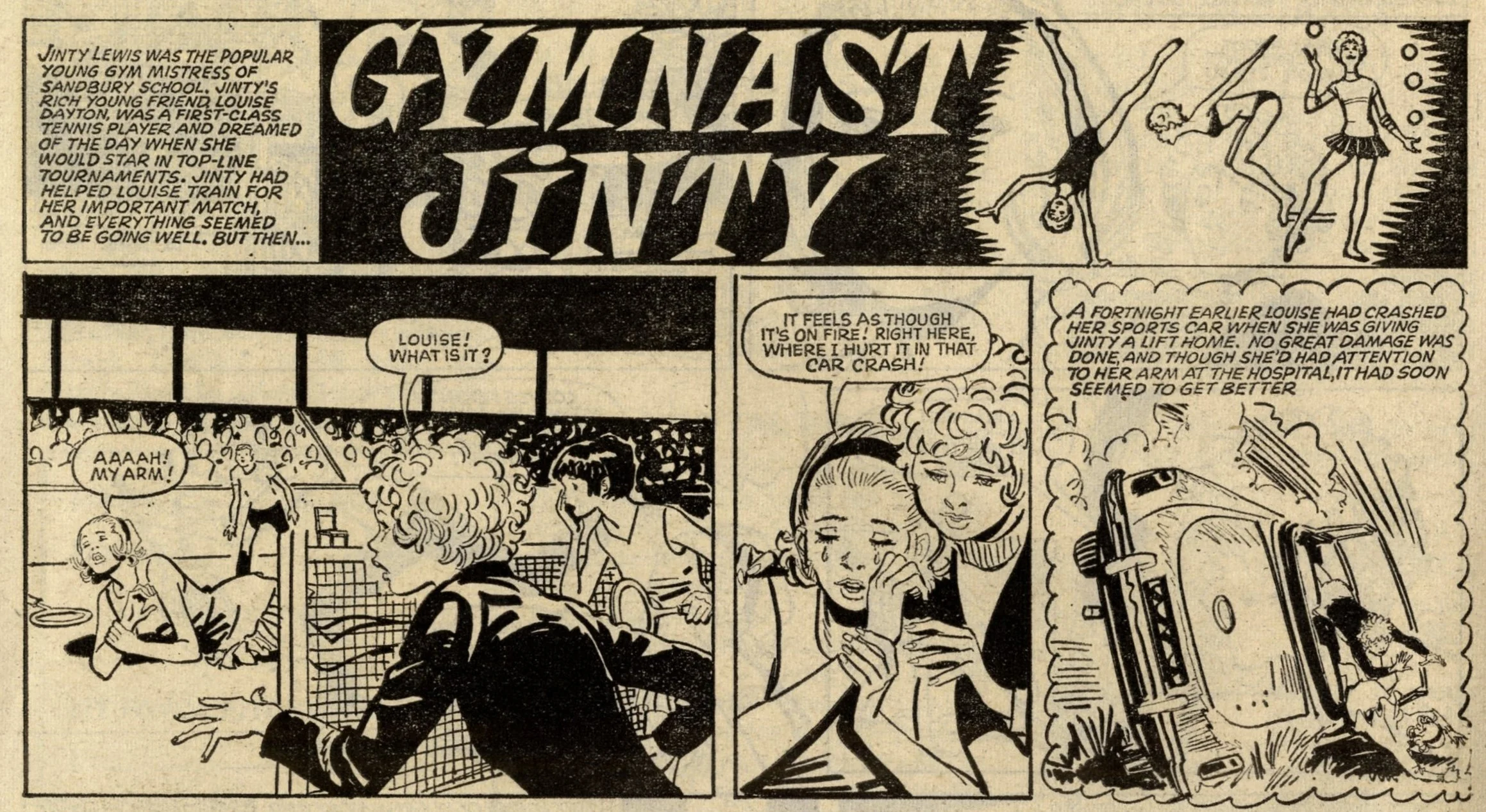 On this day, 22 May 1971 … I haven’t mention June on the blog before, and don’t know a huge amount about it. I’ve found it a tricky one to collect, not least because searching for ‘June’ on eBay, even within the category of British comics, tends to bring up huge search results containing every comic carrying the word June in its cover date! But I was pleased to pick up a few issues recently, including this one featuring a traumatic scene from Gymnast Jinty on the cover, by Jim Baikie. The distraught young woman is Louise Dayton, a friend of Jinty (pictured in the background) whose dreams of becoming a successful tennis player have been shattered by a wrist injury suffered in a car crash. Gymnast Jinty appears to be one of the comic’s lead stories, and I wondered whether the lead character, a school gym teacher, had any connection to Jinty the comic (especially as June ended in June 1974, only a month after Jinty launched). Jenni Scott of the Jinty Resources blog tells me that there was no direct connection but helpfully points out that Jinty’s first editor, Mavis Miller, had been editor of June so it’s possible there was some inspiration in the naming of the new comic.