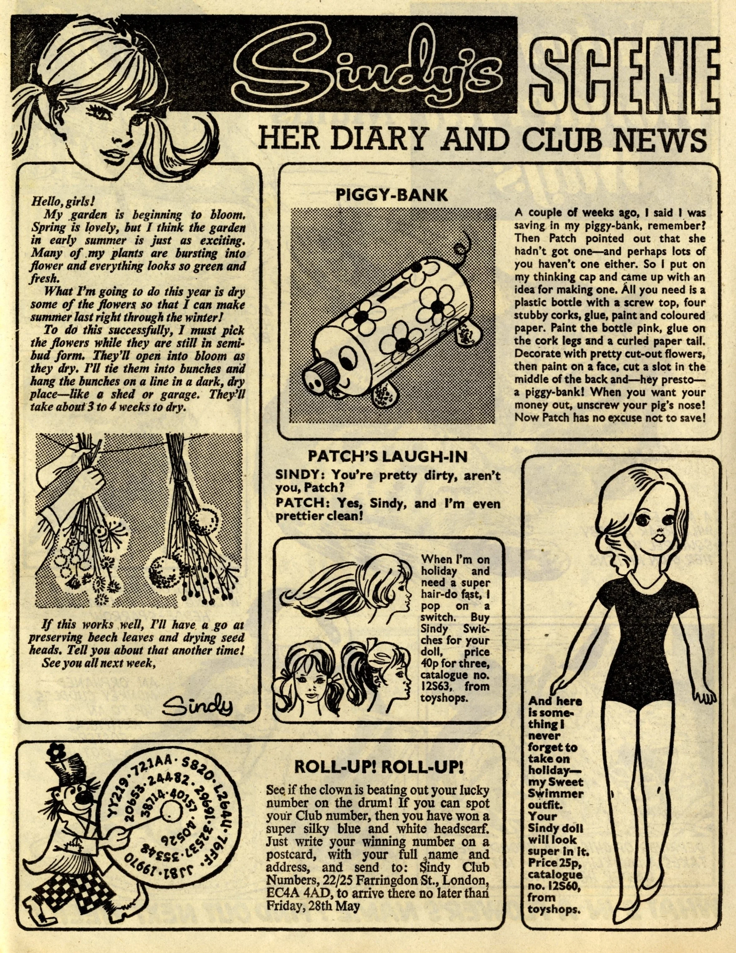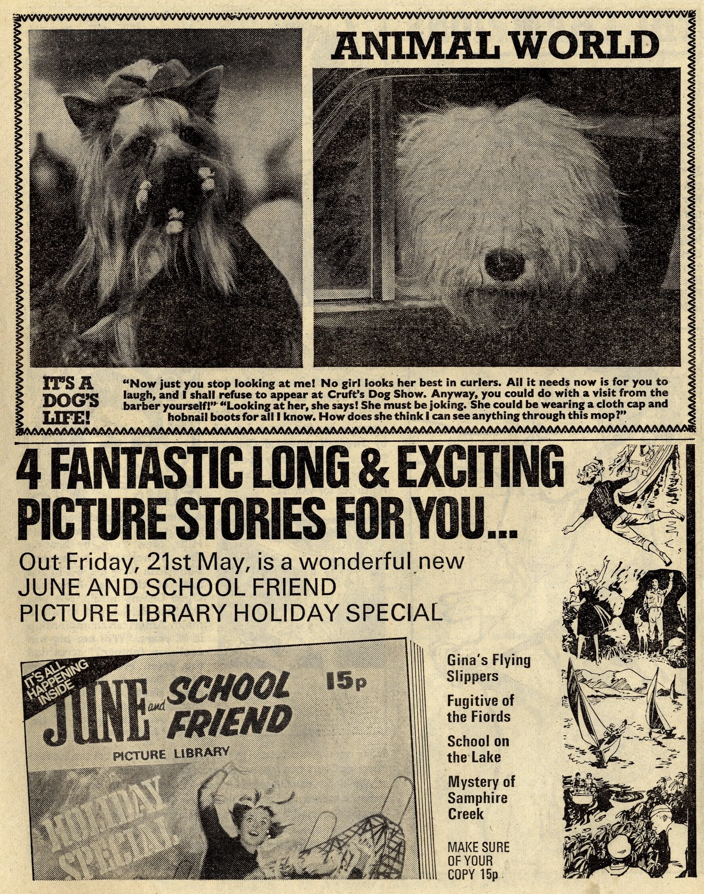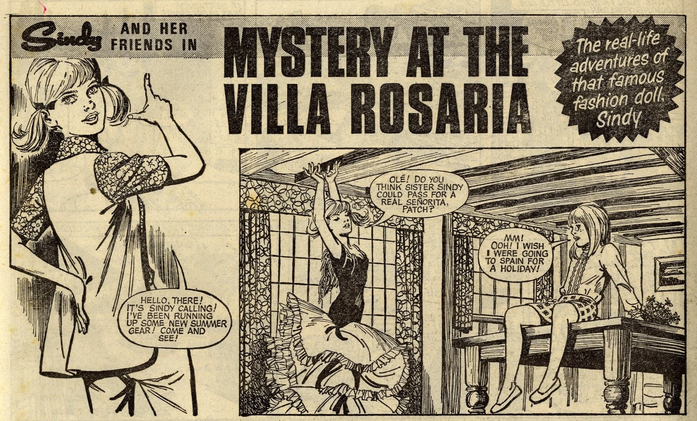 June really had its heyday in the 1960s, running for thirteen years after launching in March 1961, incorporating the classic School Friend in 1965. And I would say there’s a prevalent sixties look to the design and artwork of this issue from 1971. Not being a designer I can’t quite identify what it is, but something to do with the linework, not to mention the fashions and hair, seems to be of that decade. There are stories of the same vibe that we see in later Jintys and Tammys – as well as the sport-themed Gymnast Jinty, there is Wild Girl of the Hills (about a gypsy girl who lives wild in the Scottish Highlands, The Grays Fight Back! (about a family pulling together after the dad is injured in an accident and the mum is hospitalised through overwork), Call Me Cupid! (about two friends who open a marriage bureau), and ‘Katy’s Kite’ (a one-off in a series of tales told by an introductory narrator – like Misty or Jinty’s Gypsy Rose, although The Storyteller is in this case a man). Mixed in with these are stories that I would guess are aimed at a slightly younger reader – Oh, Tinker!, and Lucky’s Living Doll. The latter strip probably sat nicely with the manufacturers of Sindy dolls who provided patronage of the comic in return for the character of Sindy having her own serial, Sindy and her Friends in Mystery at the Villa Rosaria, and ‘Sindy Club’ news page.