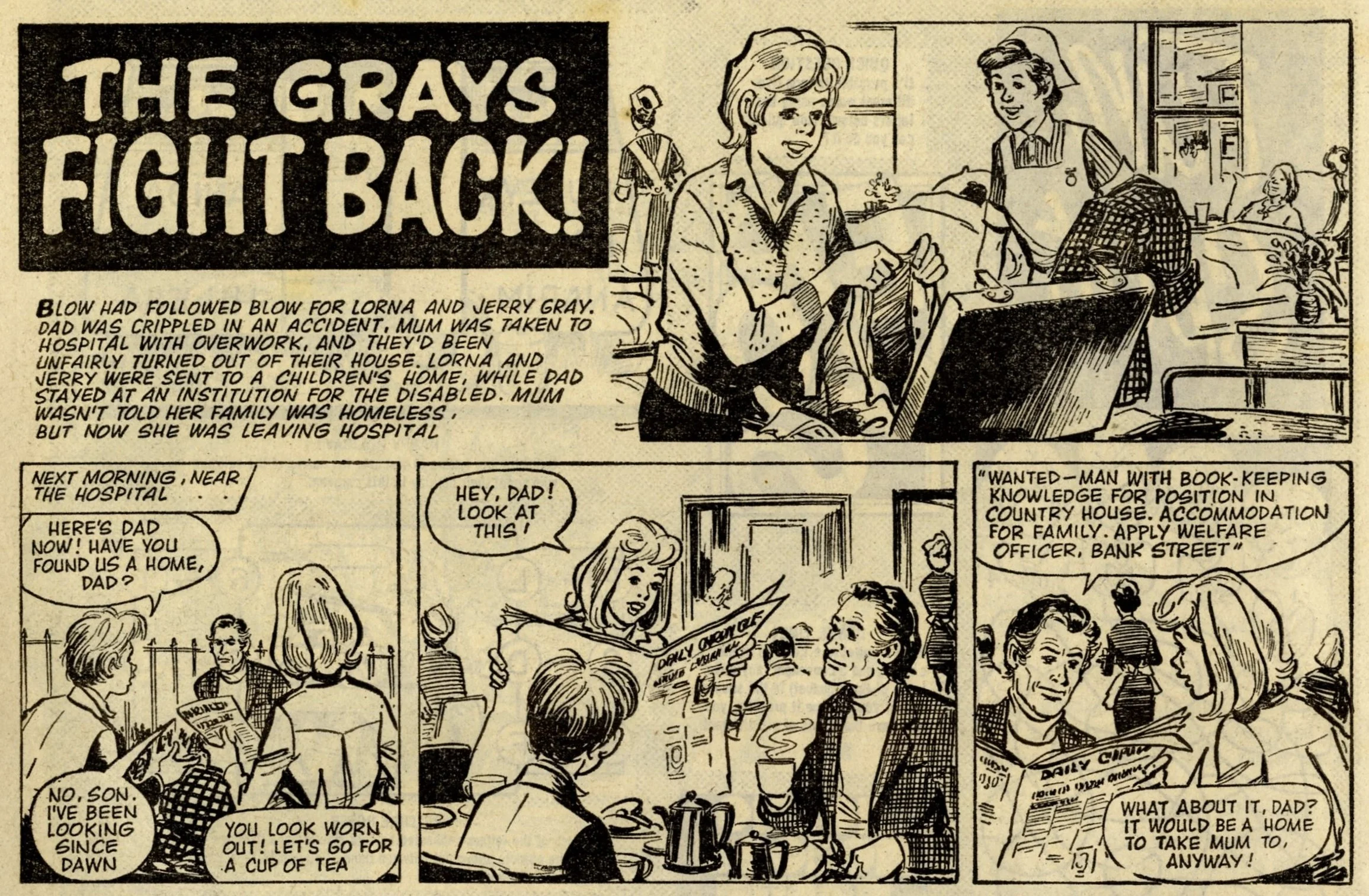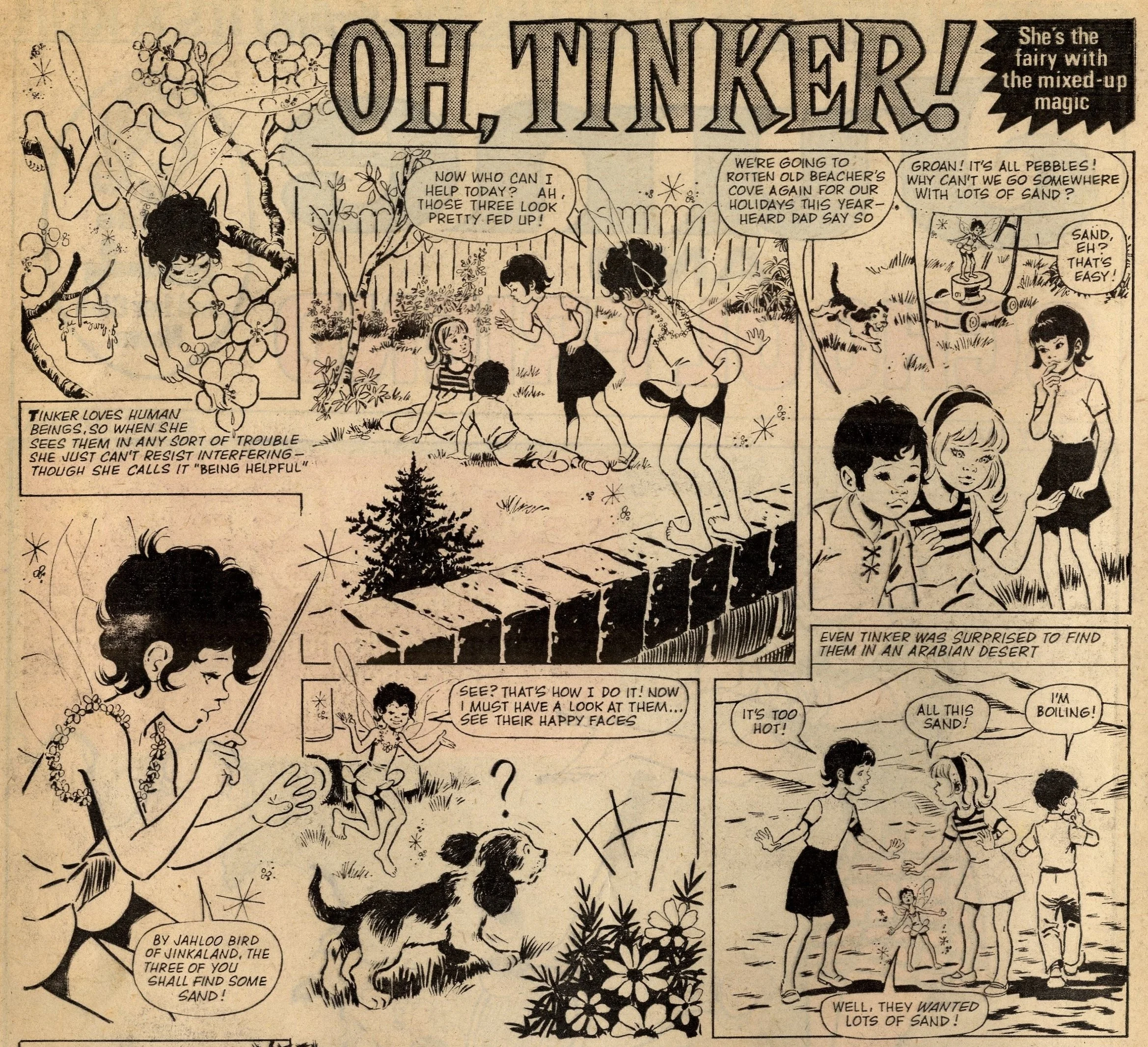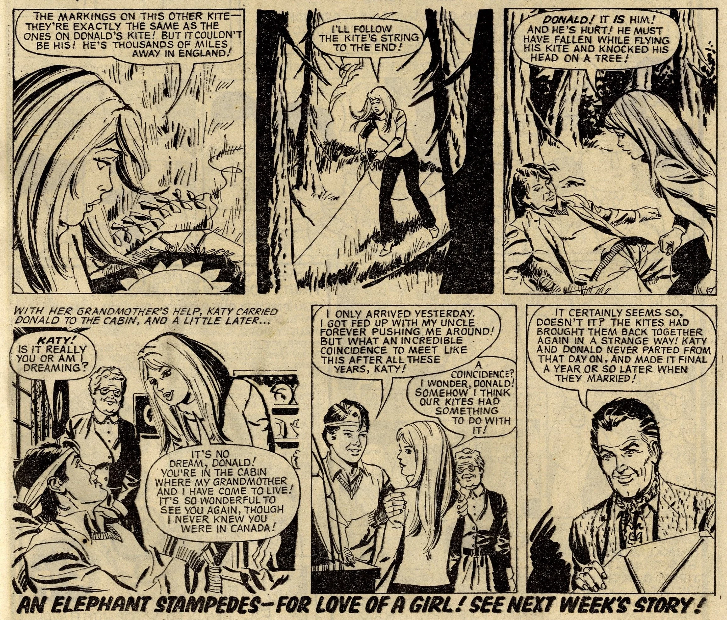 June really had its heyday in the 1960s, running for thirteen years after launching in March 1961, incorporating the classic School Friend in 1965. And I would say there’s a prevalent sixties look to the design and artwork of this issue from 1971. Not being a designer I can’t quite identify what it is, but something to do with the linework, not to mention the fashions and hair, seems to be of that decade. There are stories of the same vibe that we see in later Jintys and Tammys – as well as the sport-themed Gymnast Jinty, there is Wild Girl of the Hills (about a gypsy girl who lives wild in the Scottish Highlands, The Grays Fight Back! (about a family pulling together after the dad is injured in an accident and the mum is hospitalised through overwork), Call Me Cupid! (about two friends who open a marriage bureau), and ‘Katy’s Kite’ (a one-off in a series of tales told by an introductory narrator – like Misty or Jinty’s Gypsy Rose, although The Storyteller is in this case a man). Mixed in with these are stories that I would guess are aimed at a slightly younger reader – Oh, Tinker!, and Lucky’s Living Doll. The latter strip probably sat nicely with the manufacturers of Sindy dolls who provided patronage of the comic in return for the character of Sindy having her own serial, Sindy and her Friends in Mystery at the Villa Rosaria, and ‘Sindy Club’ news page.