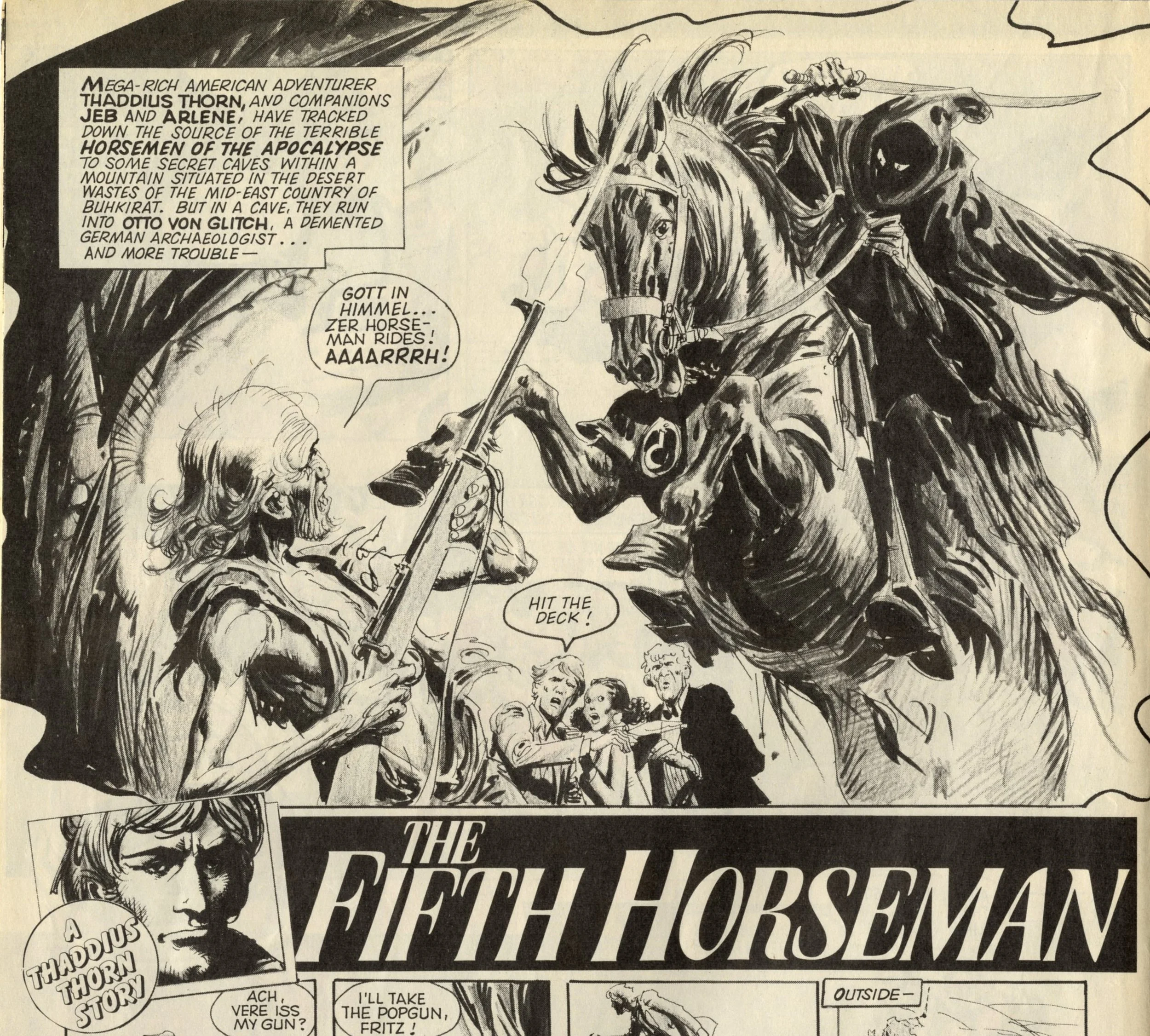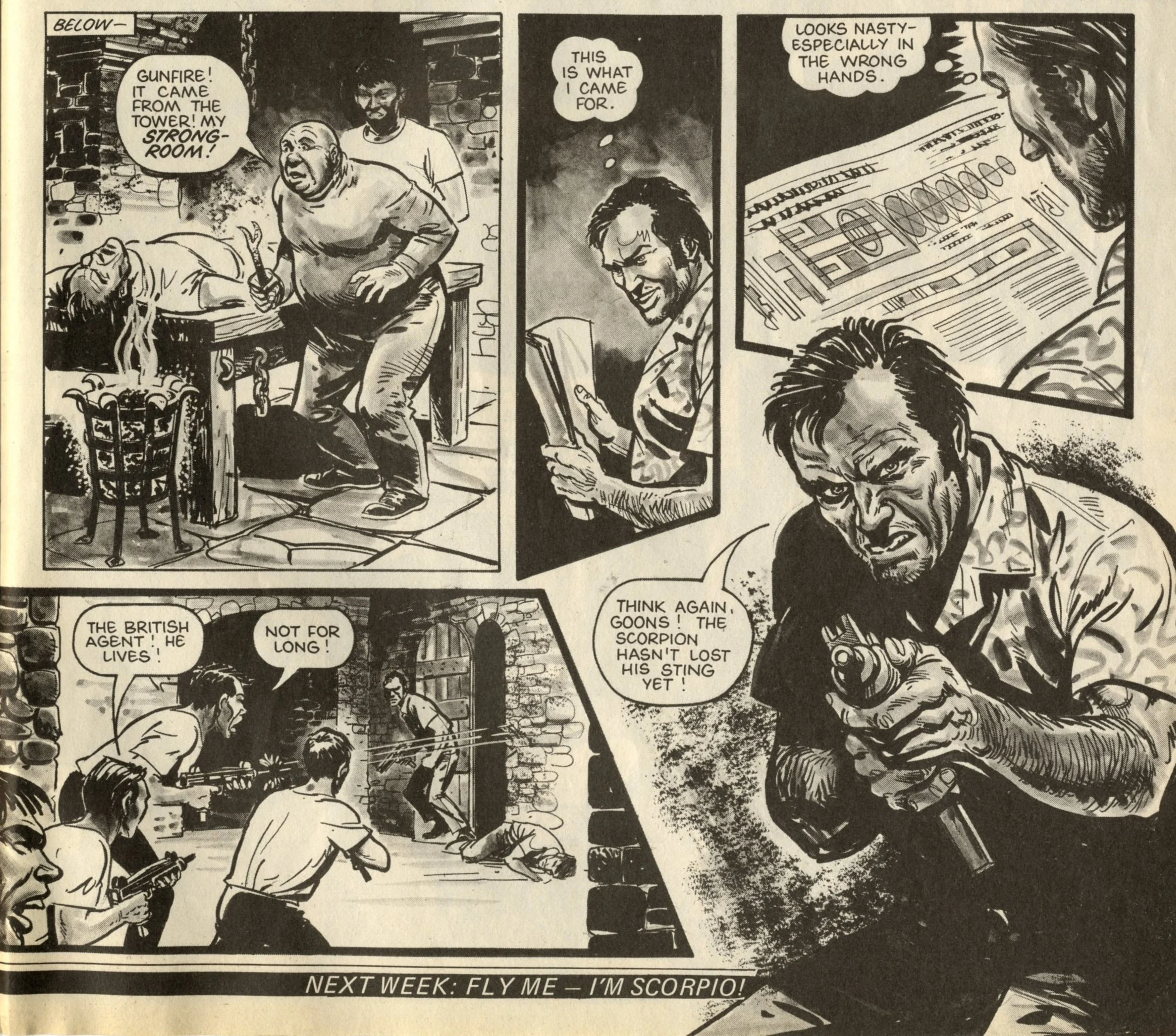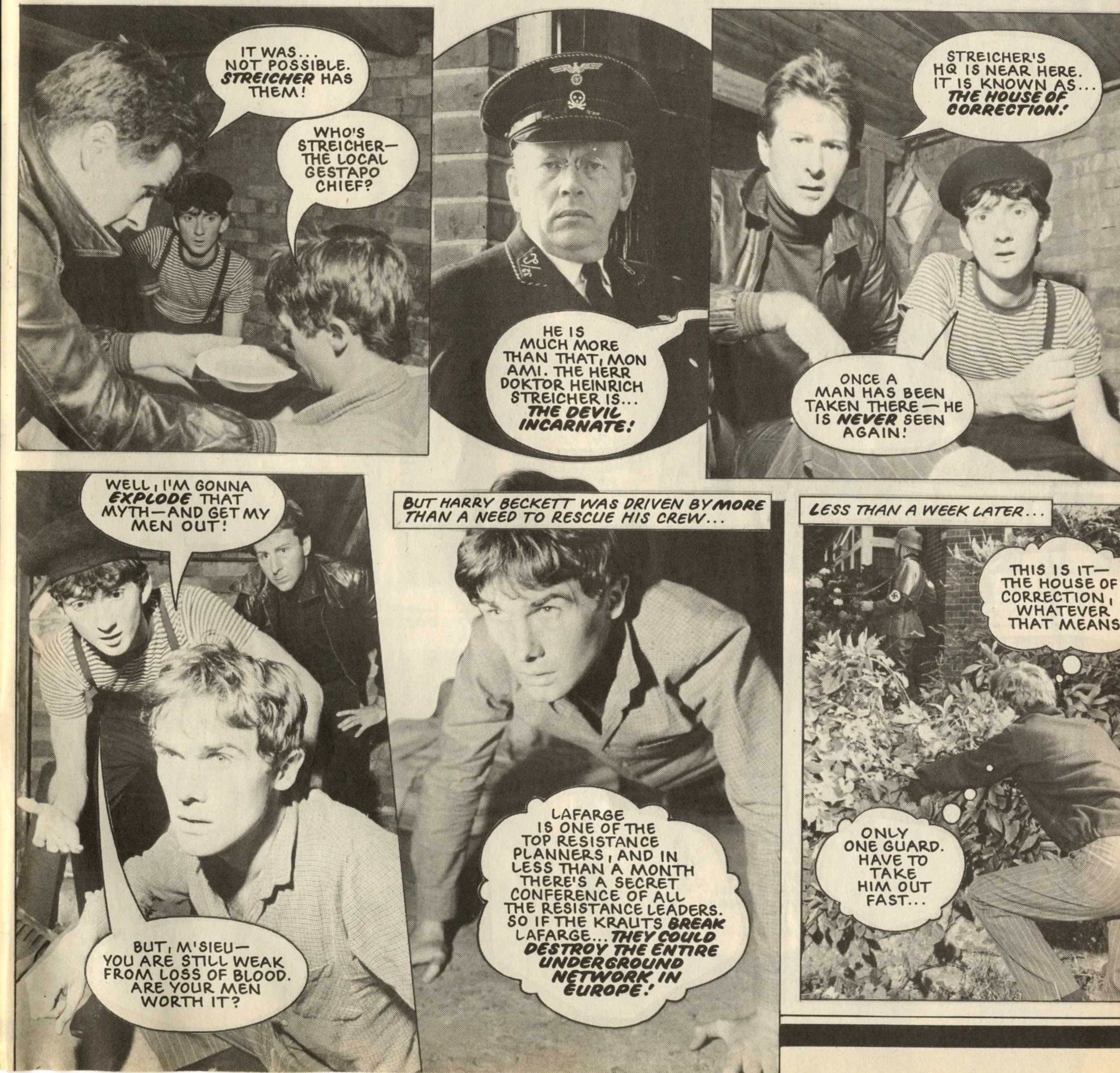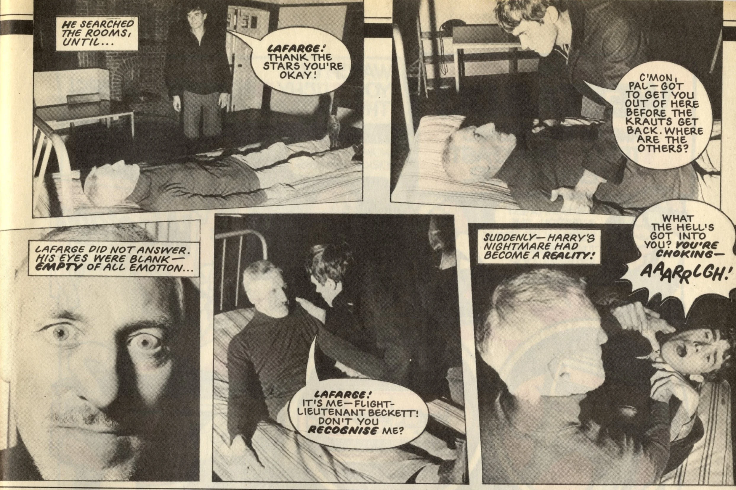 If hotting up is what readers were after, then the title of Eagle’s brand new serial House of Correction held some promise. WWII Flight-Lieutenant Hary Beckett was the star, waking in occupied France after the crash of his bomber and infiltrating the mysterious Nazi House of Correction. He probably wasn’t expecting to discover one of the Chuckle Brothers inside. There’s further photo-camp in regulars Doomlord (evil brother Zom arrives on Earth), and Manix (chasing agents of S.M.O.G. – ‘a sinister organisation with insane objectives’), but by the summer of 1983 there was a higher ratio of non-photographic stories in Eagle, with Alan Hebden and Jose Ortiz’s The Fifth Horseman (good), Fred Baker and Rex Archer’s Crowe Street Comp. (fun) and Keith Law and Mike Dorey’s Scorpio (snorepio) making up the numbers.