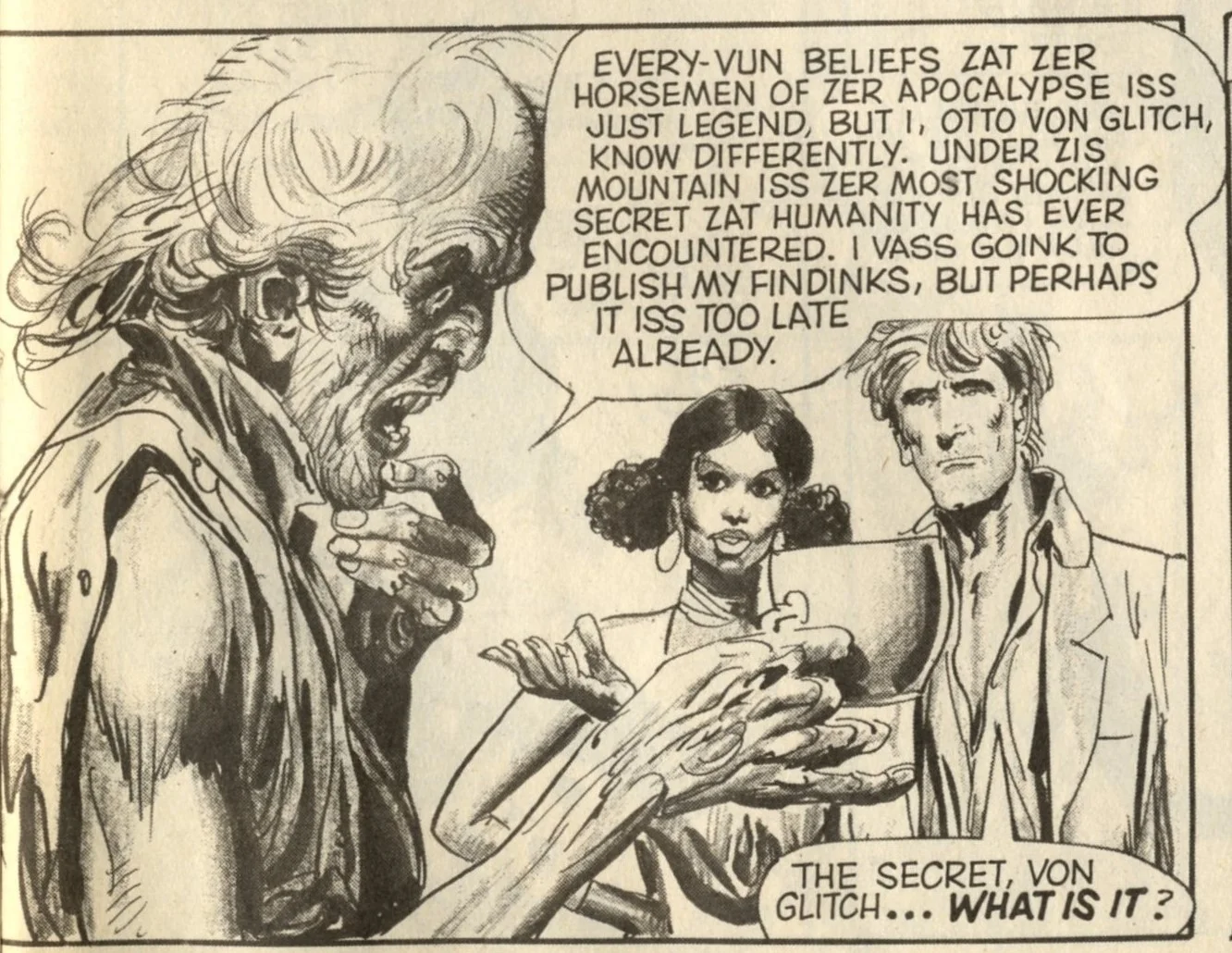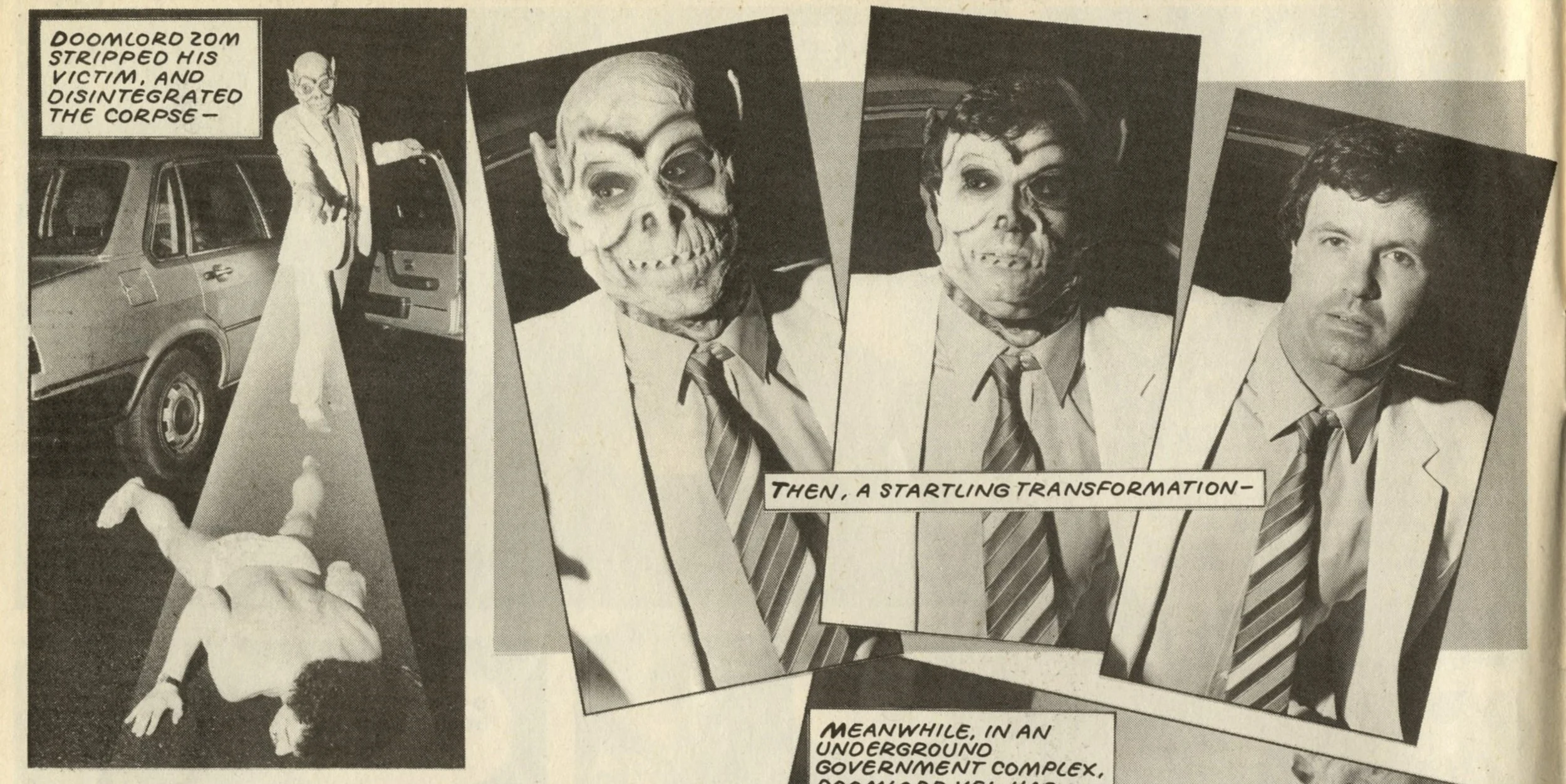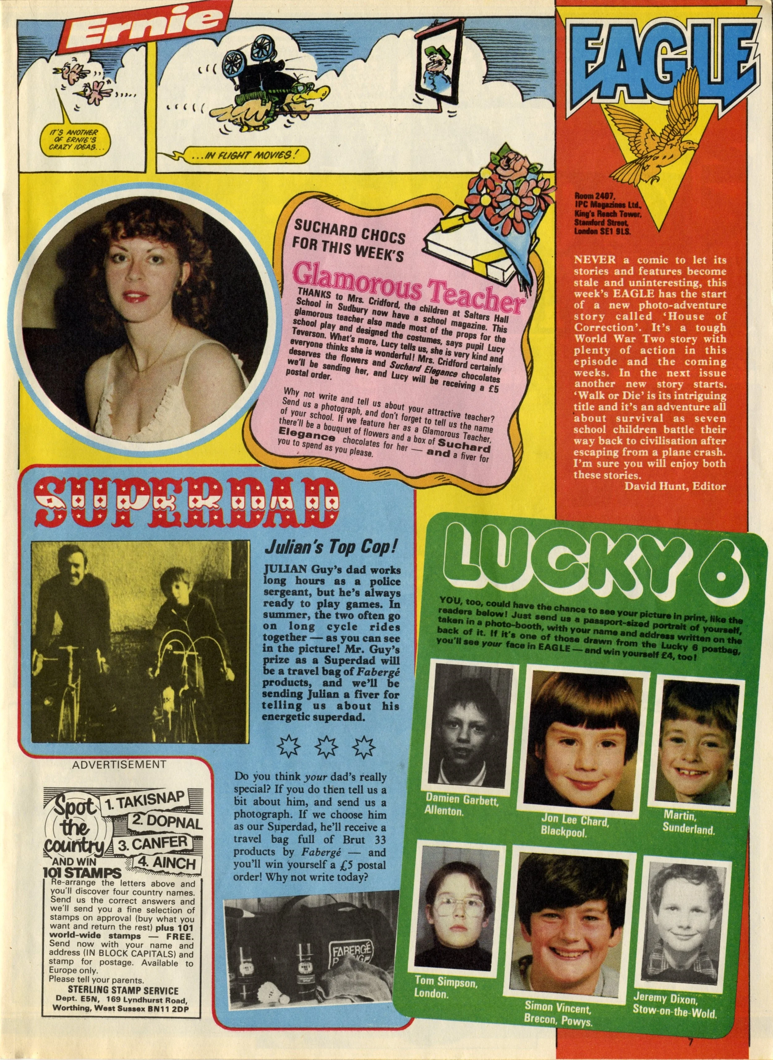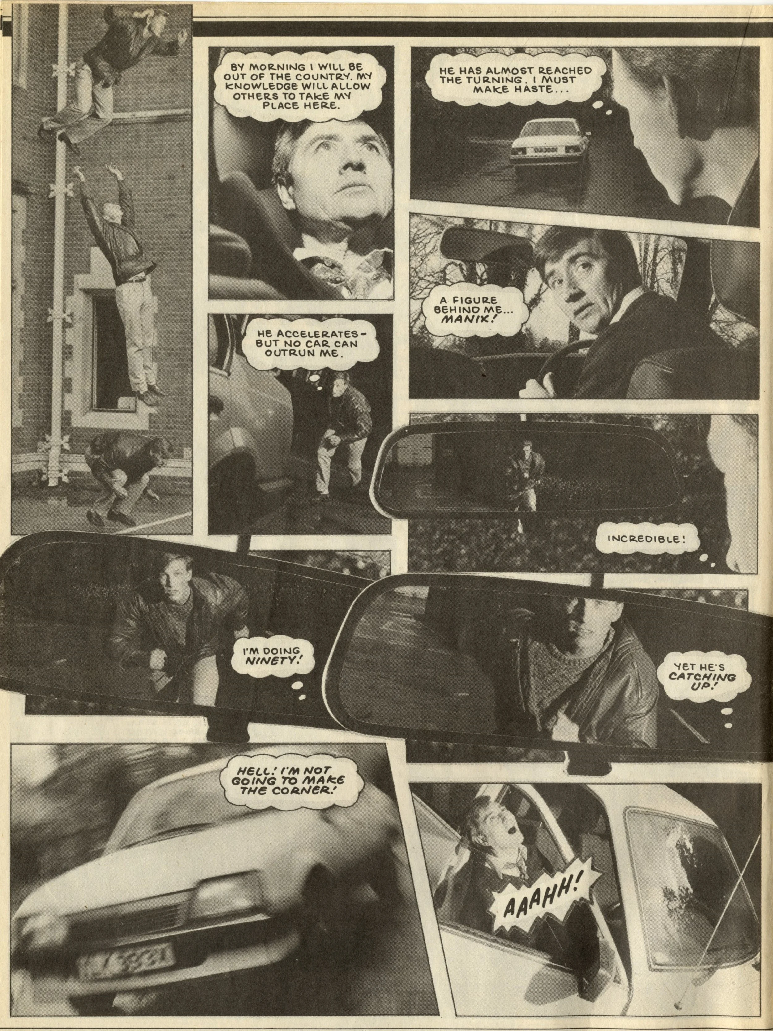 If hotting up is what readers were after, then the title of Eagle’s brand new serial House of Correction held some promise. WWII Flight-Lieutenant Hary Beckett was the star, waking in occupied France after the crash of his bomber and infiltrating the mysterious Nazi House of Correction. He probably wasn’t expecting to discover one of the Chuckle Brothers inside. There’s further photo-camp in regulars Doomlord (evil brother Zom arrives on Earth), and Manix (chasing agents of S.M.O.G. – ‘a sinister organisation with insane objectives’), but by the summer of 1983 there was a higher ratio of non-photographic stories in Eagle, with Alan Hebden and Jose Ortiz’s The Fifth Horseman (good), Fred Baker and Rex Archer’s Crowe Street Comp. (fun) and Keith Law and Mike Dorey’s Scorpio (snorepio) making up the numbers.