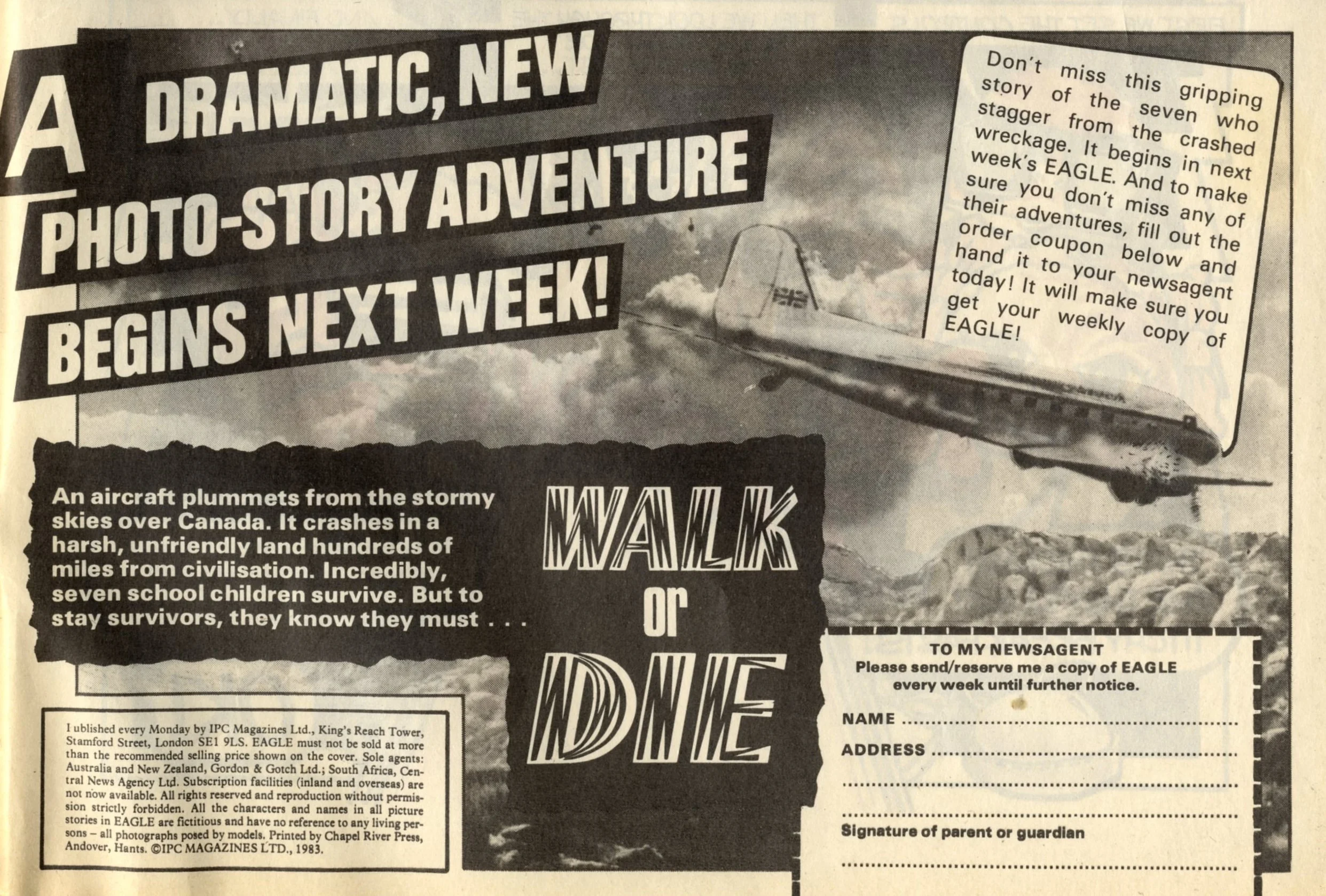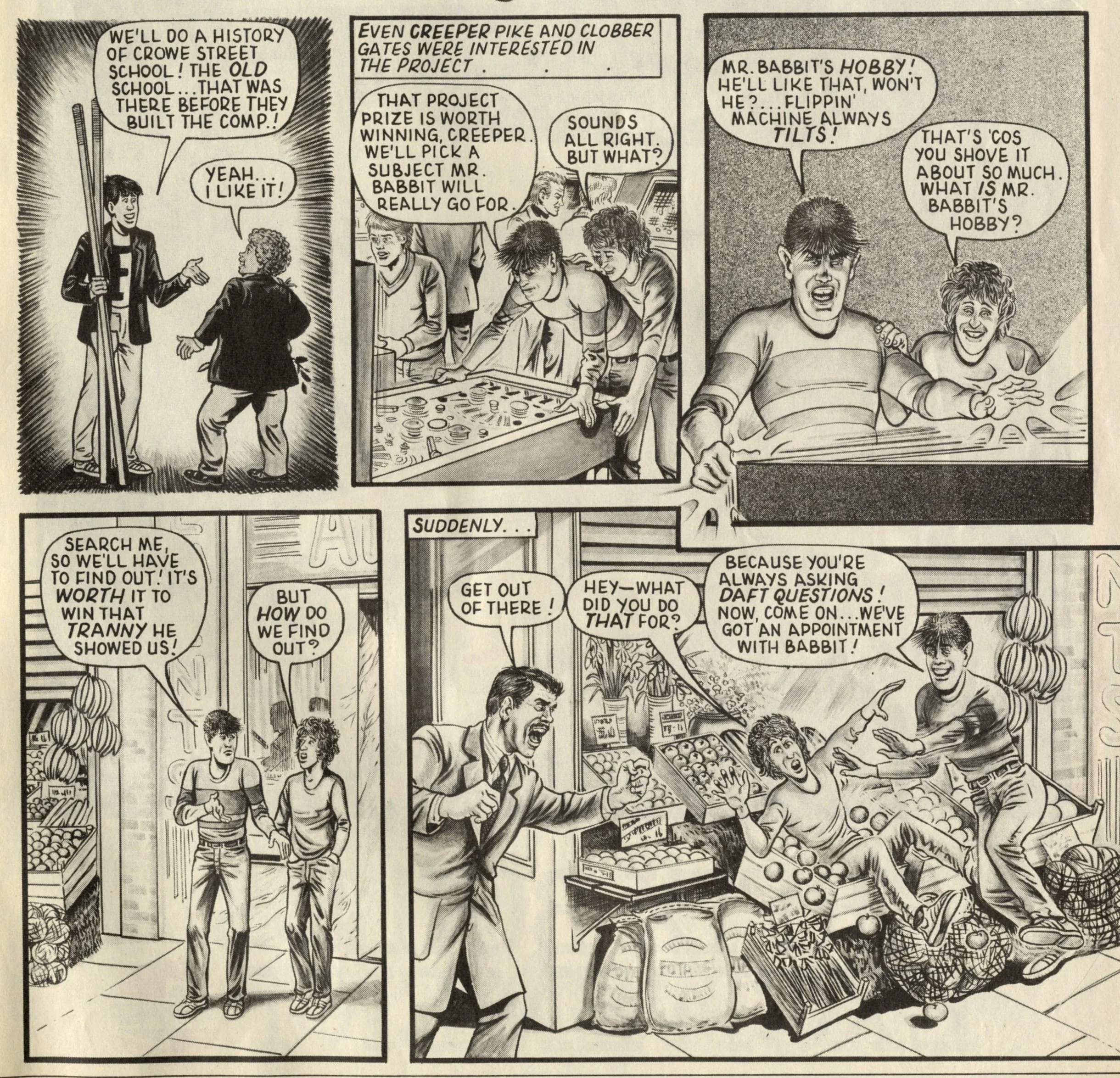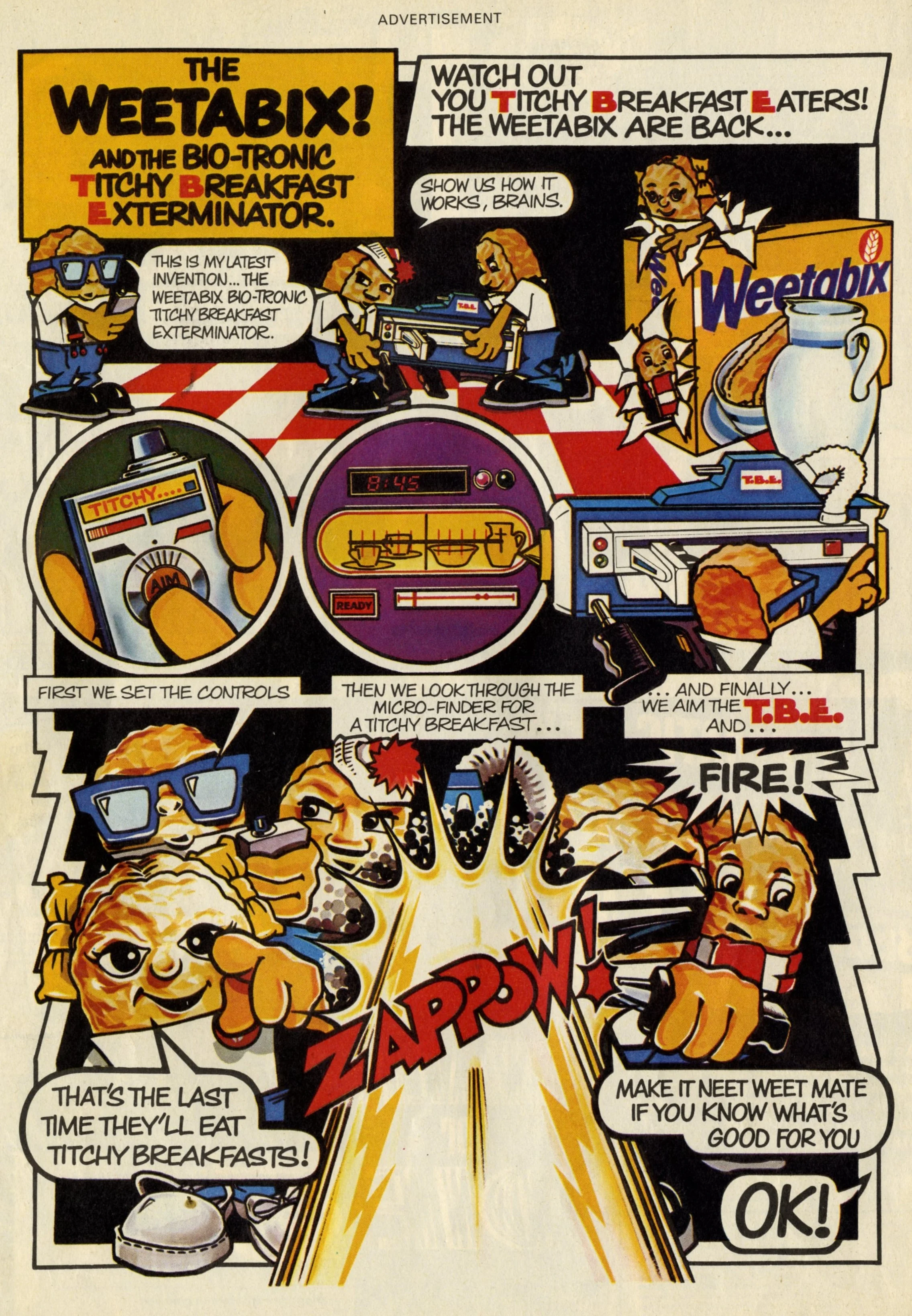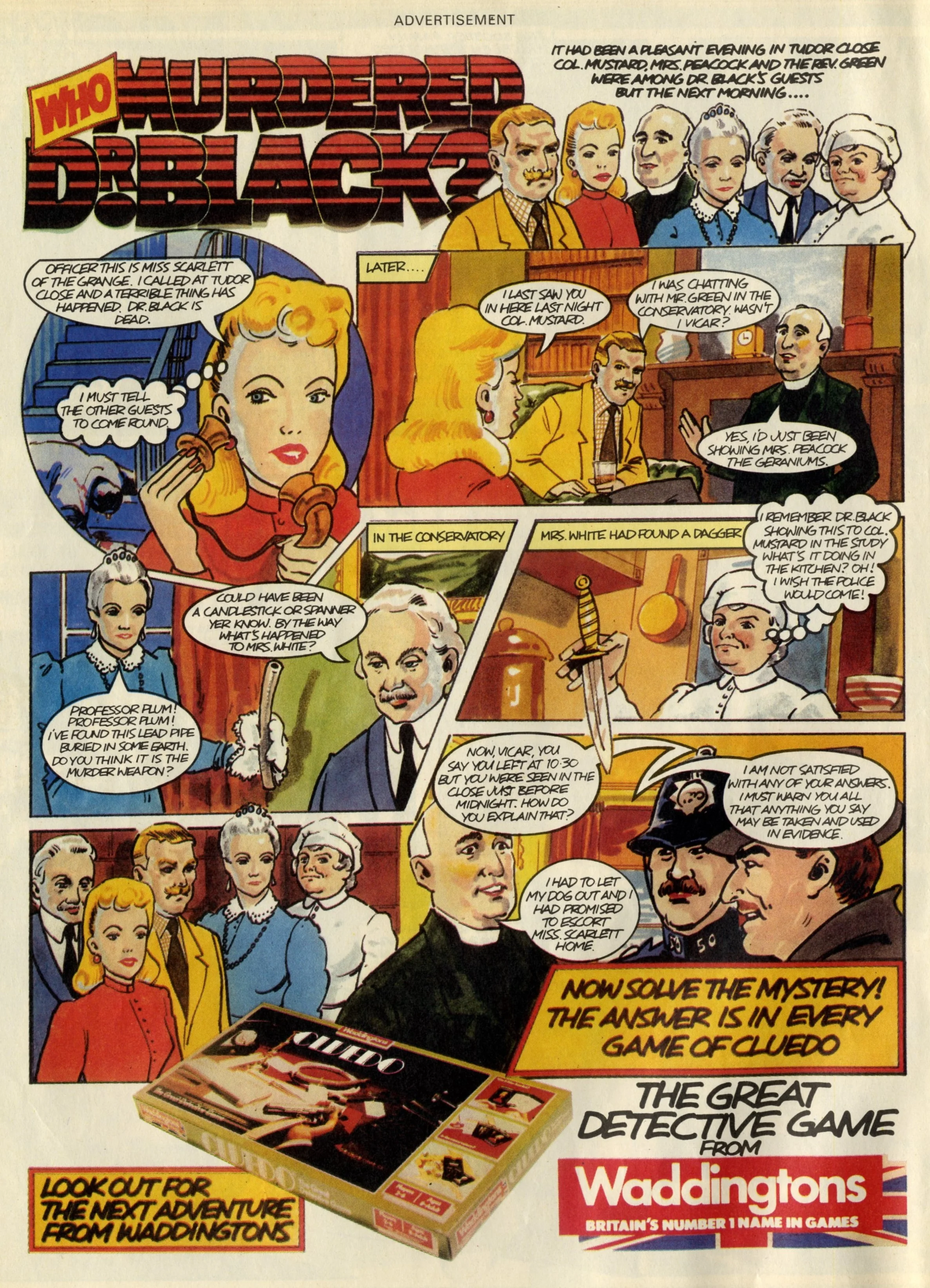 If hotting up is what readers were after, then the title of Eagle’s brand new serial House of Correction held some promise. WWII Flight-Lieutenant Hary Beckett was the star, waking in occupied France after the crash of his bomber and infiltrating the mysterious Nazi House of Correction. He probably wasn’t expecting to discover one of the Chuckle Brothers inside. There’s further photo-camp in regulars Doomlord (evil brother Zom arrives on Earth), and Manix (chasing agents of S.M.O.G. – ‘a sinister organisation with insane objectives’), but by the summer of 1983 there was a higher ratio of non-photographic stories in Eagle, with Alan Hebden and Jose Ortiz’s The Fifth Horseman (good), Fred Baker and Rex Archer’s Crowe Street Comp. (fun) and Keith Law and Mike Dorey’s Scorpio (snorepio) making up the numbers.