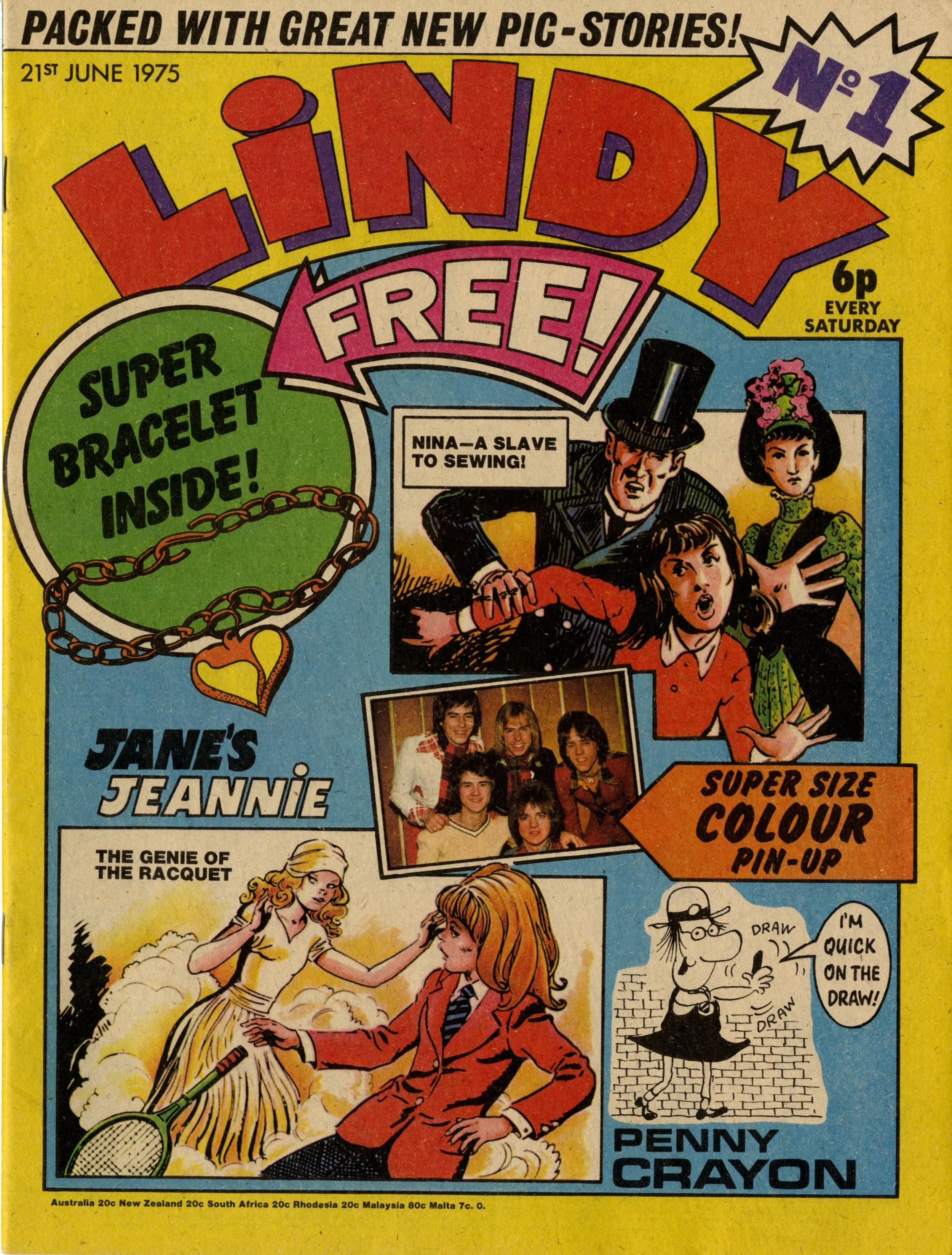 On this day, 21 June 1975 … June was a big month for new comic launches – this is the sixth Number One that I’ve featured this month. Lindy was another short-lived publication, running for less than five months until merging with Jinty in the issue dated 8 November 1975. Rather like Starlord to 2000AD three years later, Lindy appears to be an attempt to reach a slightly more discerning readership than Jinty or Tammy. It’s printed on nicer paper, with full-bleed covers and centre-page poster, and admirably carries the same 6p cover price for the same number of pages (32). It gives more attention to pop stars – with a back-page heart-throbby ‘Pop Spot’ digest and that scary Bay City Rollers poster (oddly – for me – there is nothing in this comic that identifies the poster as the Rollers. I guess everyone just knew back then, but I had to check on Google).