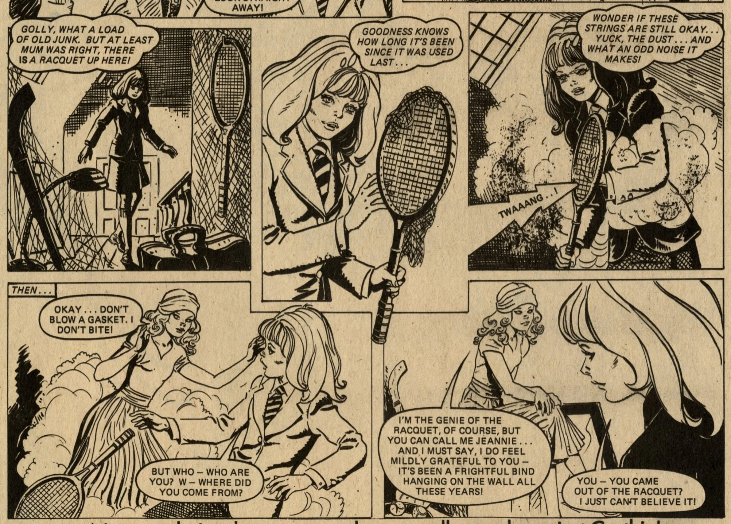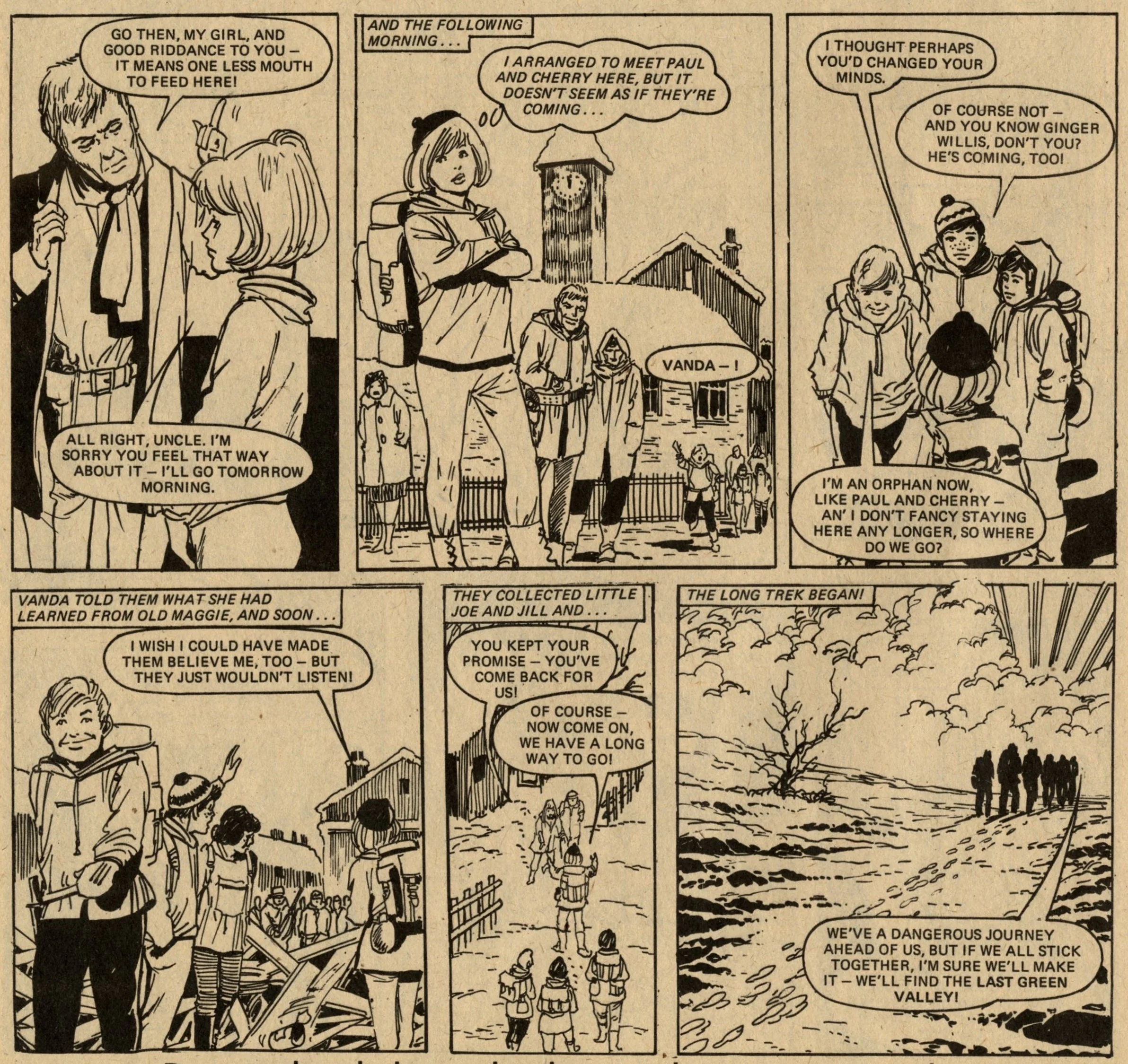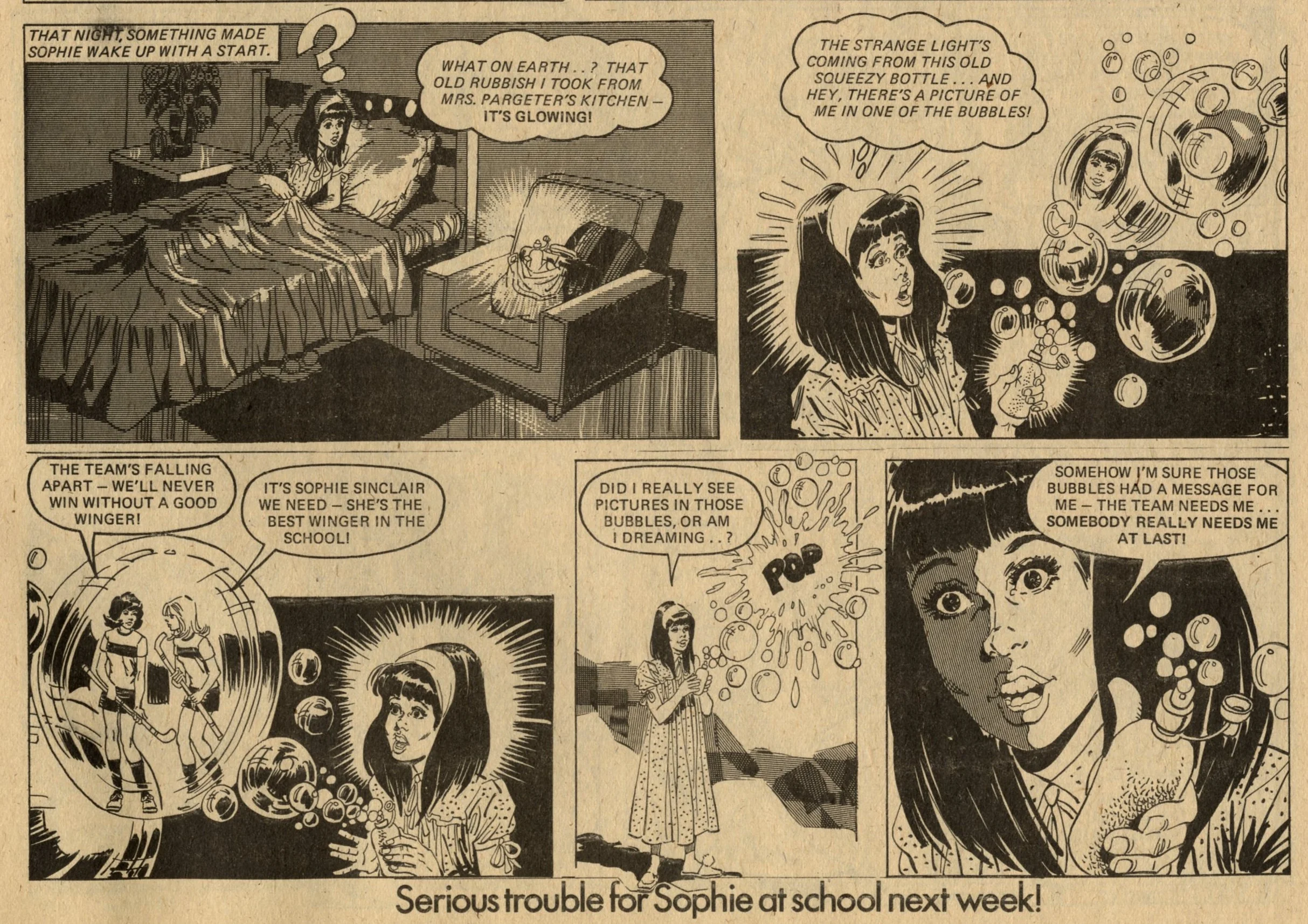 The comic strip content is similar to what was appearing in other girls comics of Lindy’s day, but more enjoyable to read due to the better print quality. Pavement Patsy and The Tin-mine Ponies are contemporary stories of girls fighting against hard times. Nina Nimble Fingers and Hard Days for Hilda are historical stories of orphan girls, also fighting against hard times. Jane’s Jeannie and Sophie’s Secret Squeezy follow the adventures of schoolgirls who discover a magical device (Jane has a genie in a tennis racquet, and Sophie has a plastic bottle that produces bubbles which give her advice about the future). More intriguing (to me) are The Last Green Valley – in the year 2000 Europe is in the grip of an Ice Age, and a group of friends set out from their village to find a legendary unfrozen valley – and properly spooky haunted house tale The House of Fear.
